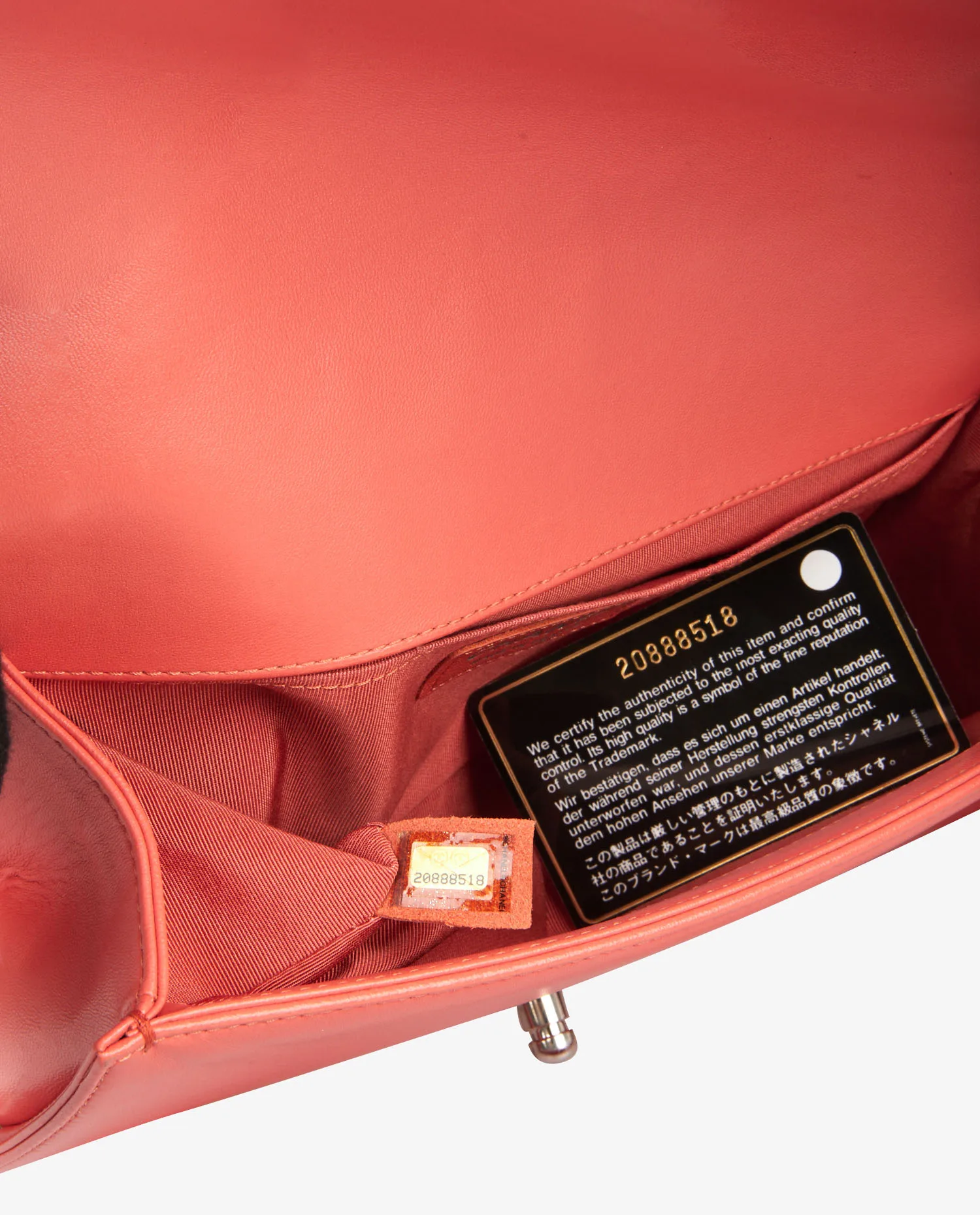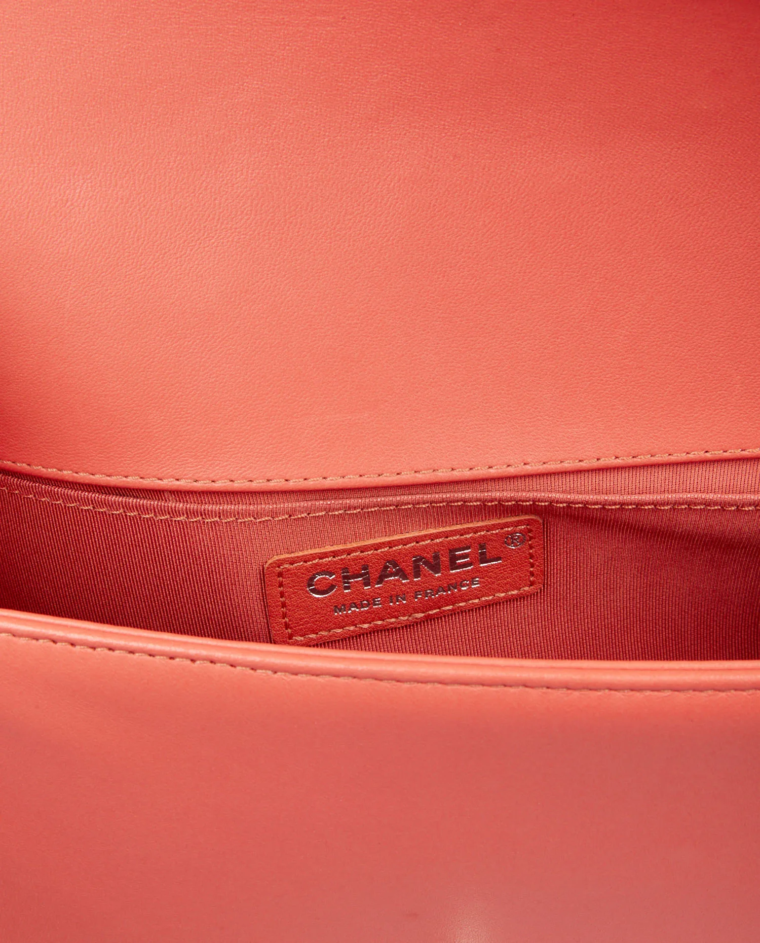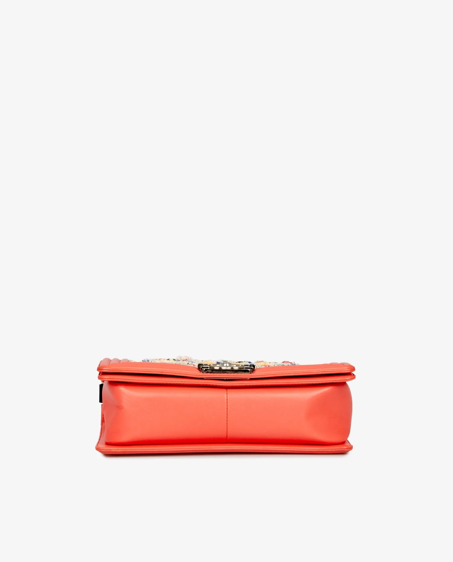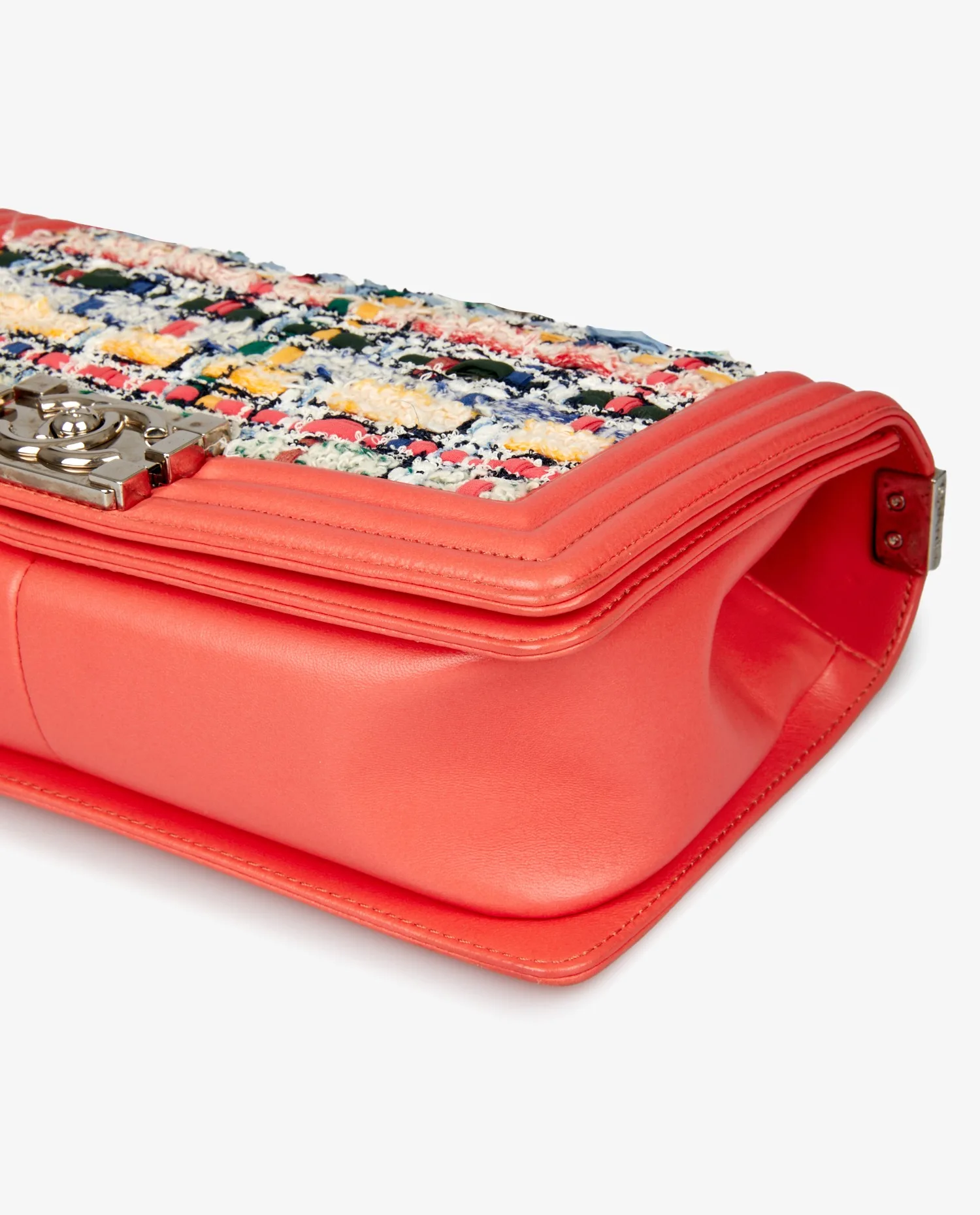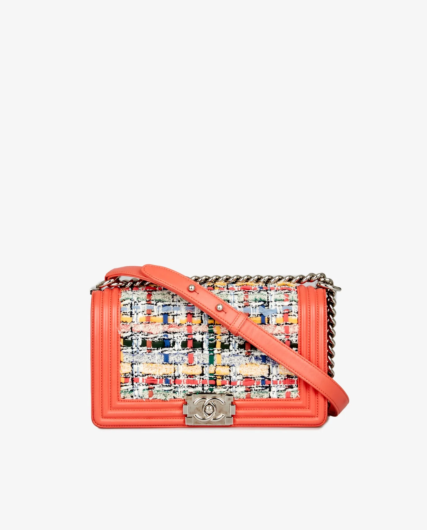 Boy Chanel MM en tweed et cuir d’agneau corail. Bijouterie argent. Porté épaule ou en bandoulière (106cm). En très bon état.
