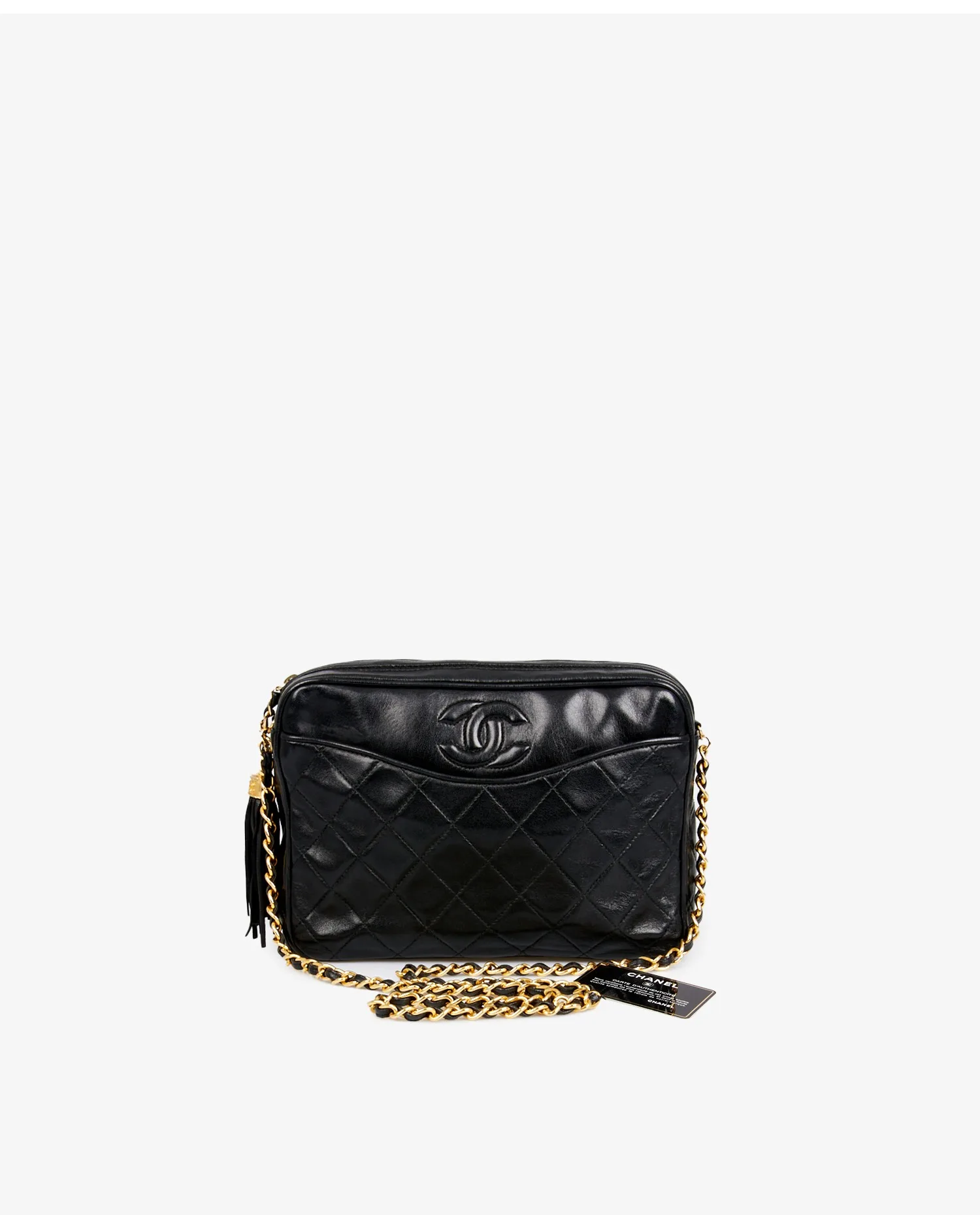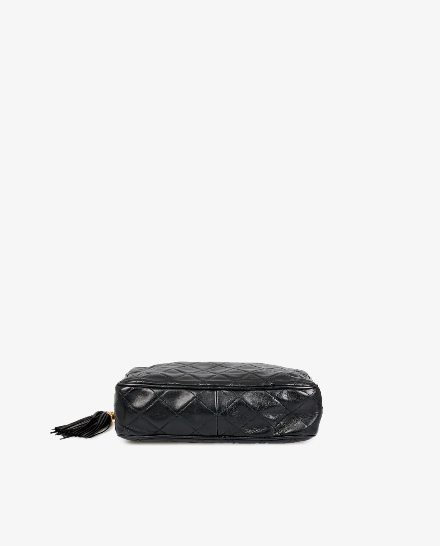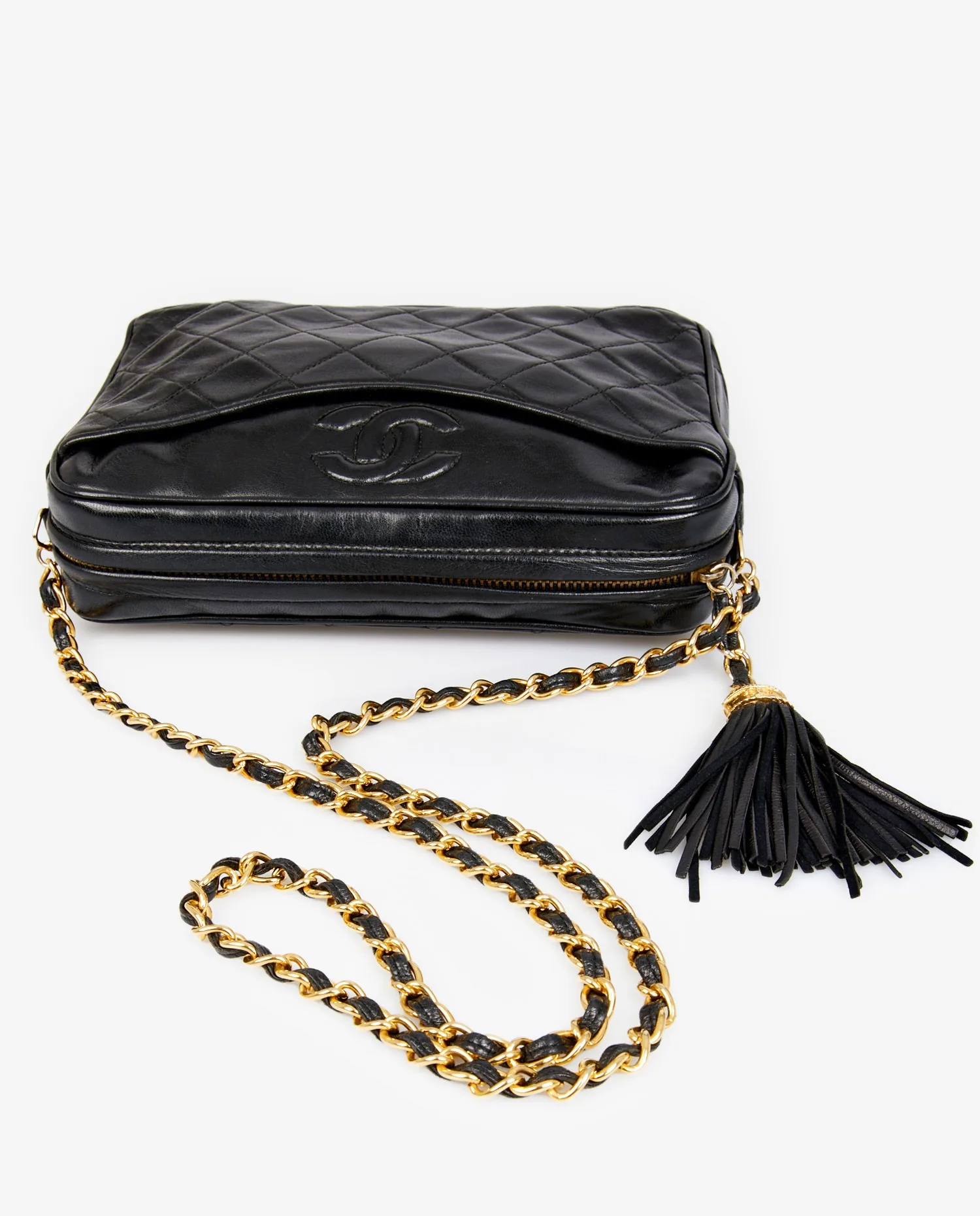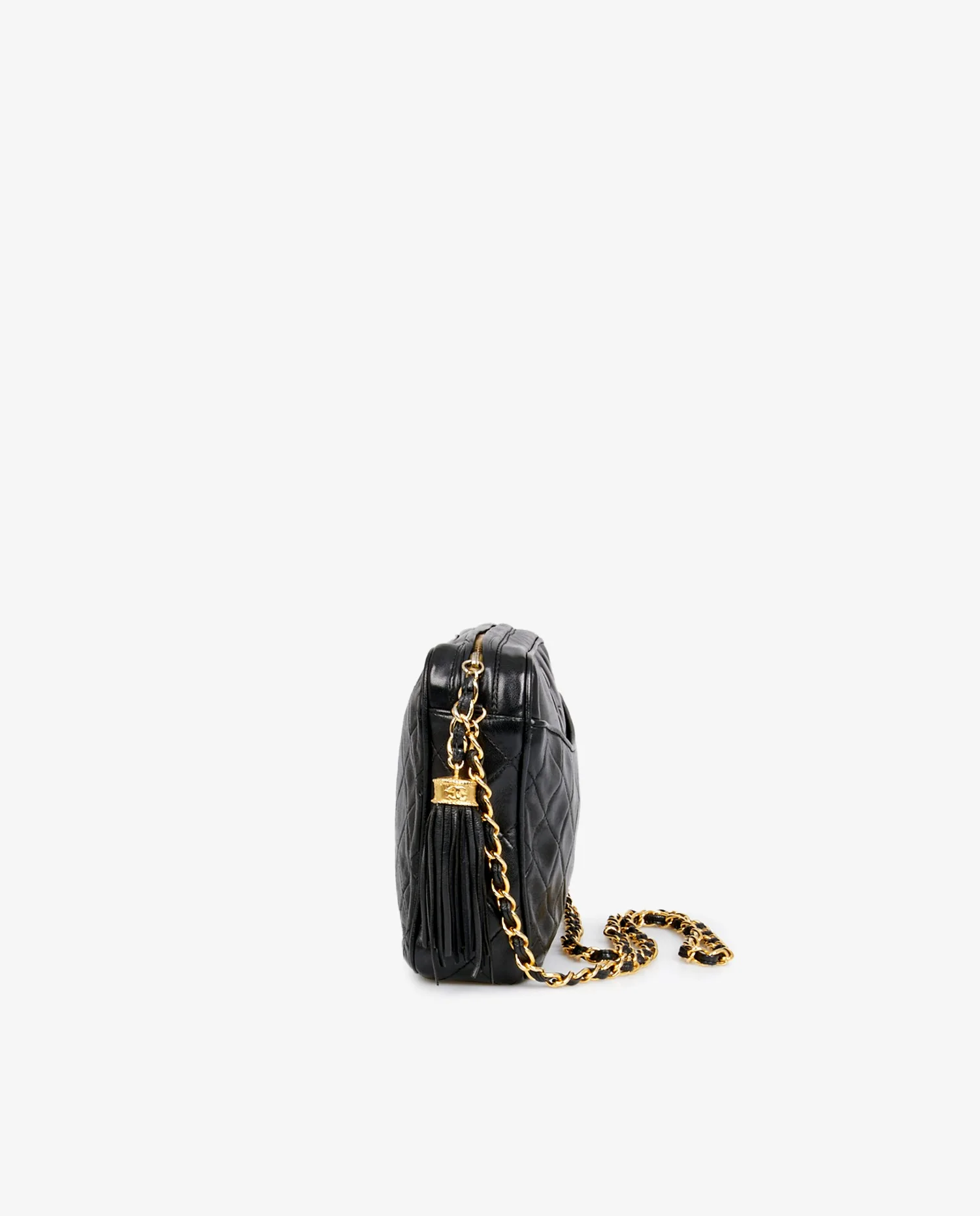 Sac Camera Chanel vintage en cuir d’agneau noir matelassé. Porté à l’épaule ou en crossbody (103cm). En très bon état.