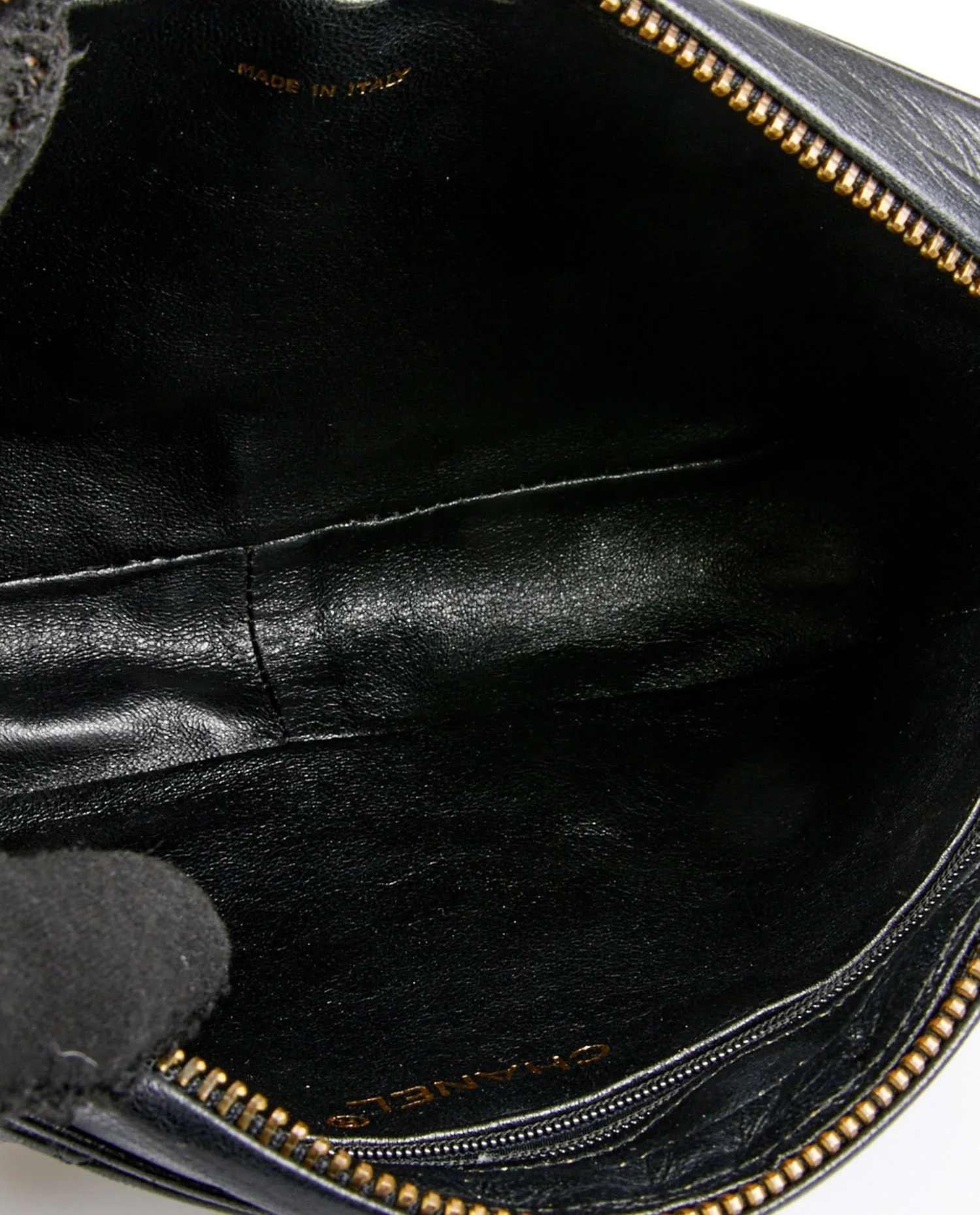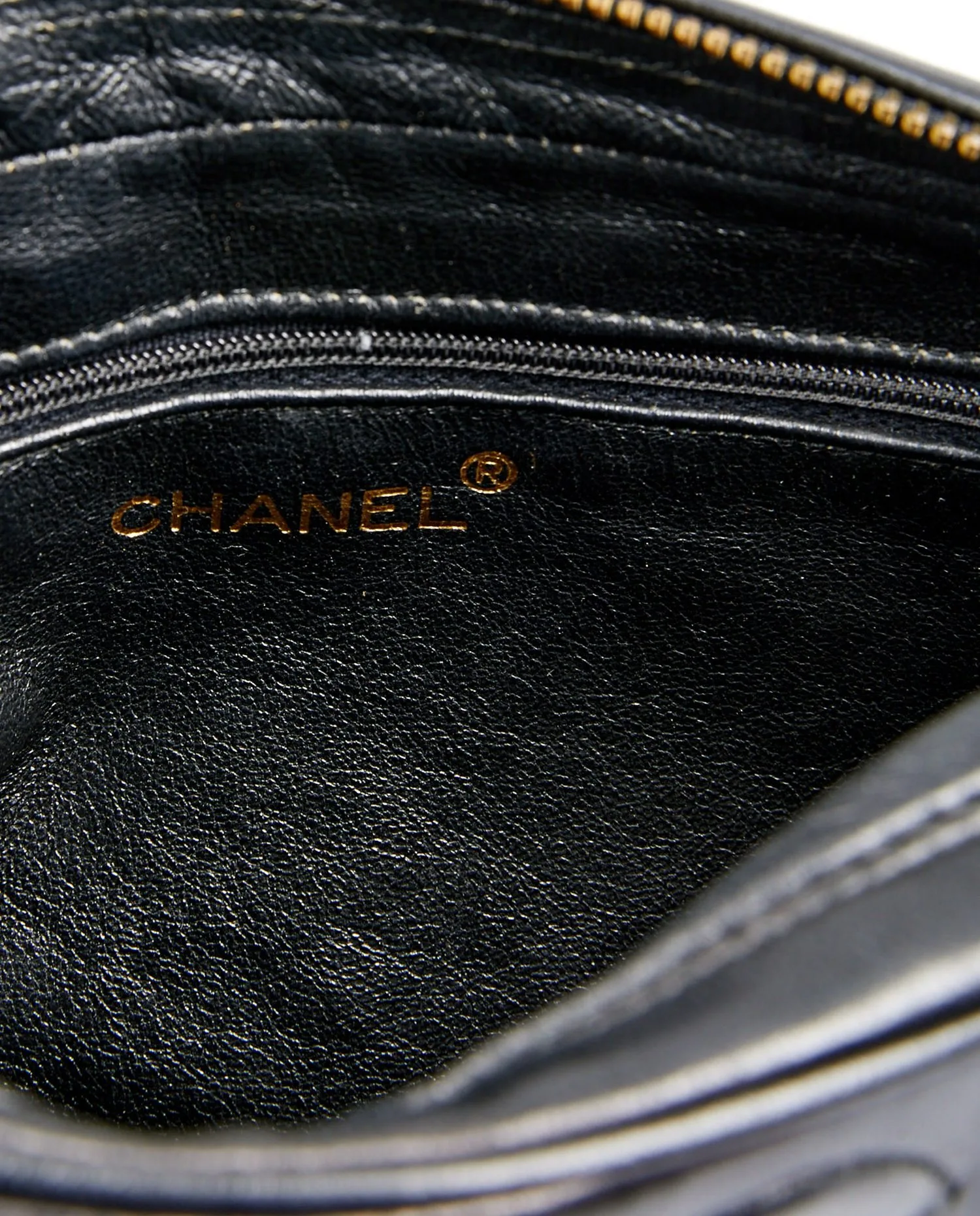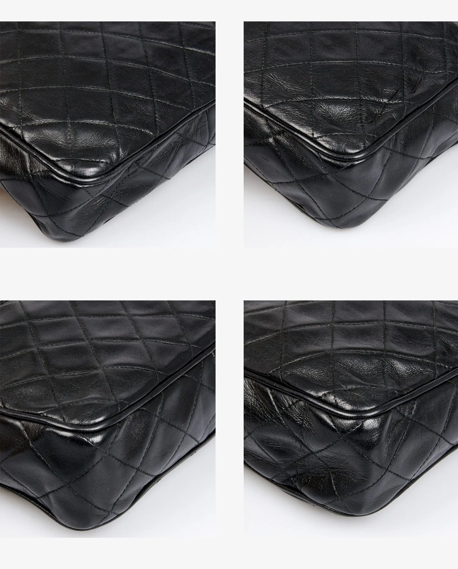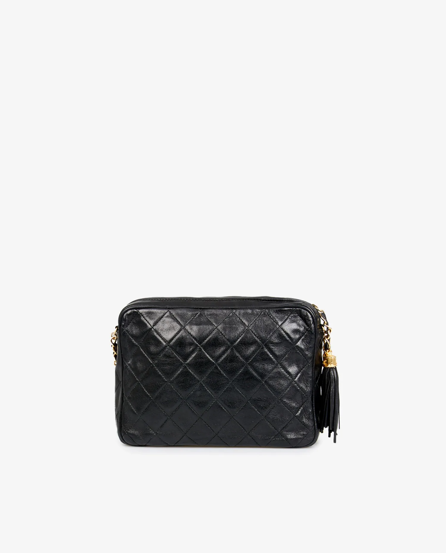 Sac Camera Chanel vintage en cuir d’agneau noir matelassé. Porté à l’épaule ou en crossbody (103cm). En très bon état.