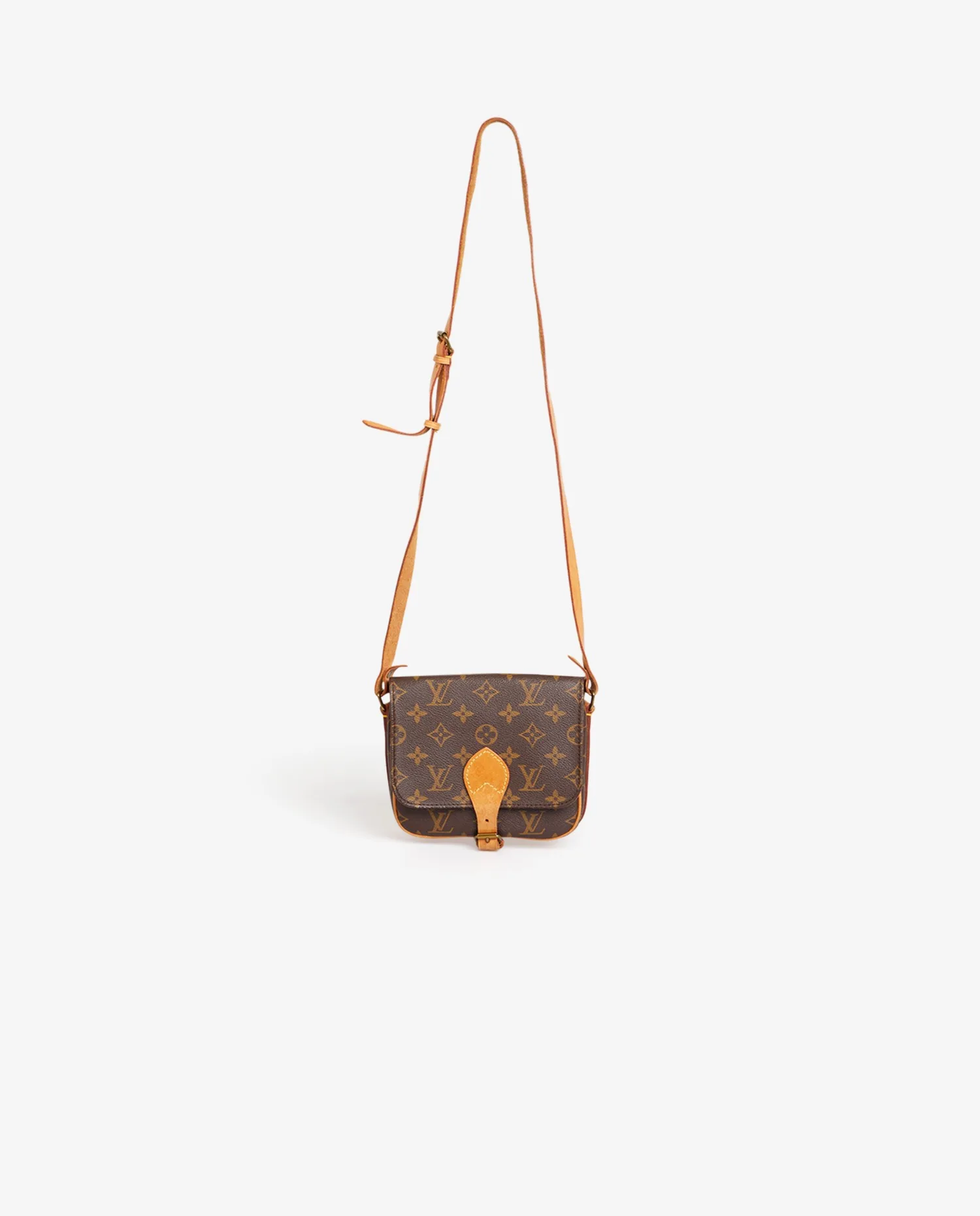 Sac cartouchière Louis Vuitton en toile enduite monogram finitions en cuir de vachette naturel. Il se porte en crossbody avec une bandoulière réglable, qui mesure au plus court 112cm et au plus long 122cm. En très bon état. Le cuir est patiné, usure naturelle.