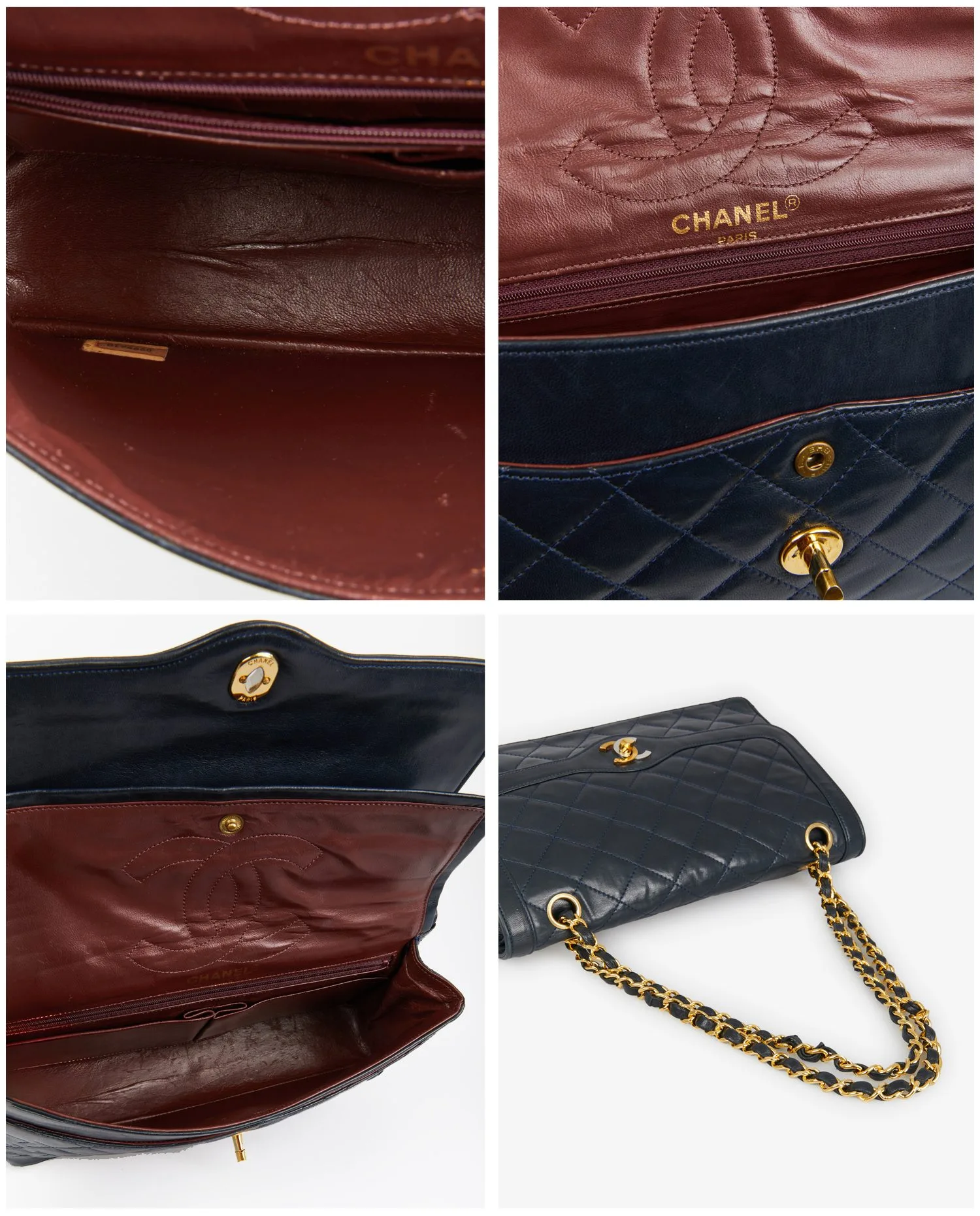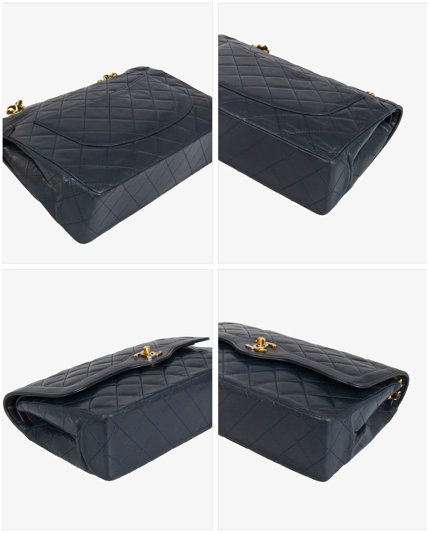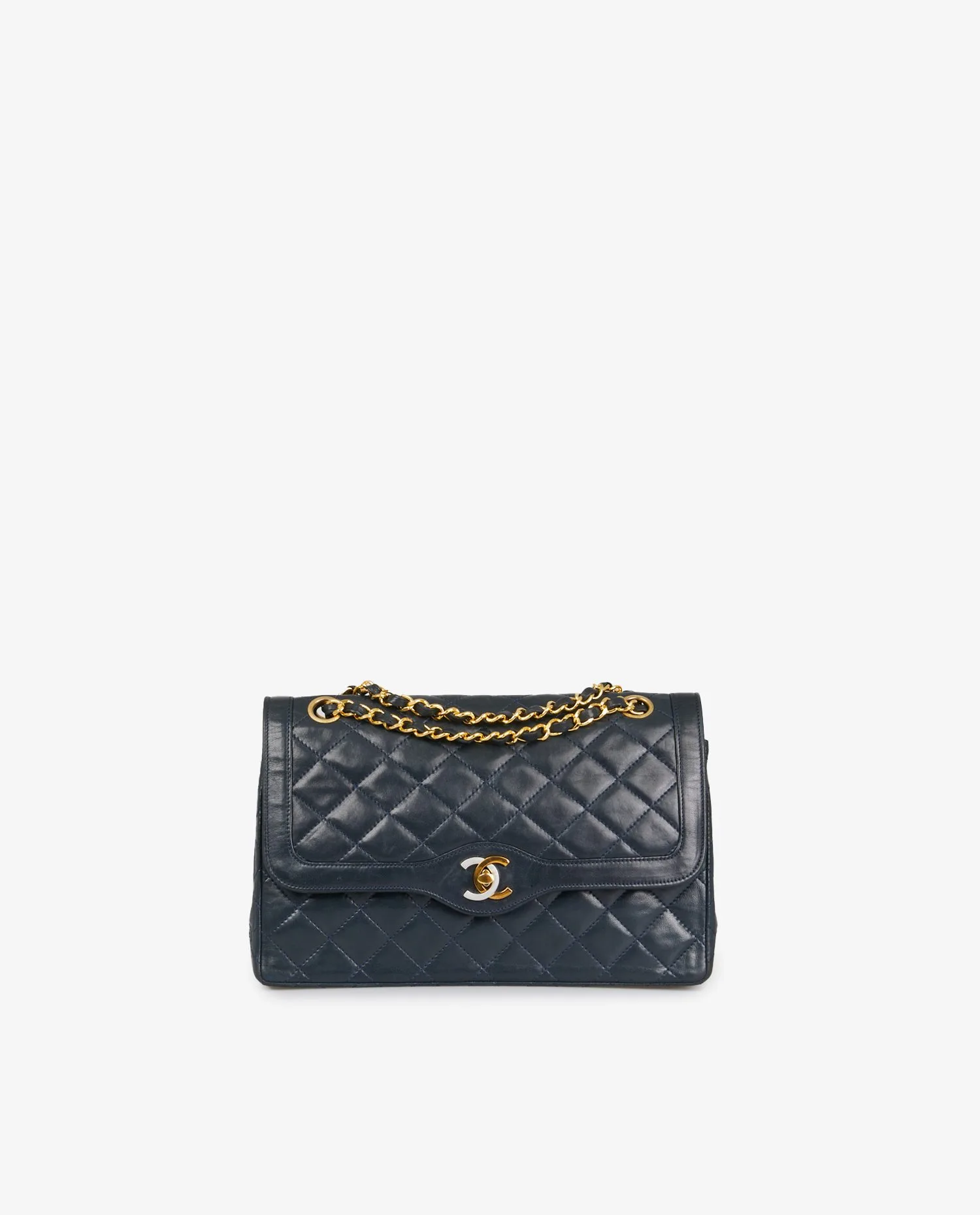 Sac Chanel vintage couture en cuir matelassé bleu nuit. Fermoir CC argent et doré. Porté épaule. Double rabat. En très bon état.