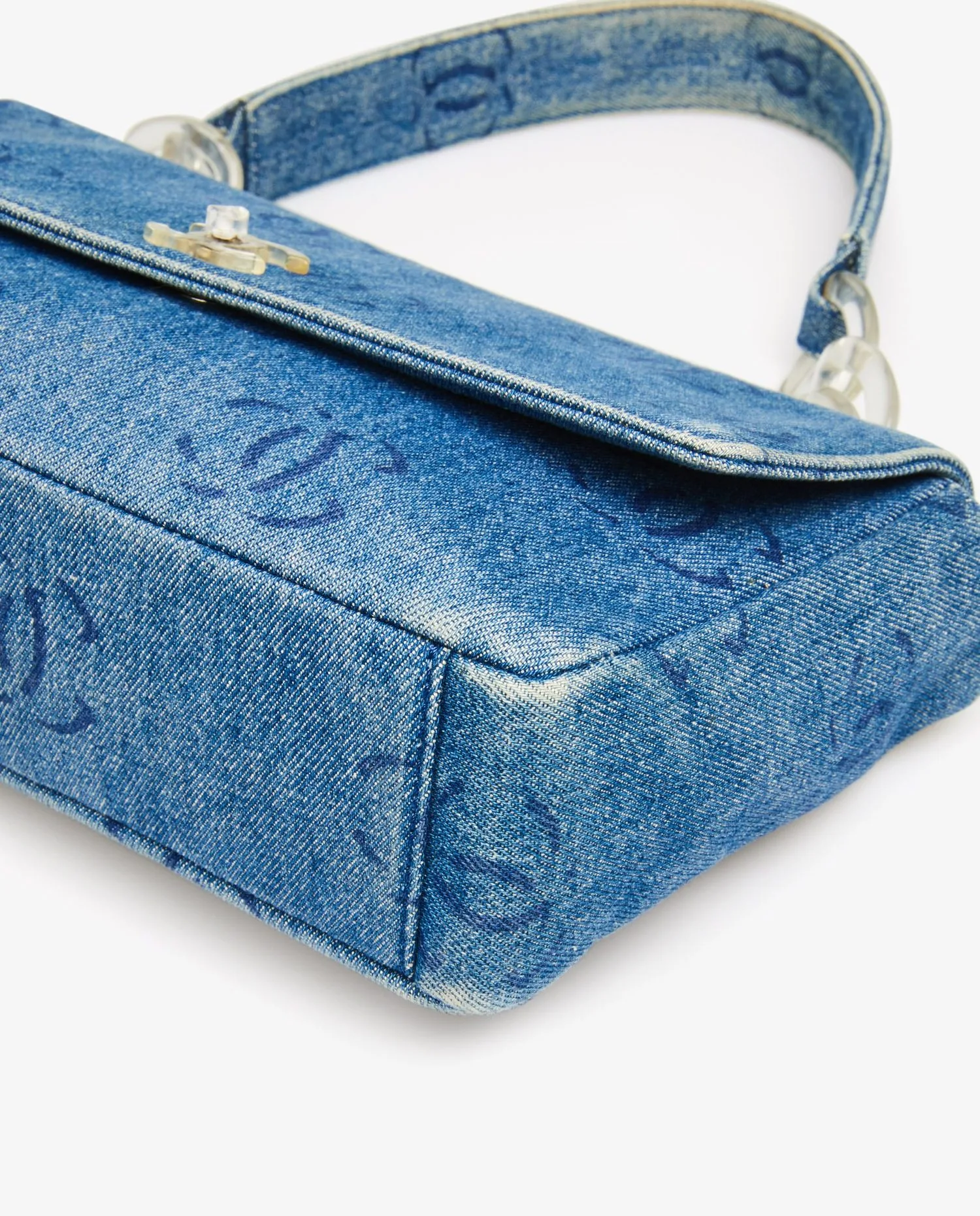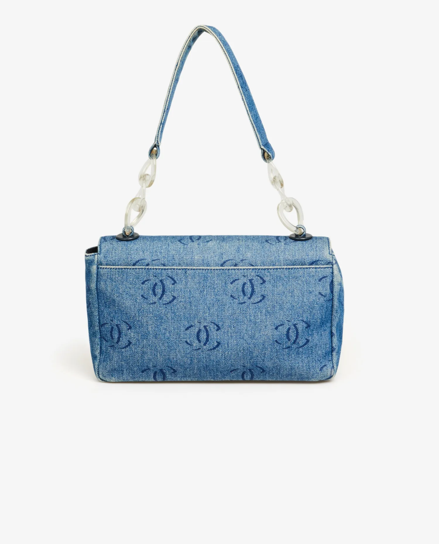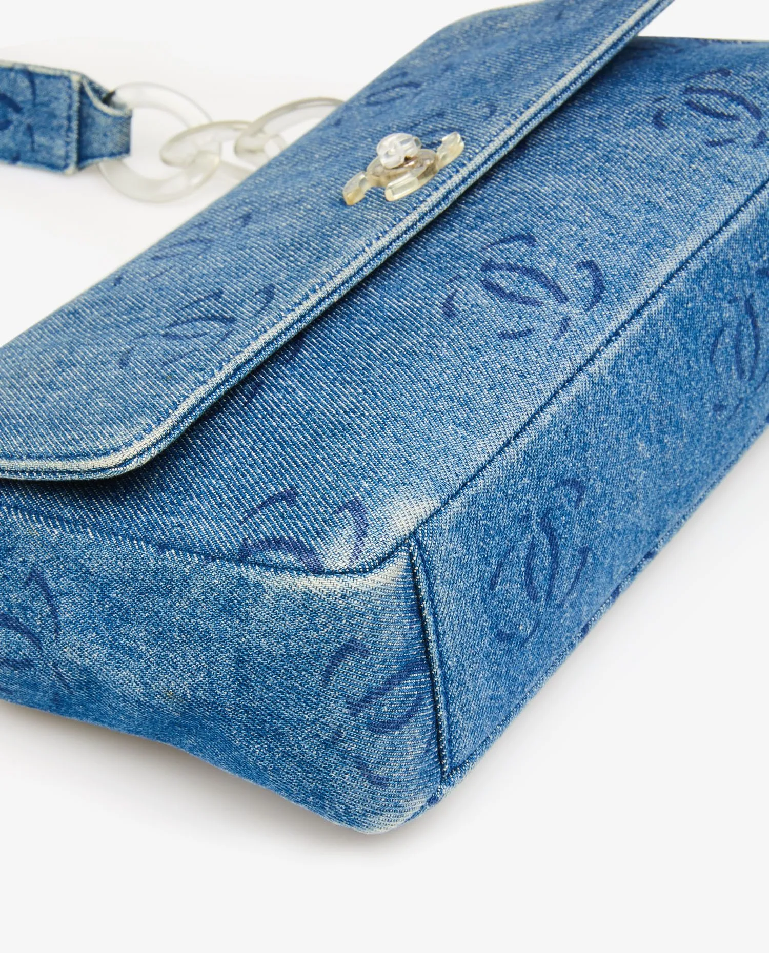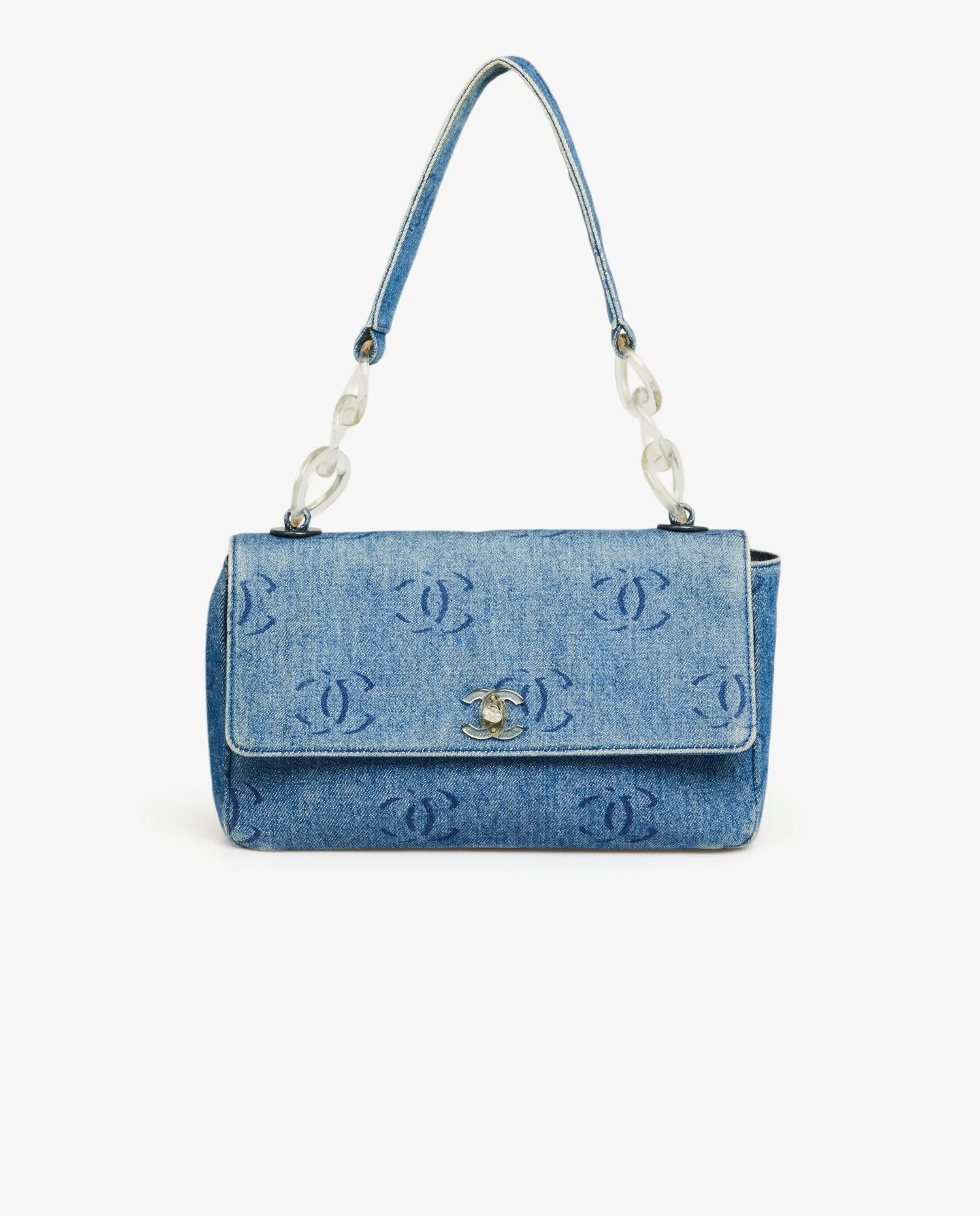 Sac Chanel en jean bleu. Porté épaule à l’aide d’une anse en denim et plastique, qui mesure 54cm. Fermoir CC. En très bon état.