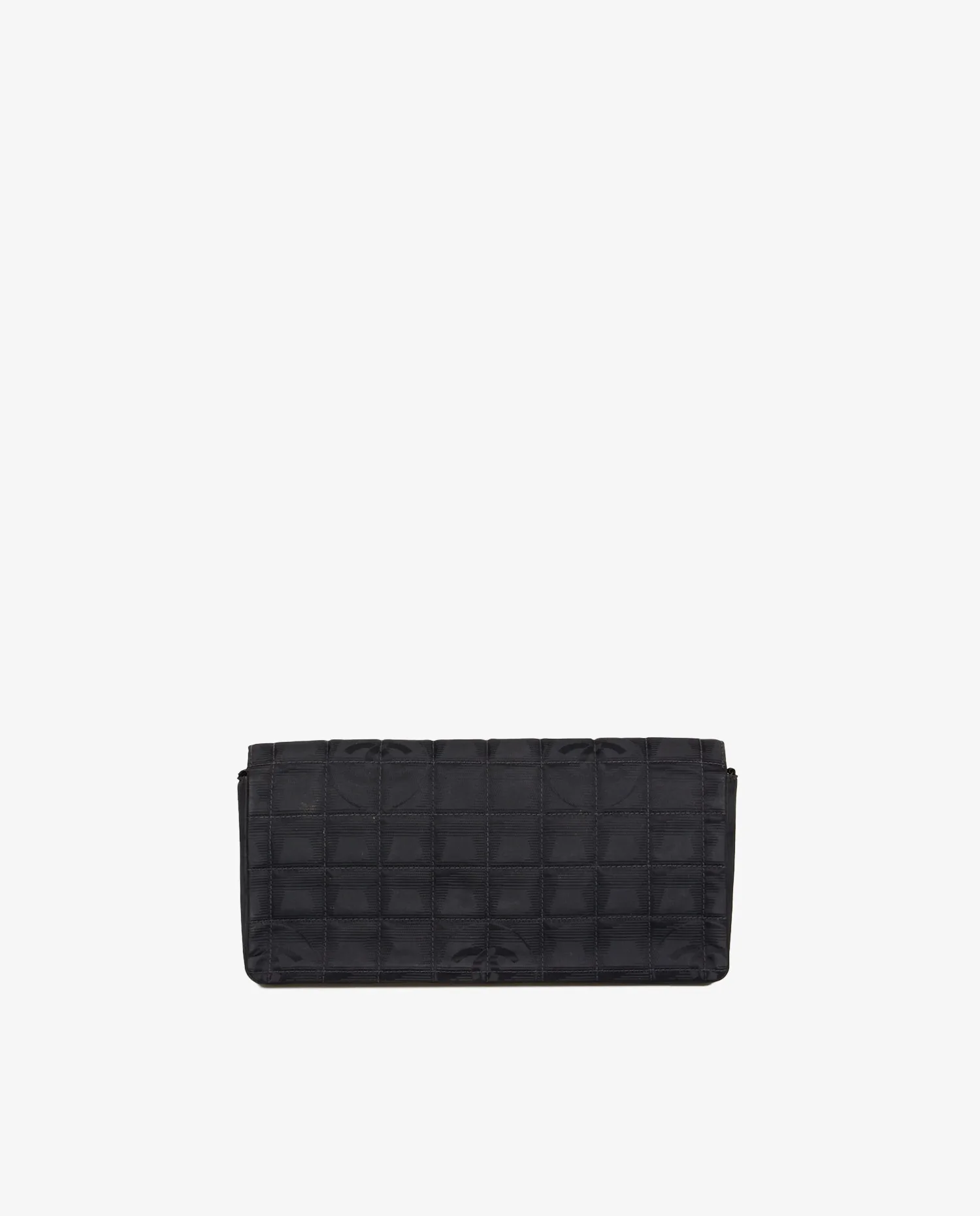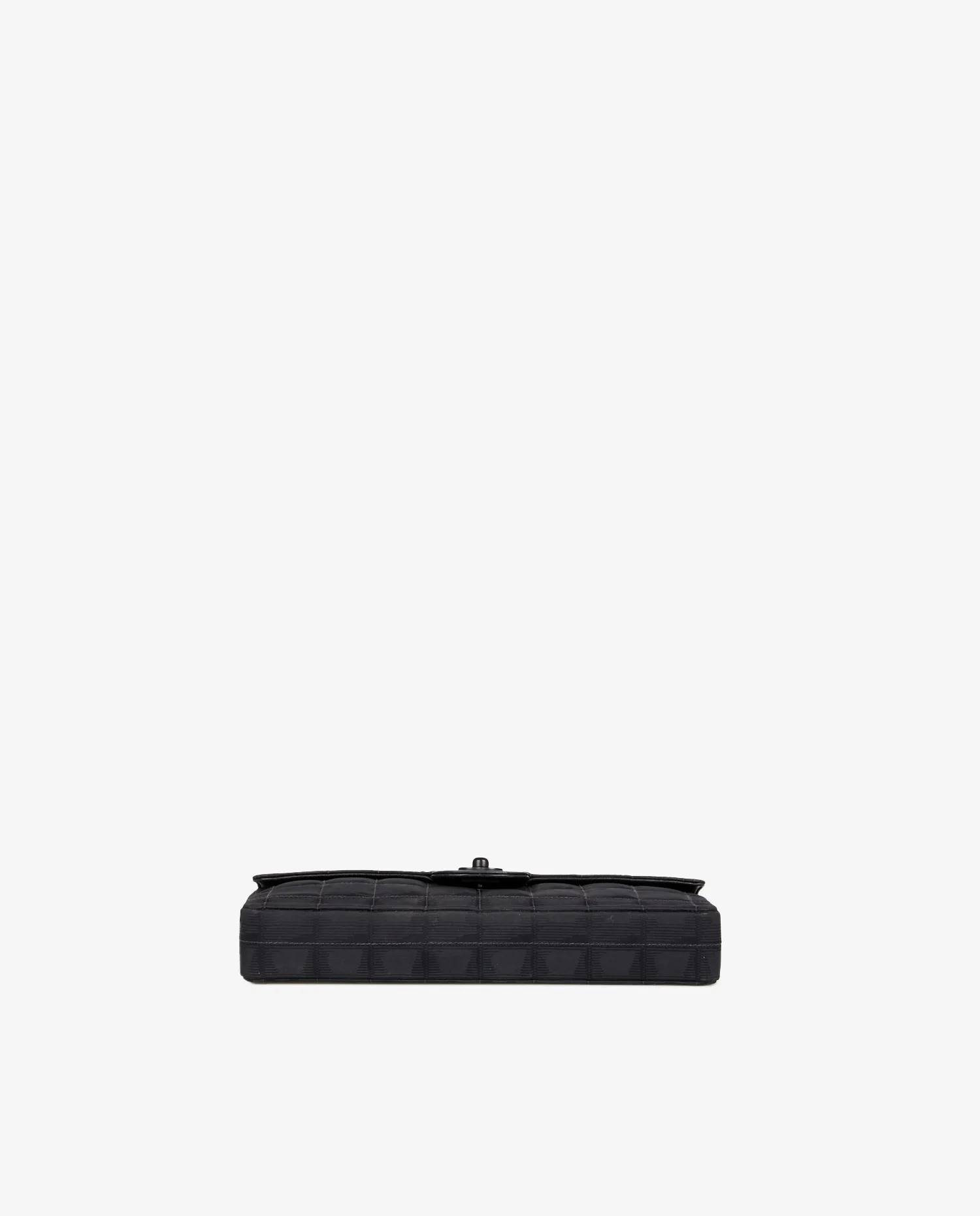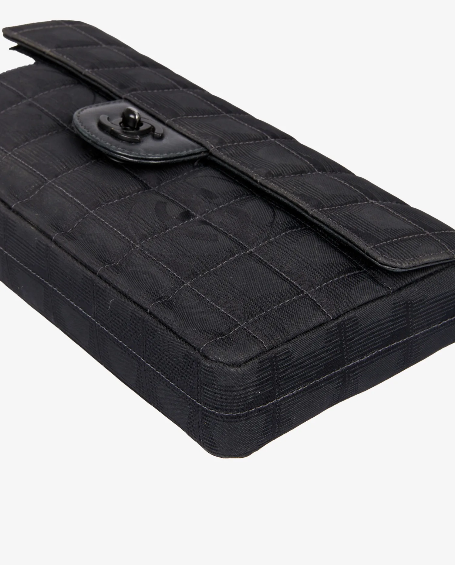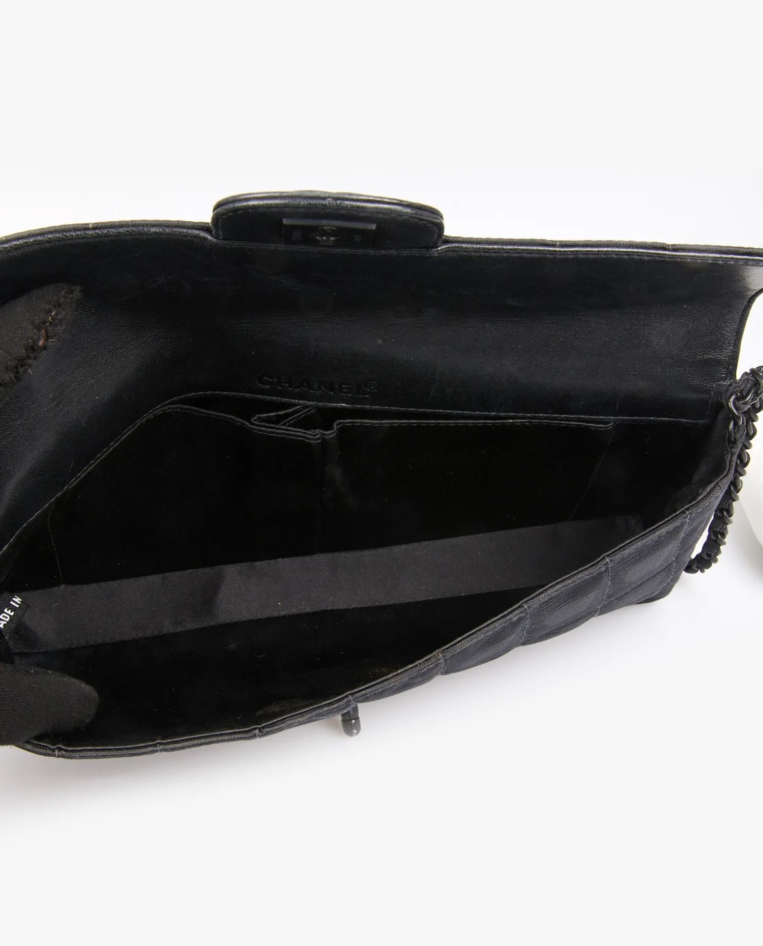 Sac Baguette Chanel en tissu noir monogram. Fermoir CC. Porté épaule (68cm). L’intérieur est en satin noir. En très bon état.
