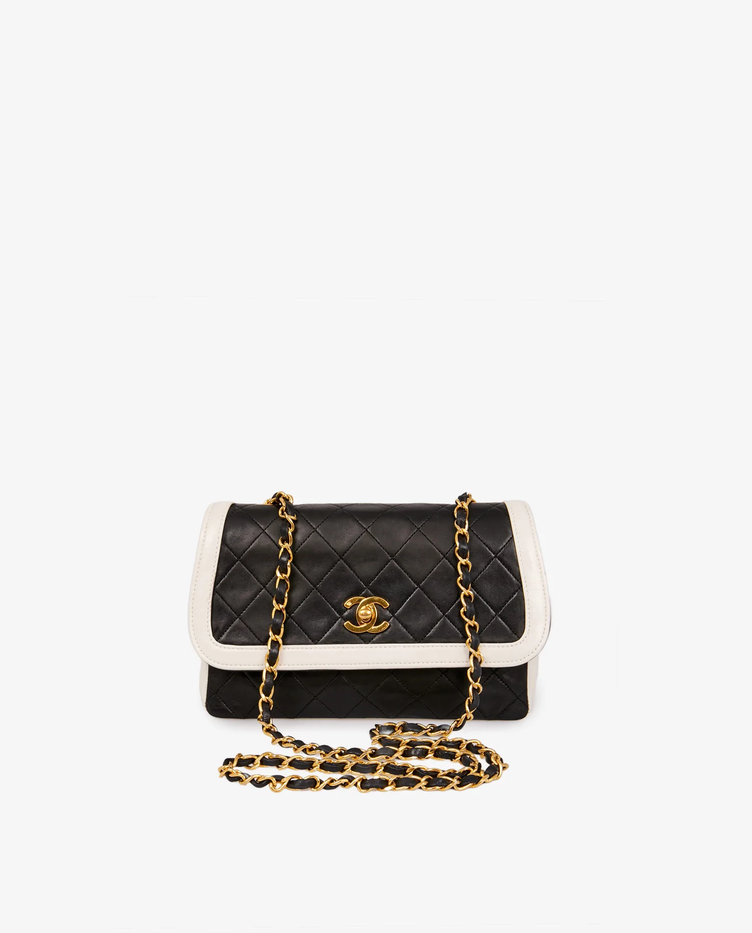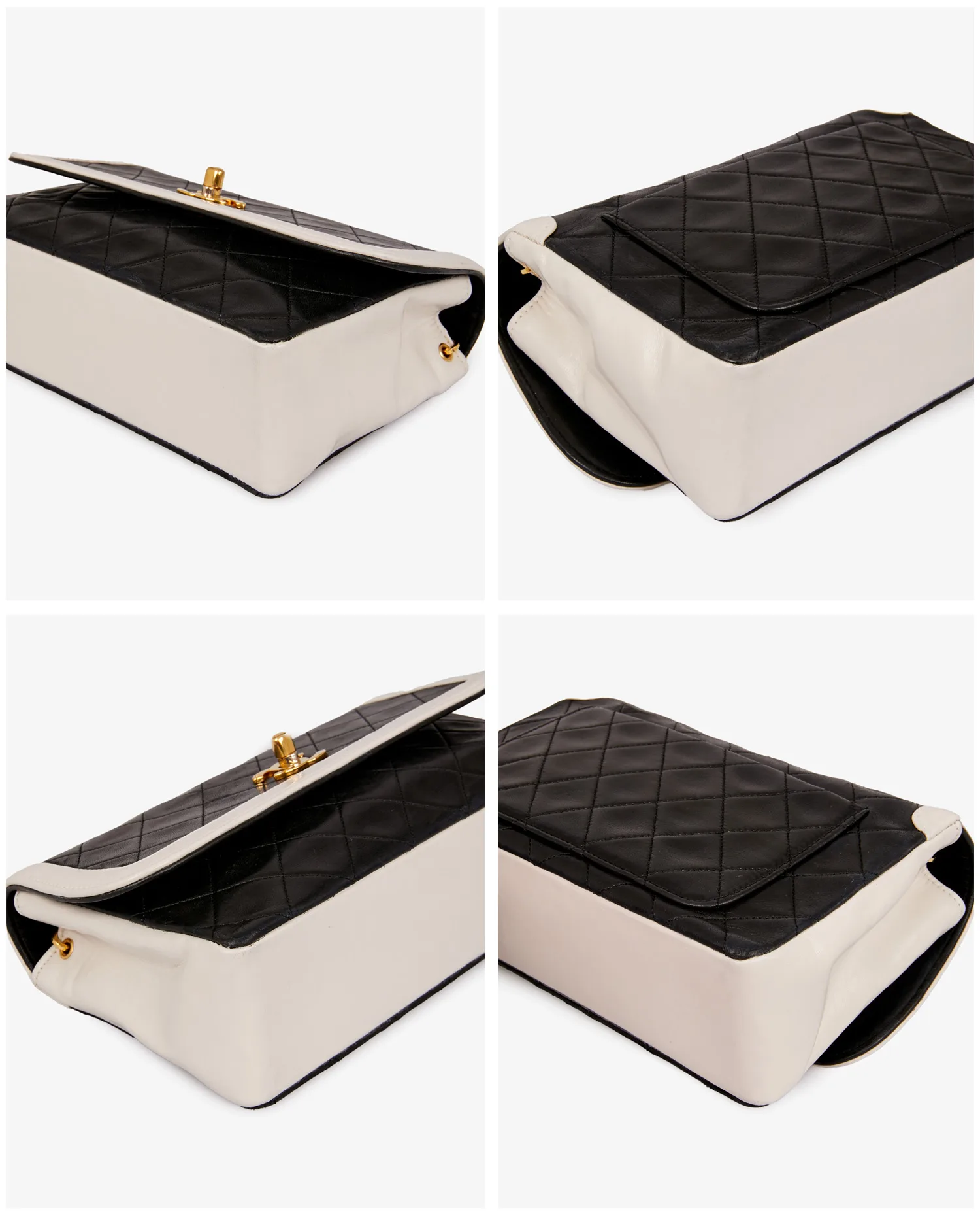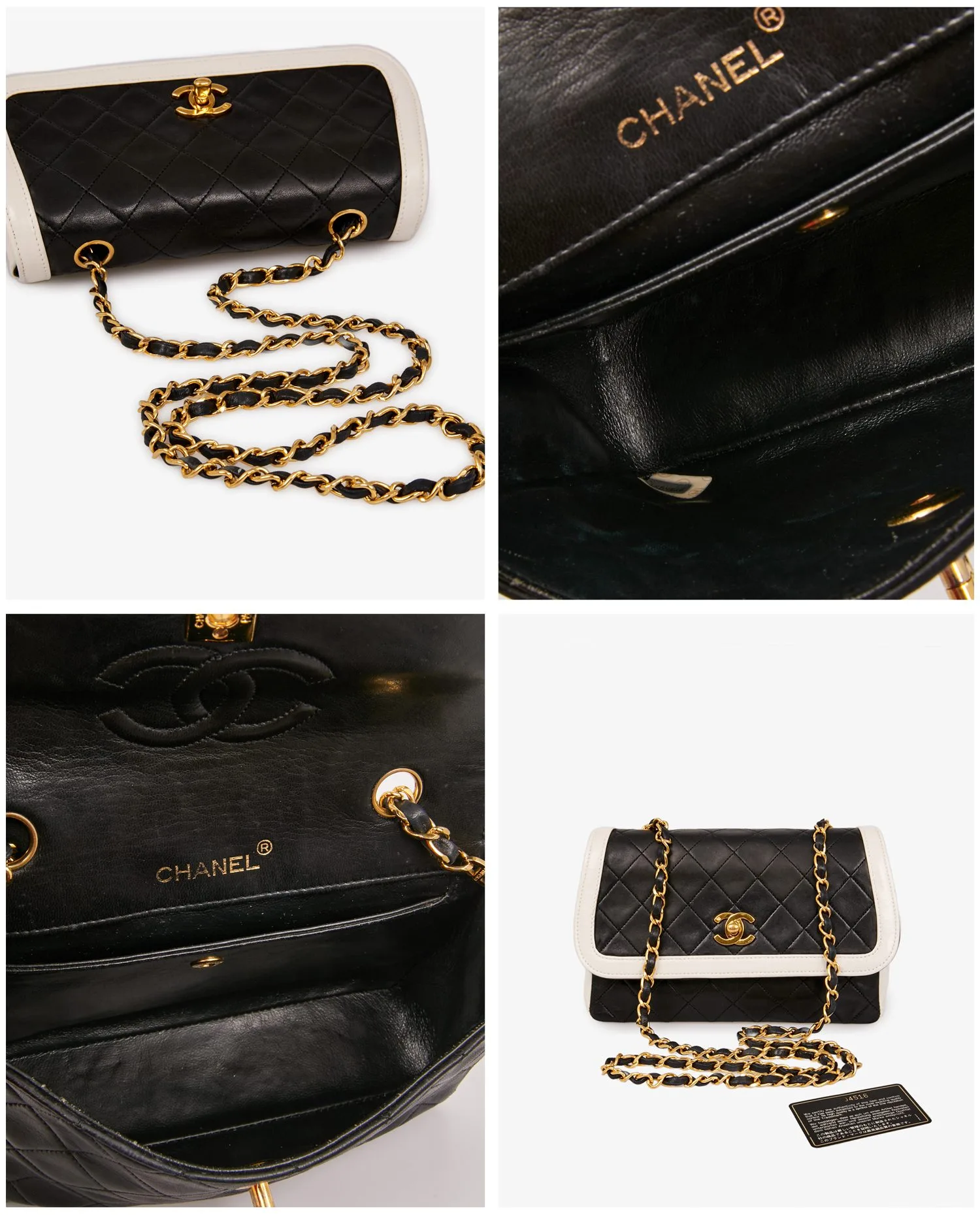 Sac Chanel vintage en cuir d’agneau matelassé noir et blanc. La bijouterie est en plaqué or 24K. Il se porte à l’épaule ou en crossbody. En très bon état.