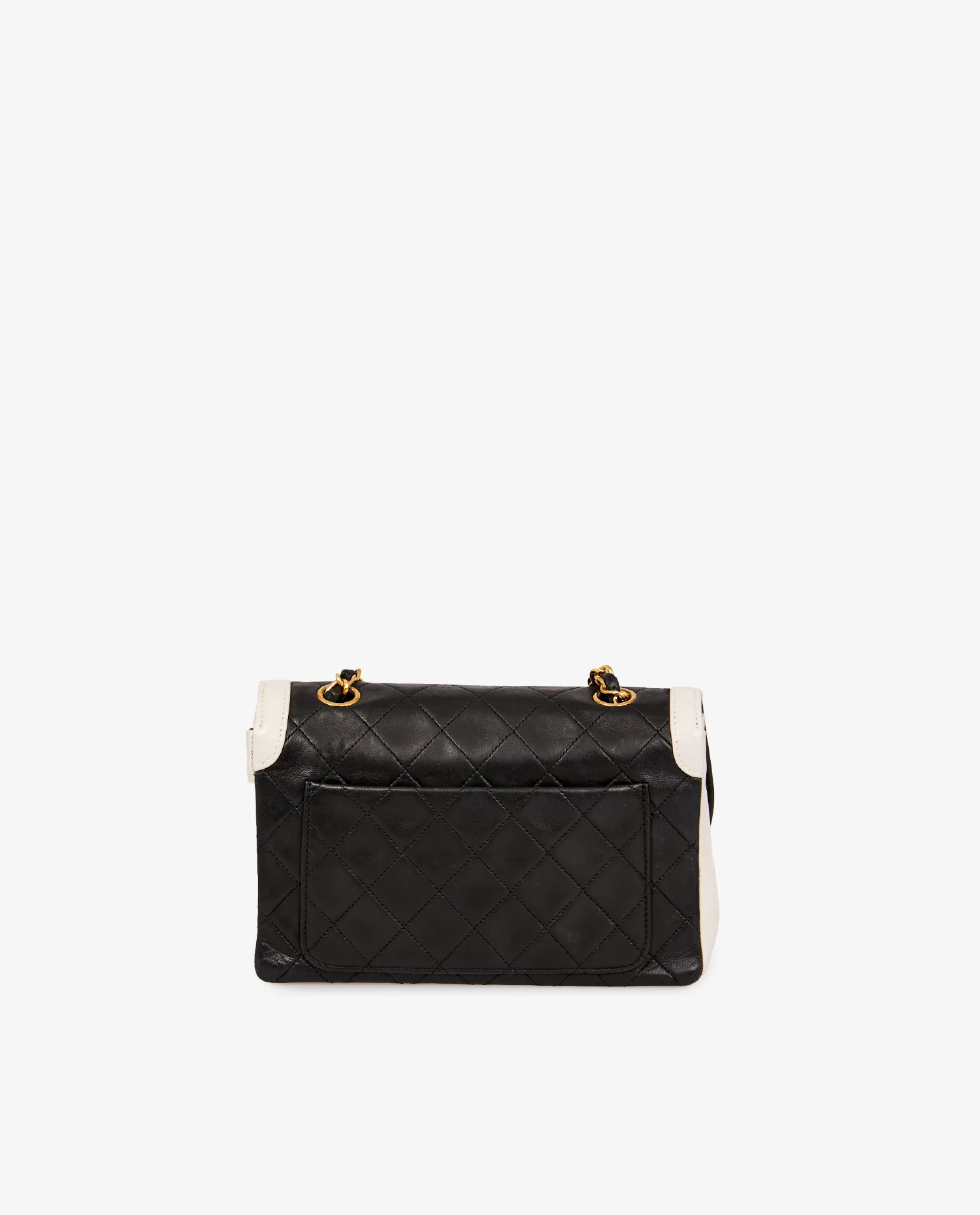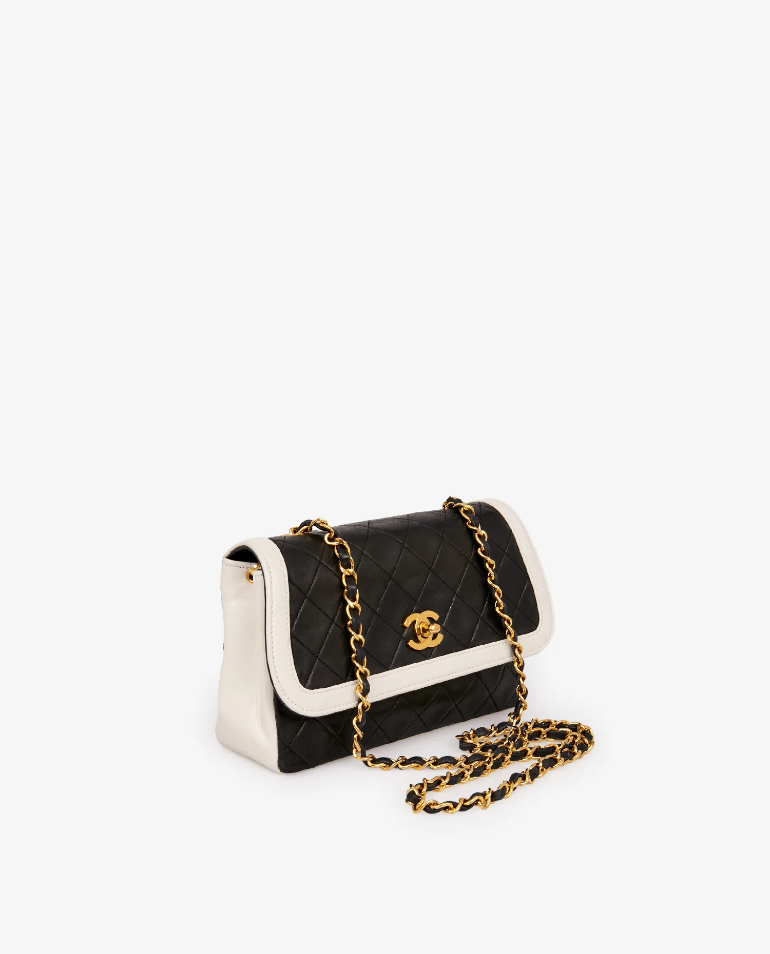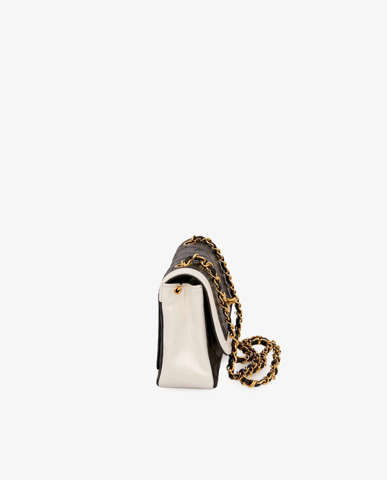 Sac Chanel vintage en cuir d’agneau matelassé noir et blanc. La bijouterie est en plaqué or 24K. Il se porte à l’épaule ou en crossbody. En très bon état.