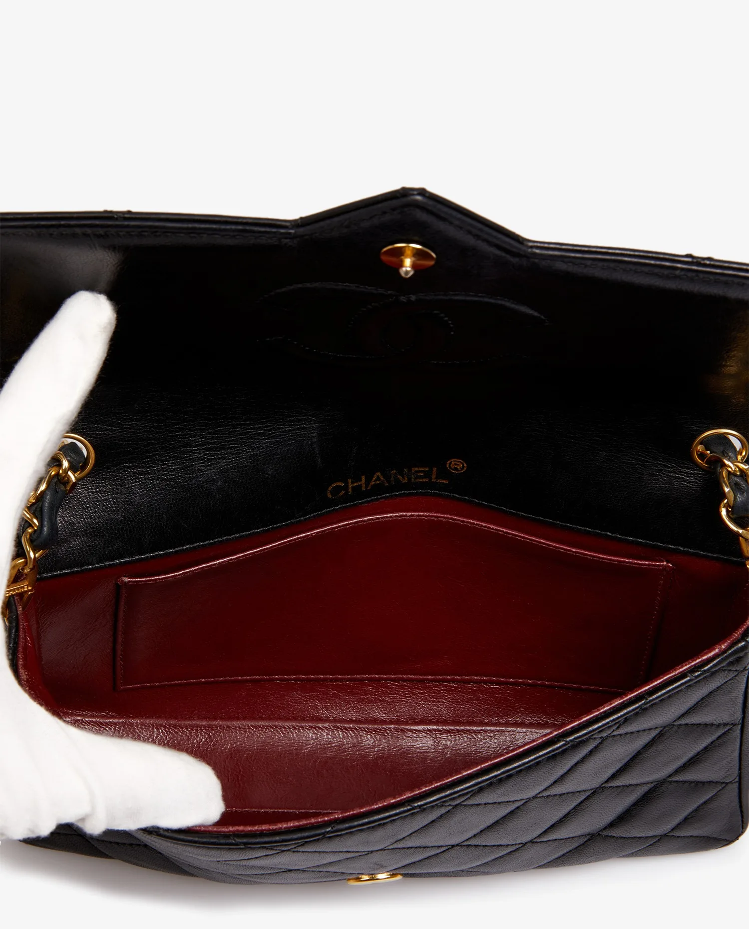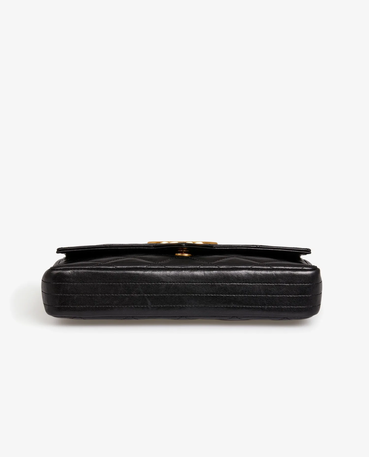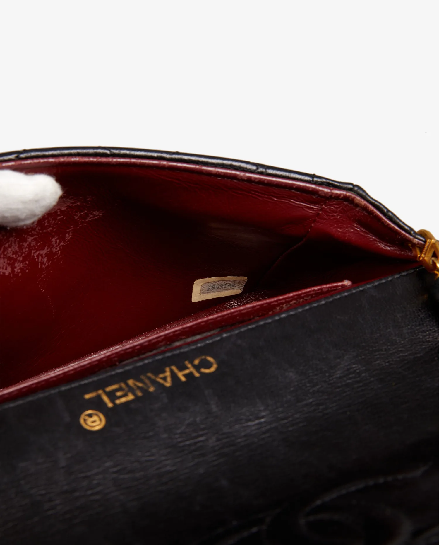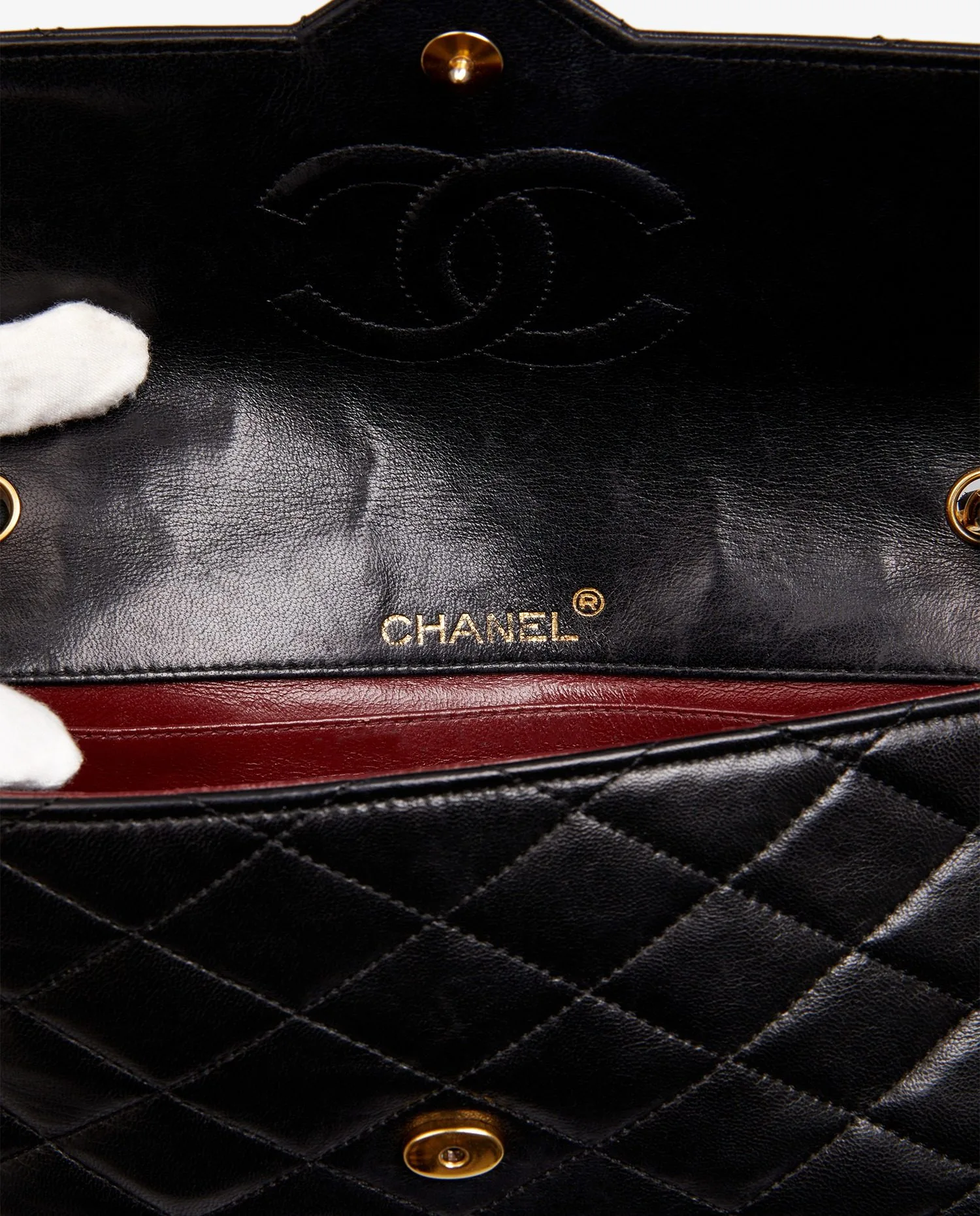 Sac Chanel vintage datant des années 80 en cuir d’agneau noir. Porté épaule ou crossbody. Elle mesure 111cm. L’intérieur est en cuir bordeaux. En très bon état. Légères rayures sur le CC de la bijouterie.
