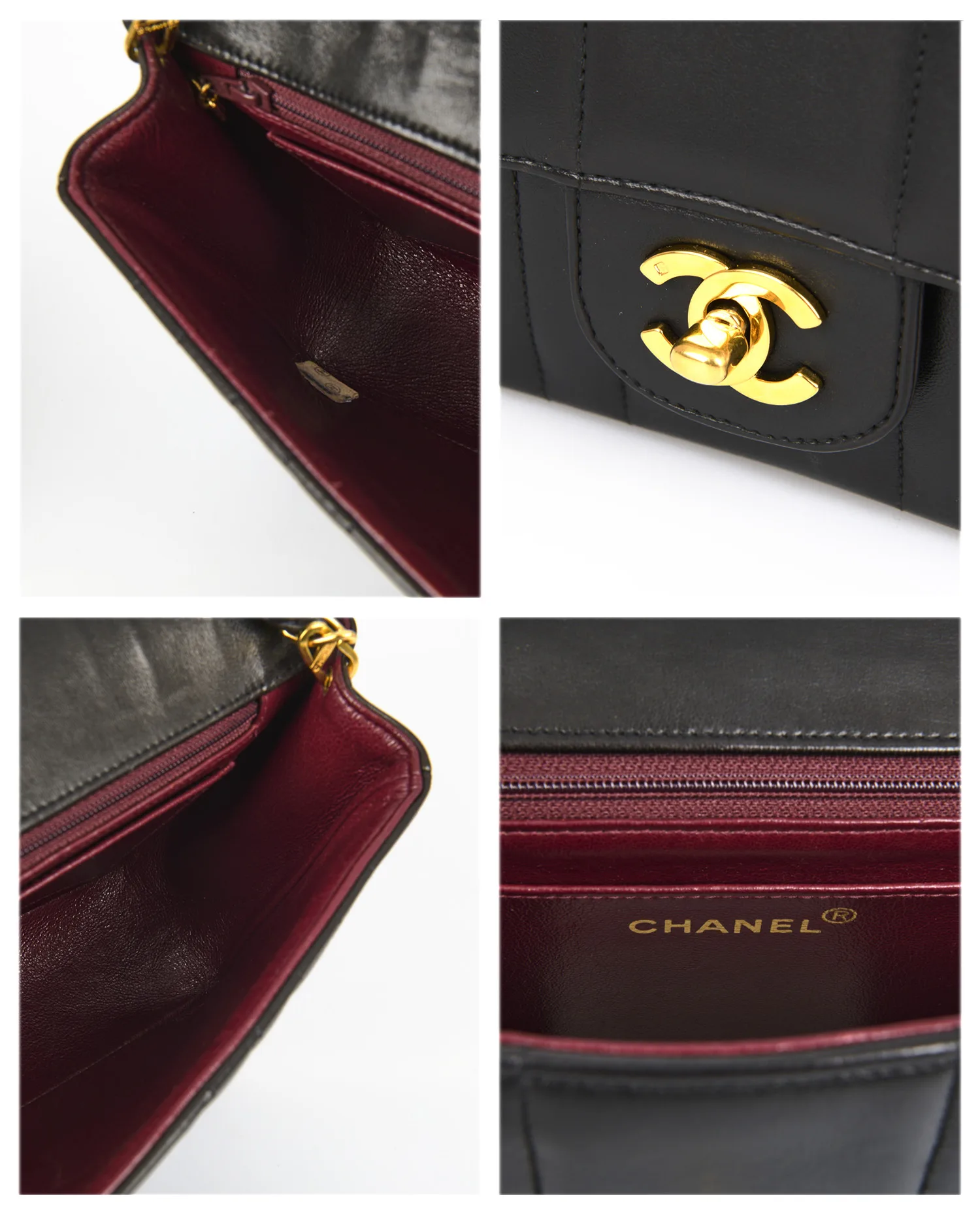 L’intérieur est doublé de cuir bordeaux, une caractéristique iconique des sacs Chanel vintage. Il comprend une poche plaquée et une poche zippée, permettant une organisation soignée des effets personnels. L’inscription “Chanel® Made in France” dorée figure à l’intérieur, confirmant l’authenticité et la période de production du sac.