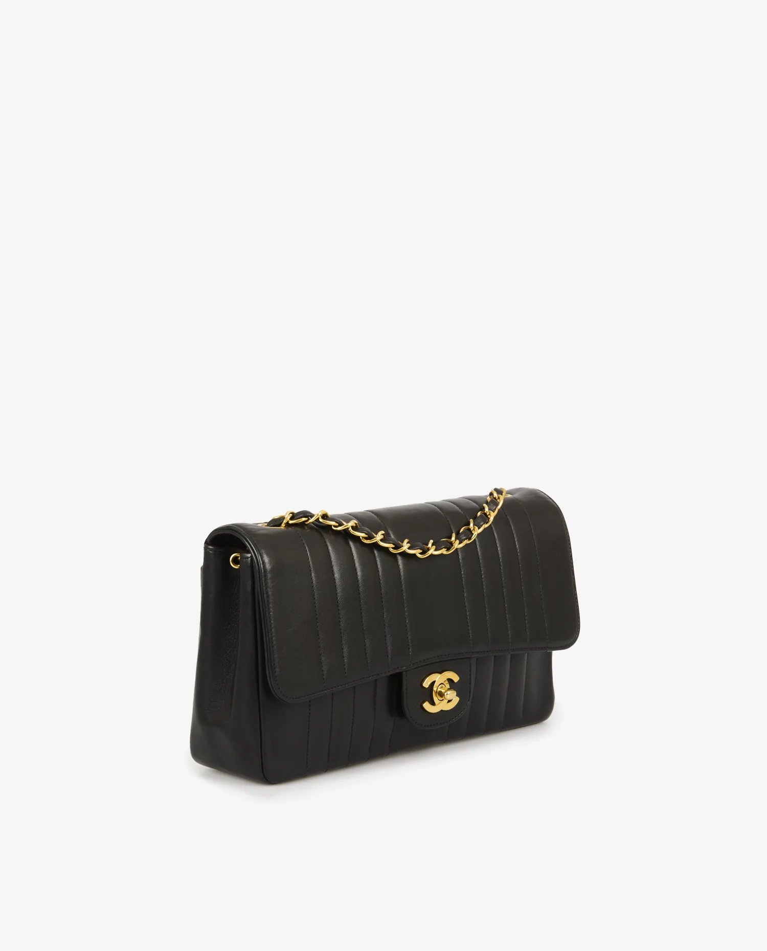 Au-delà du mythique 2.55 et des sacs à rabat matelassés en losange, Chanel a expérimenté dans les années 1990 des déclinaisons de ses modèles phares avec des motifs alternatifs, comme le matelassage vertical. Ce design, produit sur une période limitée, a acquis une dimension collector car il conserve tous les codes Chanel — fermoir CC, chaîne entrelacée, cuir d’agneau — tout en se démarquant par une esthétique plus graphique et sobre. Les sacs de cette série sont aujourd’hui recherchés pour leur rareté et leur place singulière dans l’histoire des collections vintage Chanel.
