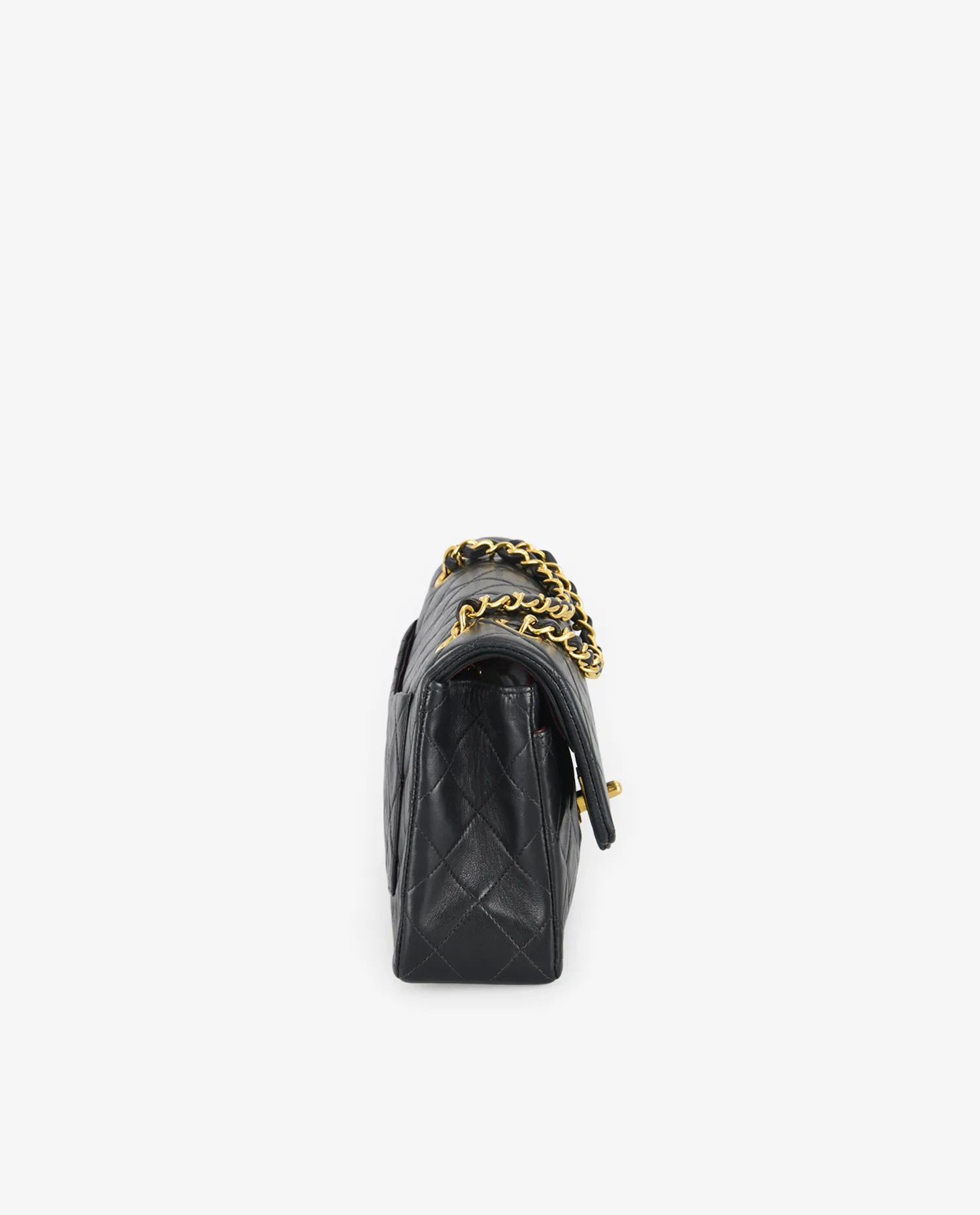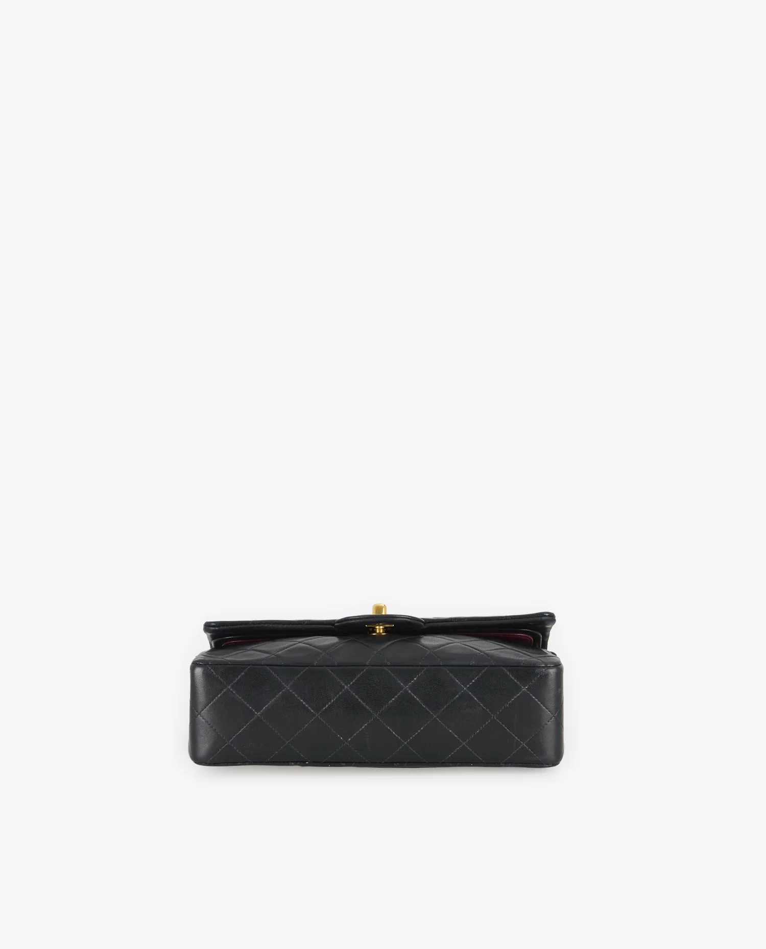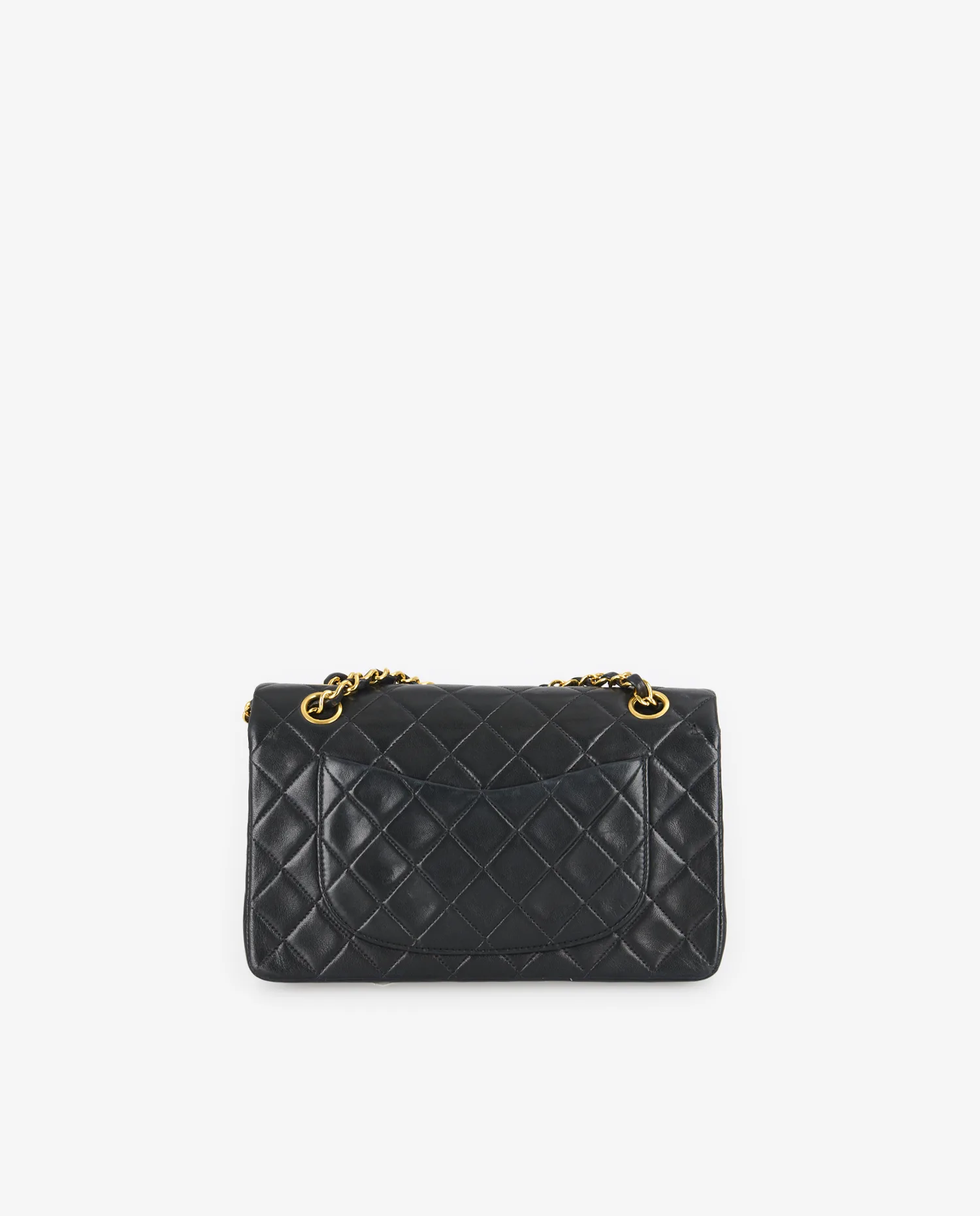 Le cuir d’agneau noir présente un matelassage en losanges parfaitement aligné, typique de l’ADN Chanel. La poche extérieure arrière en forme de demi-lune est discrète et fonctionnelle. Le fermoir double C doré est centré sous le rabat principal. La chaîne dorée entrelacée de cuir permet deux longueurs de porté. Les coutures ton sur ton sont régulières et renforcent la structure rigide du sac. Le dessous plat du sac est structuré pour assurer sa stabilité à la pose. Les coins présentent une légère patine, signe de son authenticité vintage.