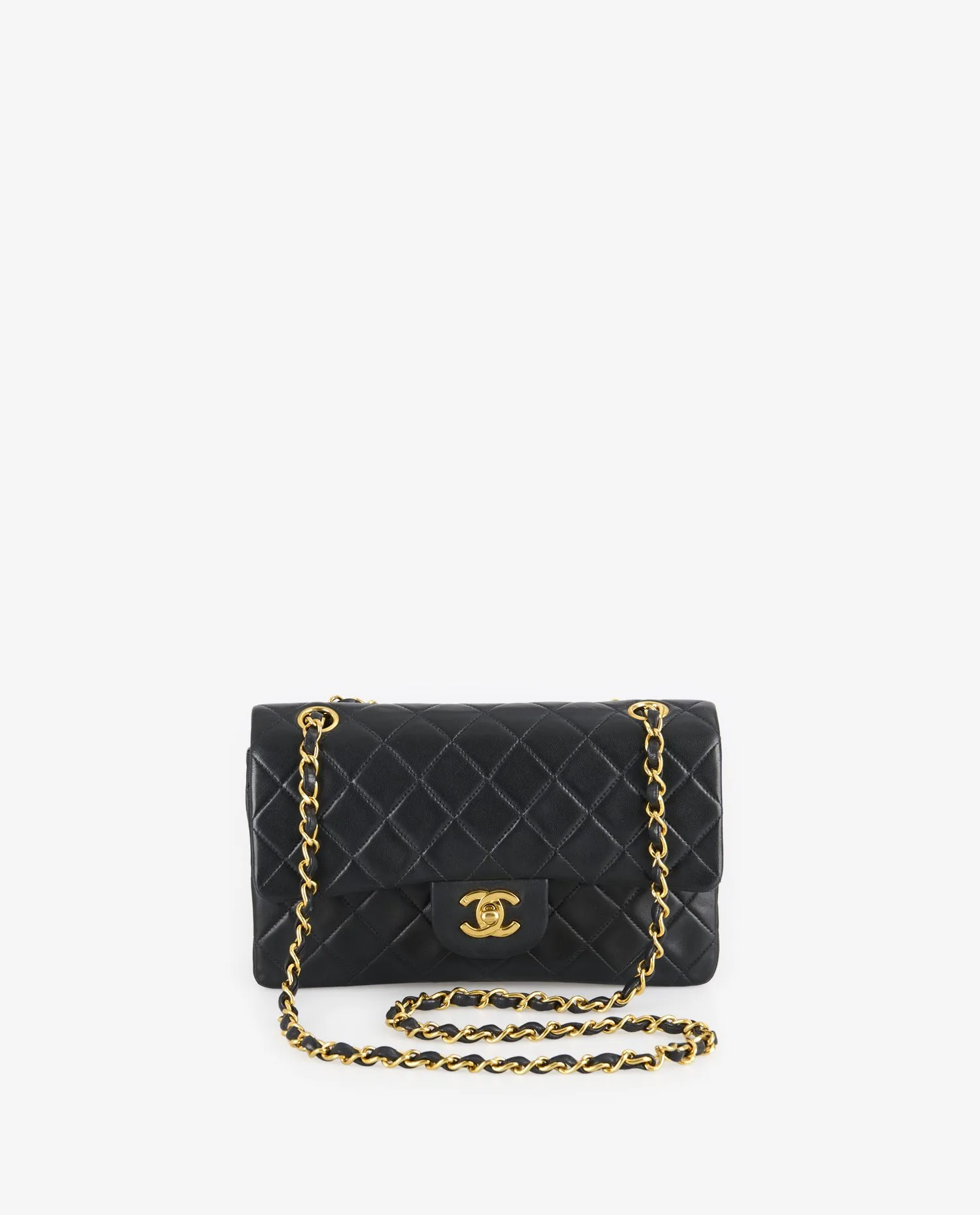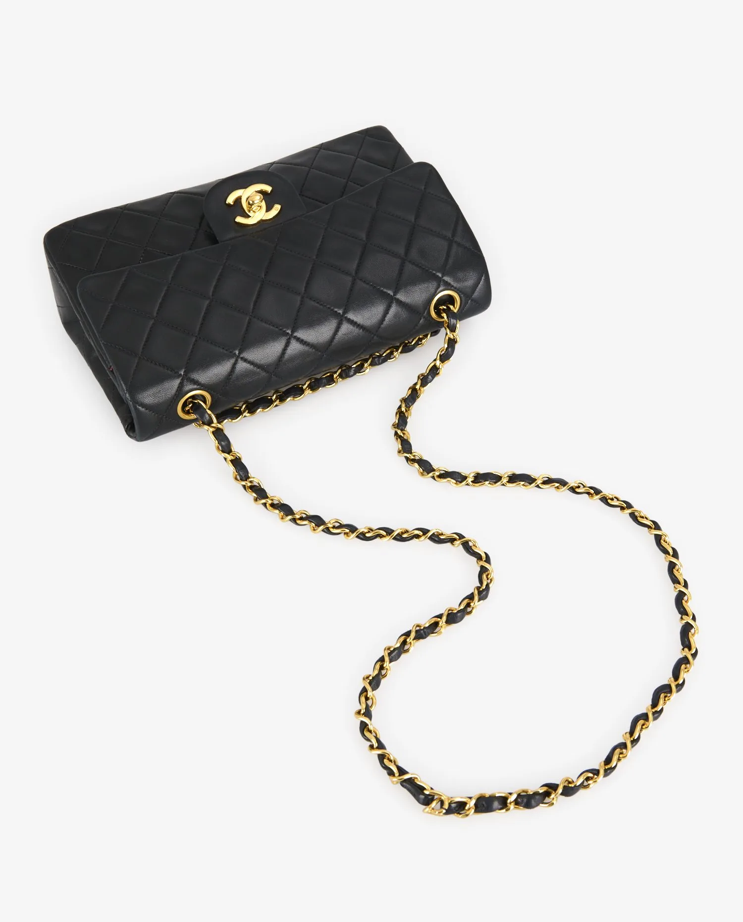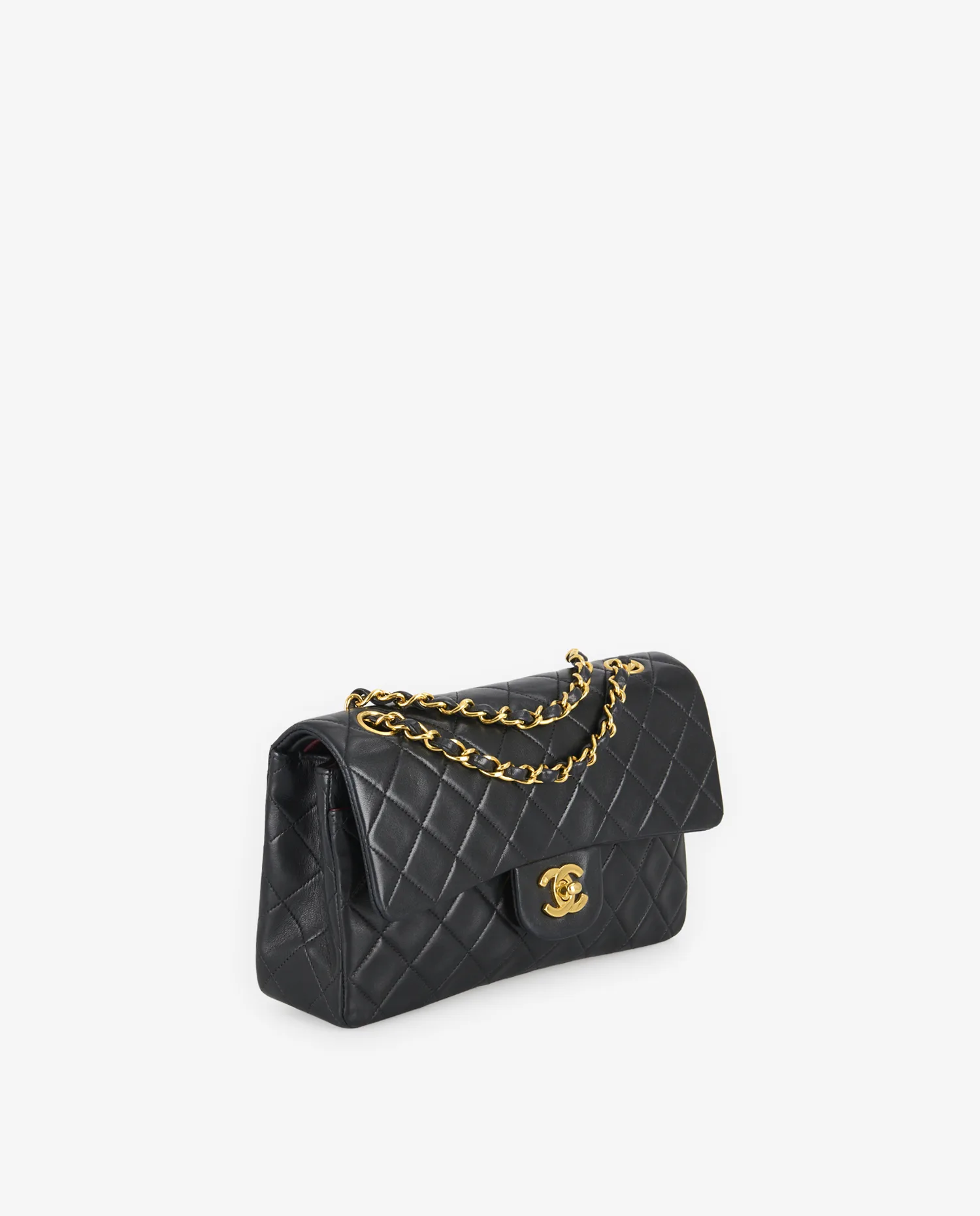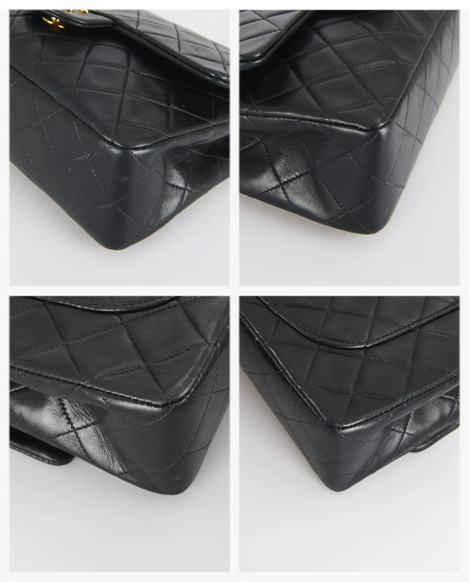 Le cuir d’agneau noir présente un matelassage en losanges parfaitement aligné, typique de l’ADN Chanel. La poche extérieure arrière en forme de demi-lune est discrète et fonctionnelle. Le fermoir double C doré est centré sous le rabat principal. La chaîne dorée entrelacée de cuir permet deux longueurs de porté. Les coutures ton sur ton sont régulières et renforcent la structure rigide du sac. Le dessous plat du sac est structuré pour assurer sa stabilité à la pose. Les coins présentent une légère patine, signe de son authenticité vintage.