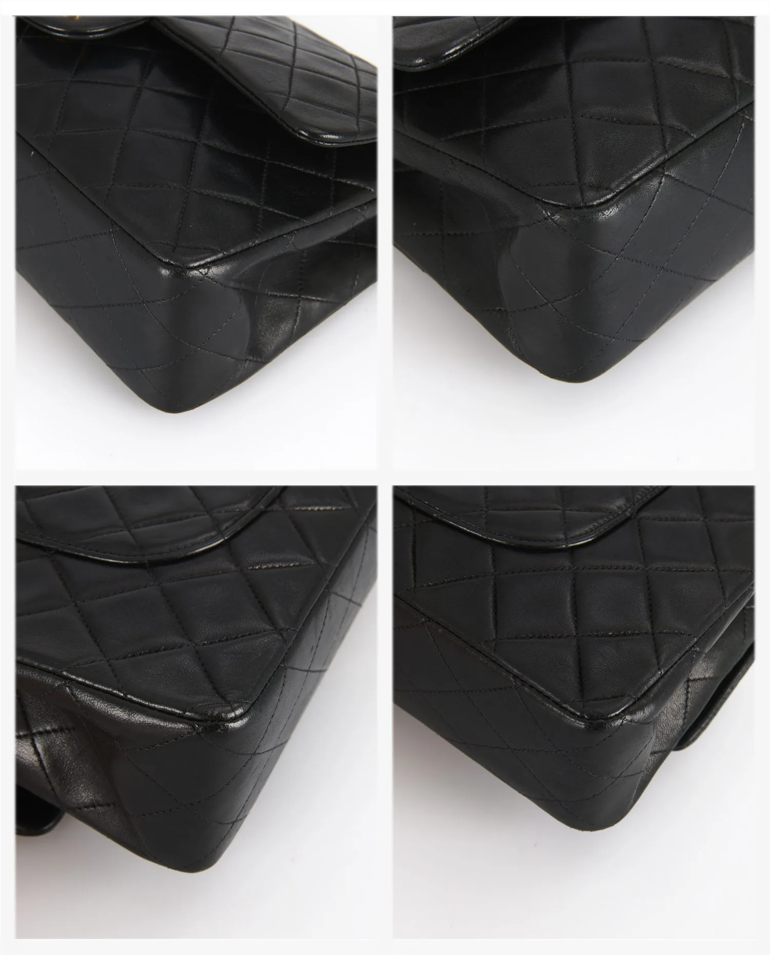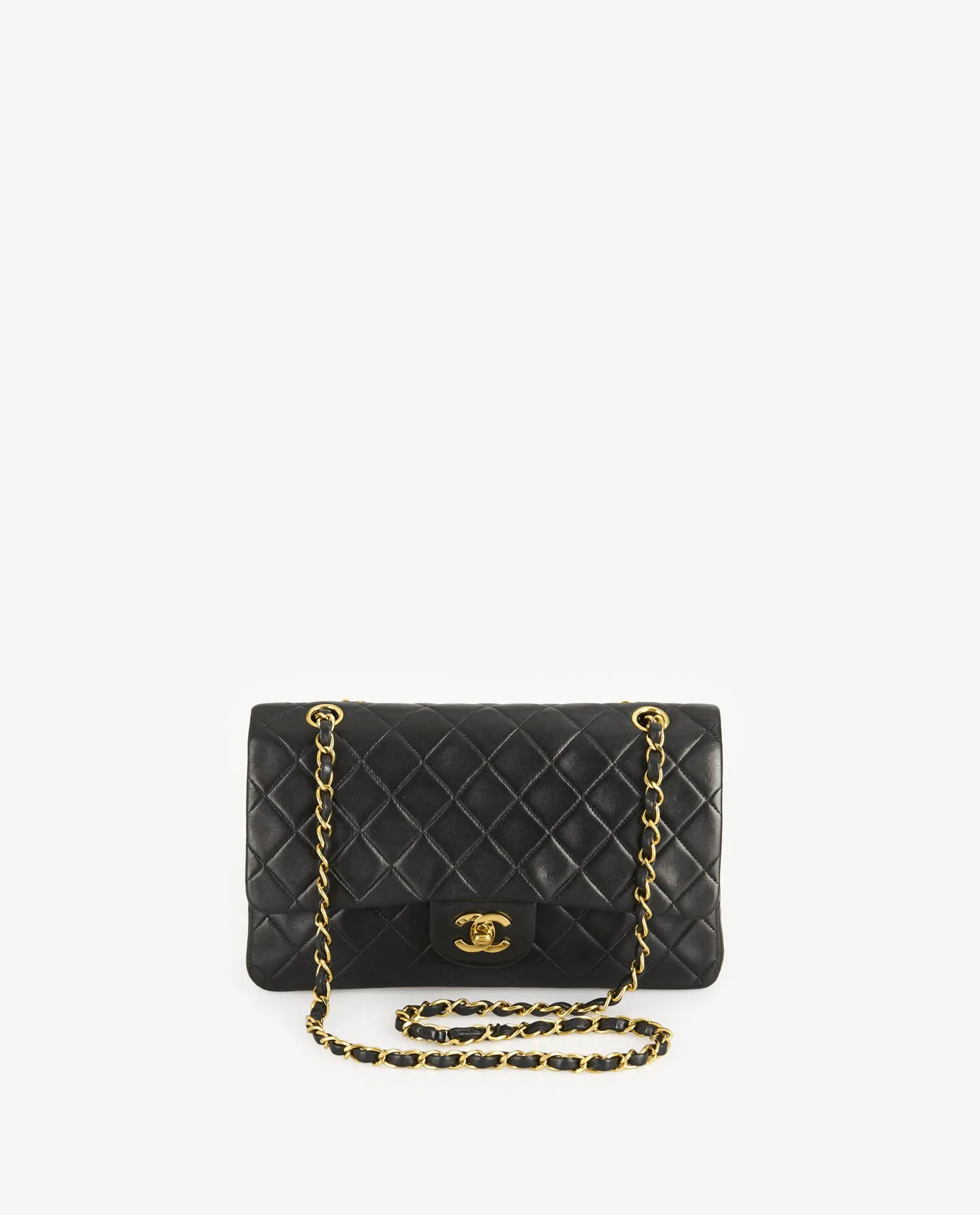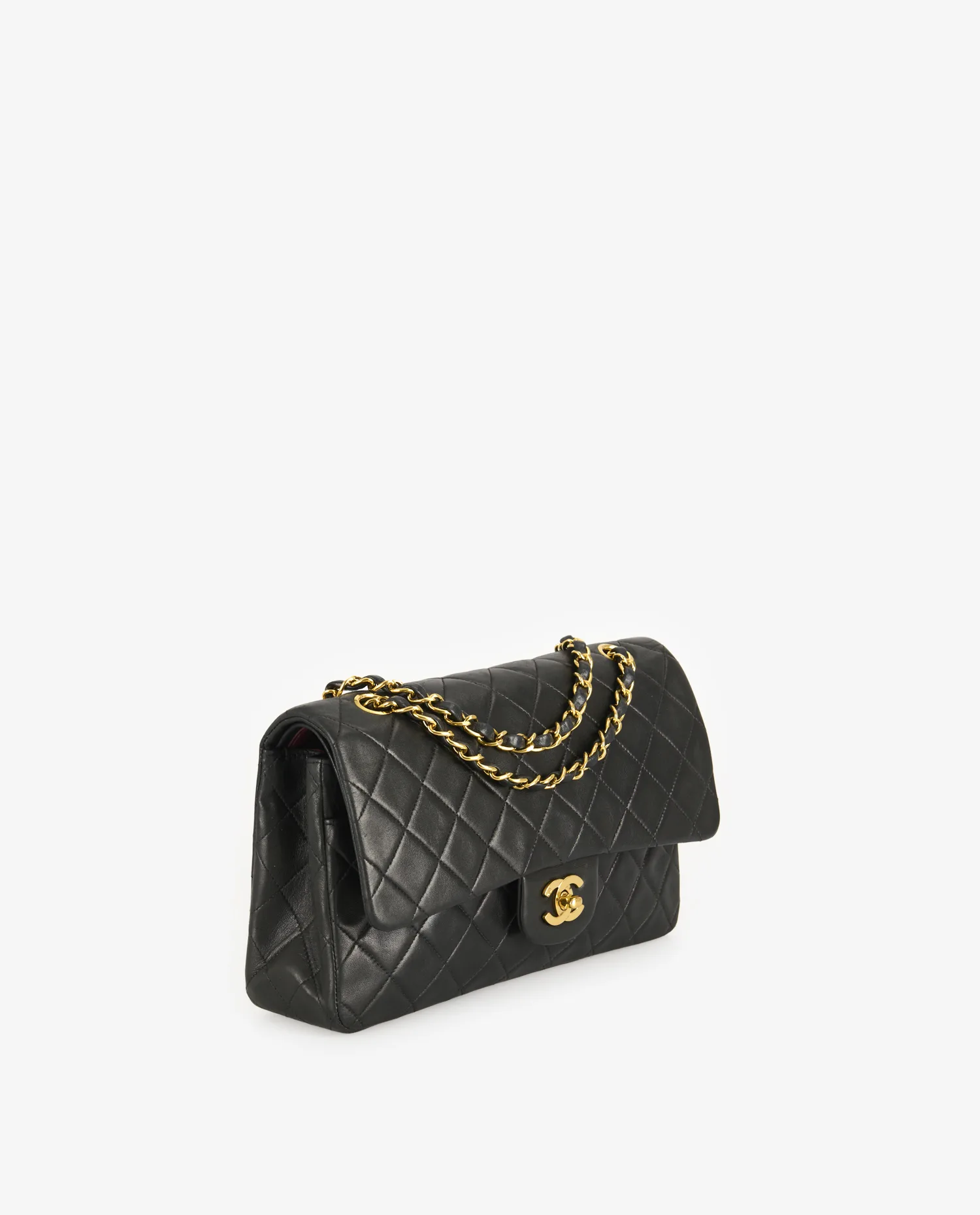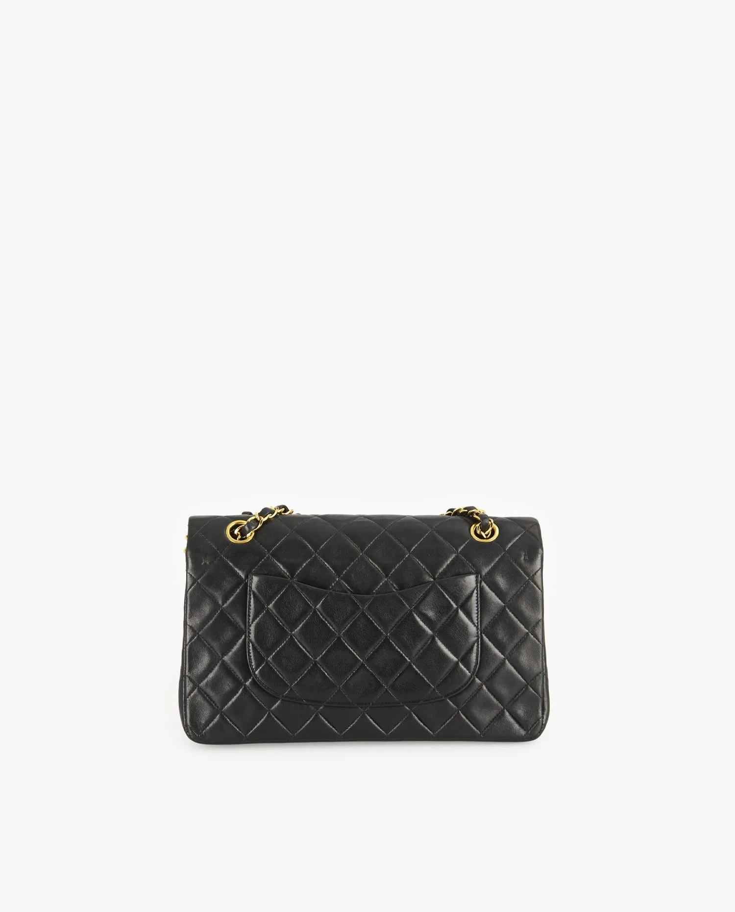 Le cuir d’agneau noir présente un aspect lisse et légèrement brillant, avec un matelassage en losanges régulier sur toutes les faces. La chaîne entrelacée de cuir noir et de maillons dorés vieil or permet un porté épaule confortable. Le dos du sac est orné d’une poche plaquée demi-lune, caractéristique du design Chanel. Le fermoir CC doré est gravé, et la structure globale du sac conserve ses lignes nettes malgré son âge. Dimensions : 25 cm de largeur, 15 cm de hauteur, 6,5 cm de profondeur.