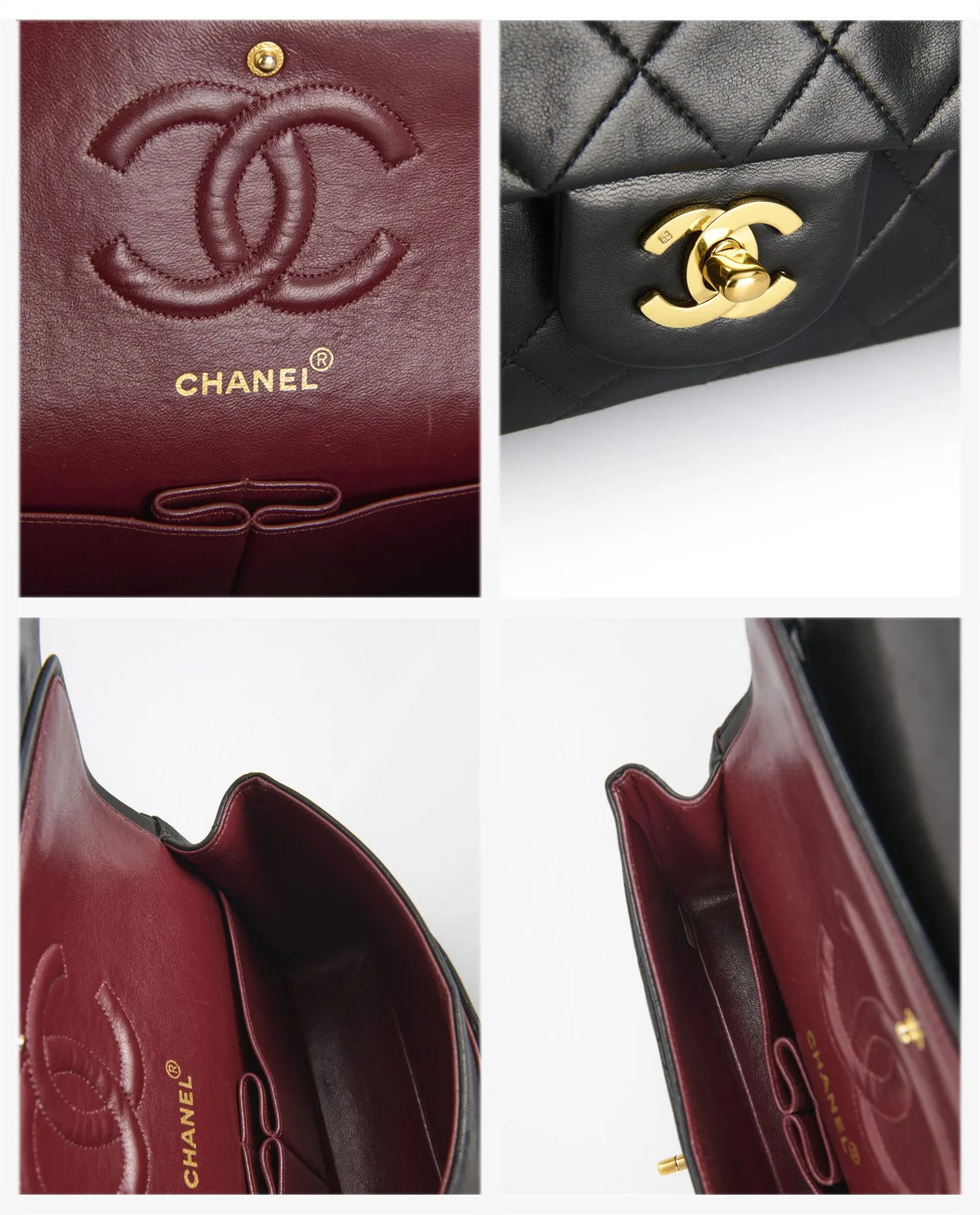 L’intérieur est doublé de cuir bordeaux, couleur emblématique des modèles classiques de la maison. Il se compose de deux compartiments principaux avec une petite poche zippée et deux fentes plates à l’avant. Le rabat interne est orné du logo CC embossé. Les finitions intérieures témoignent d’un savoir-faire artisanal minutieux, fidèle aux standards de qualité des années 90.