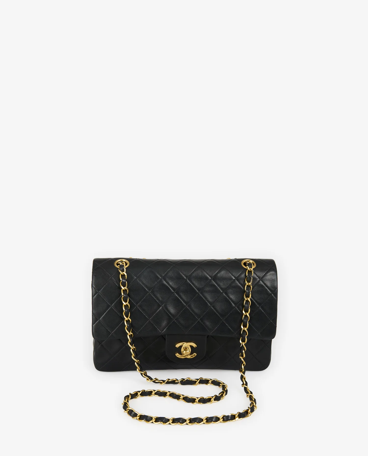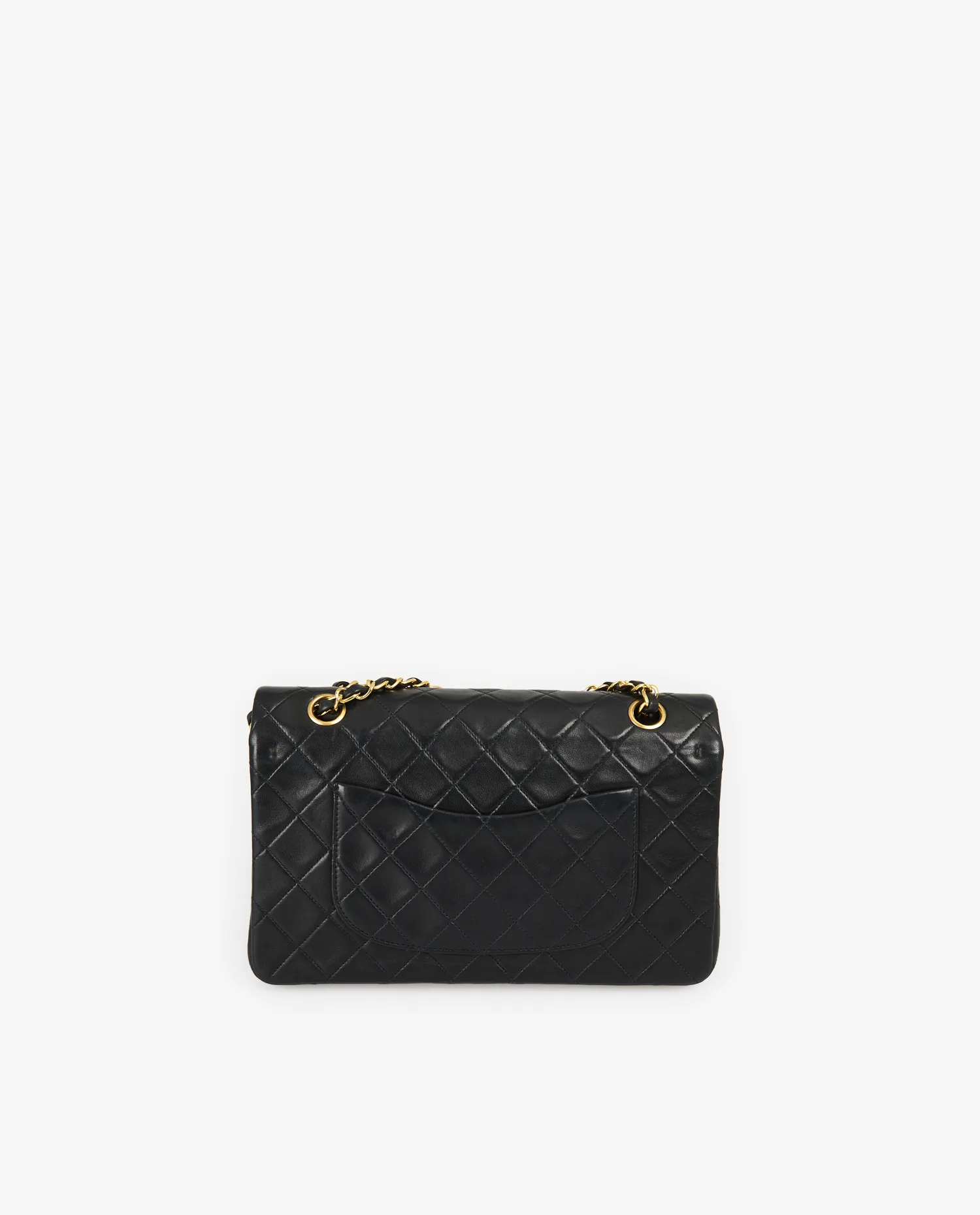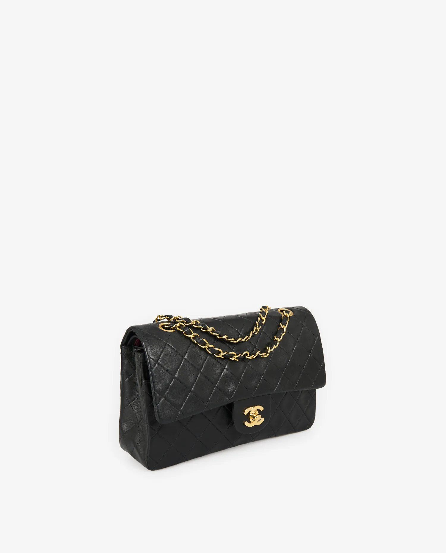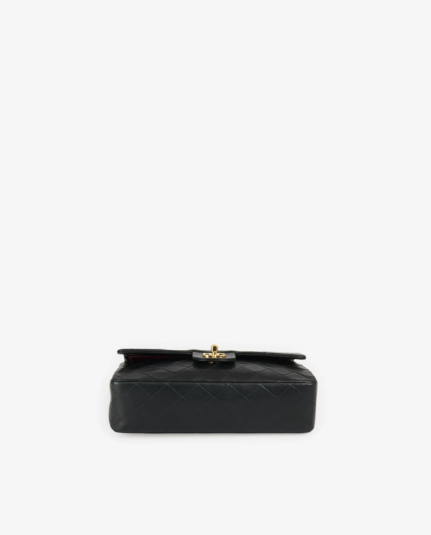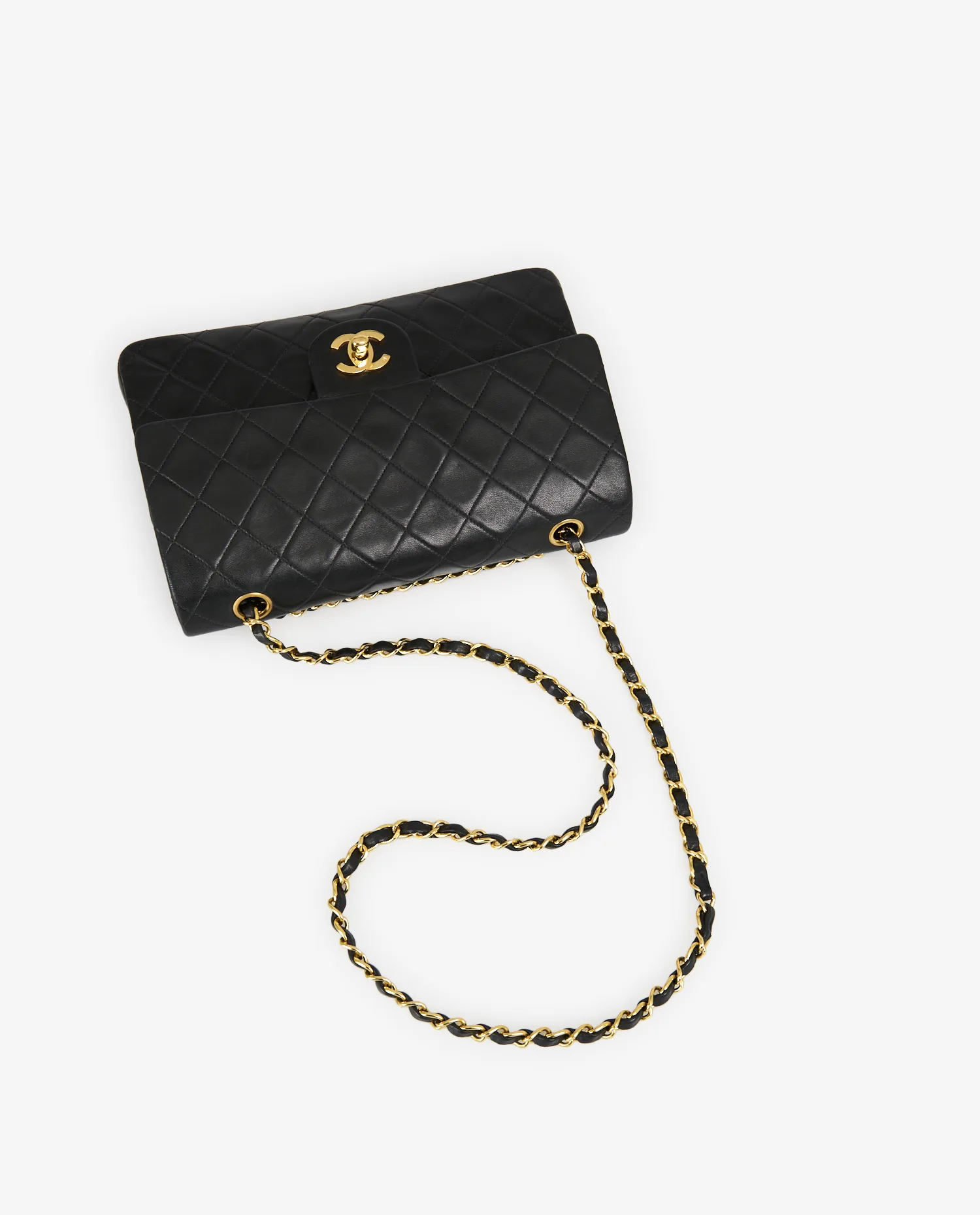 Le cuir d’agneau noir présente un aspect lisse, au grain fin, avec un matelassage régulier en losange, renforcé par des coutures précises. Le fermoir tourniquet doré arbore le logo CC, typique des modèles de cette époque. La chaîne entrelacée, également dorée, permet un porté épaule ou croisé. Le sac est muni d’une poche plaquée au dos, pratique pour les petits effets personnels. Ses dimensions sont d’environ 25 cm de large, 15 cm de hauteur et 6,5 cm de profondeur.