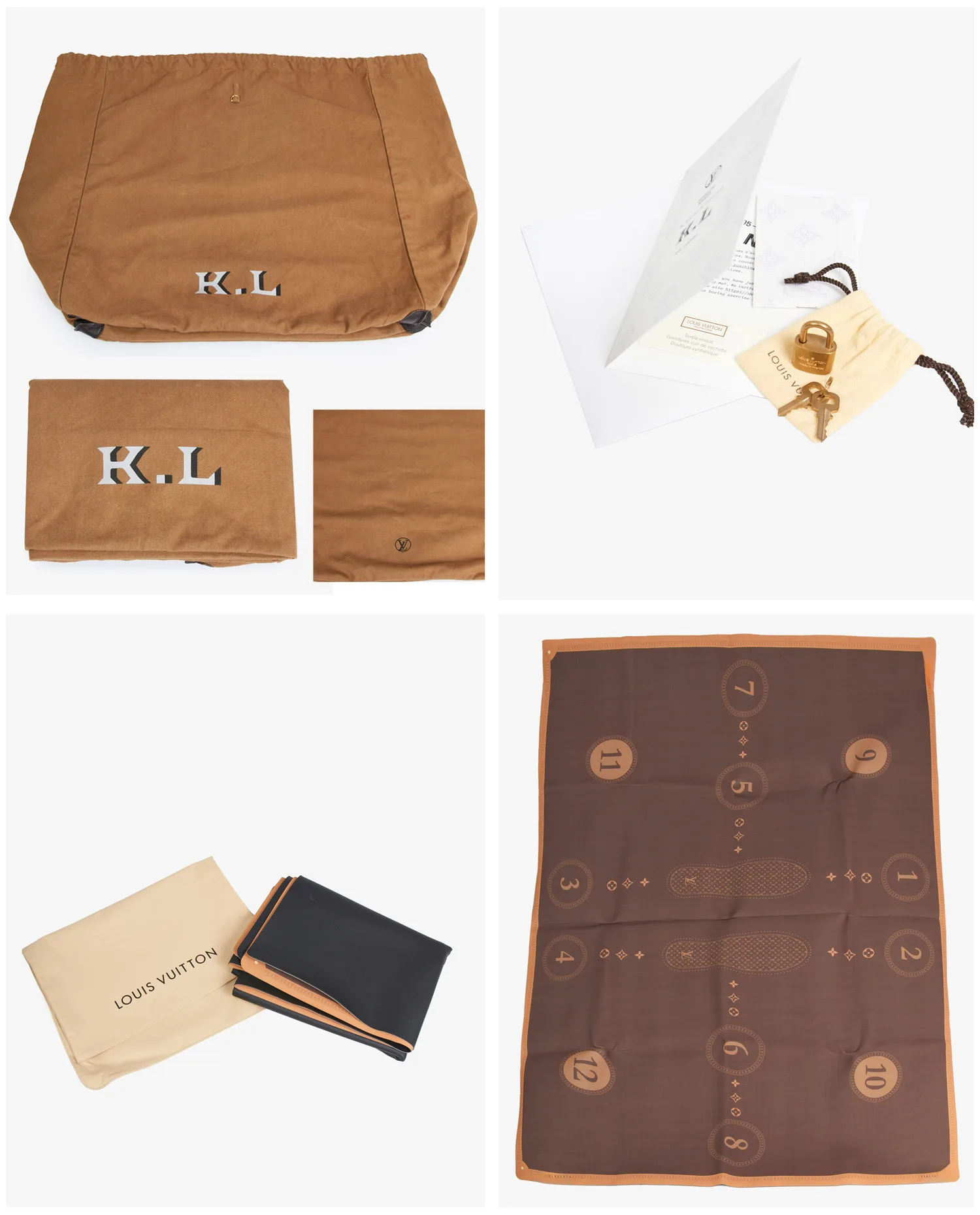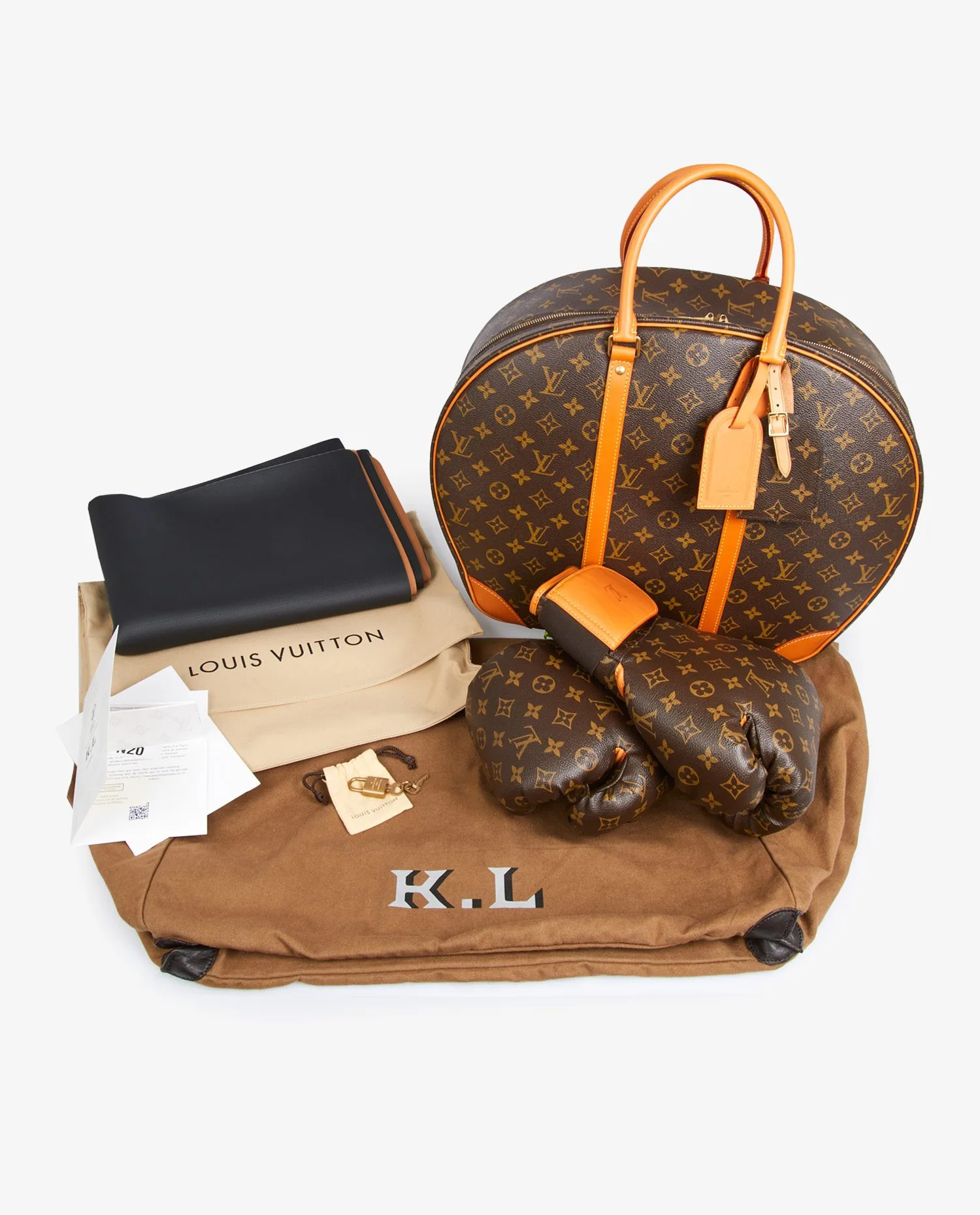 Sac et gants de boxe Louis Vuitton x Karl Lagerfeld. Cadenas et clefs. Un livret d’explication est livré avec. En très bon état.