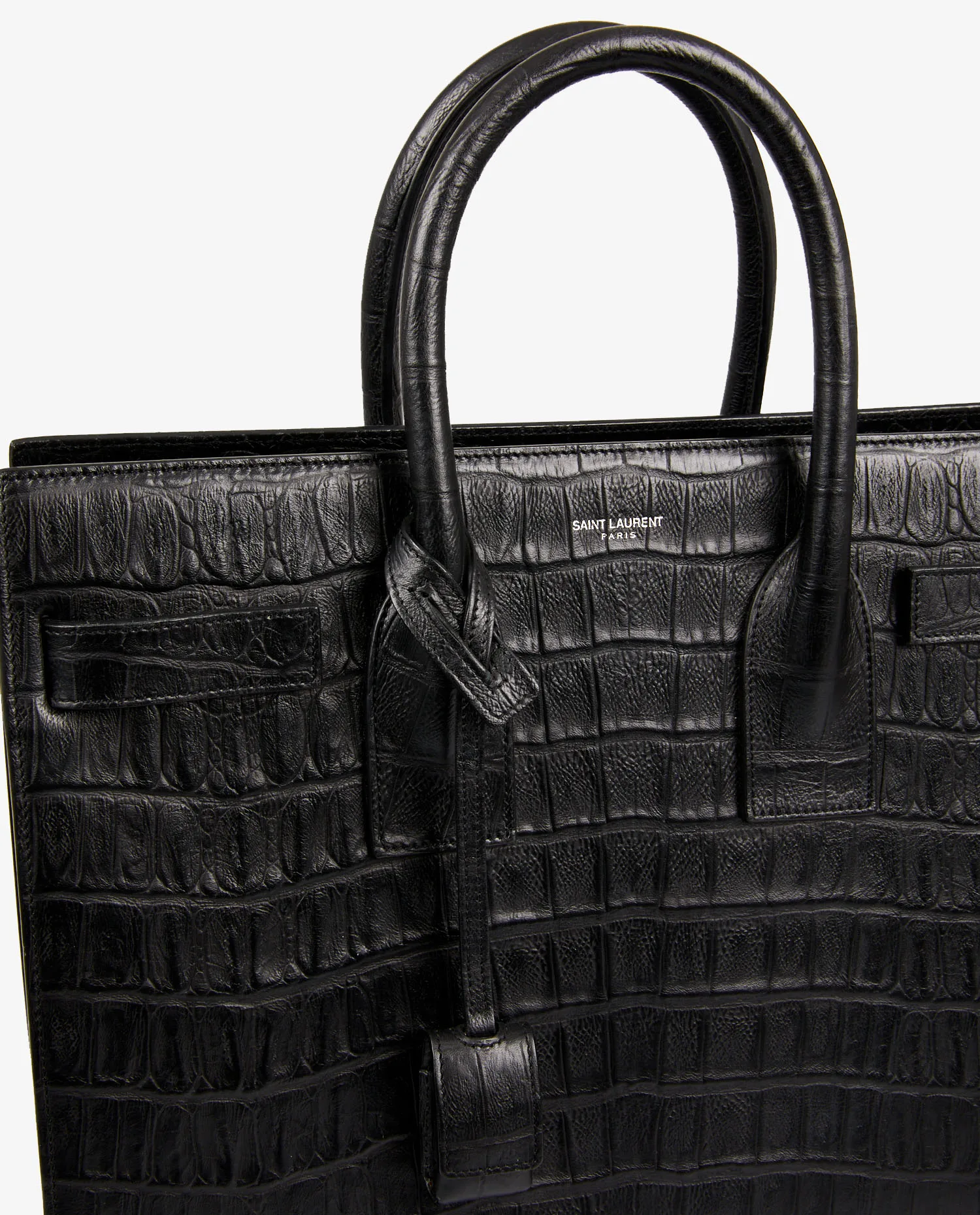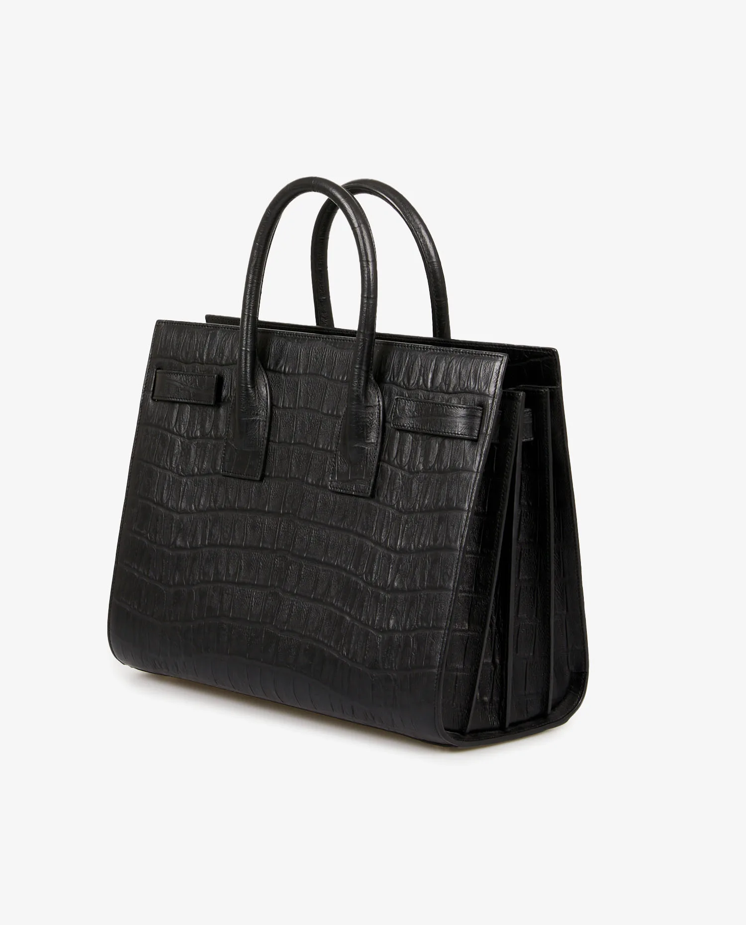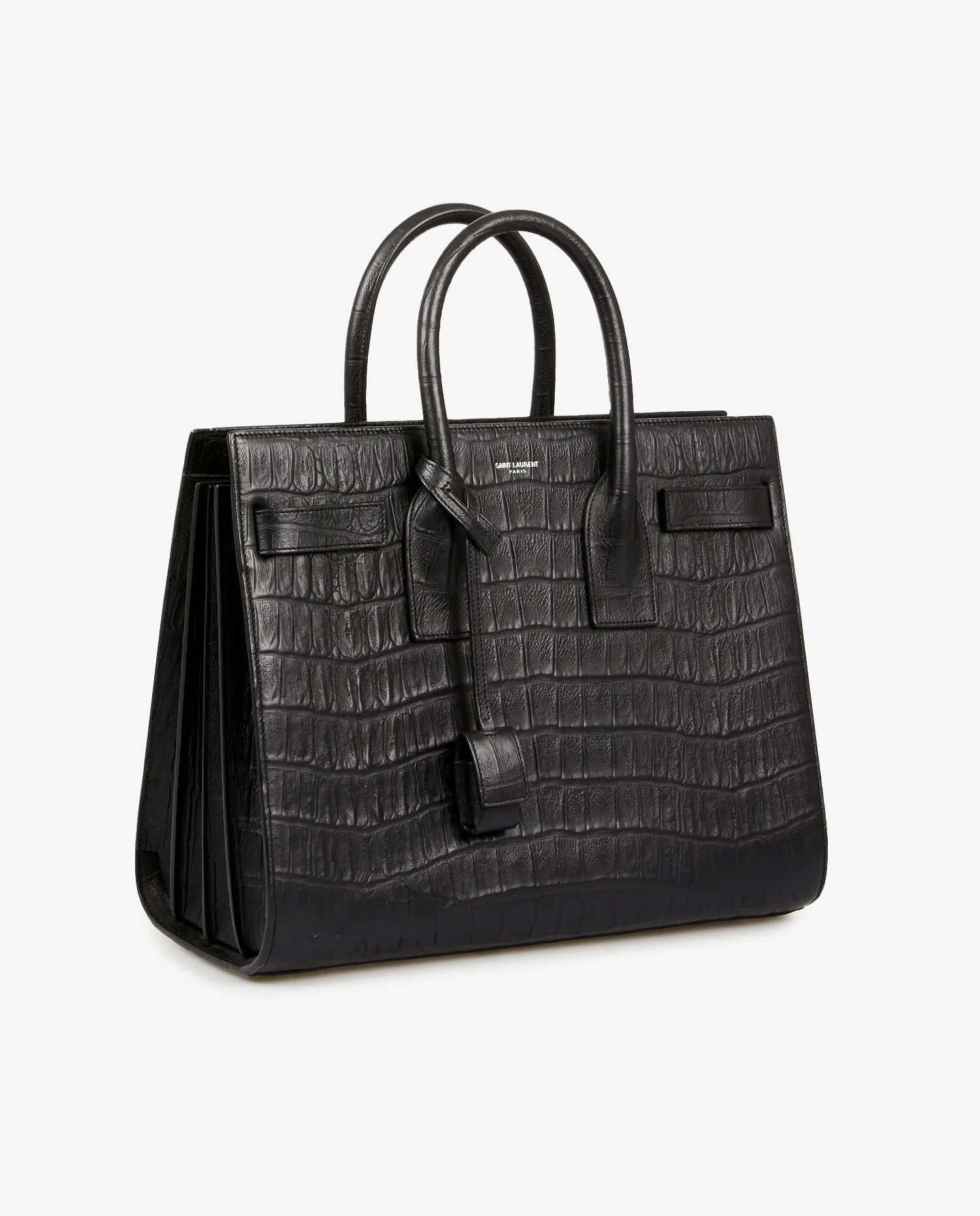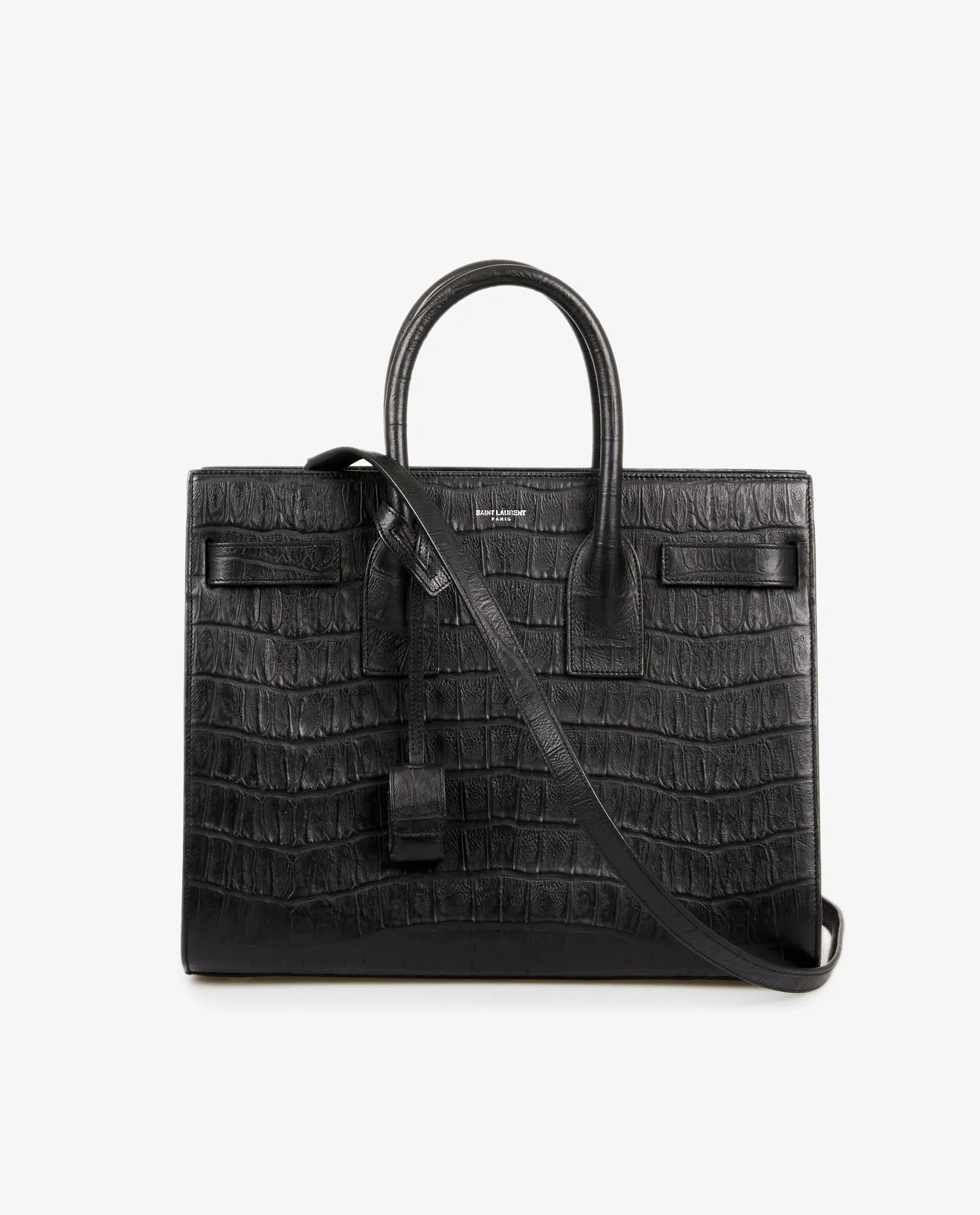 Sac de jour small Saint Laurent en cuir embossé effet crocodile. Porté à la main ou bien à l’épaule à l’aide d’une bandoulière amovible (108cm). Grand espace de rangement à l’intérieur. En très bon état.