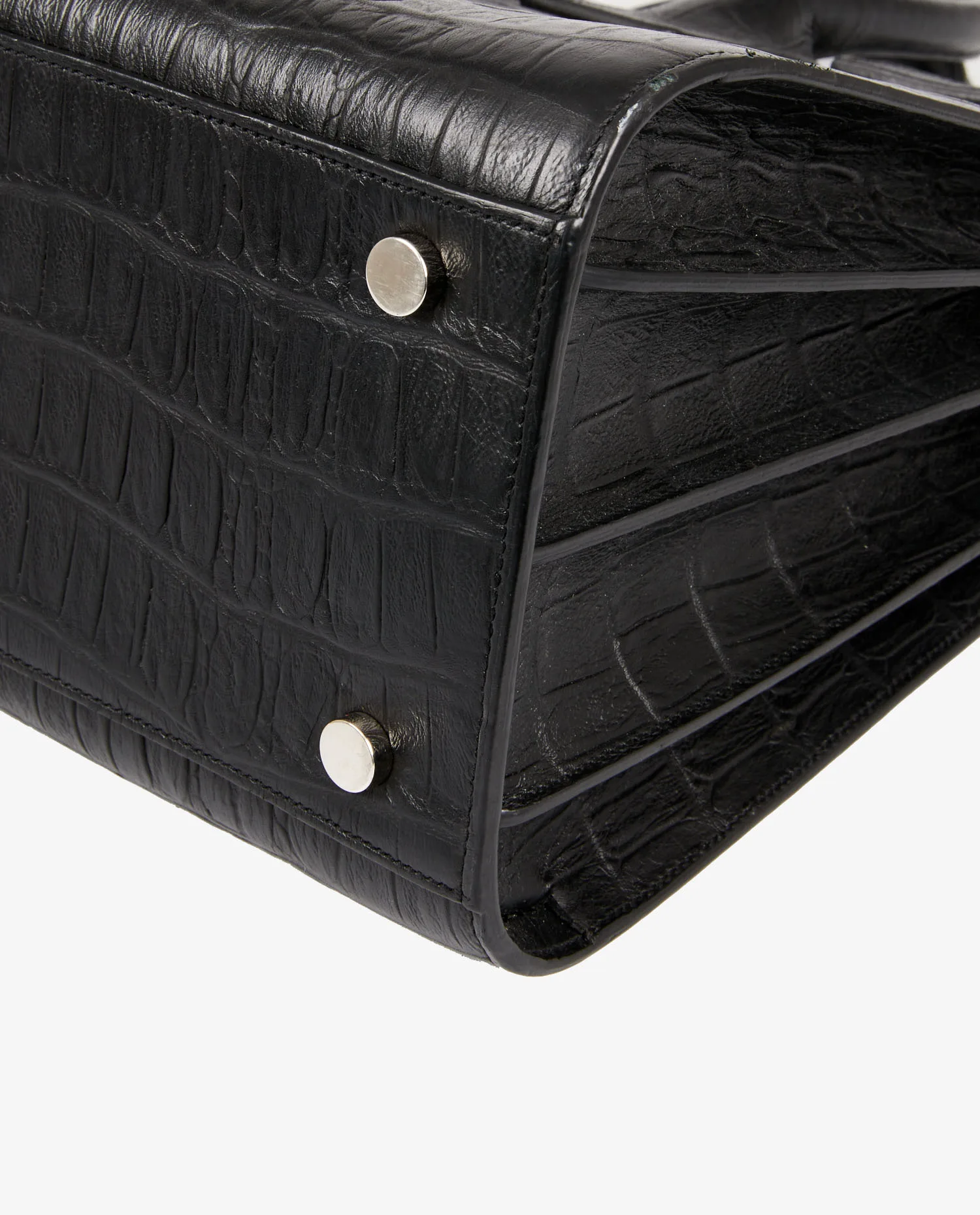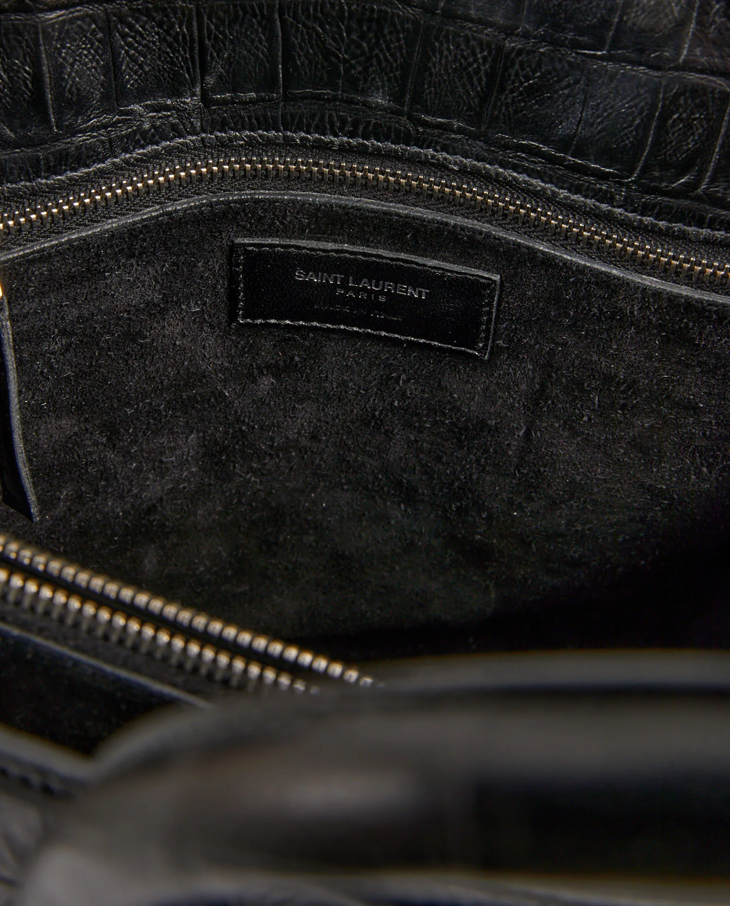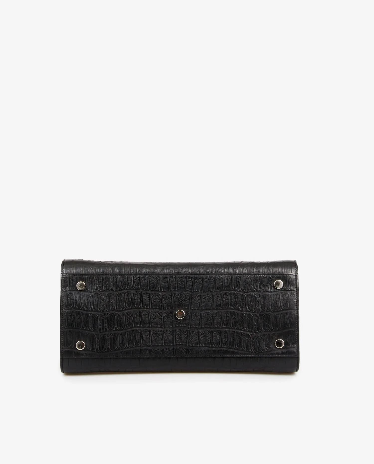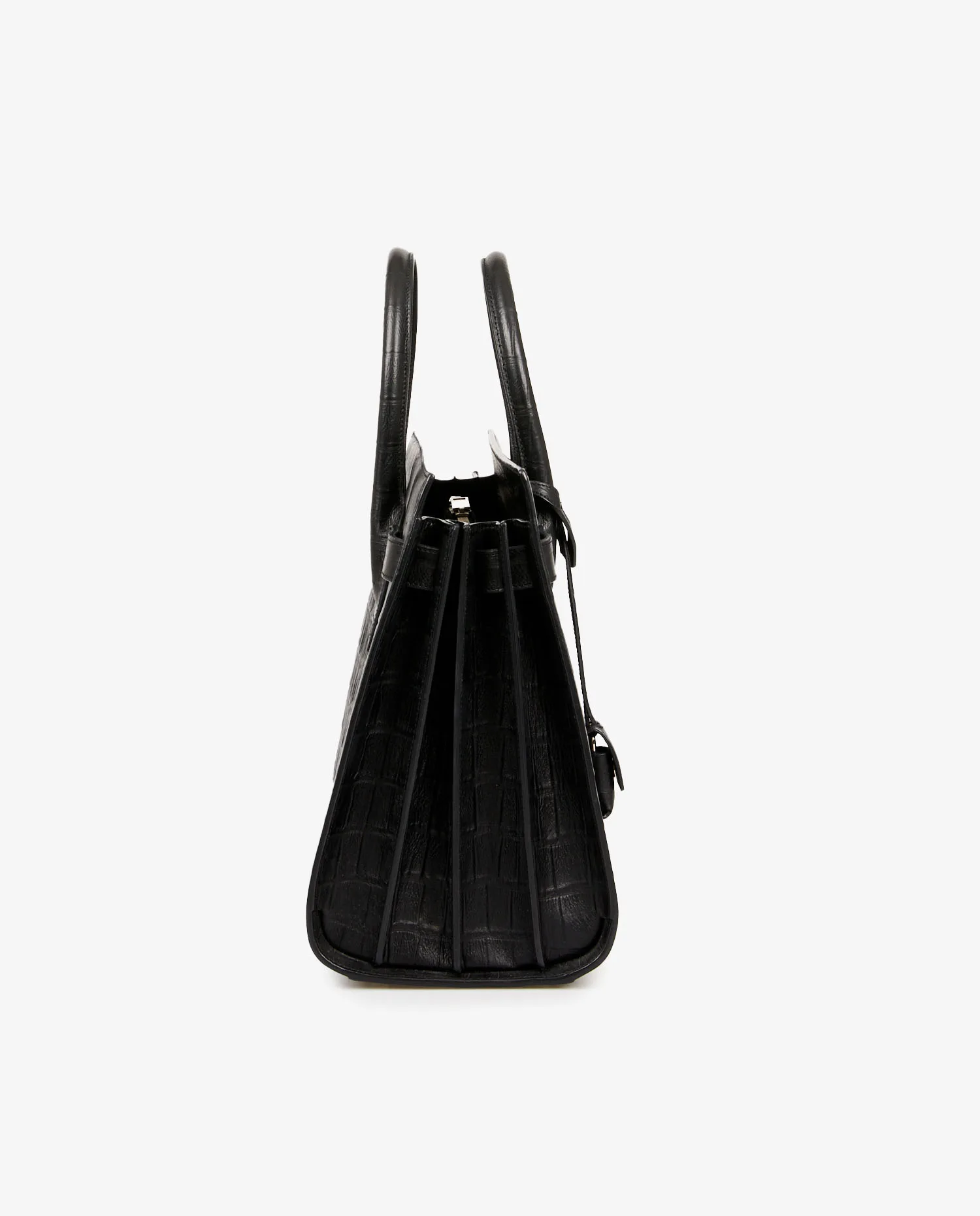 Sac de jour small Saint Laurent en cuir embossé effet crocodile. Porté à la main ou bien à l’épaule à l’aide d’une bandoulière amovible (108cm). Grand espace de rangement à l’intérieur. En très bon état.