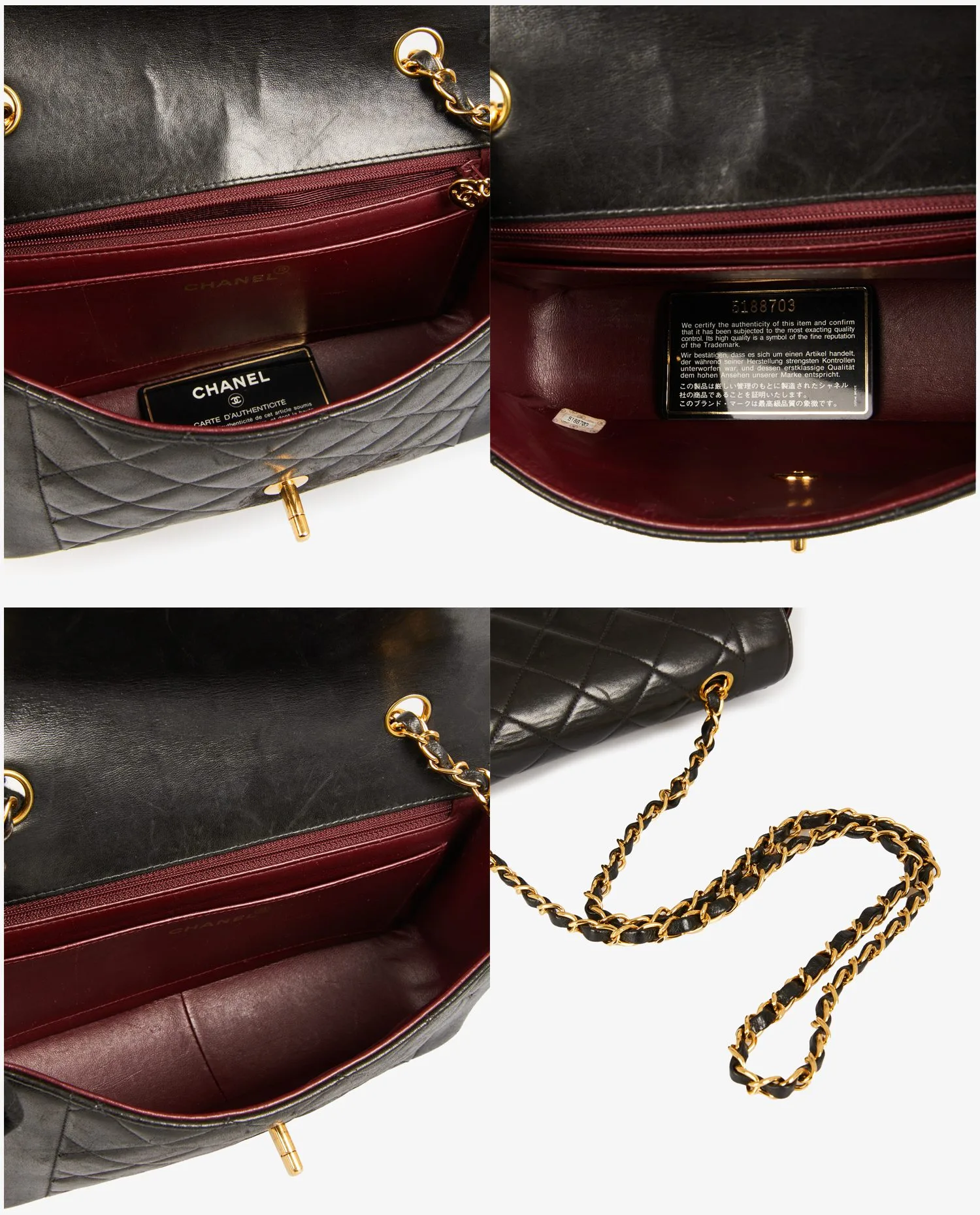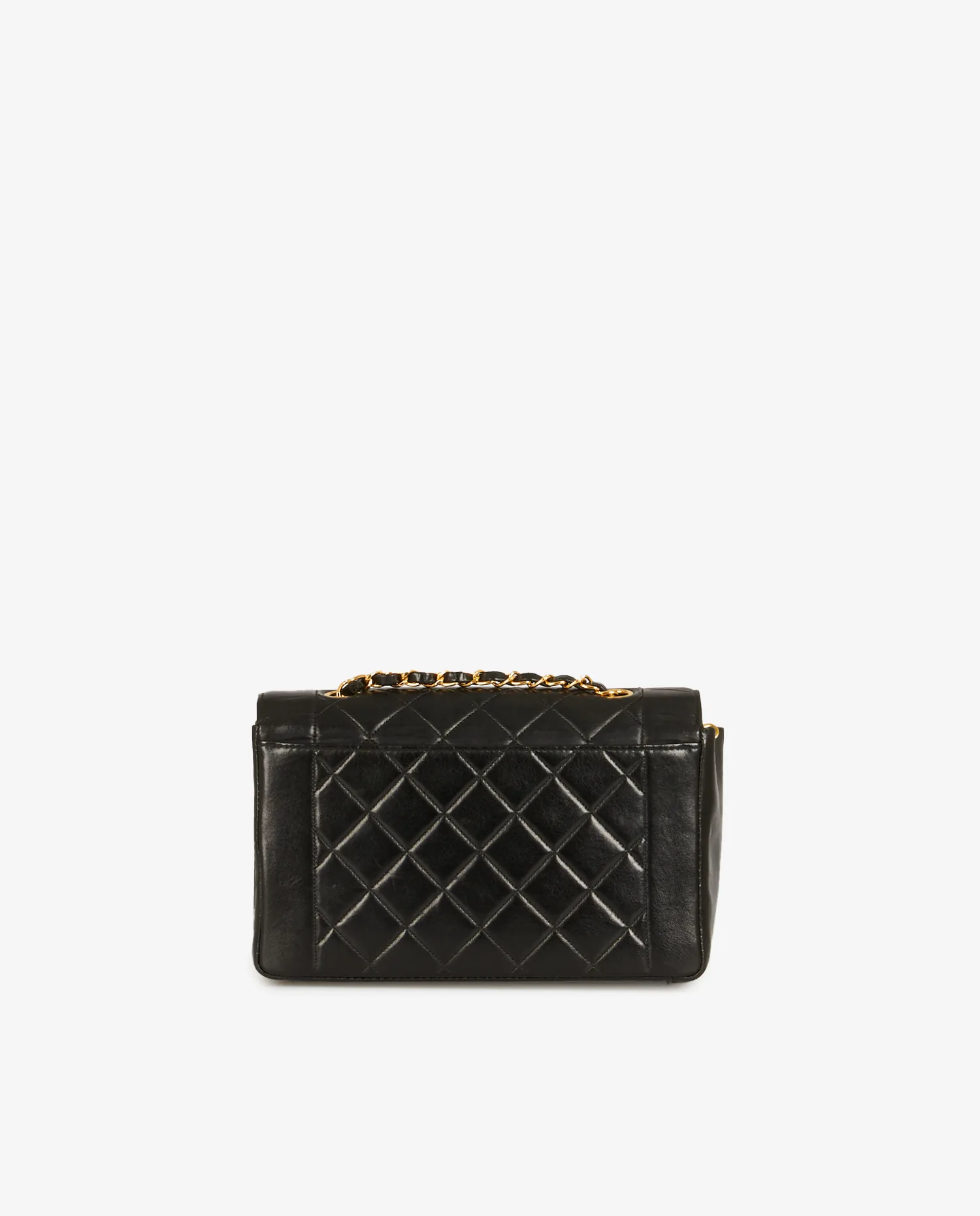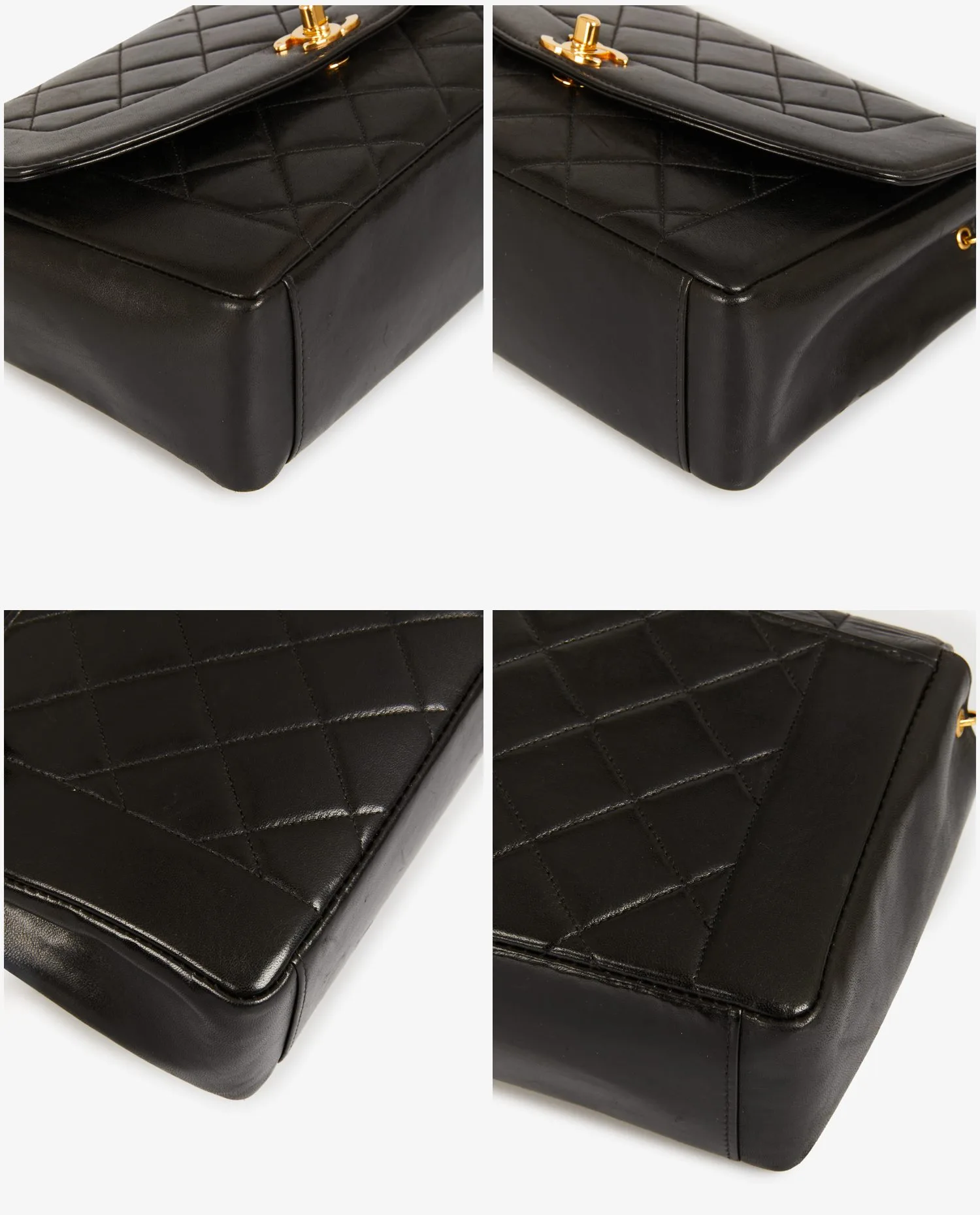 Sac Diana Chanel en cuir d’agneau noir. Porté épaule ou en bandoulière (106cm). Taille médium. En très bon état.
