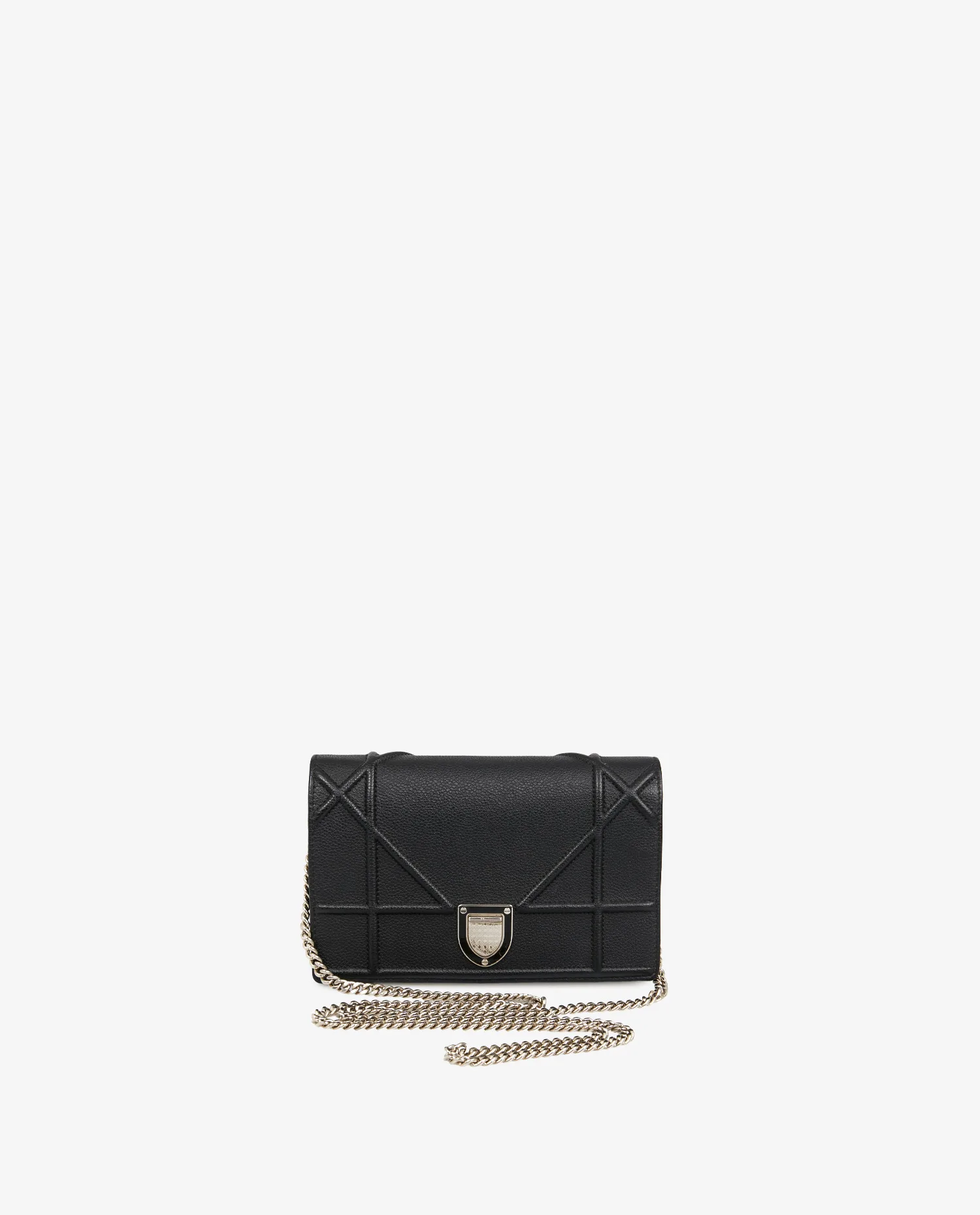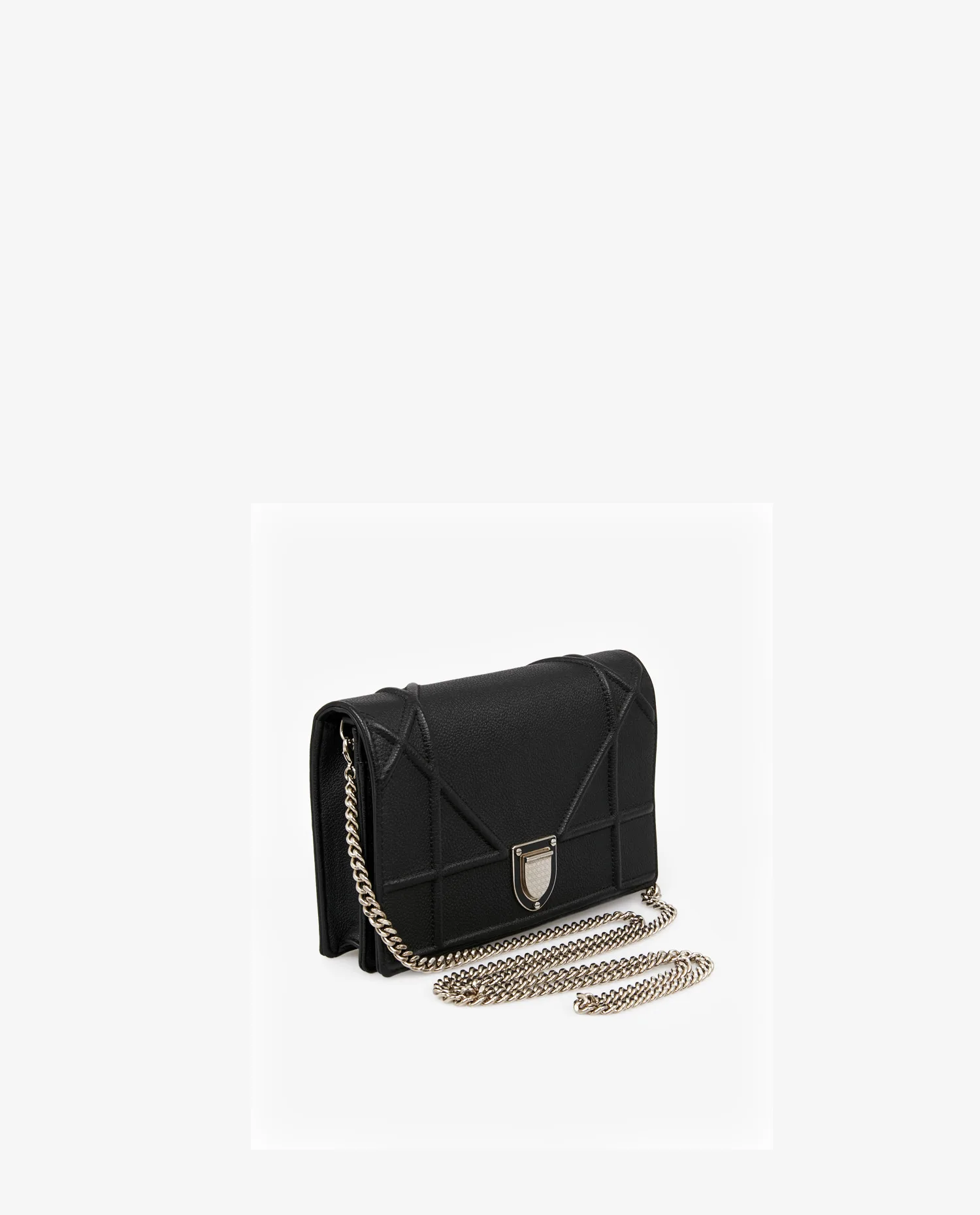 Le cuir grainé noir utilisé ici se distingue par sa texture légèrement rugueuse au toucher, particulièrement résistante aux rayures et à l’usage quotidien. La structure rigide du sac lui permet de conserver parfaitement sa forme, même lorsqu’il est rempli. Les lignes géométriques embossées, signature du Diorama, dessinent des croisillons nets et réguliers, apportant du relief et de la profondeur à l’ensemble. Le fermoir à bouclier, en métal argenté poli, est gravé “Christian Dior” et s’ouvre par une pression sécurisée. La bandoulière chaîne argentée peut être portée double sur l’épaule ou en version longue croisée. Le format PM, compact mais structuré, convient parfaitement aux essentiels du quotidien.