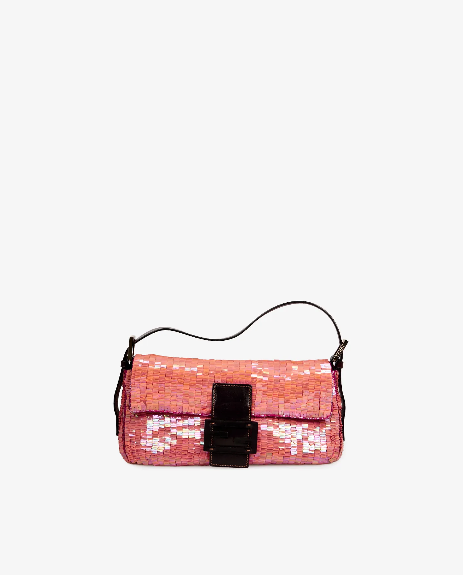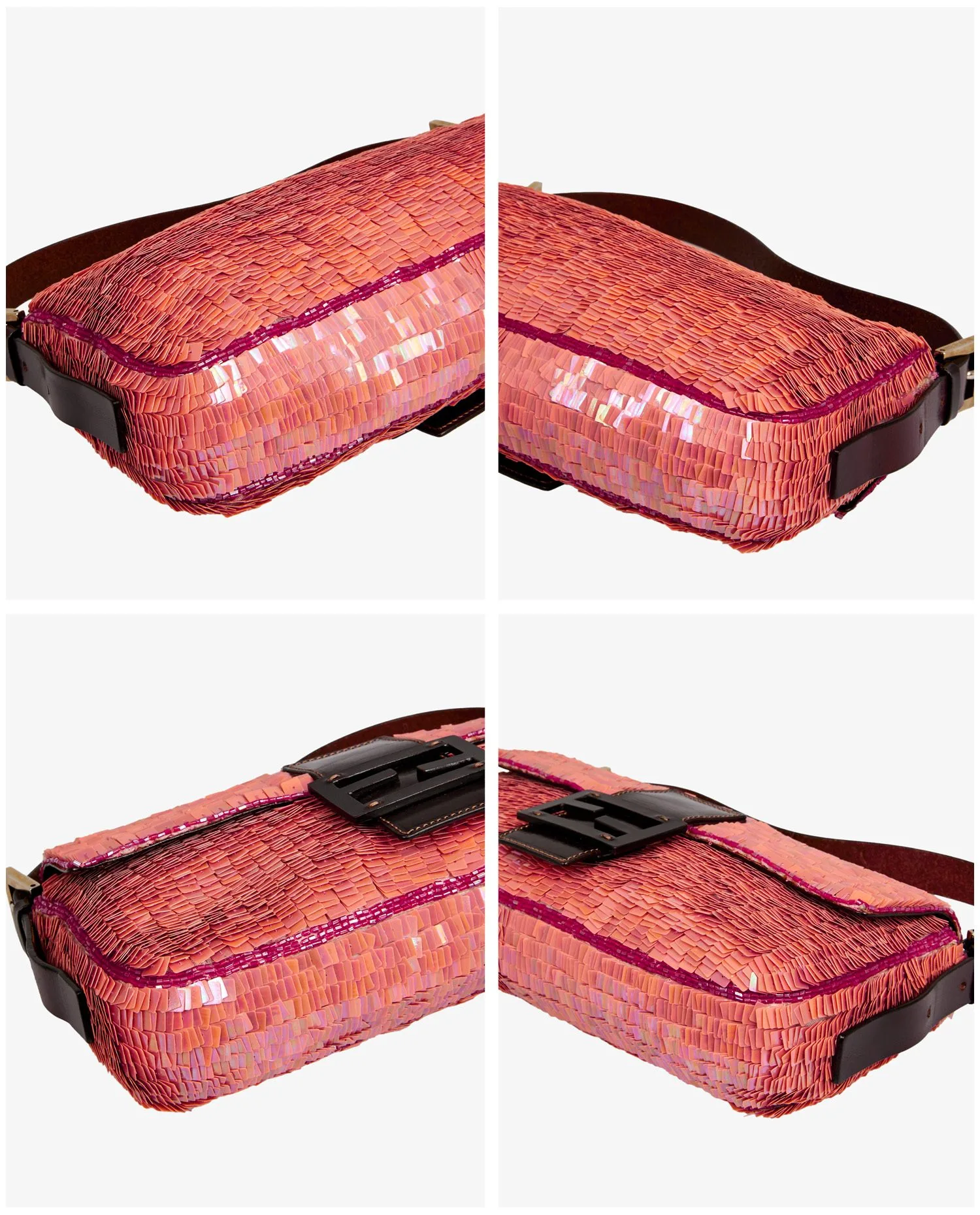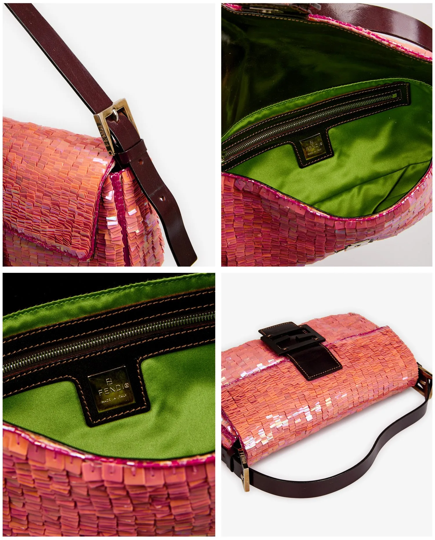 Sac Baguette Fendi en sequins couleur corail. Porté au bras ou à l’épaule à l’aide d’une anse en cuir marron. L’intérieur est en satin vert avec une petite poche zippée. En très bon état.