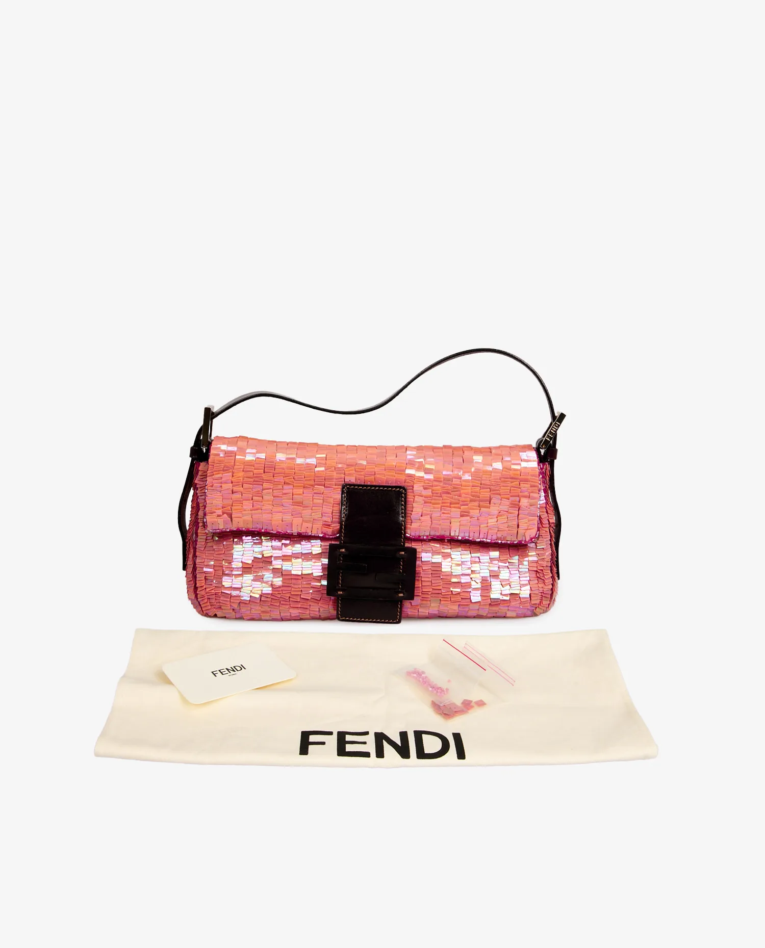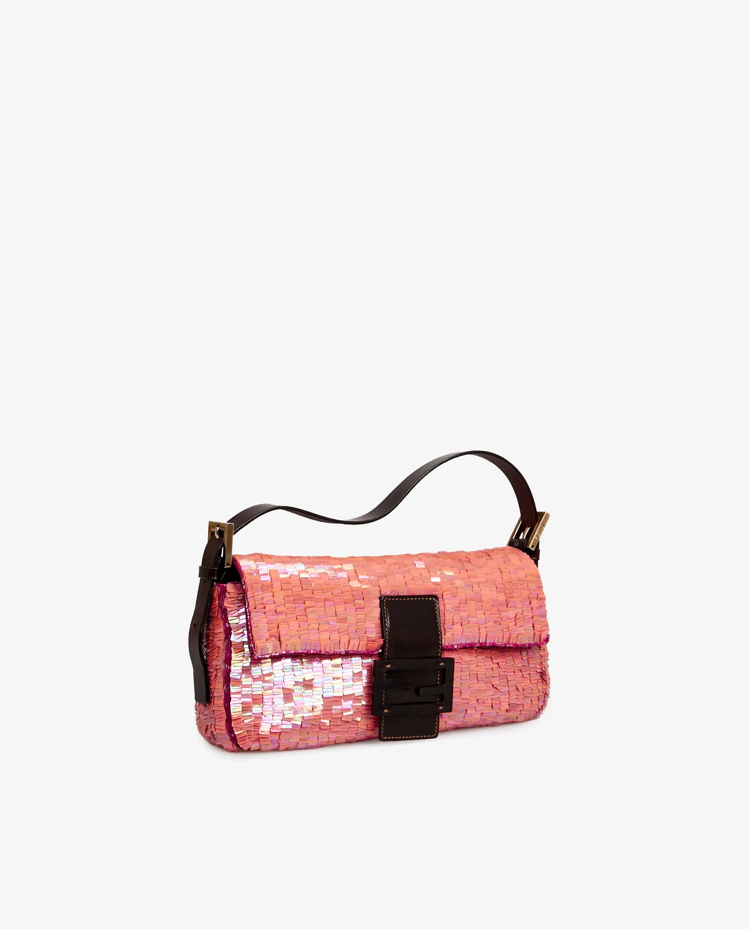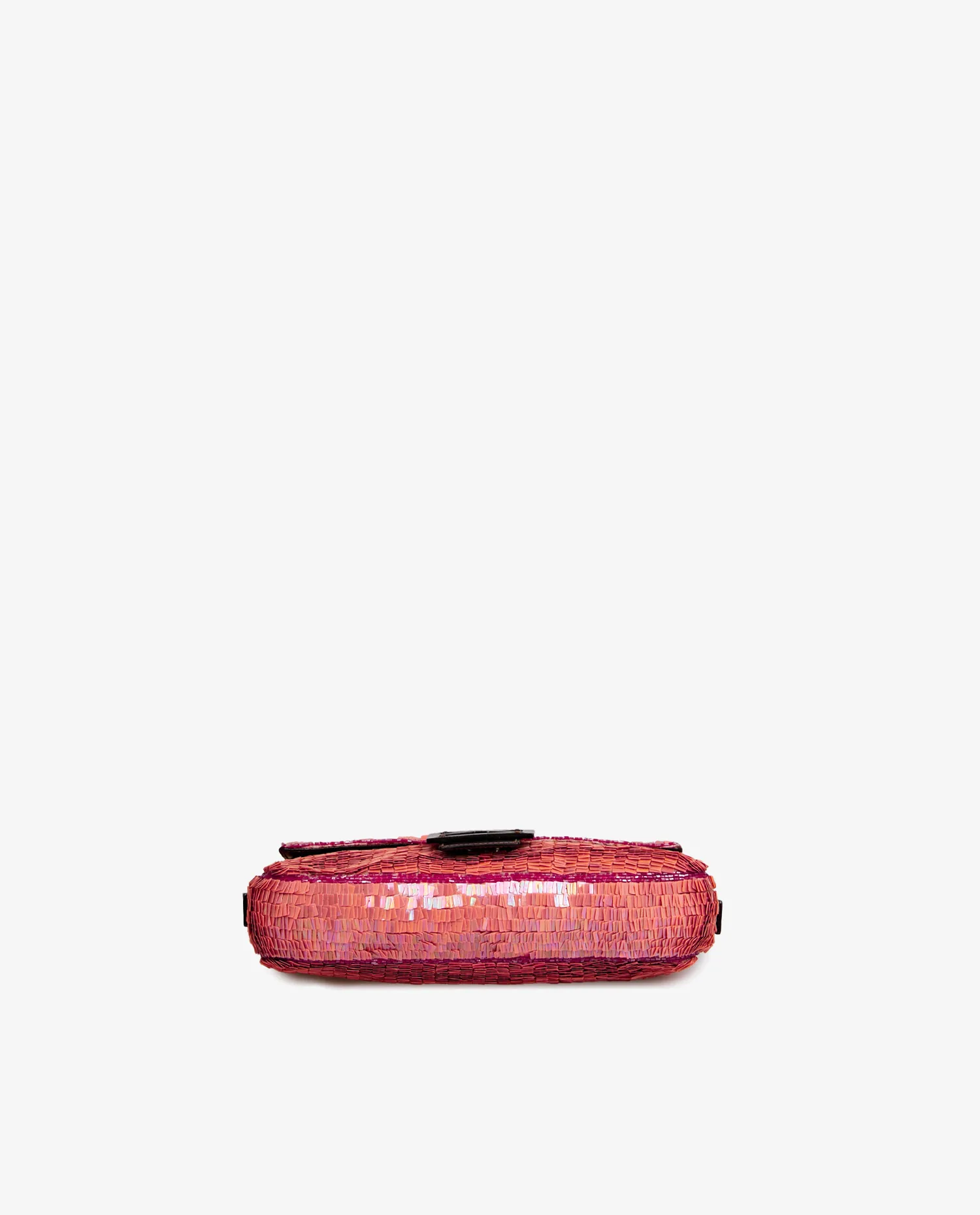 Sac Baguette Fendi en sequins couleur corail. Porté au bras ou à l’épaule à l’aide d’une anse en cuir marron. L’intérieur est en satin vert avec une petite poche zippée. En très bon état.