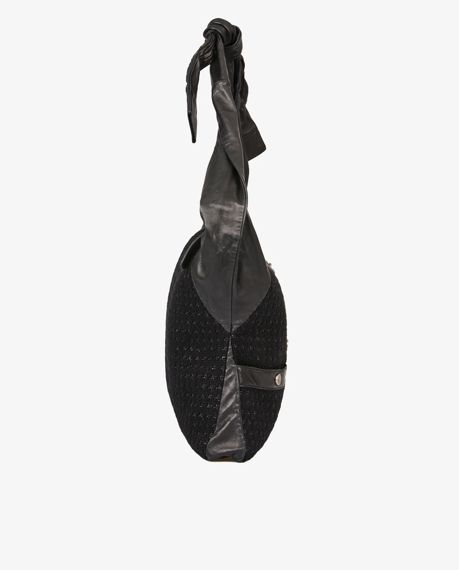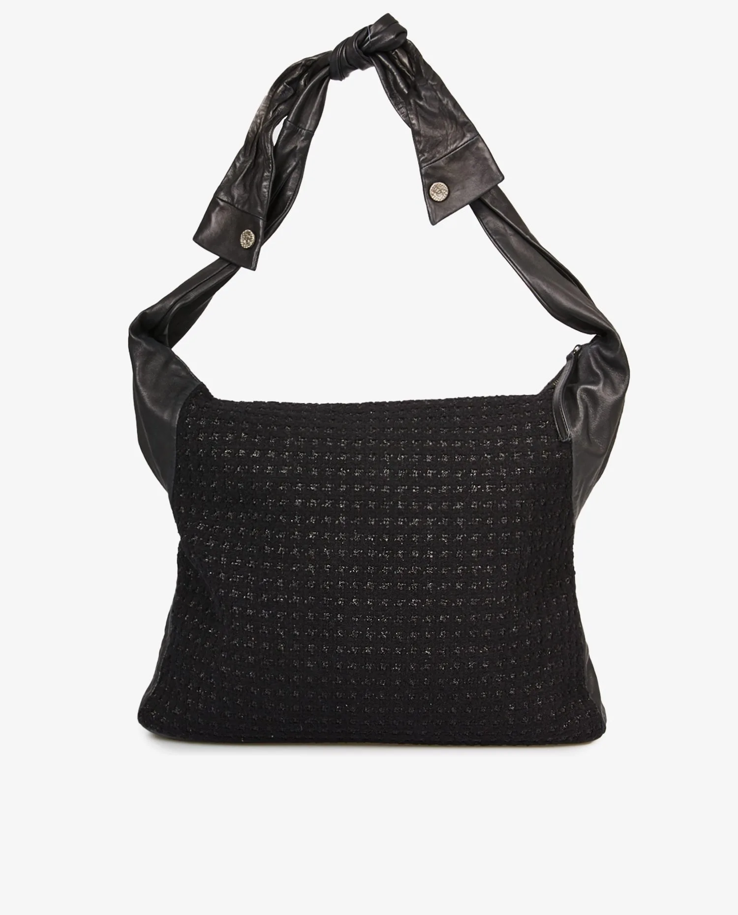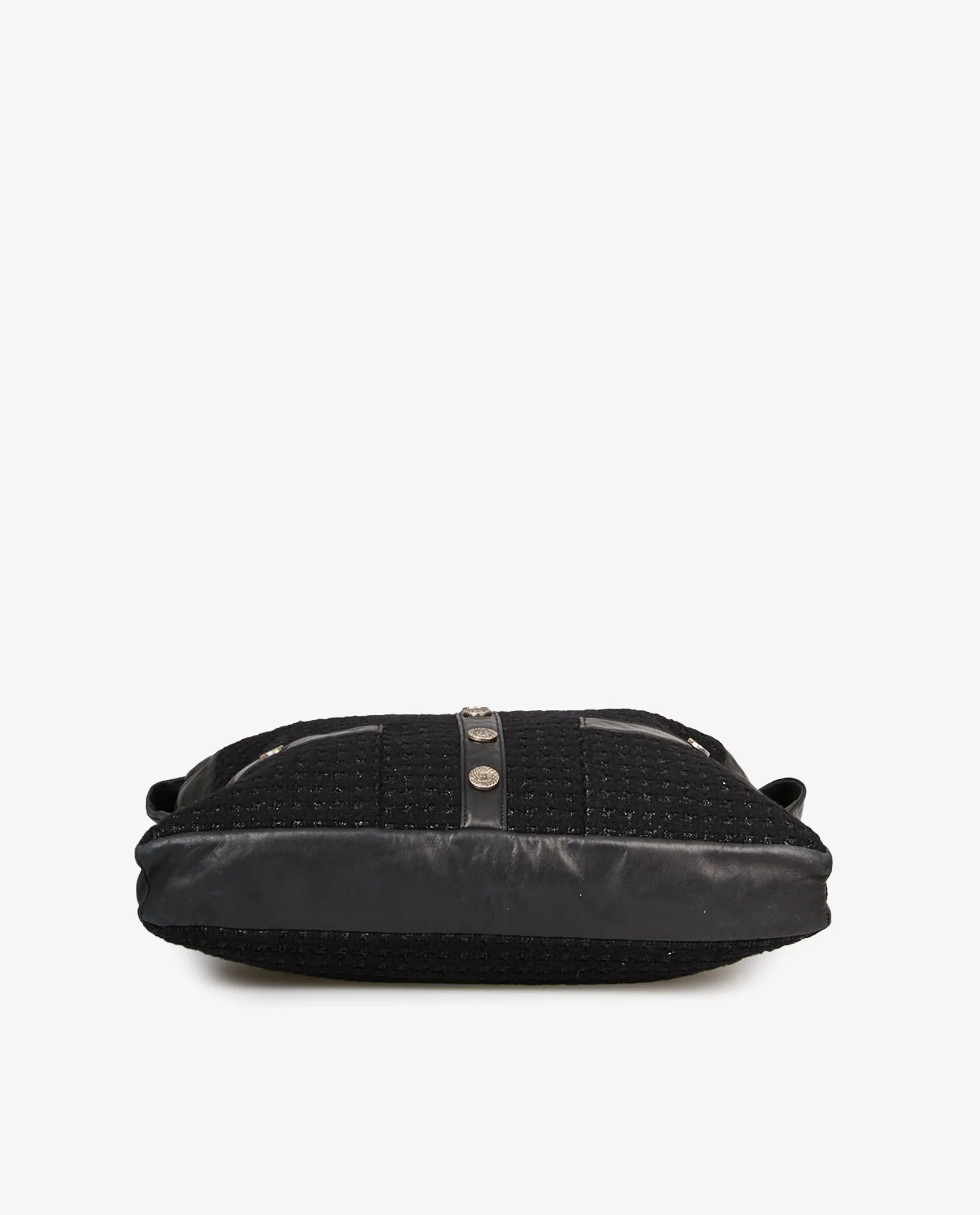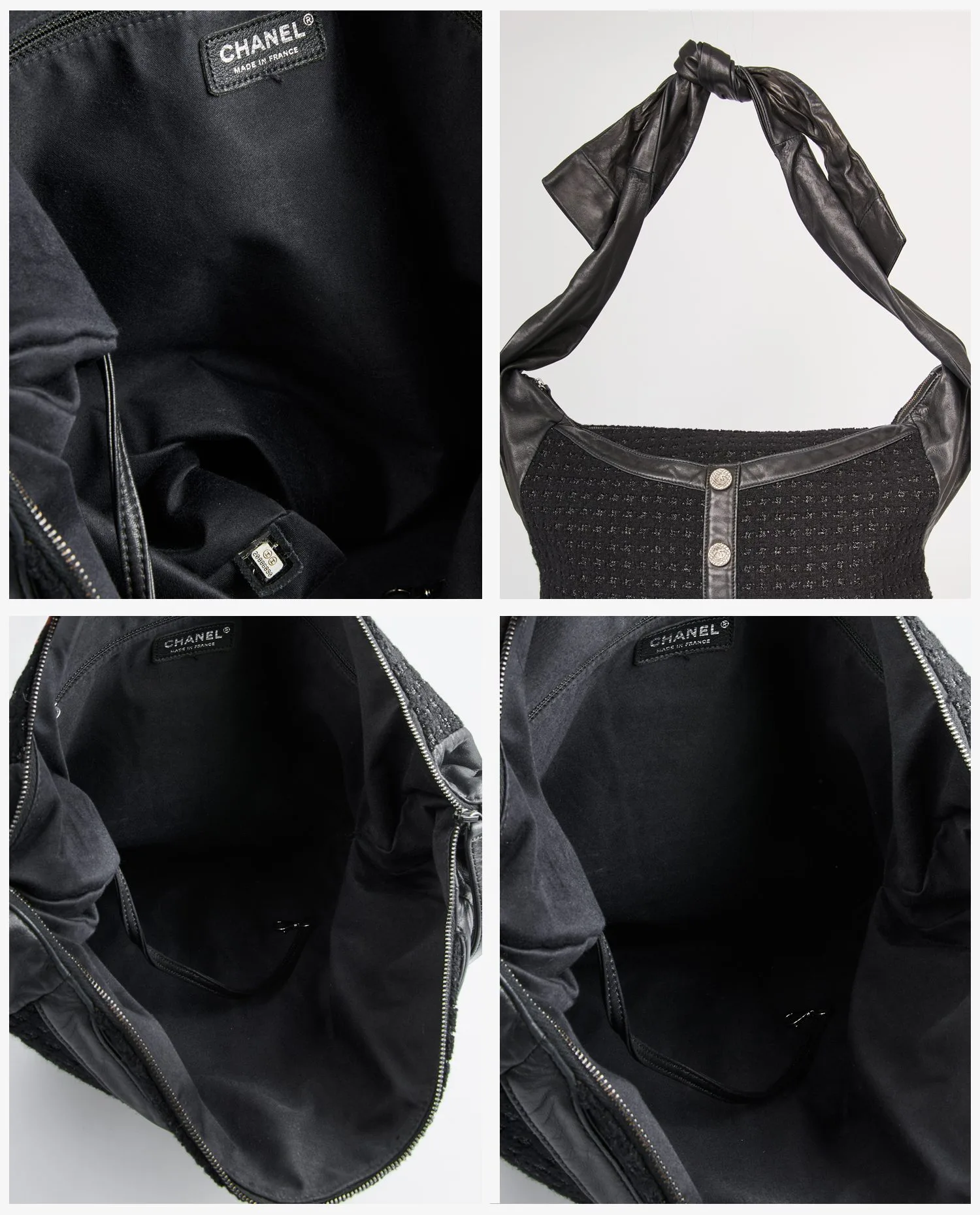 Le corps du sac est entièrement confectionné en tweed noir structuré, avec des reflets discrets de fil lurex argenté. Les bords et les coins sont renforcés par du cuir d’agneau noir lisse, apportant contraste et durabilité. La face avant reproduit fidèlement l’apparence d’une veste avec deux fausses poches à rabat, des bandes en cuir verticales et cinq boutons métalliques siglés « CC ». L’anse, nouée en cuir souple, peut être ajustée pour un porté épaule confortable. La fermeture principale est zippée, dissimulée sous le rabat supérieur en cuir.