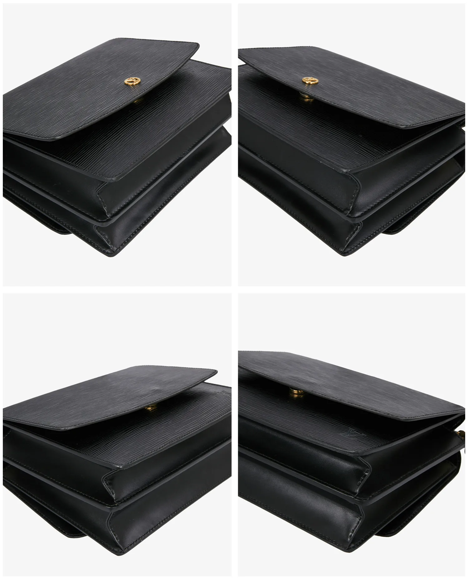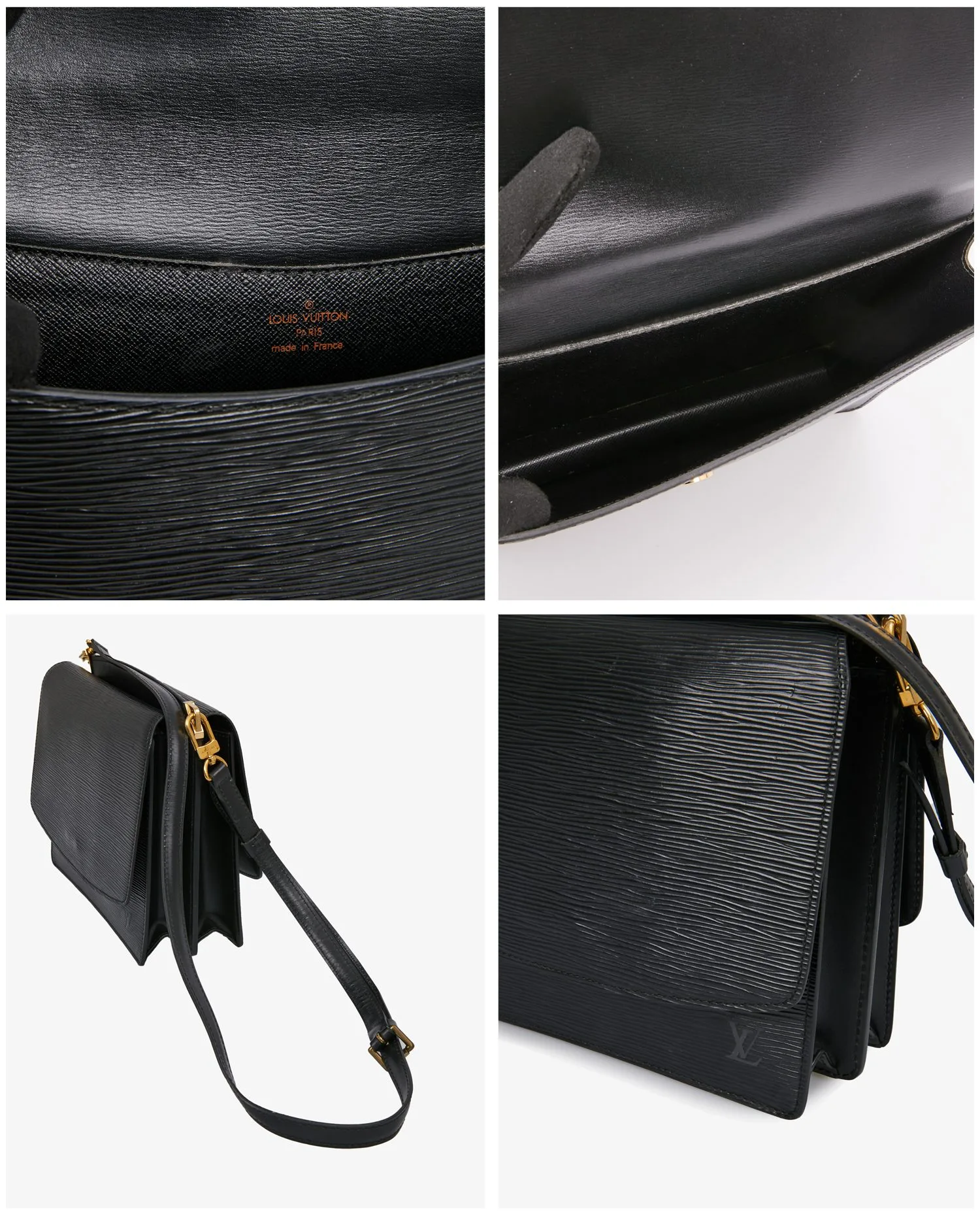 Sac Grenelle Louis Vuitton en cuir épi noir vintage. Porté à l’épaule ou en bandoulière réglable. Il dispose d’espace de rangement de chaque côté. L’intérieur est en cuir noir. En très bon état.