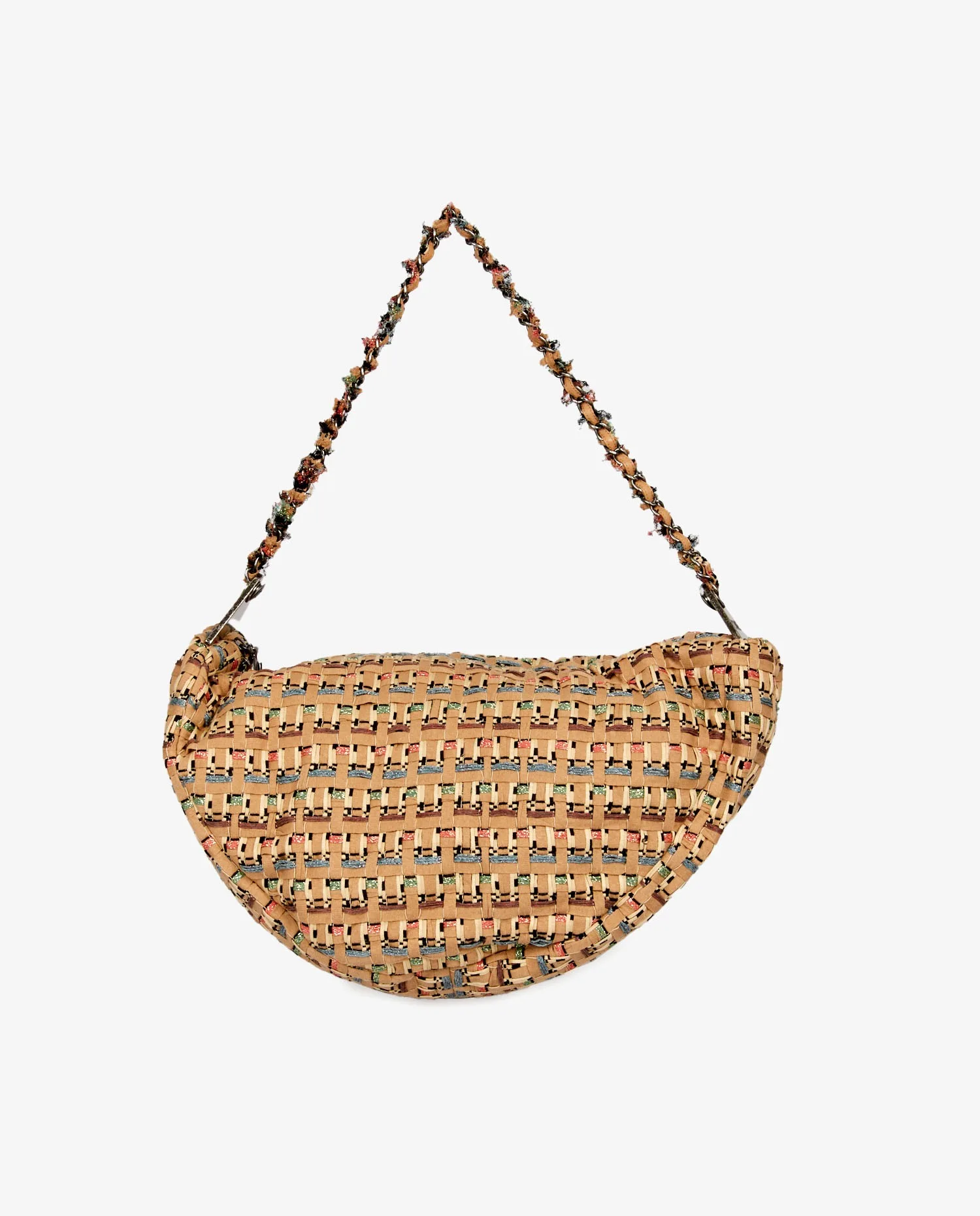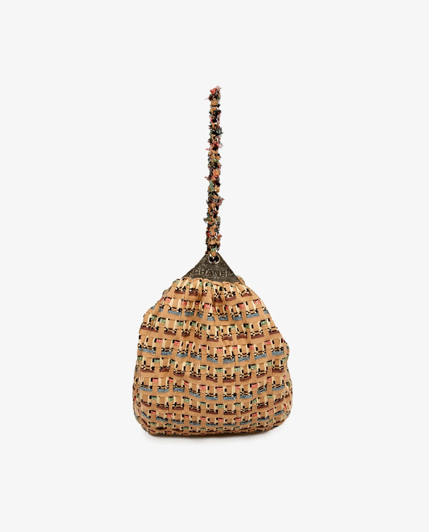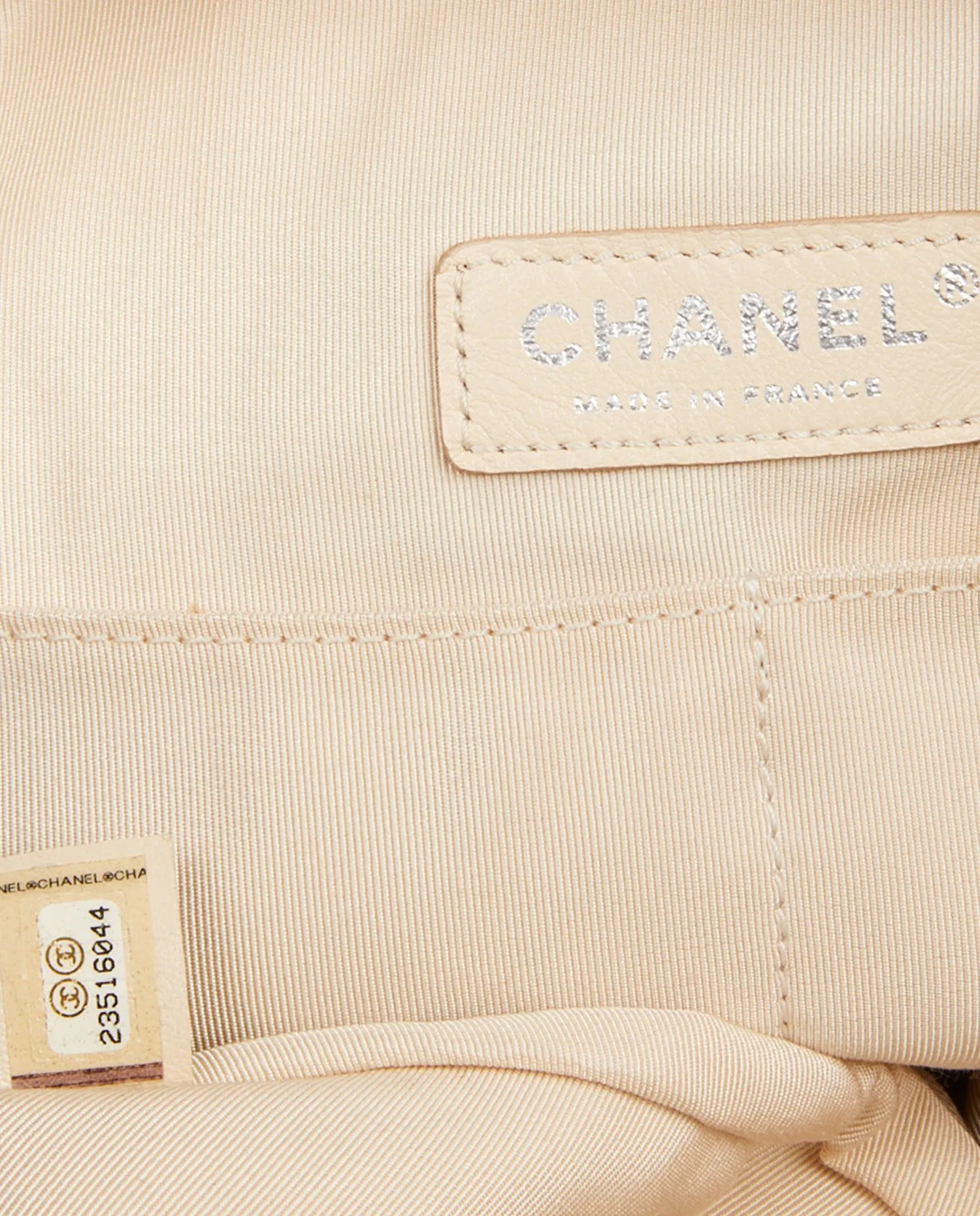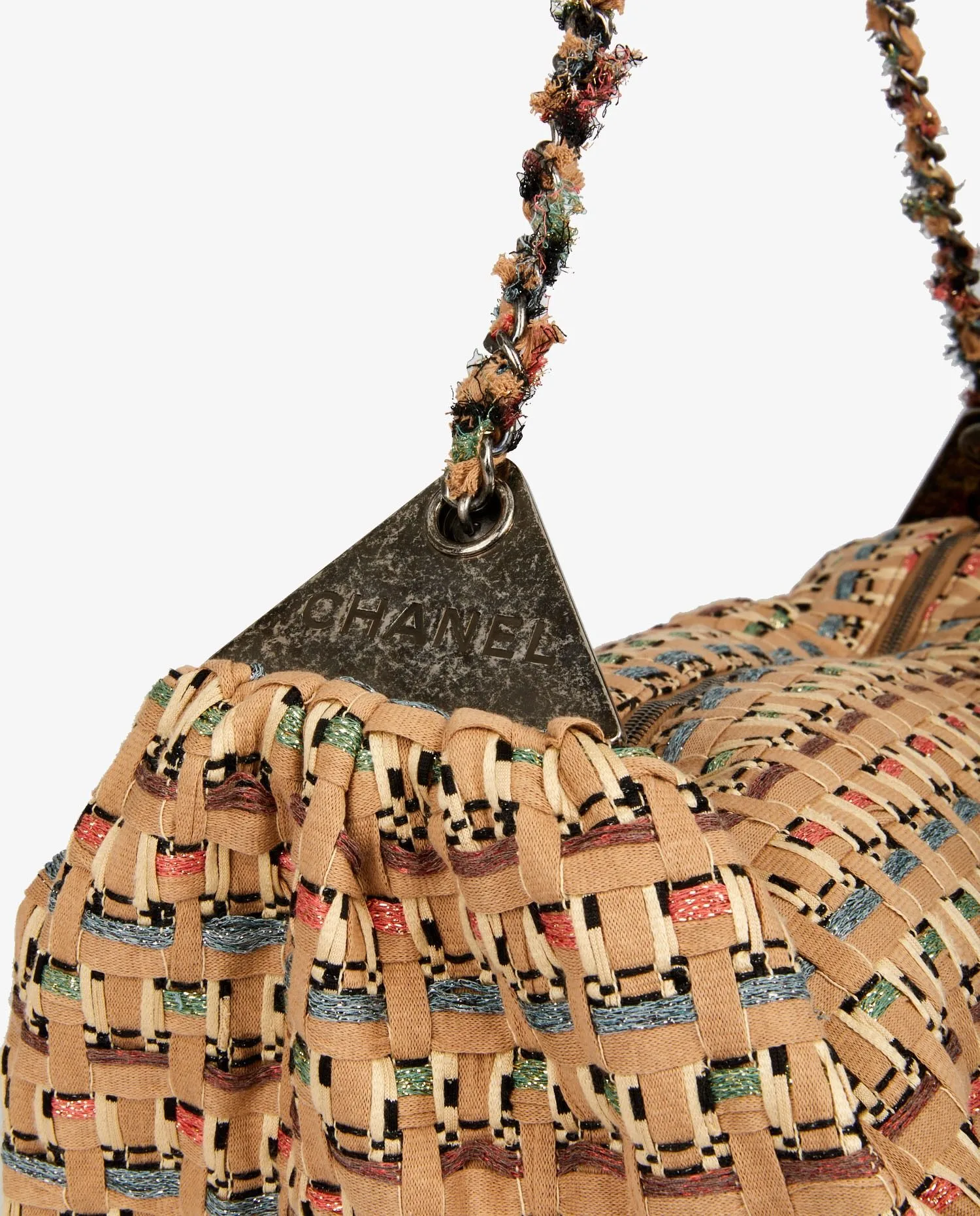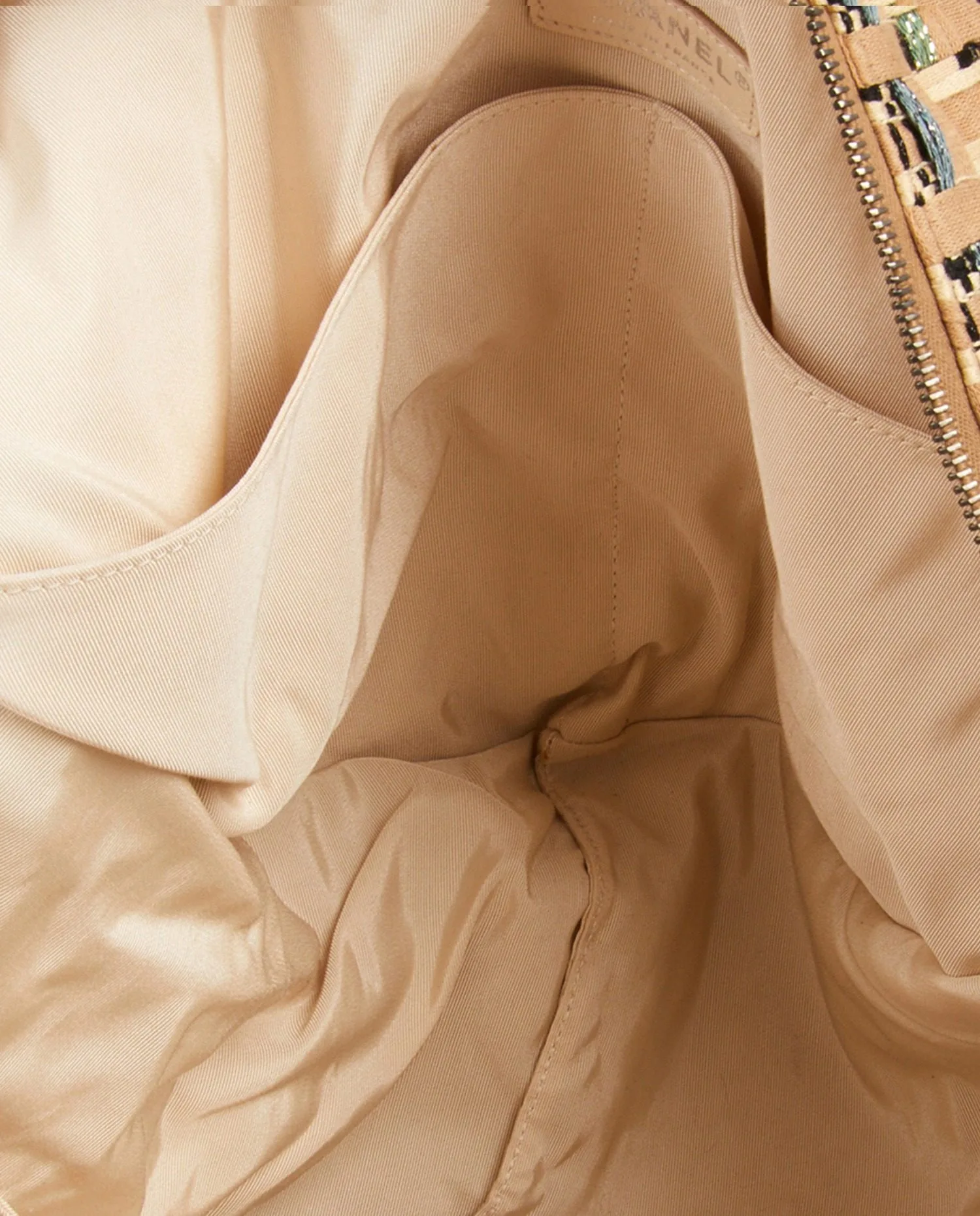 Sac besace Chanel en tweed beige. Fermeture zippée. L’intérieur est en tissu beige. Porté épaule (71cm). En très bon état.