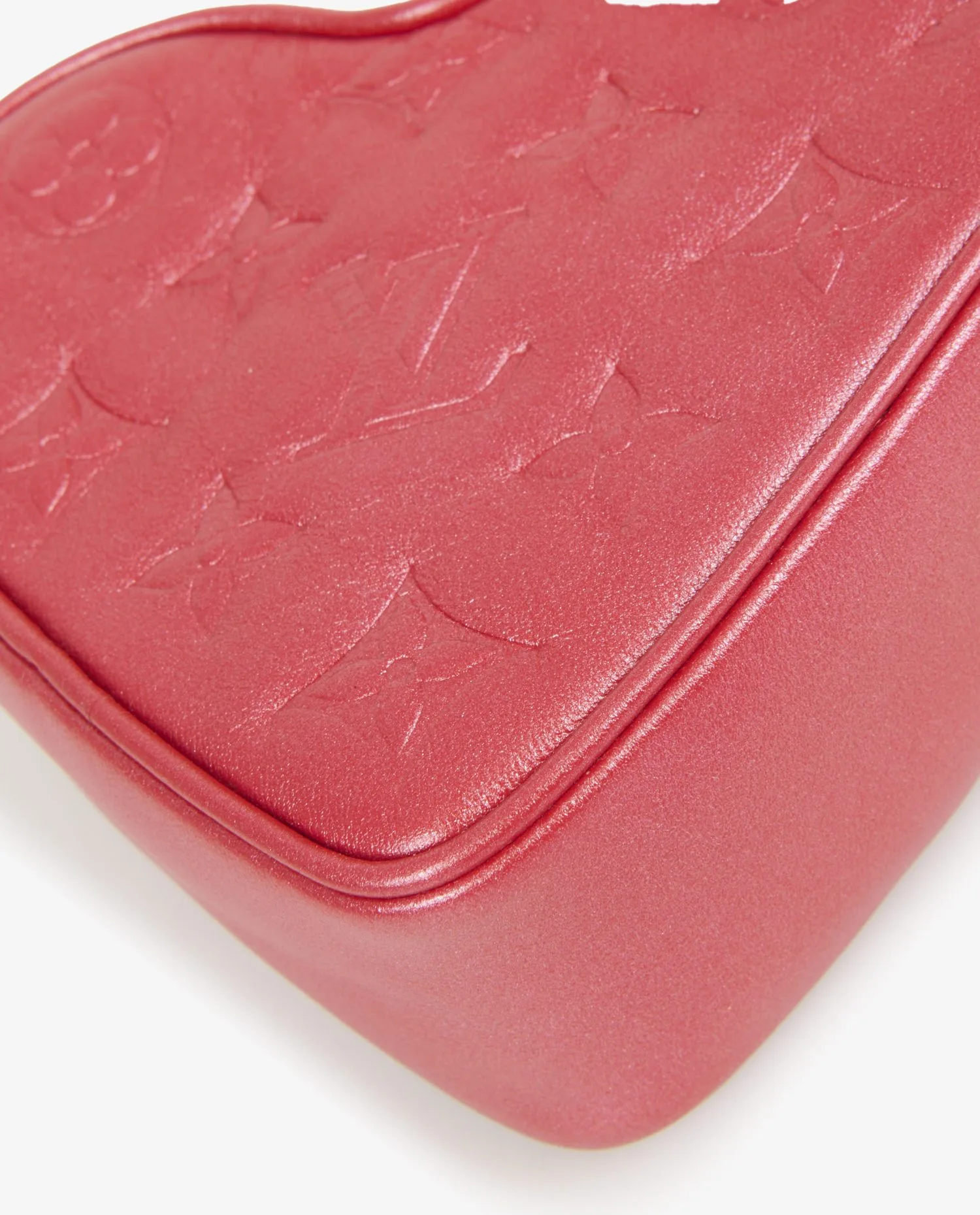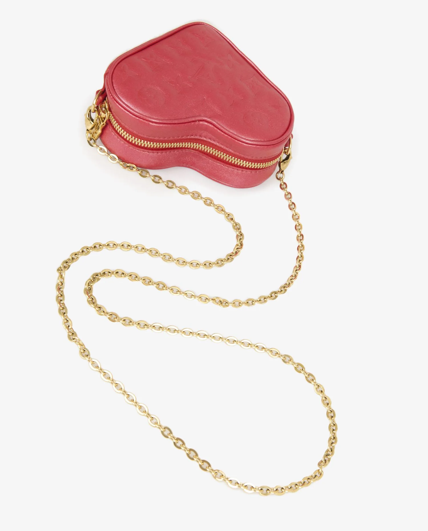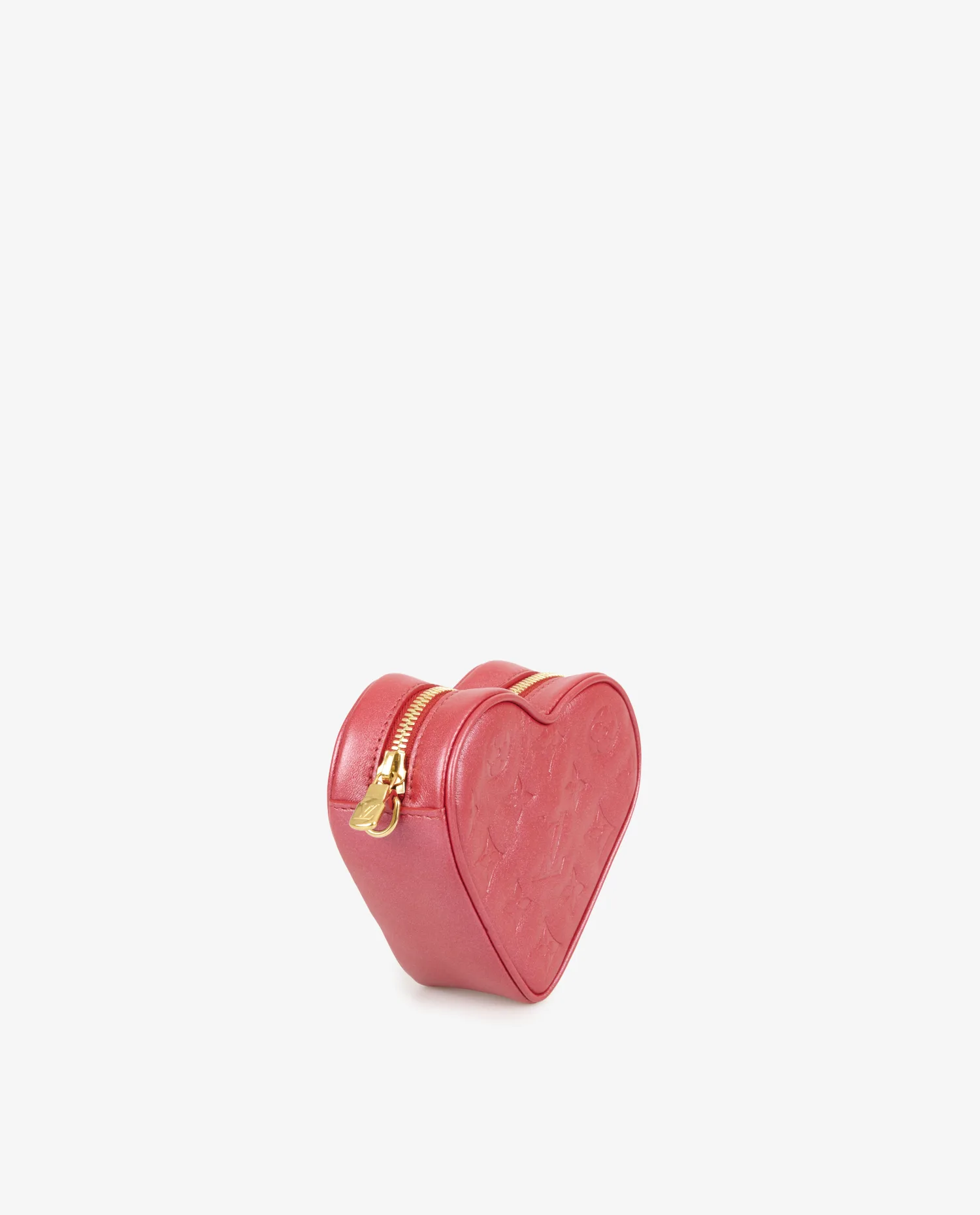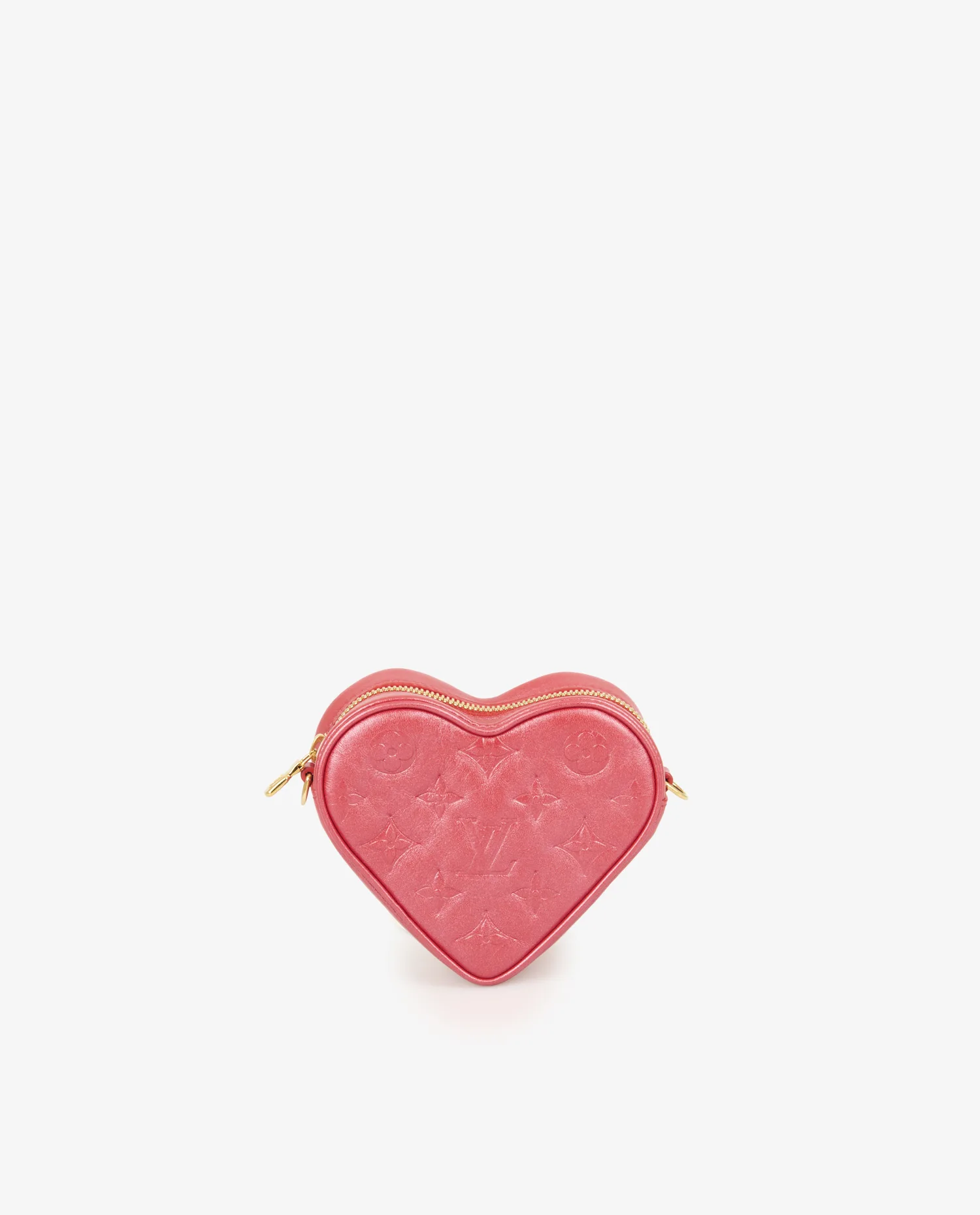 L’extérieur est réalisé en cuir rouge lisse, embossé du monogramme LV et des fleurs iconiques, conférant texture et relief à la surface. La silhouette en forme de cœur est bordée de coutures ton sur ton, renforçant les lignes du modèle. La fermeture éclair dorée à double tirette garantit sécurité et fluidité à l’ouverture. La chaîne en métal doré brillant, fine mais robuste, ajoute une touche précieuse et permet un porté polyvalent. Compact et distinctif, ce modèle mesure environ 13 x 11 x 5 cm.