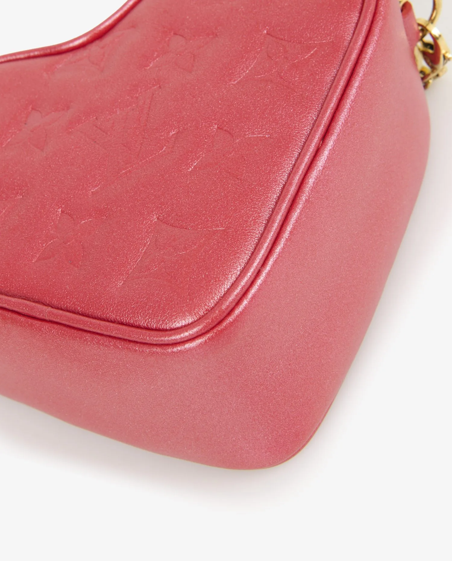 L’intérieur est doublé en microfibre douce de couleur beige rosé, qui contraste avec l’extérieur rouge. Sobre et fonctionnel, il propose un compartiment unique adapté pour contenir de petits essentiels comme cartes, rouge à lèvres ou écouteurs. L’étiquette en cuir estampillée « Louis Vuitton Paris – Made in Italy » confirme l’authenticité et la provenance du sac.
