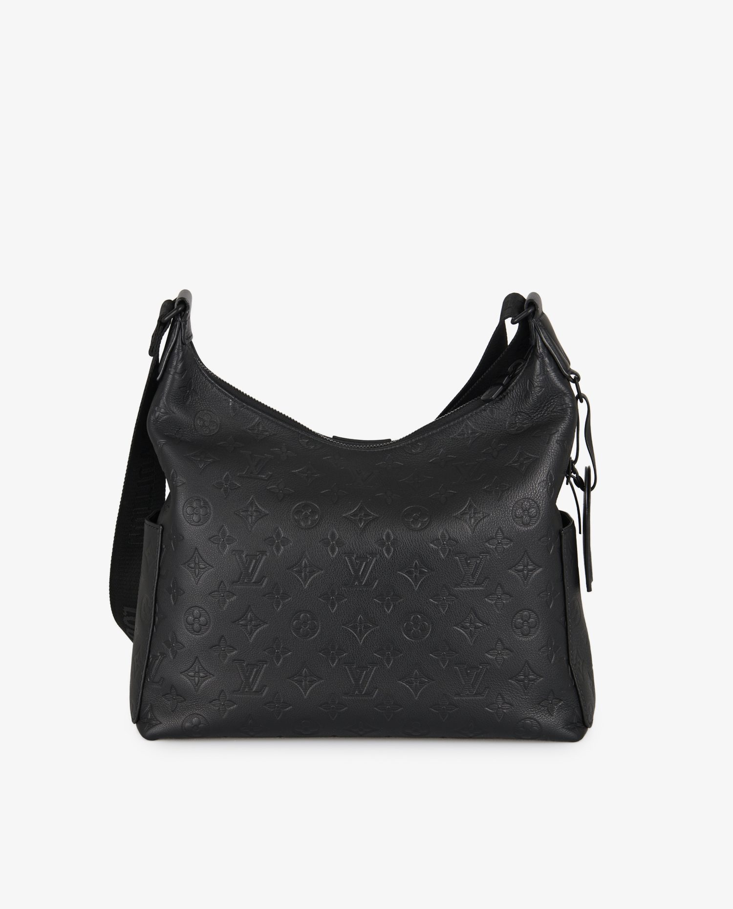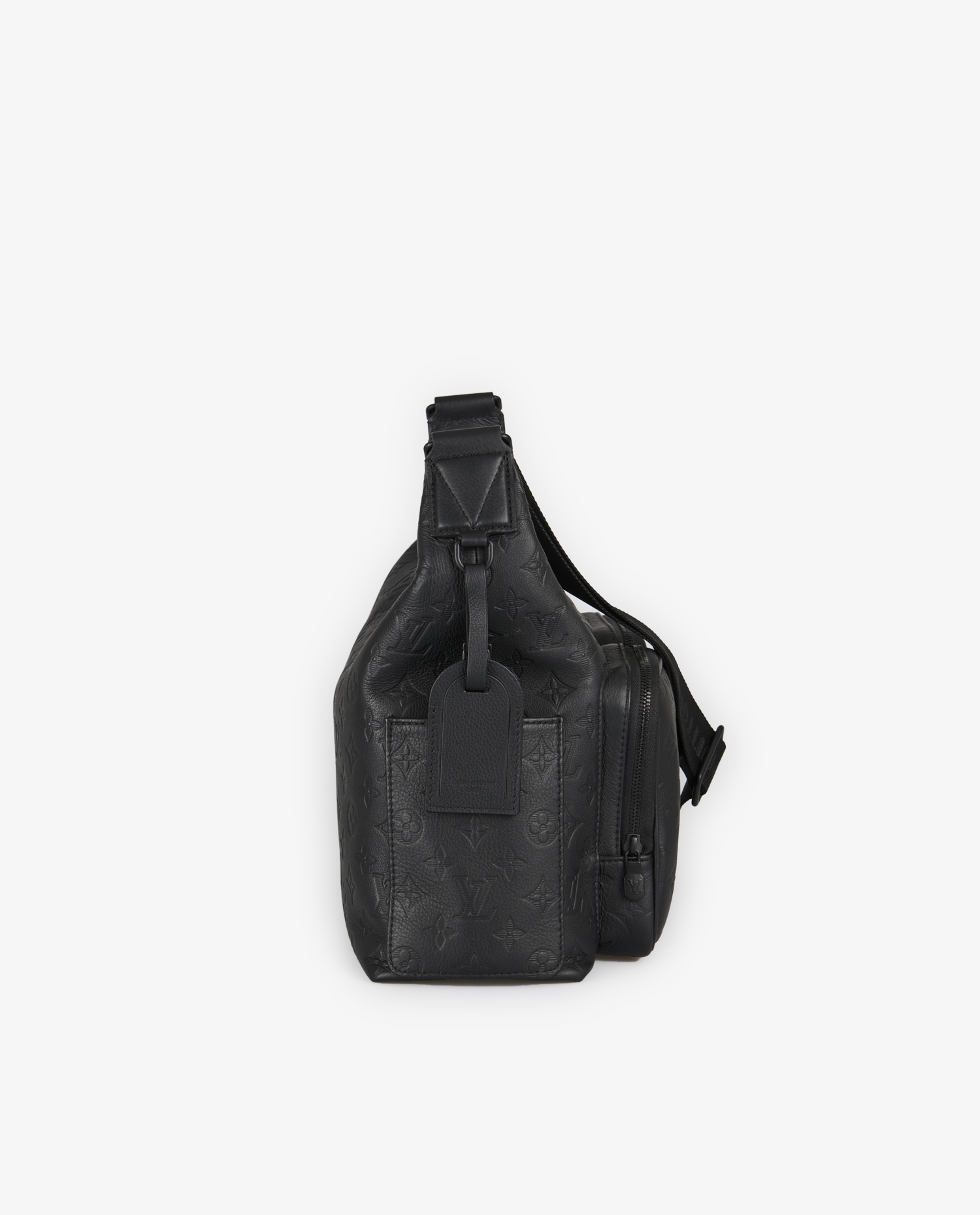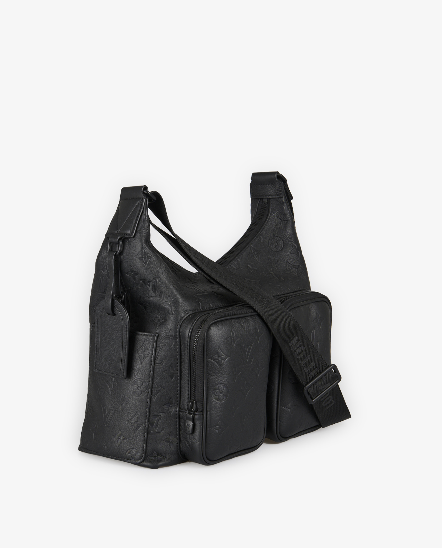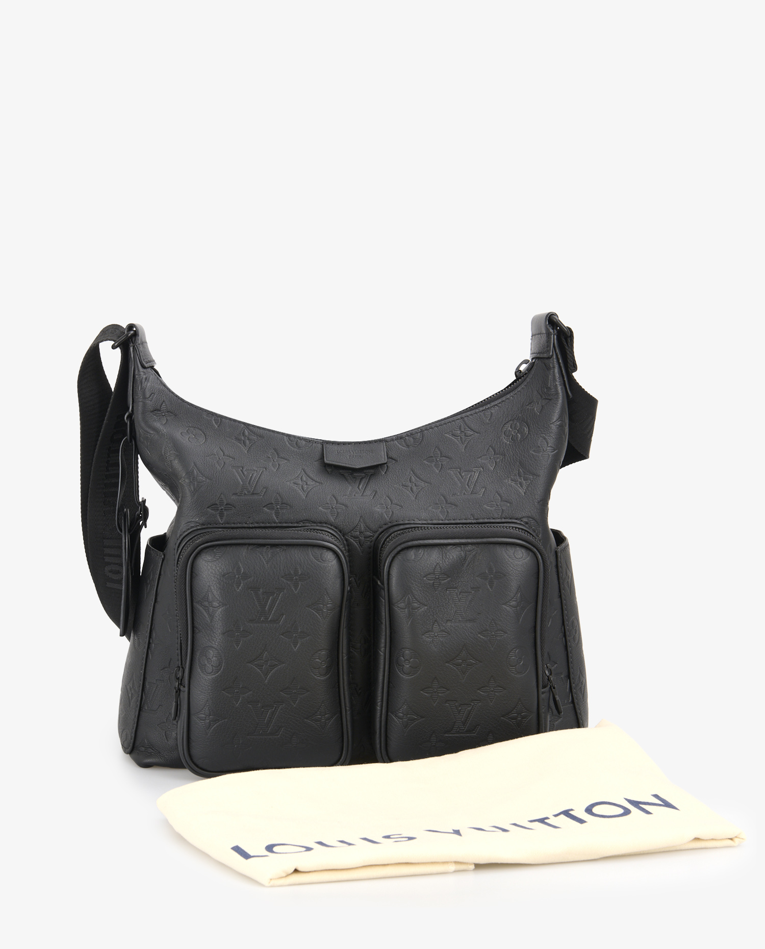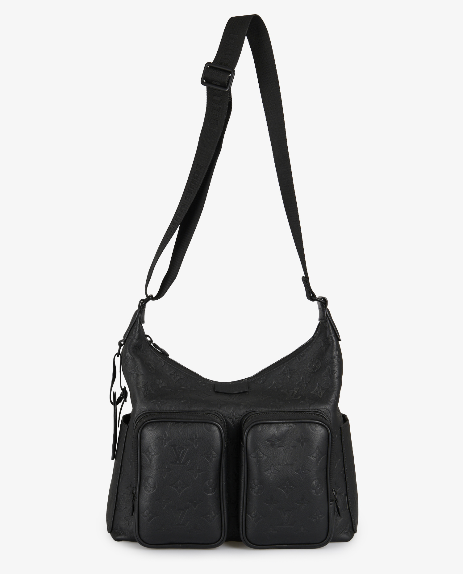 Le cuir de vache pleine fleur est embossé du motif Monogram dans une teinte noire profonde, créant un jeu de texture subtil. La face avant est dotée de deux poches zippées en relief, parfaites pour garder les petits effets personnels à portée de main. Des poches latérales supplémentaires renforcent l’aspect utilitaire du modèle. La fermeture principale zippée sécurise l’ensemble du contenu. La bandoulière réglable en toile noire est discrètement marquée “Louis Vuitton”, ajoutant une touche de branding minimaliste. L’arrière du sac est volontairement épuré pour équilibrer la silhouette.