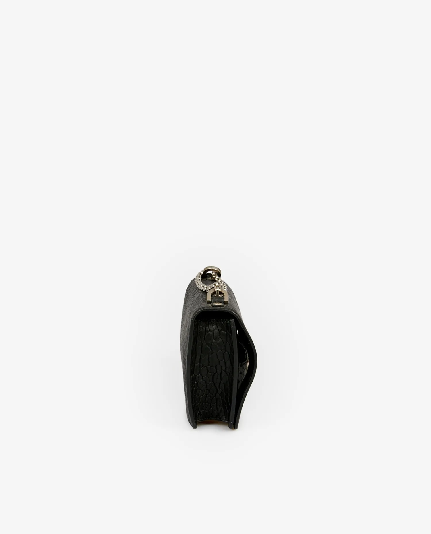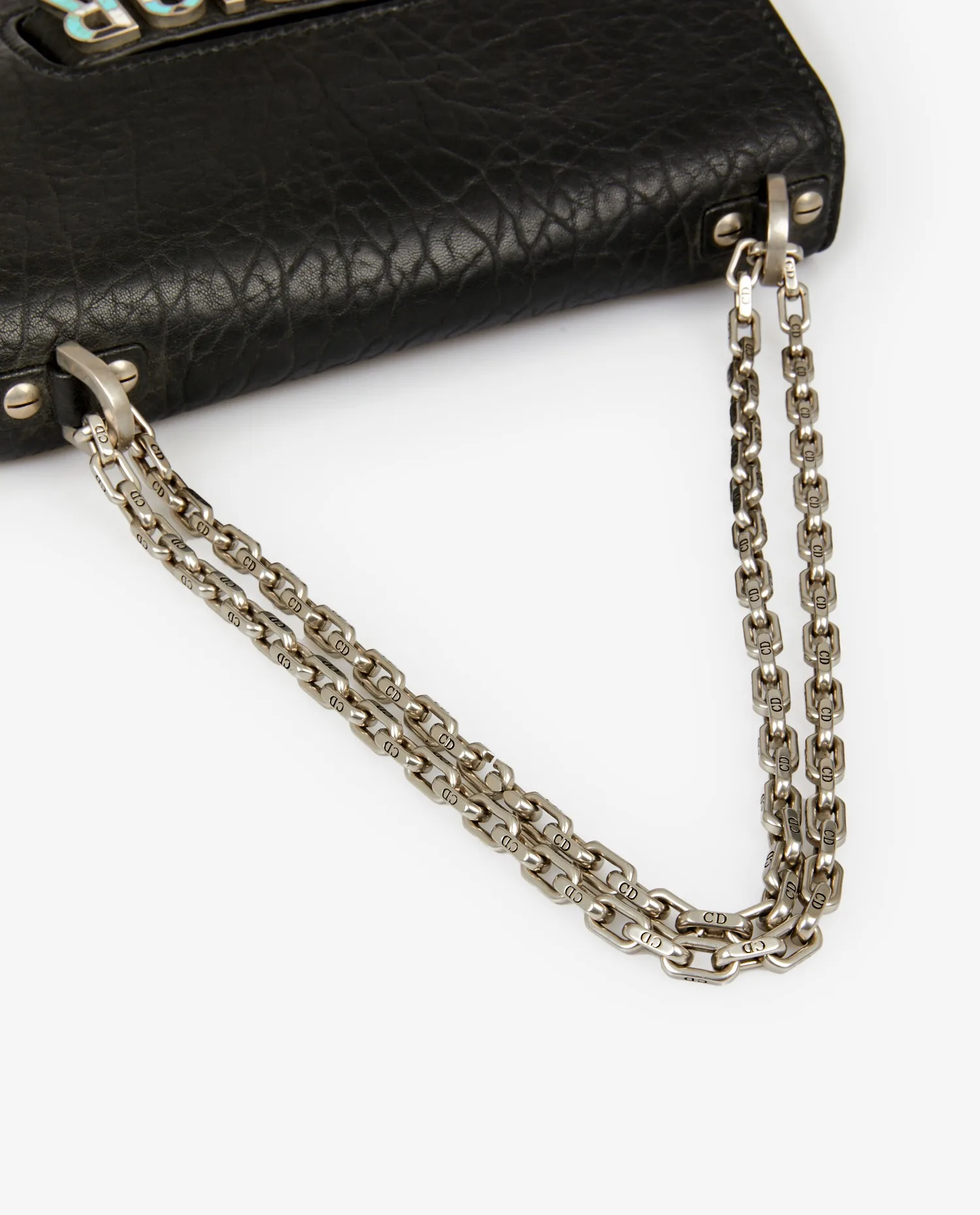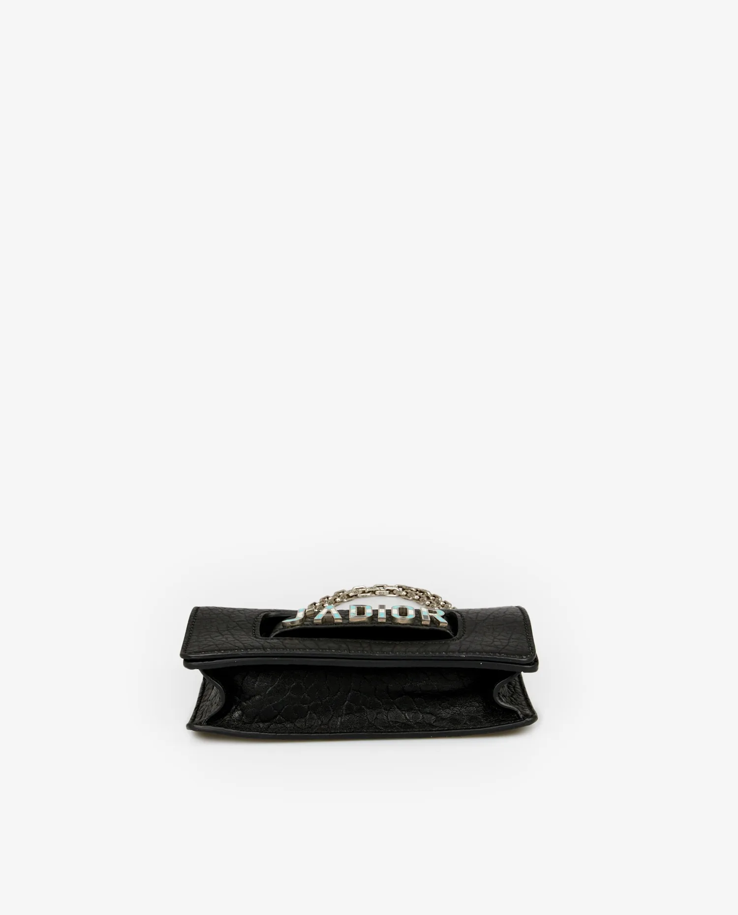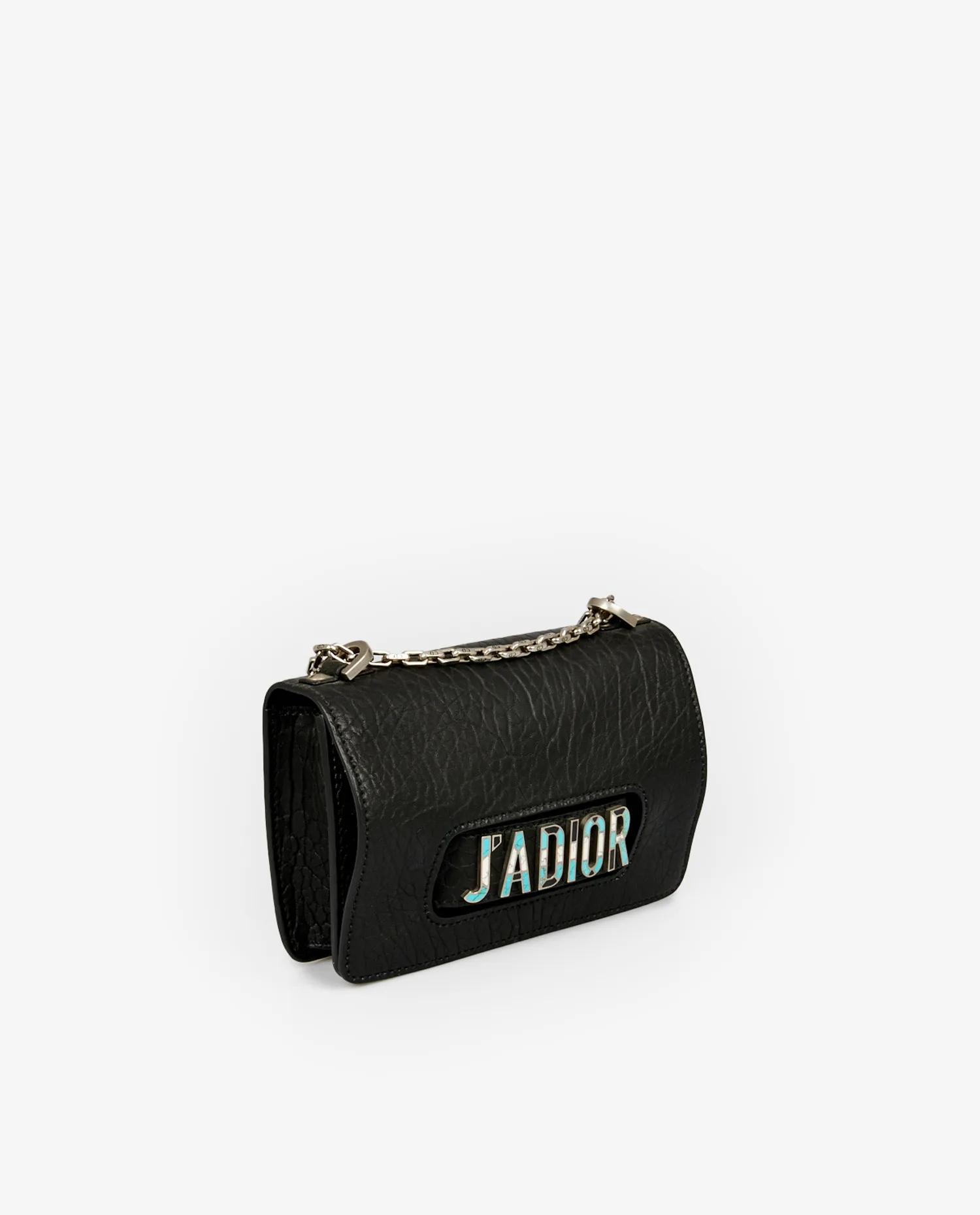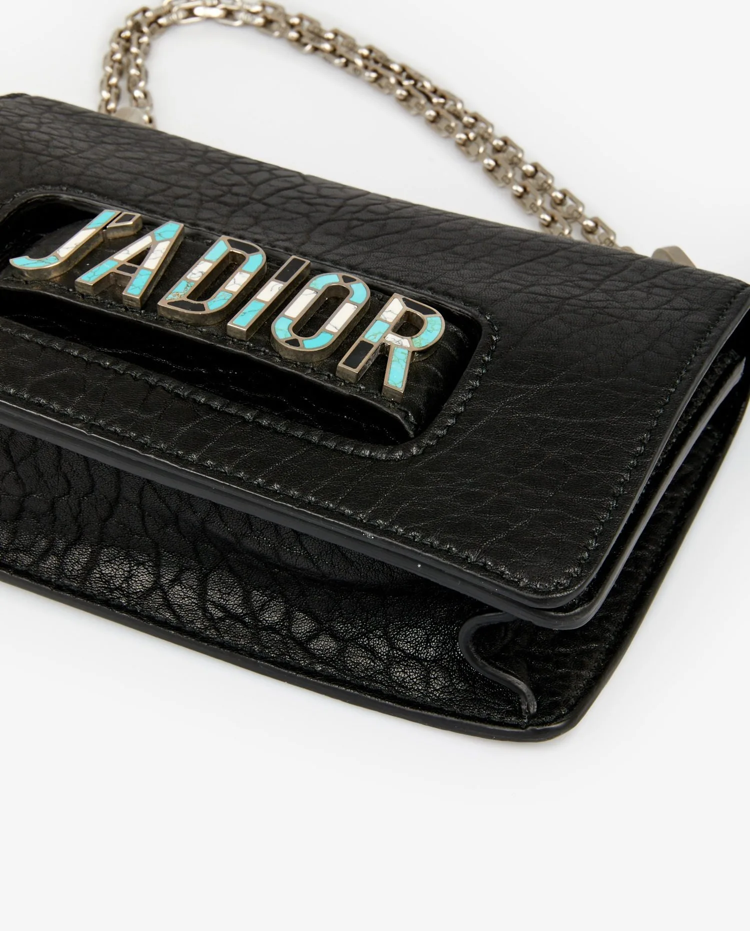 Le cuir grainé noir, à la texture marquée, confère au sac un aspect structuré et une excellente tenue. L’inscription “J’ADIOR”, encastrée dans une découpe frontale, est ornée de détails en turquoise et nacre, ajoutant une touche décorative précieuse. La chaîne métallique argentée, épaisse et polie, est attachée à deux œillets latéraux et peut se doubler pour un porté main. Le format rigide et la finition mate du cuir accentuent l’allure contemporaine de ce modèle.