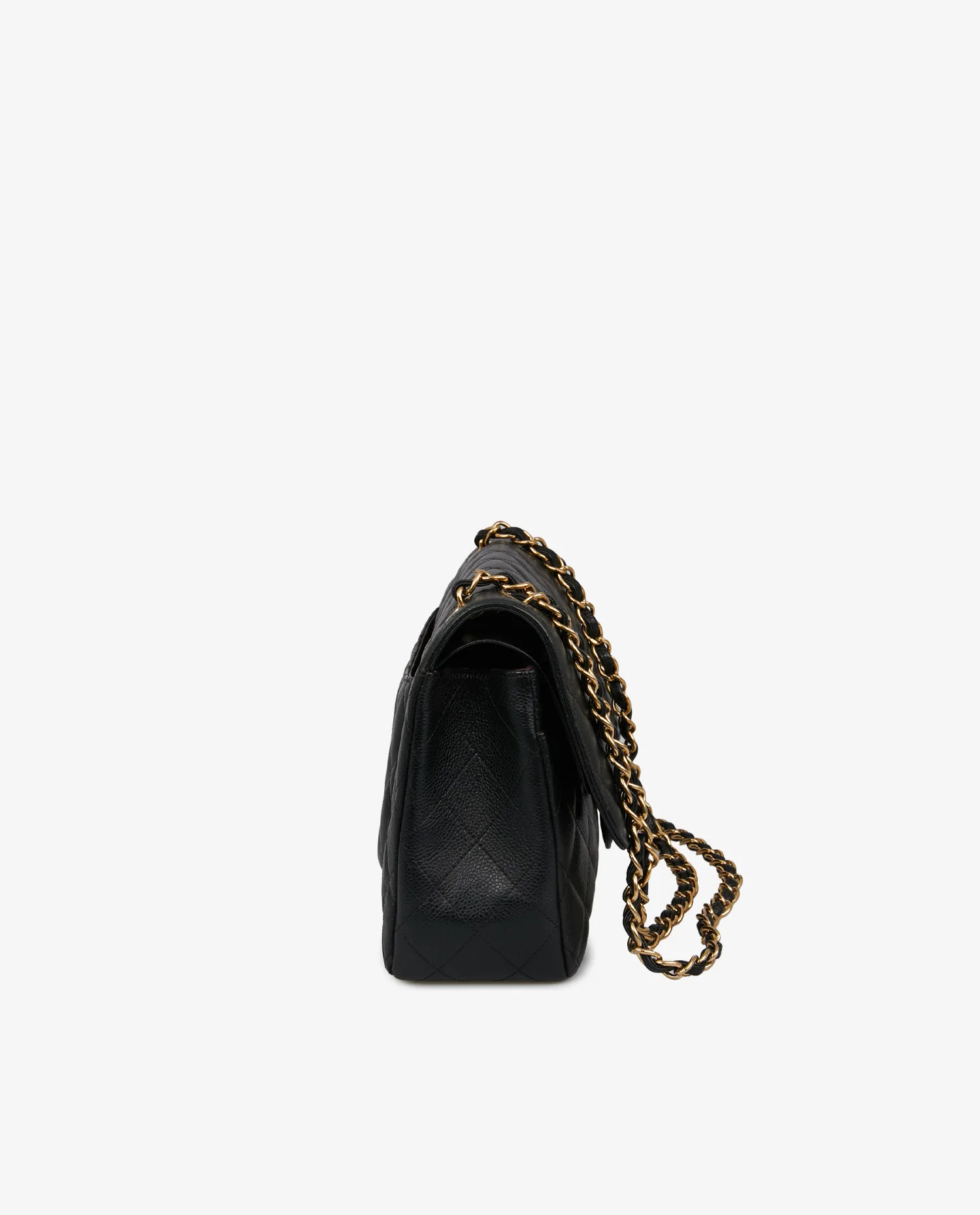 Le cuir caviar noir présente un grain profond et régulier, réputé pour sa robustesse et sa tenue dans le temps. Le rabat matelassé, la poche arrière plaquée et la chaîne entrelacée rappellent les codes forts de la maison Chanel. Le format Jumbo offre un gabarit généreux tout en conservant une silhouette élégante et équilibrée.