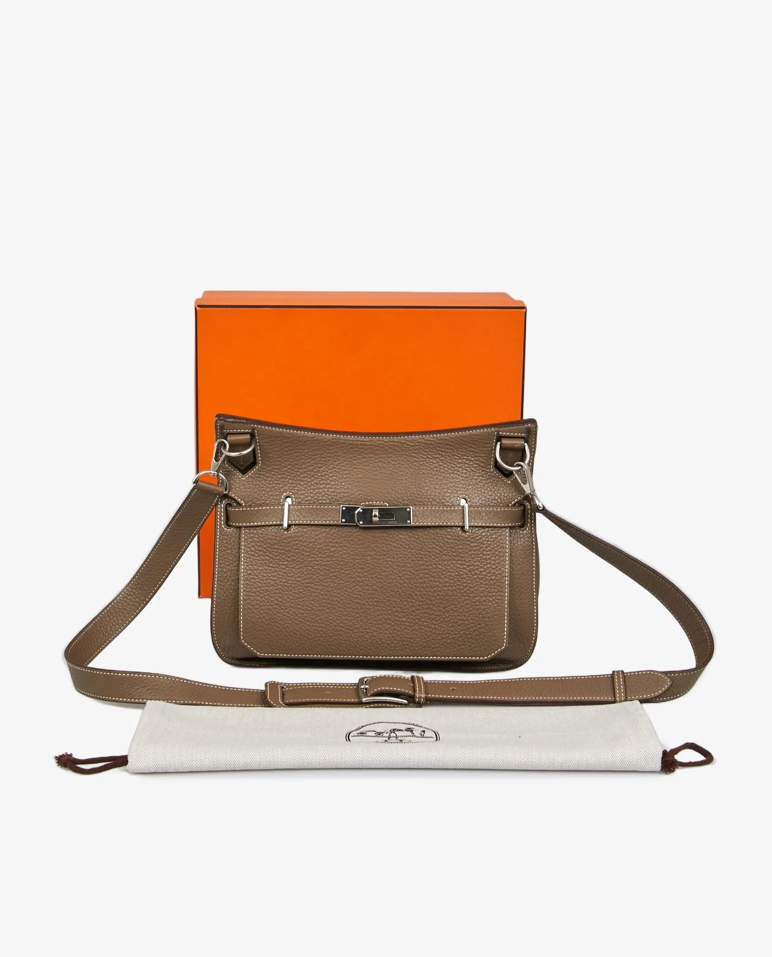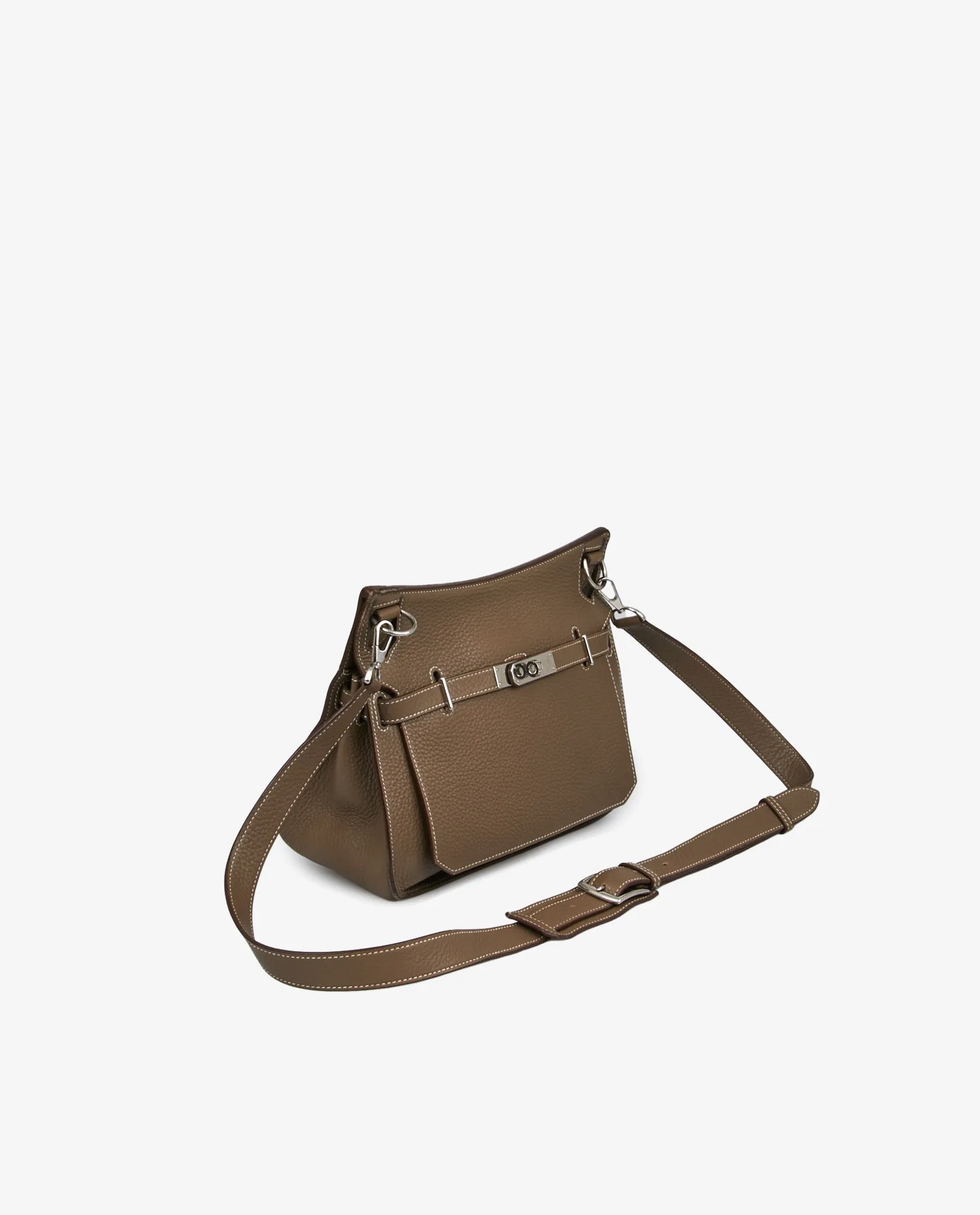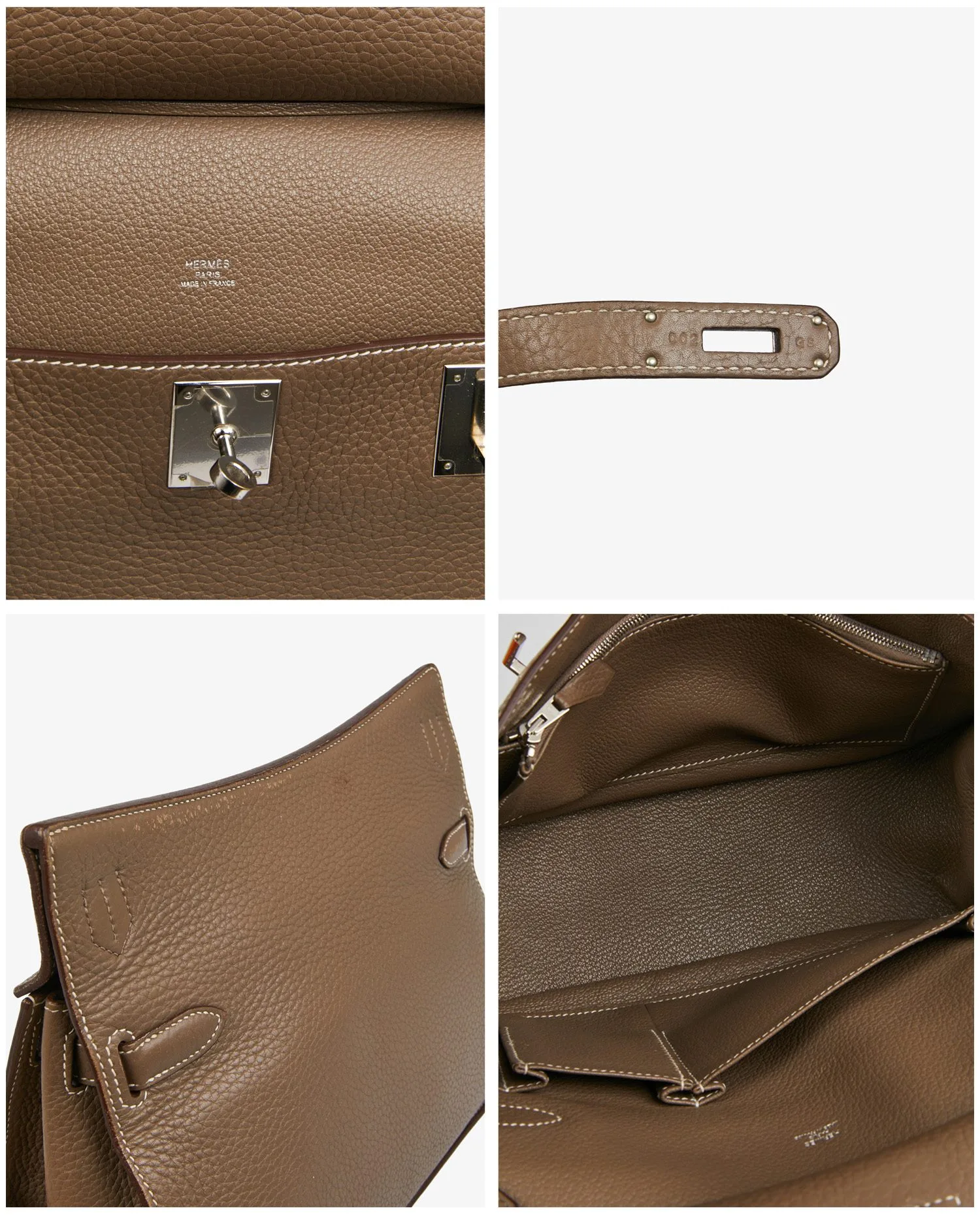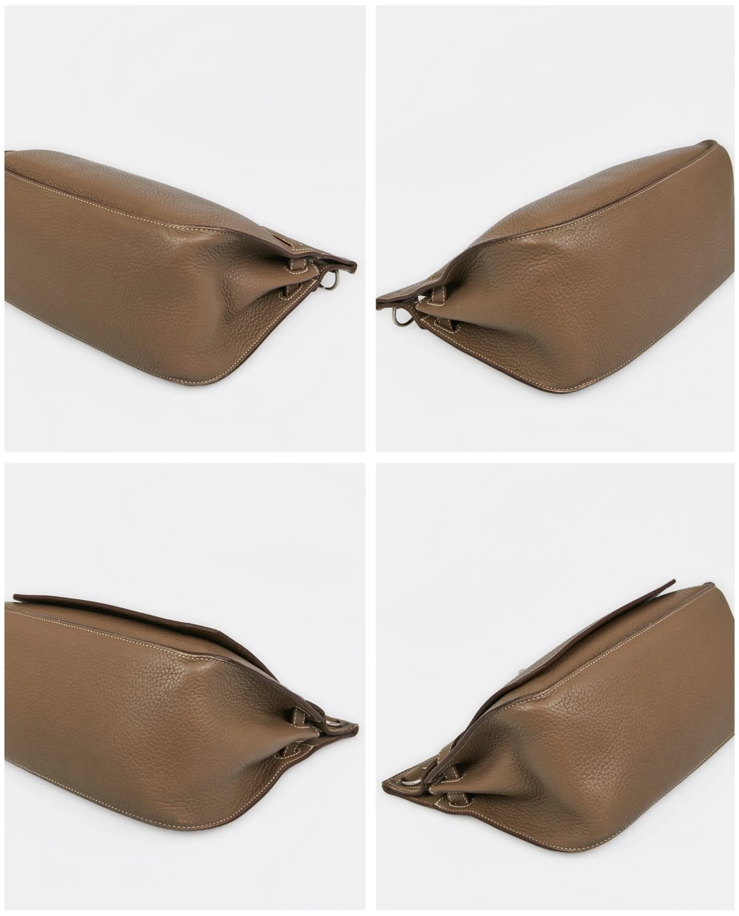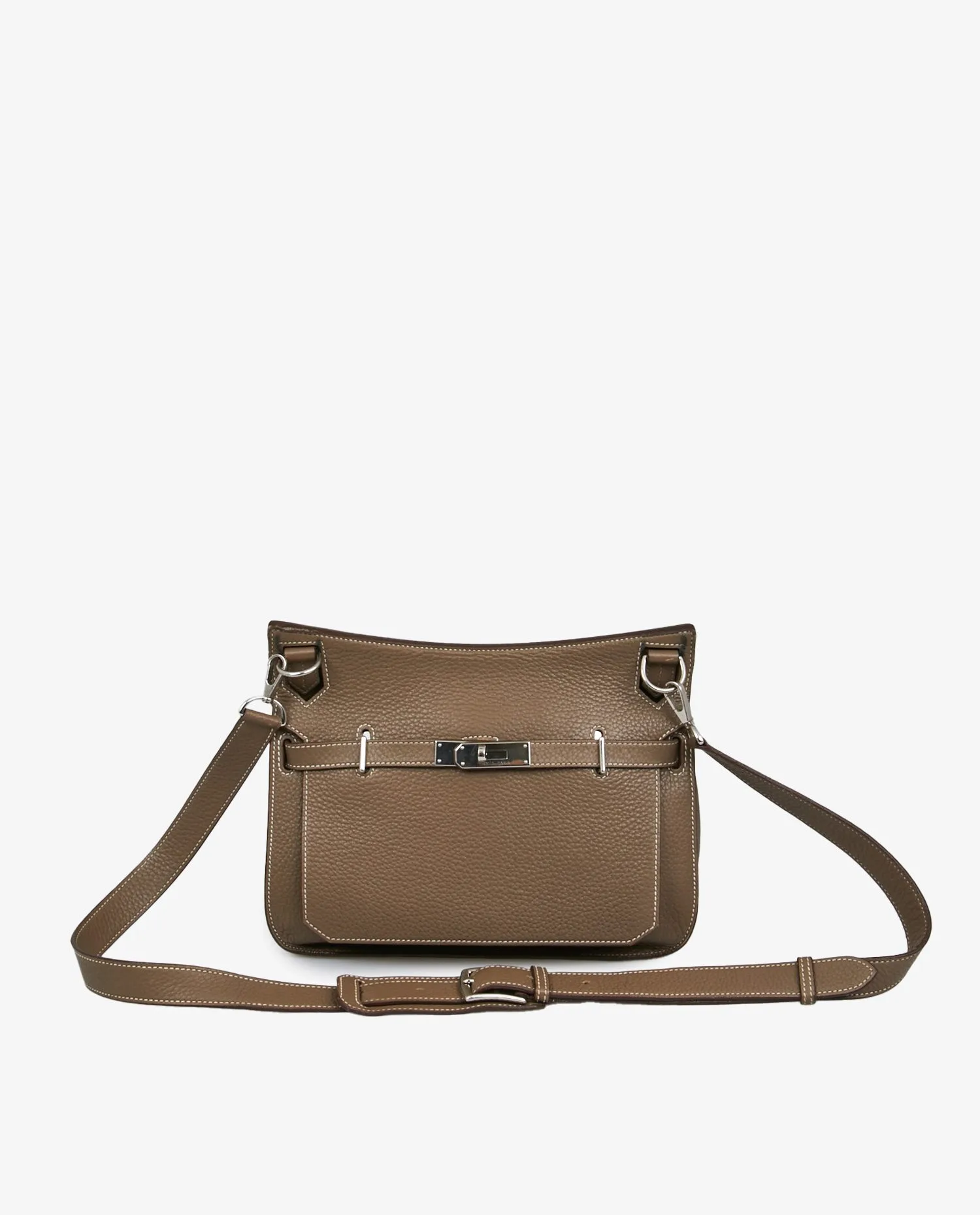Le cuir Togo se distingue par sa souplesse et son toucher doux, tout en offrant une bonne résistance à l’usage. La teinte étampe apporte une neutralité élégante, facile à associer. Le sac est agrémenté de boucles métalliques et du célèbre fermoir tourniquet inspiré du Birkin et du Kelly. La bandoulière large est ajustable grâce à des boucles argentées et permet un ajustement précis. Les bordures et angles sont légèrement arrondis.