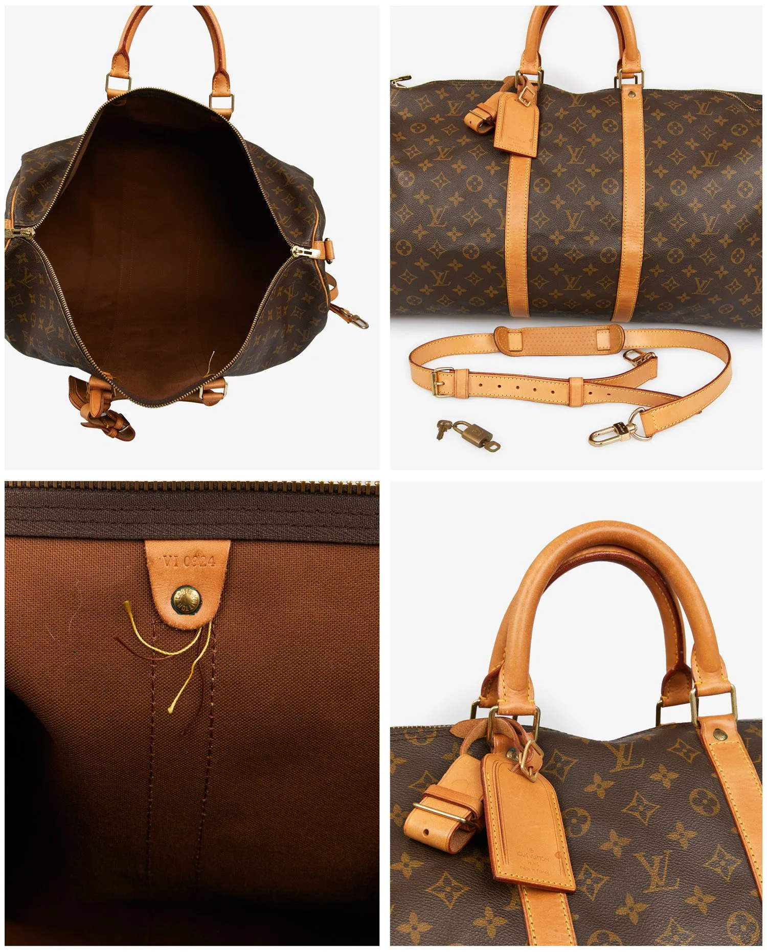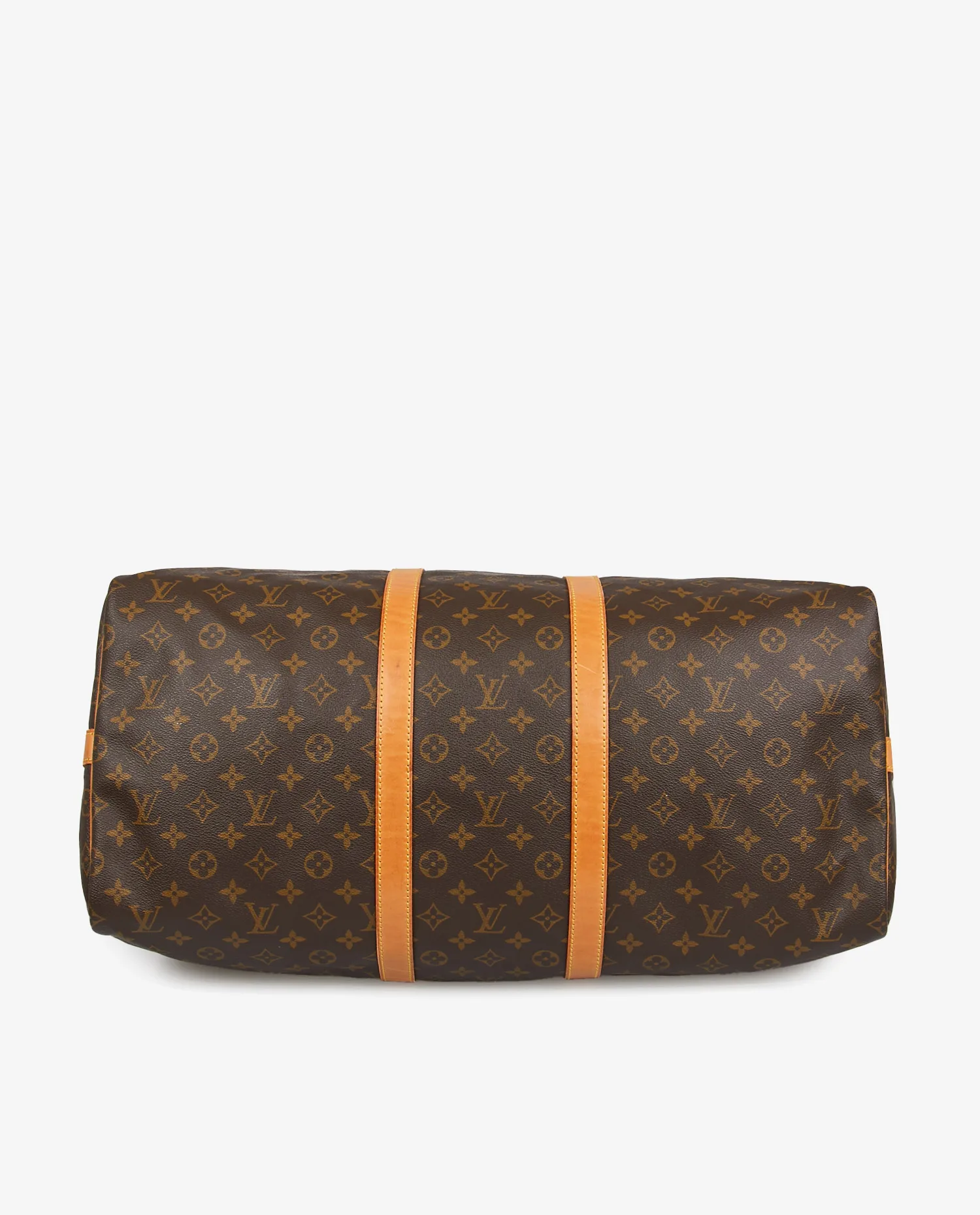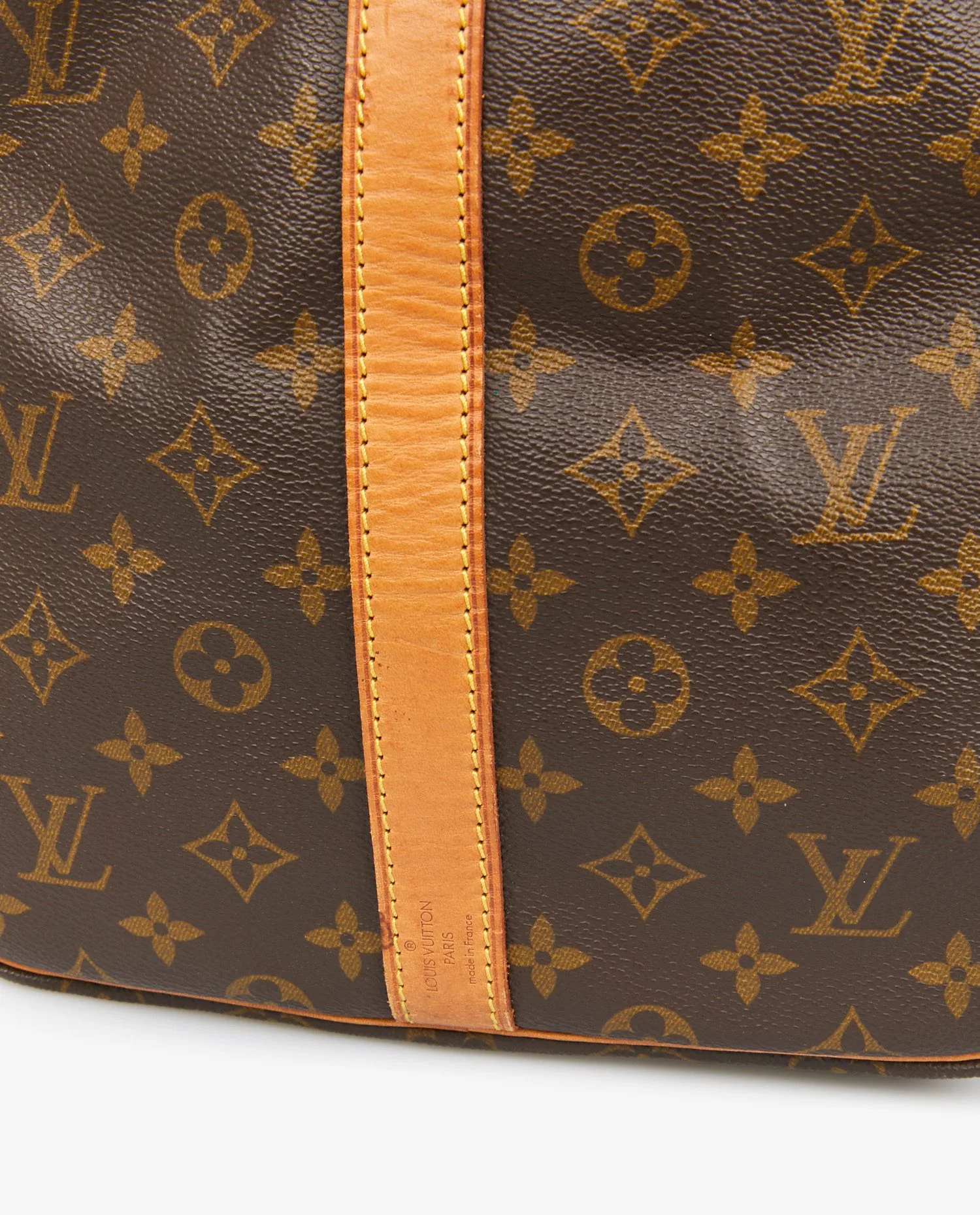 La toile monogram marron à motifs LV et fleurs de lys est résistante aux rayures et à l’humidité, gage de longévité. Les poignées roulées et les finitions sont en cuir de vachette naturel, aujourd’hui joliment patiné dans une teinte miel. Le sac présente des coutures renforcées et une base souple sans pieds métalliques. La fermeture zippée en laiton doré d’origine fonctionne parfaitement. Les dimensions généreuses — environ 55 cm de longueur, 31 cm de hauteur et 24 cm de profondeur — en font un bagage spacieux mais maniable.