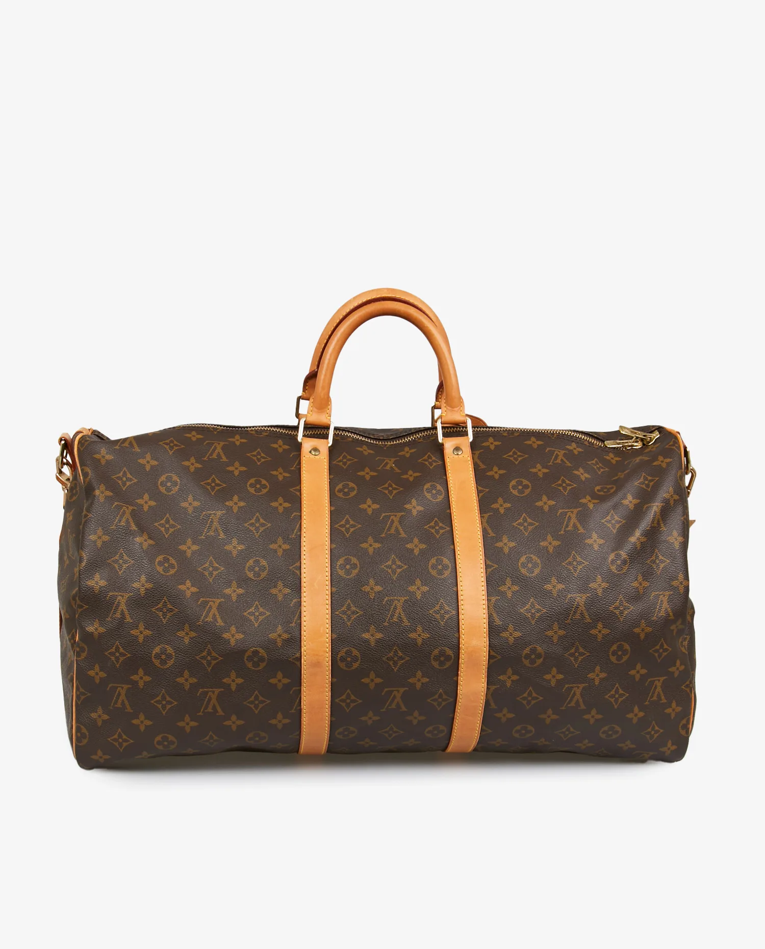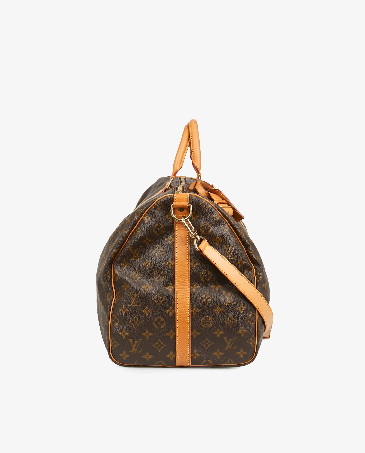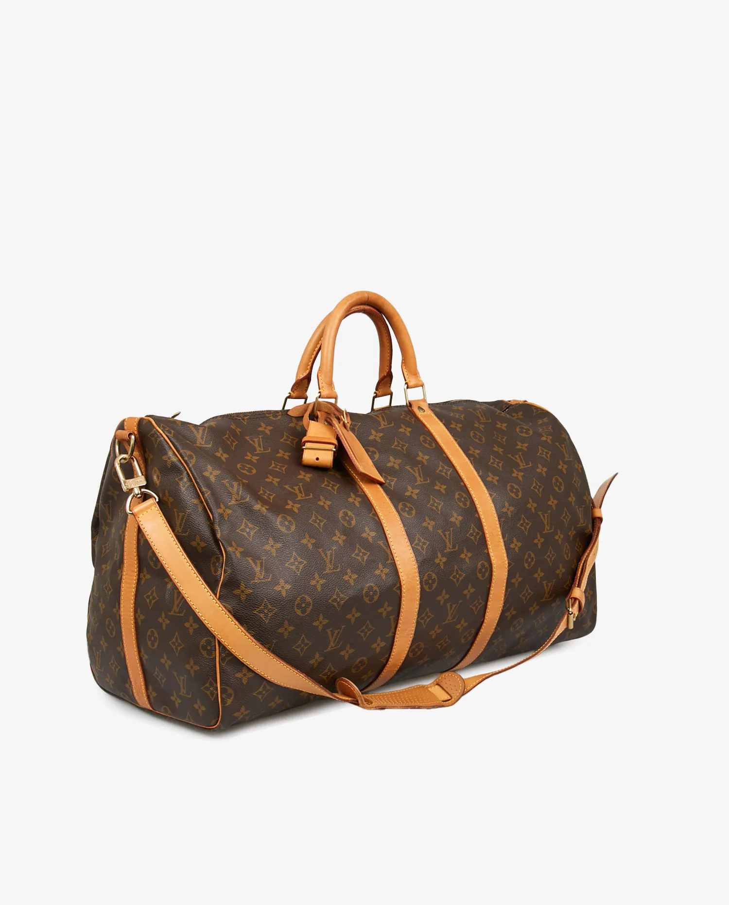 La toile monogram marron à motifs LV et fleurs de lys est résistante aux rayures et à l’humidité, gage de longévité. Les poignées roulées et les finitions sont en cuir de vachette naturel, aujourd’hui joliment patiné dans une teinte miel. Le sac présente des coutures renforcées et une base souple sans pieds métalliques. La fermeture zippée en laiton doré d’origine fonctionne parfaitement. Les dimensions généreuses — environ 55 cm de longueur, 31 cm de hauteur et 24 cm de profondeur — en font un bagage spacieux mais maniable.