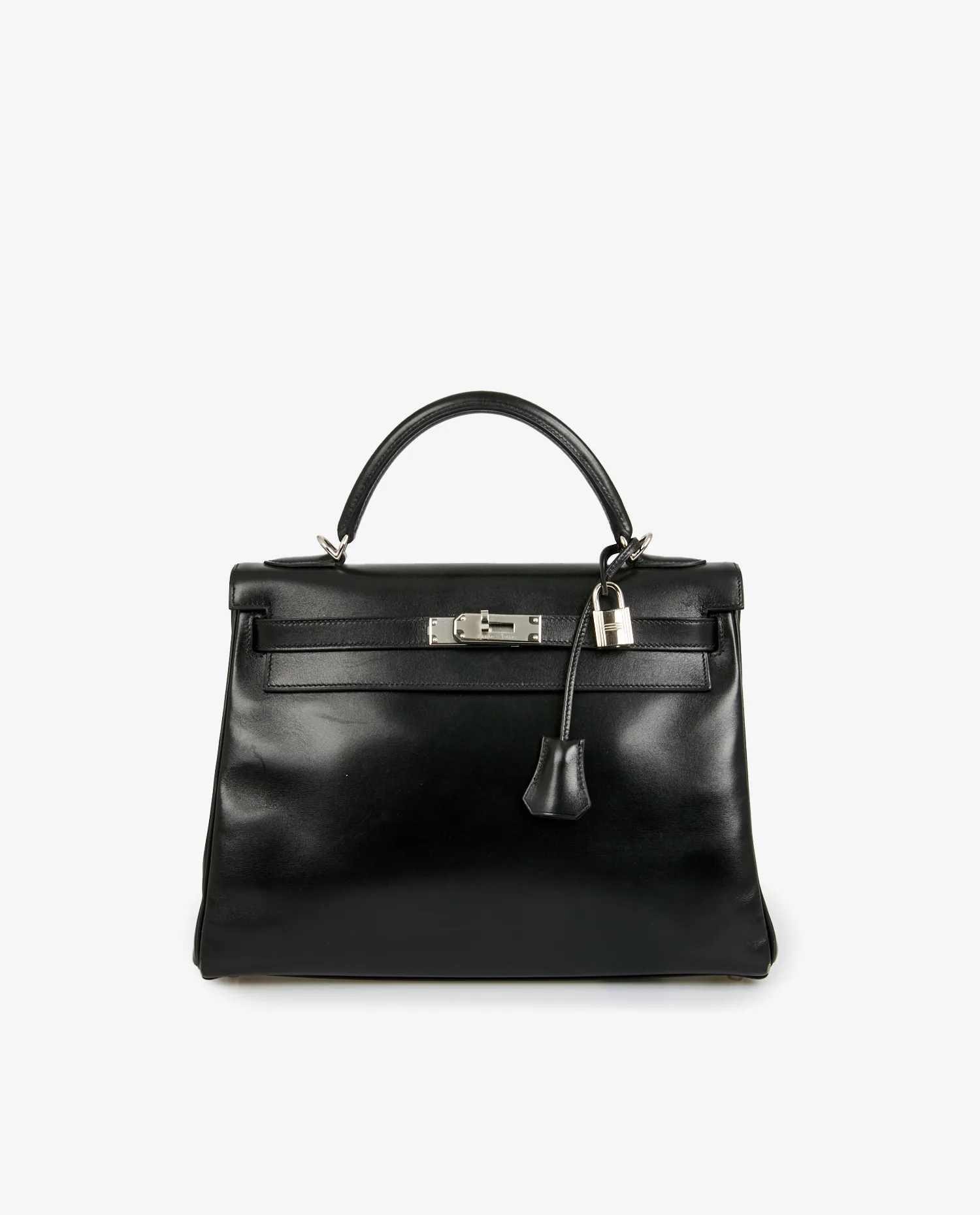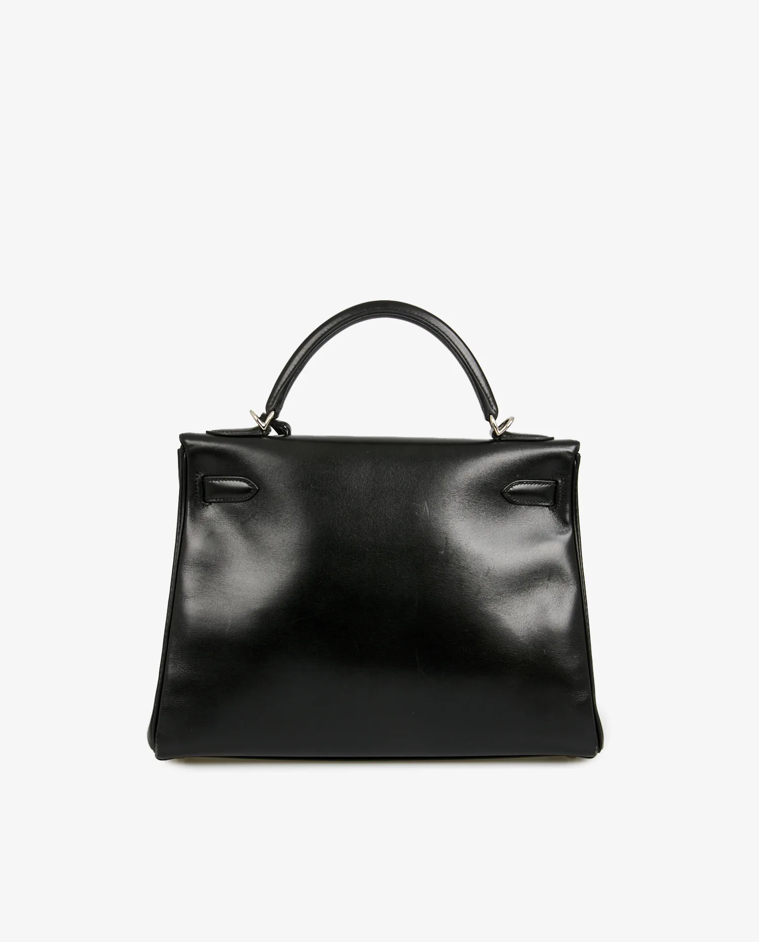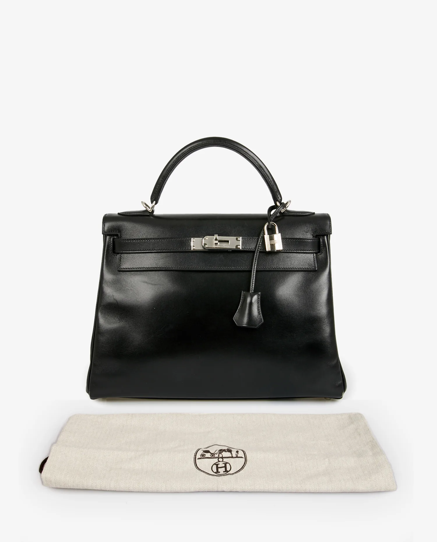 Sac Kelly II 32cm Hermès en cuir box noir. Bijouterie argent. Porté main ou à l’épaule à l’aide de sa bandoulière amovible. Tirette, clochette, cadenas et clefs. En très bon état. Les plastiques sont toujours présents sur l’accastillage. Livré dans son dustbag d’origine.