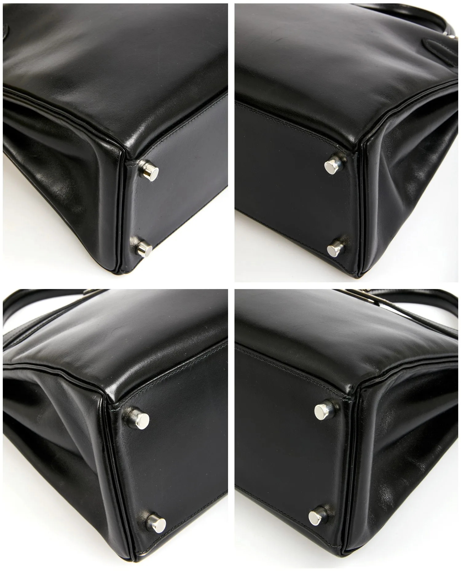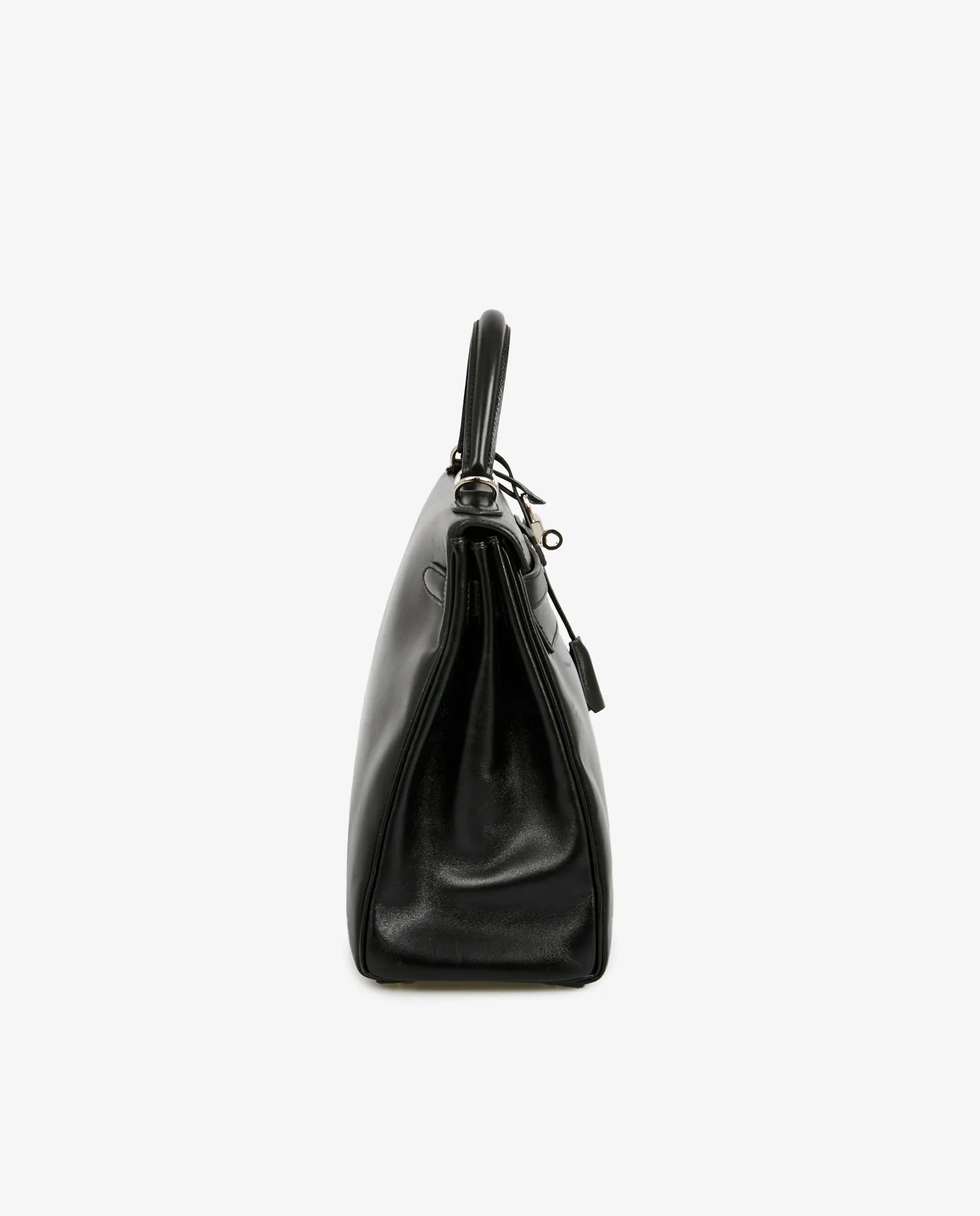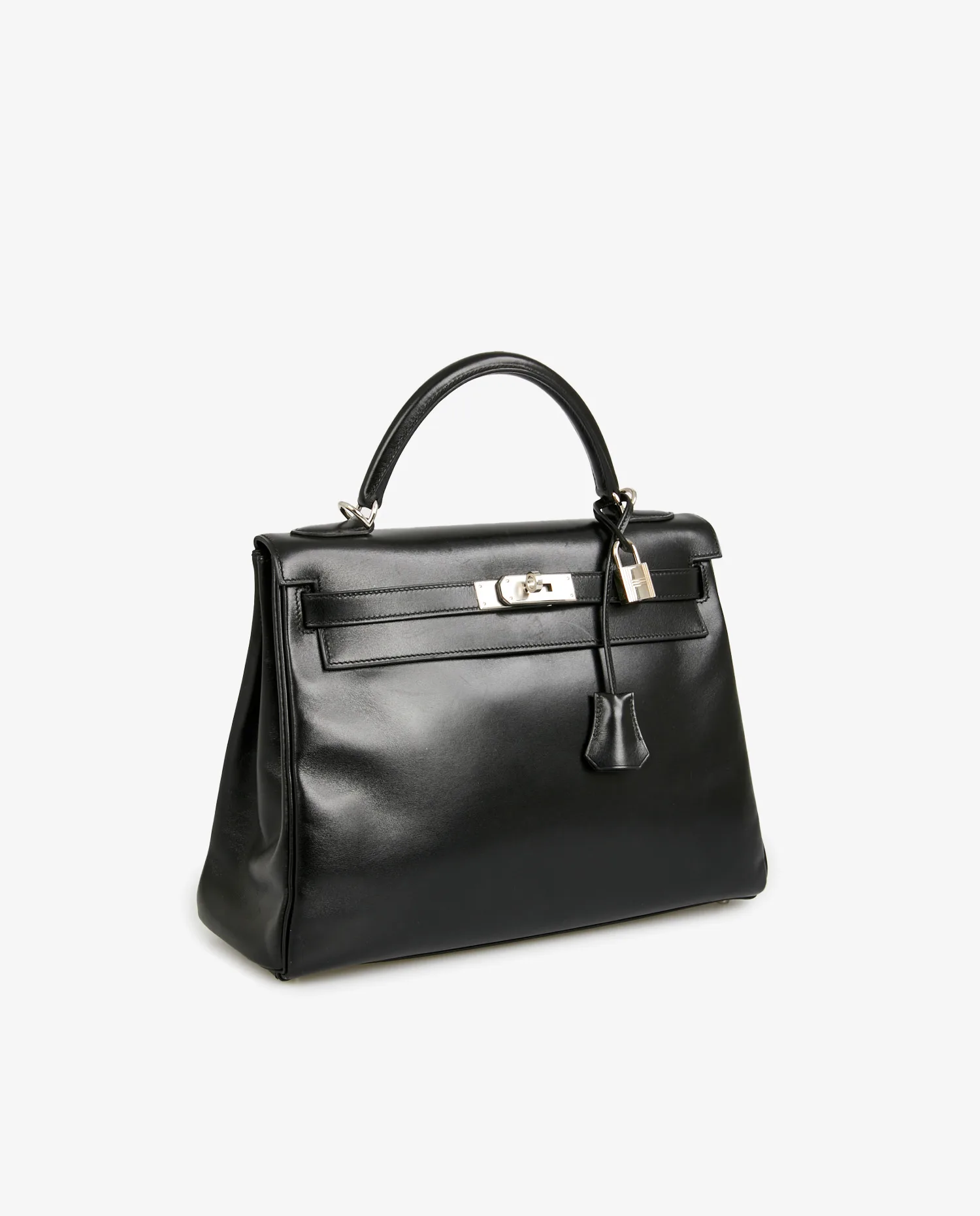 Sac Kelly II 32cm Hermès en cuir box noir. Bijouterie argent. Porté main ou à l’épaule à l’aide de sa bandoulière amovible. Tirette, clochette, cadenas et clefs. En très bon état. Les plastiques sont toujours présents sur l’accastillage. Livré dans son dustbag d’origine.