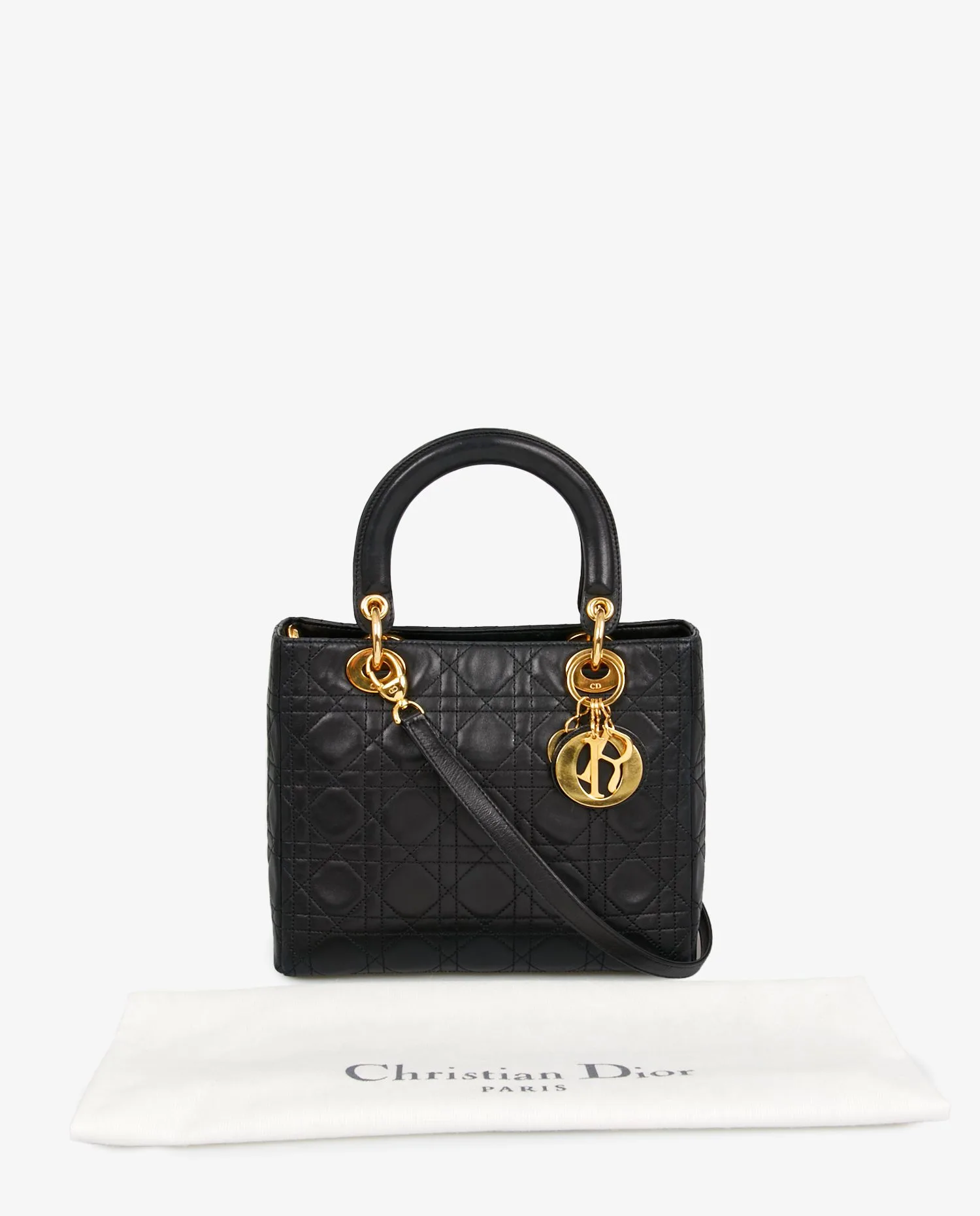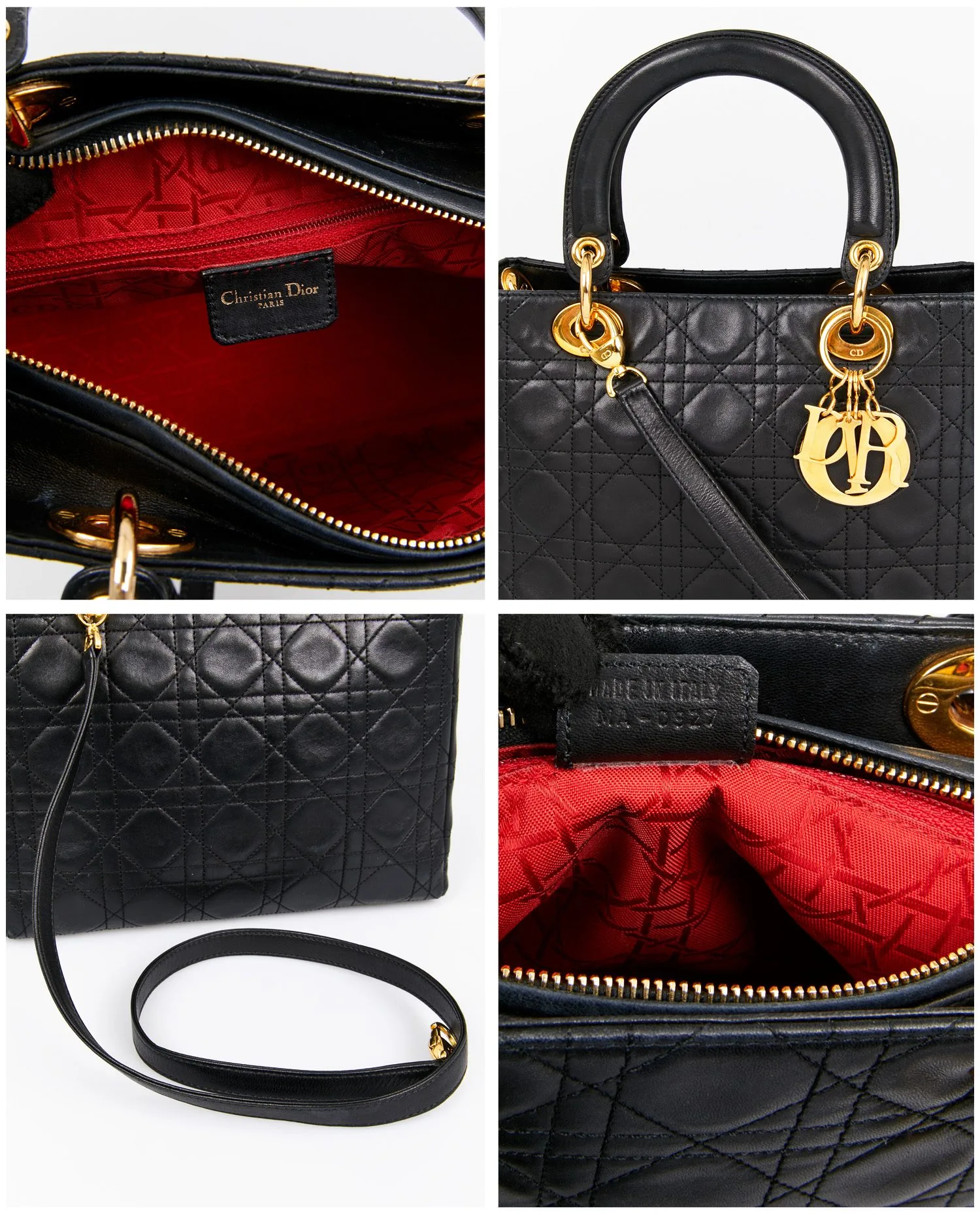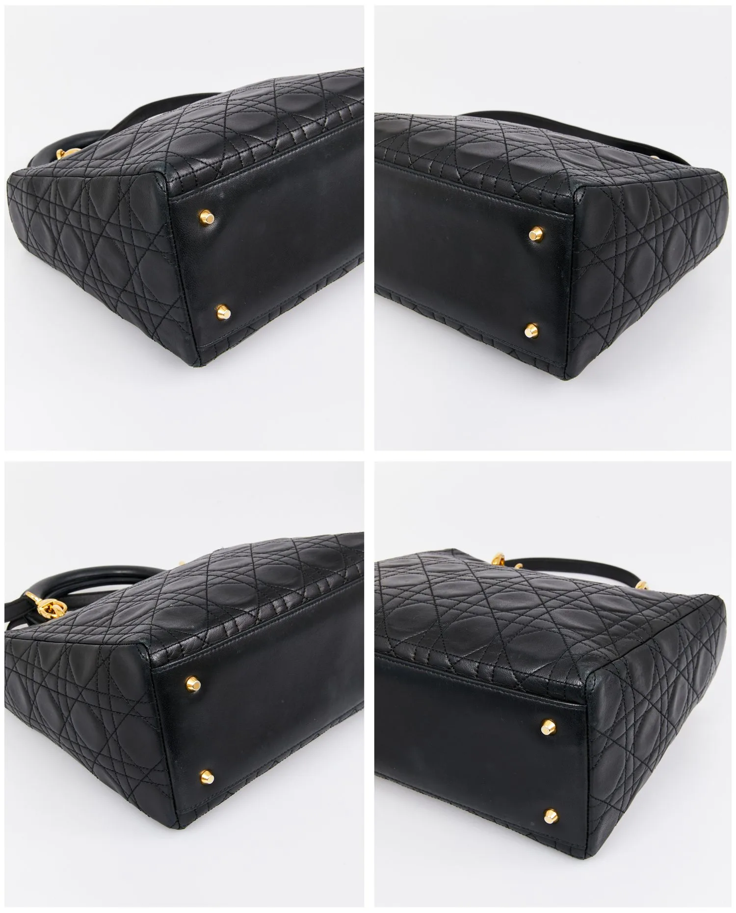 Le cuir noir est travaillé en surpiqûres croisées formant le motif cannage, élément décoratif fort du style Dior. La structure est rigide, avec une base renforcée pour assurer la tenue du sac. Les poignées arrondies sont gainées de cuir, tandis que la bandoulière amovible en cuir assorti permet une modularité d’usage. Les éléments métalliques dorés, incluant les pieds de sac, les anneaux d’attache et les charms pendants, complètent l’esthétique luxueuse. Dimensions approximatives : 24 cm de largeur, 20 cm de hauteur, 11 cm de profondeur.