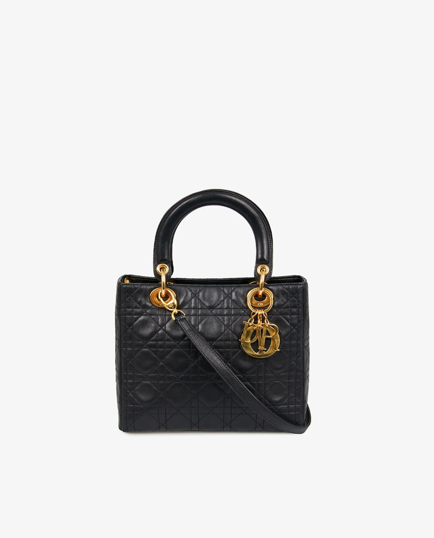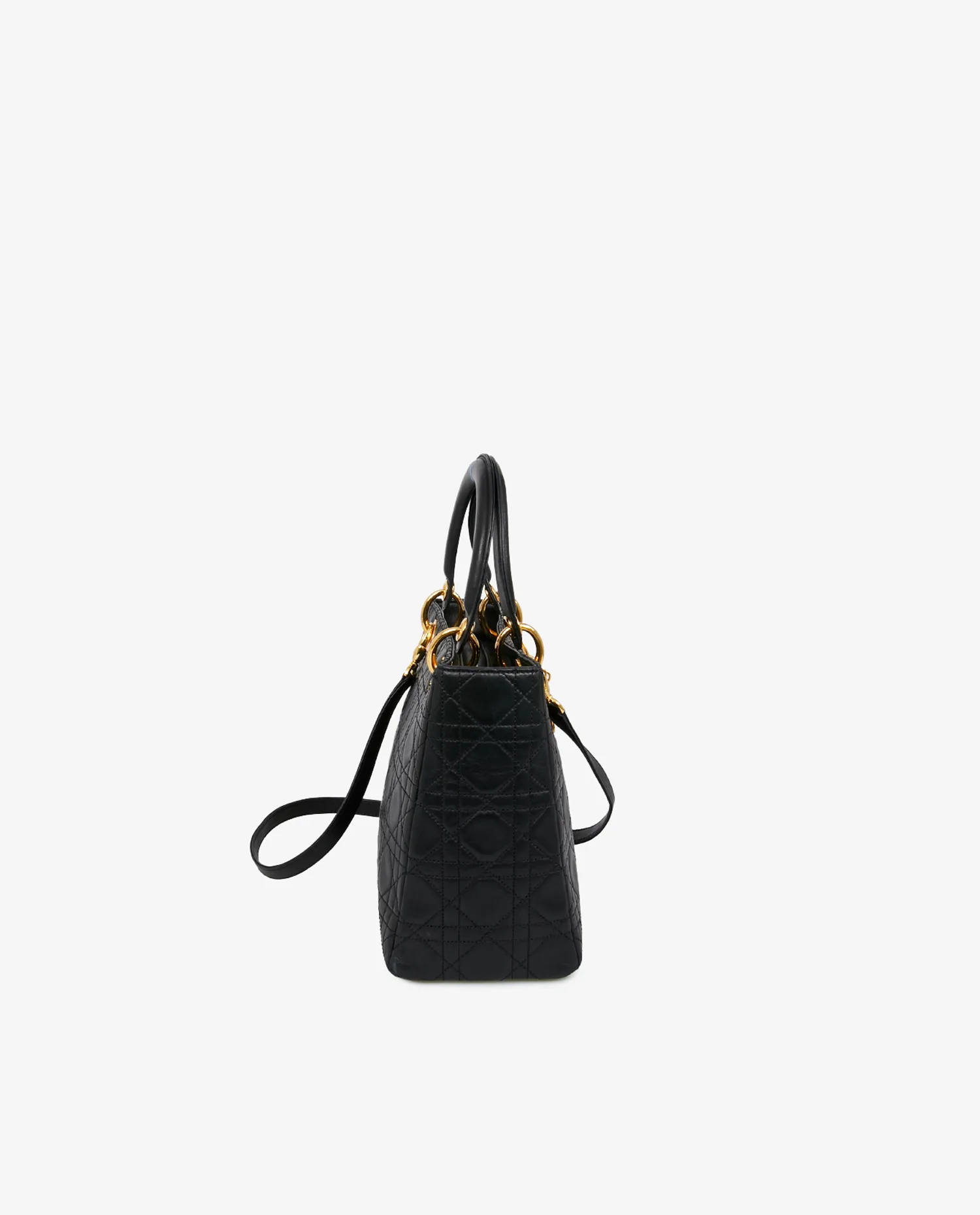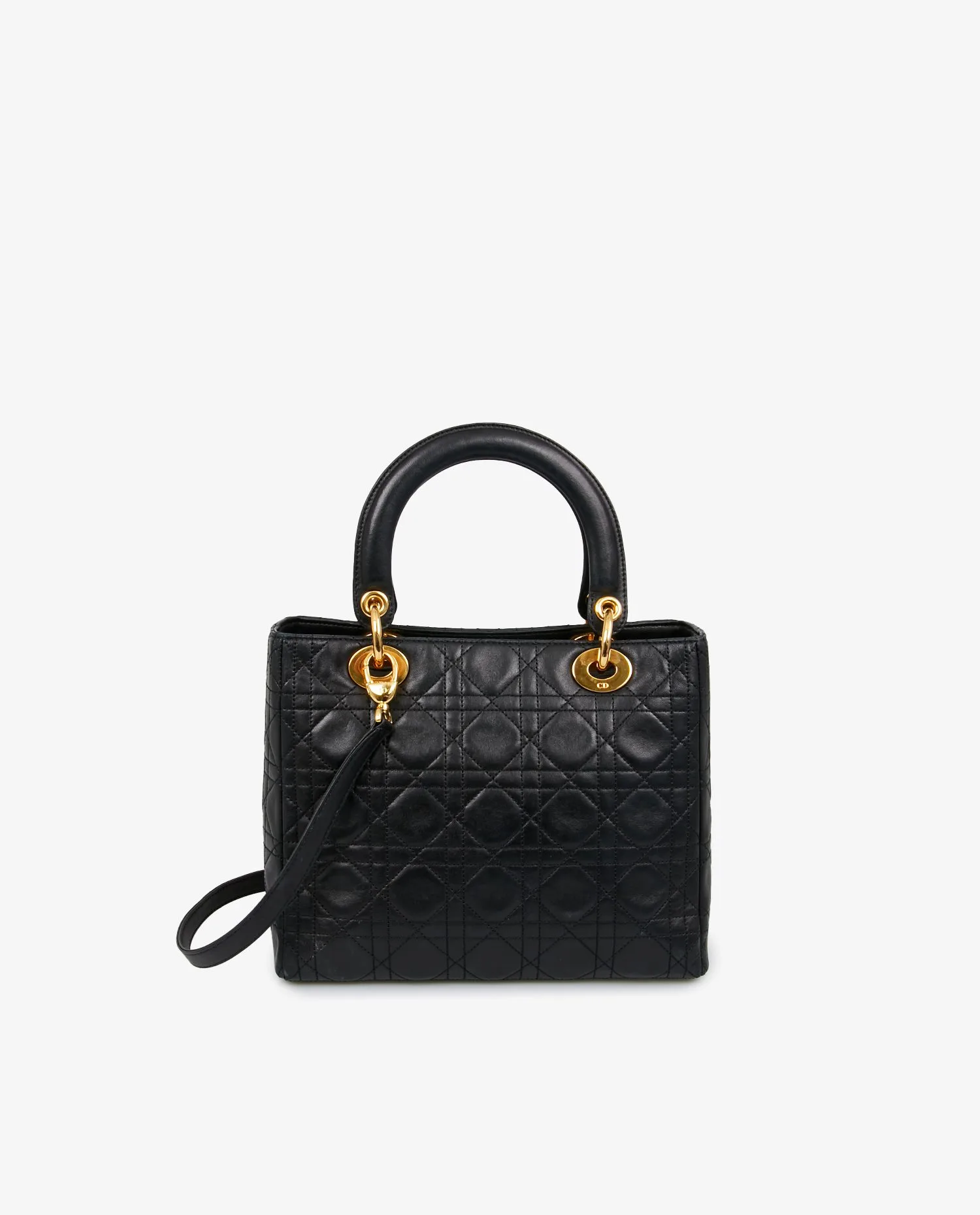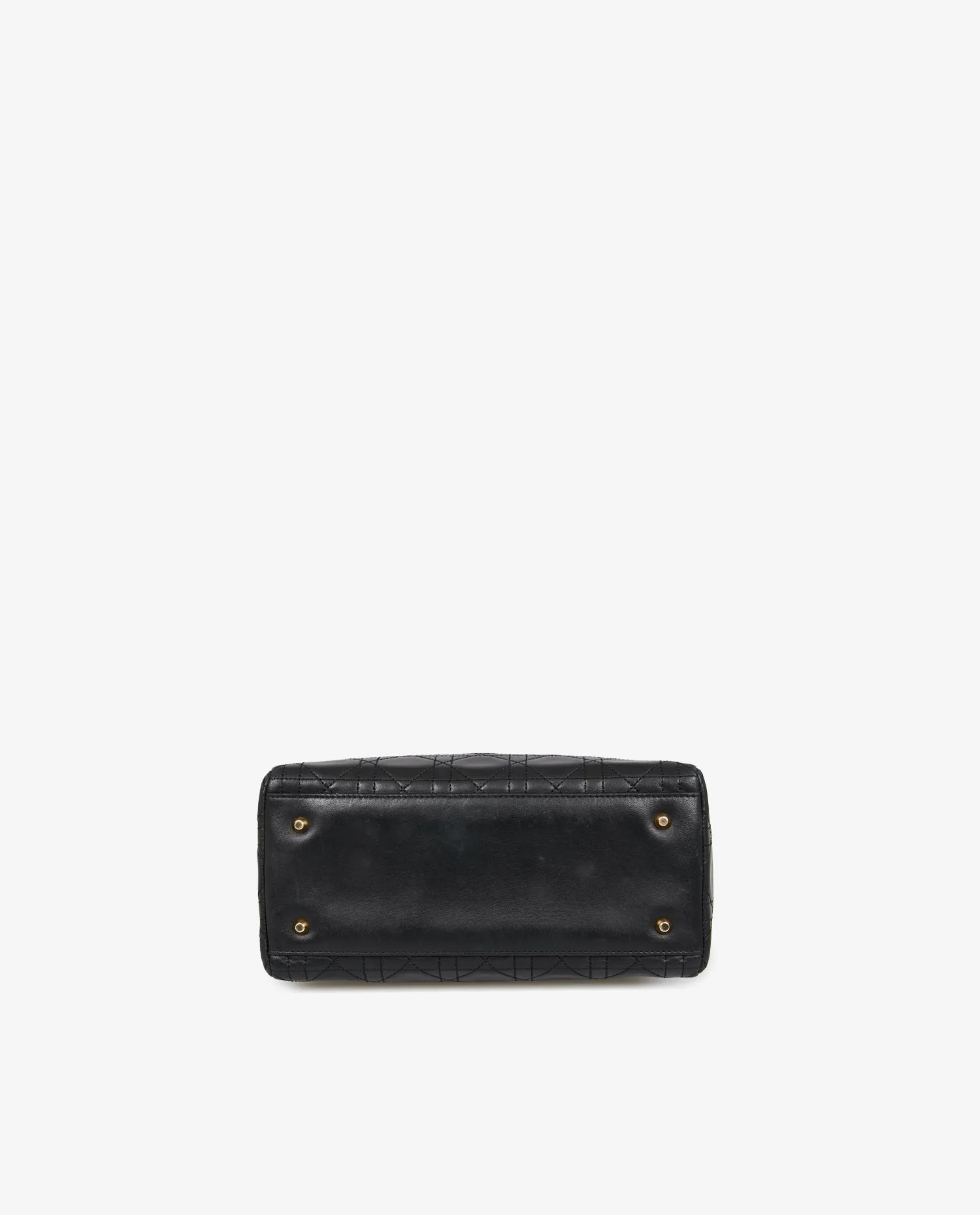 Le cuir noir est travaillé en surpiqûres croisées formant le motif cannage, élément décoratif fort du style Dior. La structure est rigide, avec une base renforcée pour assurer la tenue du sac. Les poignées arrondies sont gainées de cuir, tandis que la bandoulière amovible en cuir assorti permet une modularité d’usage. Les éléments métalliques dorés, incluant les pieds de sac, les anneaux d’attache et les charms pendants, complètent l’esthétique luxueuse. Dimensions approximatives : 24 cm de largeur, 20 cm de hauteur, 11 cm de profondeur.