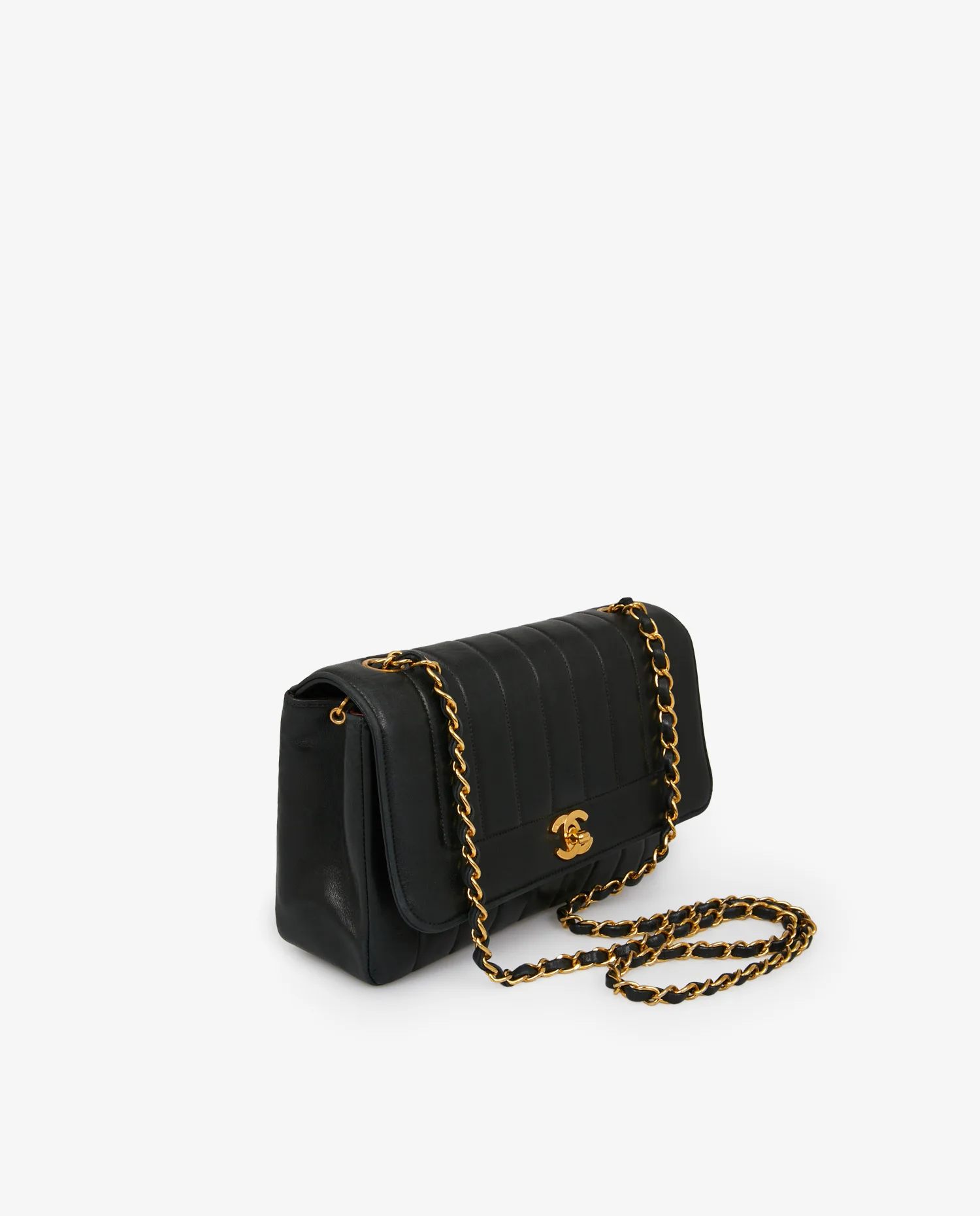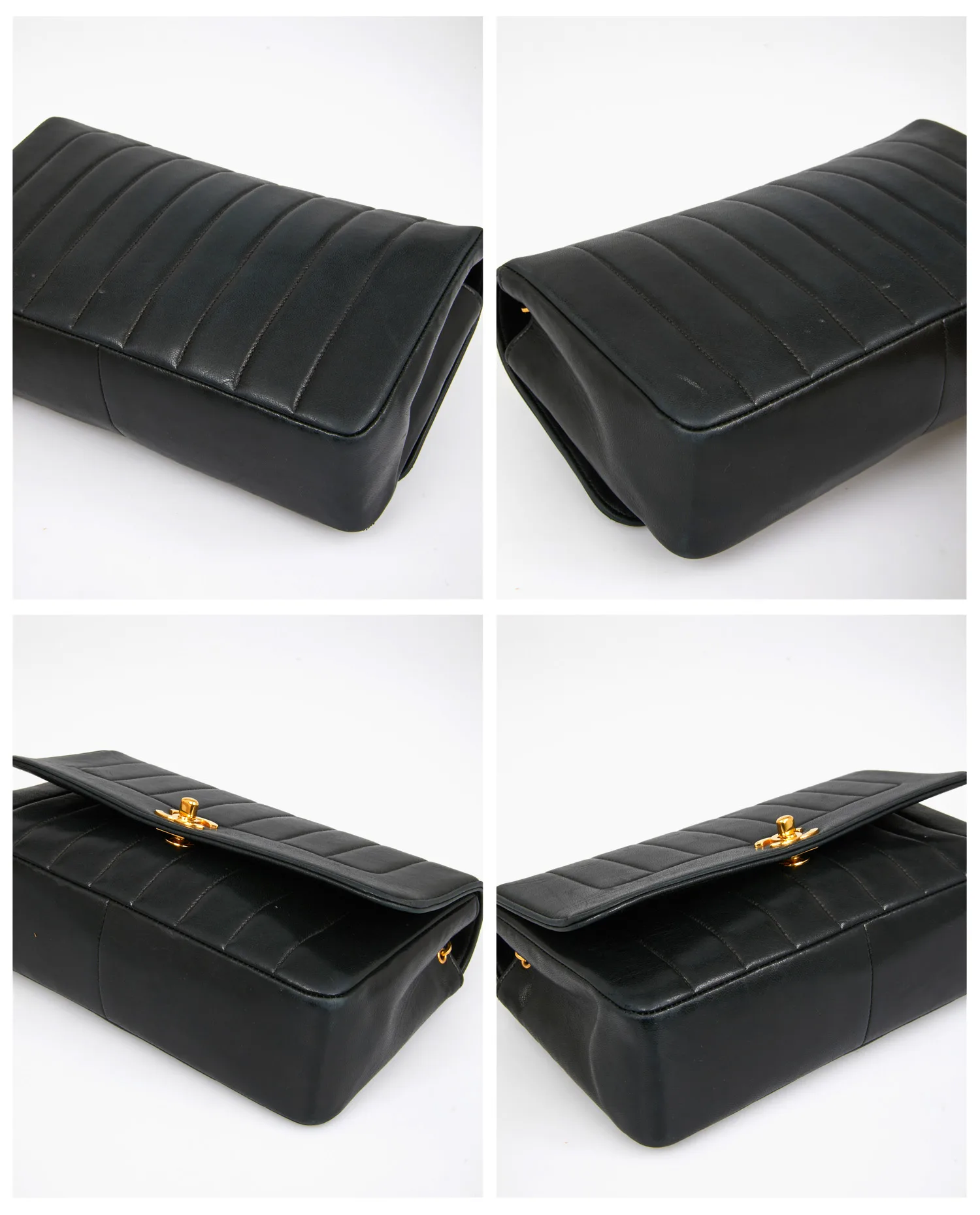 Le cuir d’agneau noir présente un grain lisse et souple avec une finition semi-brillante. Le matelassage vertical apporte un effet graphique subtil et élance la forme du sac. Le rabat est orné d’un fermoir tourniquet en métal doré gravé du monogramme CC, désormais patiné. La bandoulière chaîne entrelacée peut se porter en simple ou double, à l’épaule ou en travers du buste. Les angles sont légèrement arrondis, renforçant la forme boîte de l’ensemble. Dimensions approximatives : 24 cm de large, 16 cm de haut et 6,5 cm de profondeur.