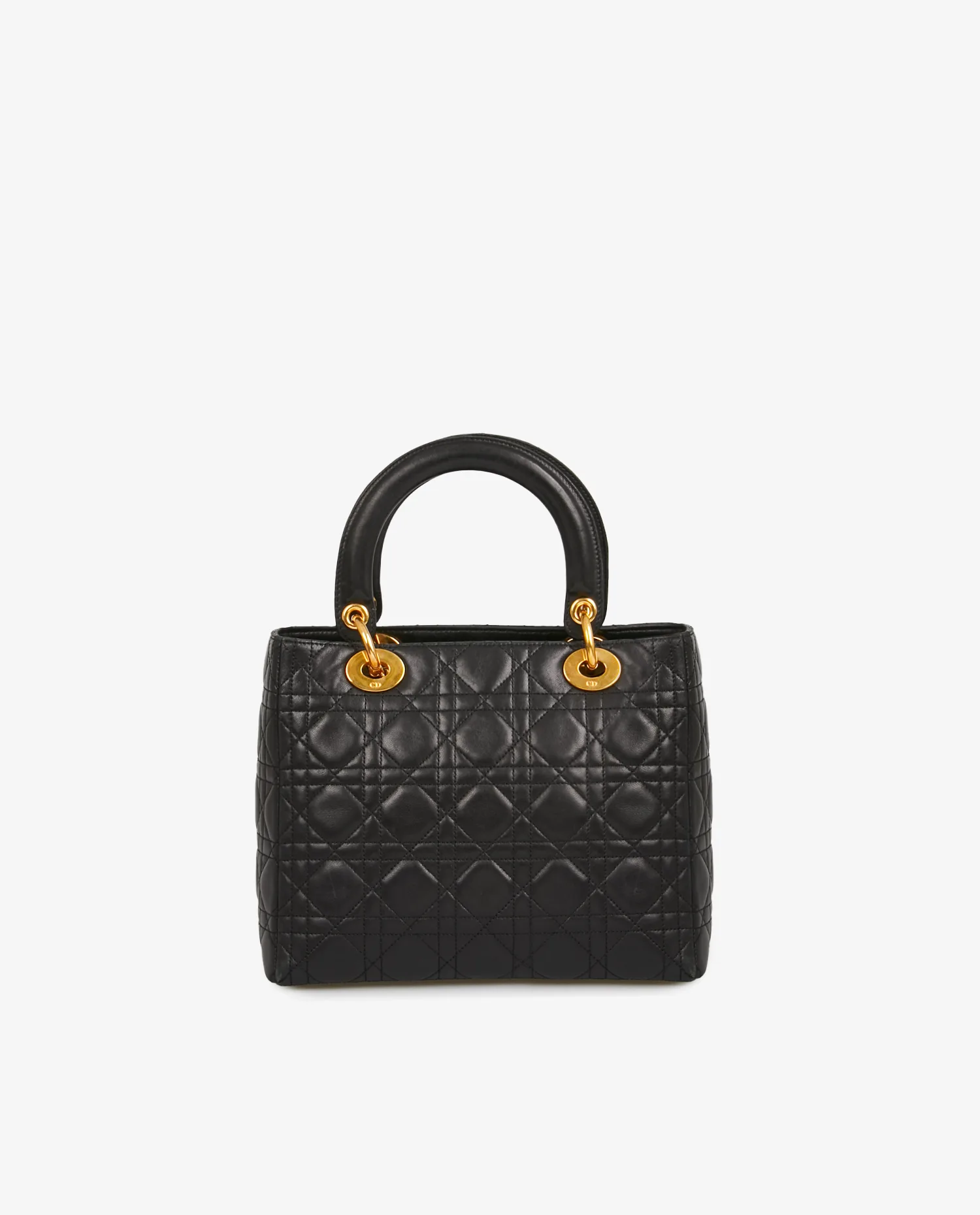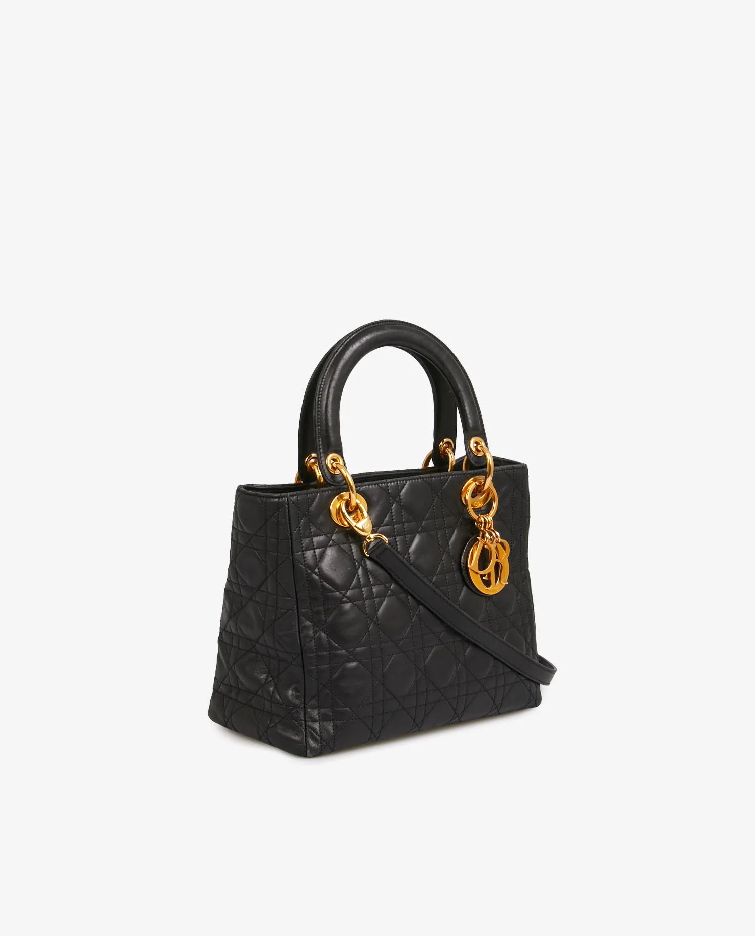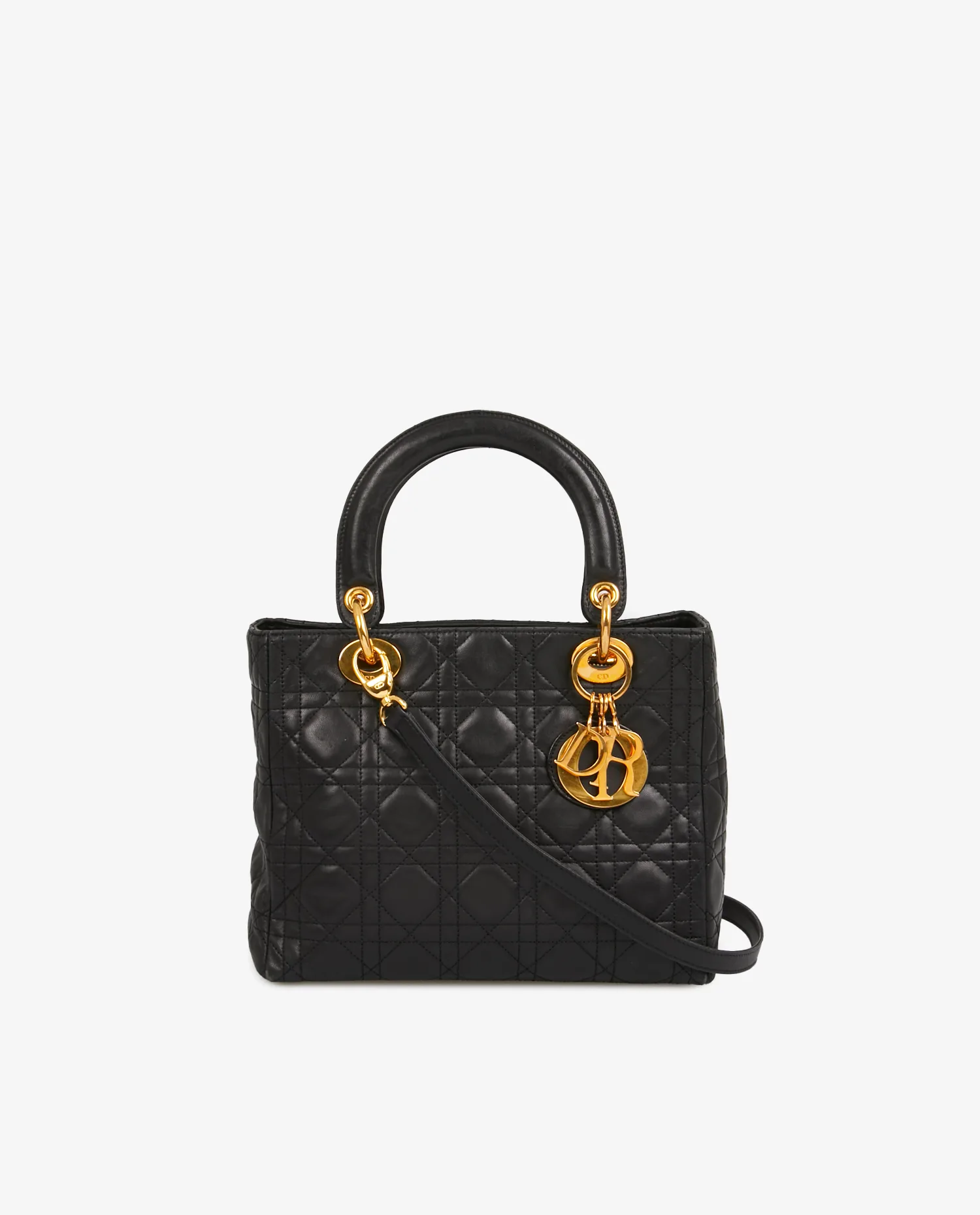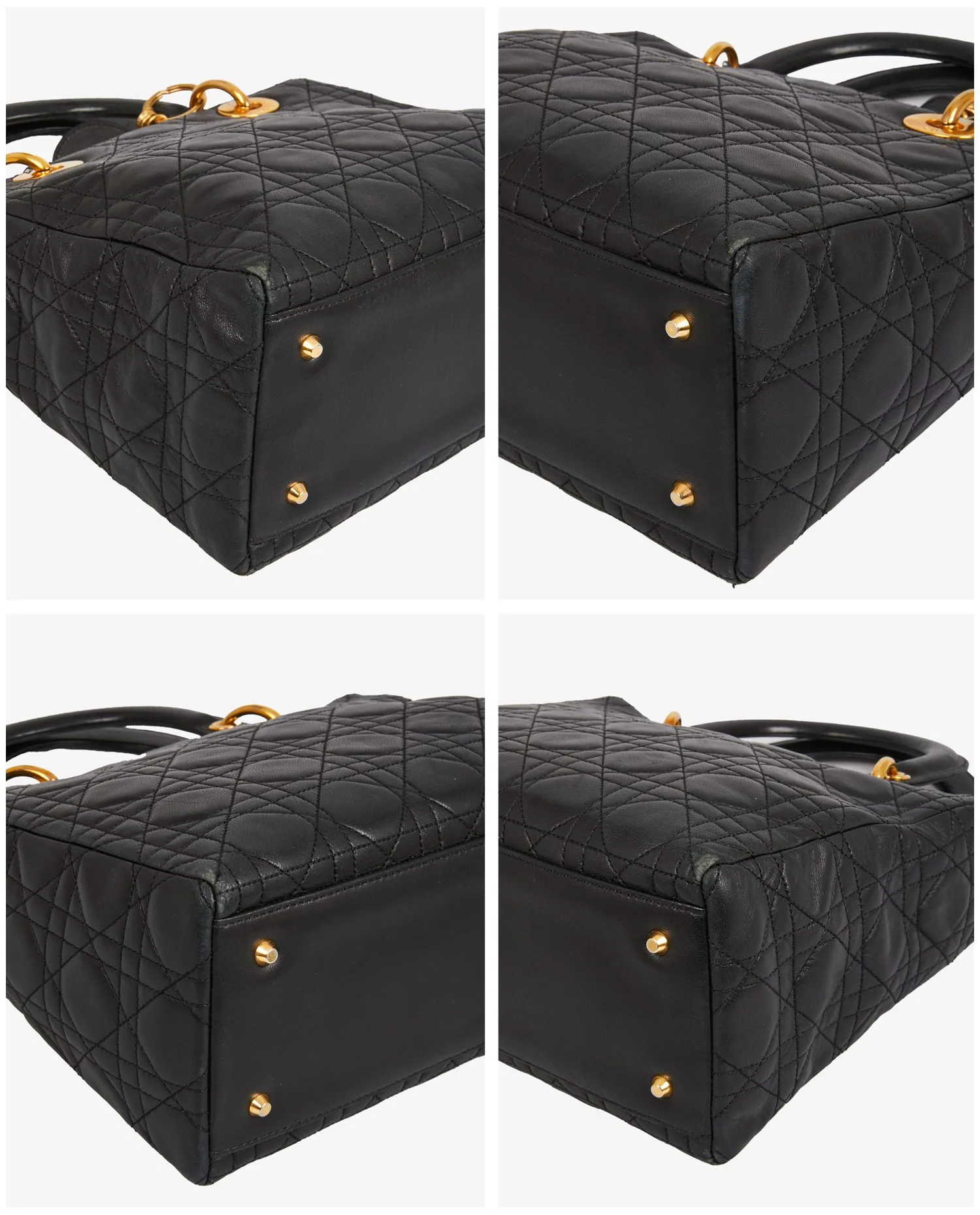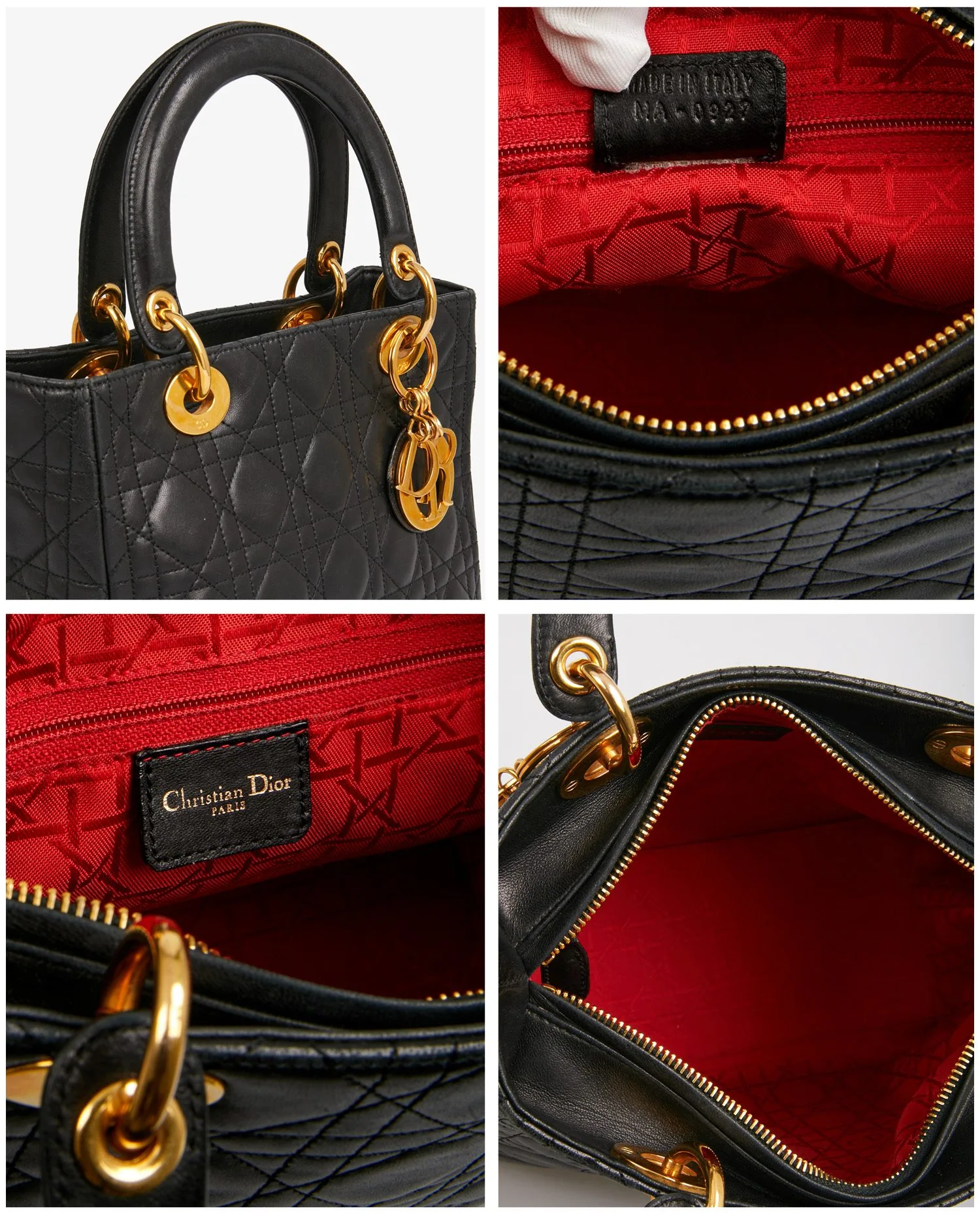 Sac Lady Dior vintage en cuir d’agneau matelassé à coutures Cannage noir. Charms D.I.O.R en métal doré à l’avant. Fermeture zippée. Porté à la main ainsi qu’à l’épaule ou en crossbody à l’aide d’une bandoulière amovible (90cm). En très bon état. Quelques rayures sur la bijouterie.