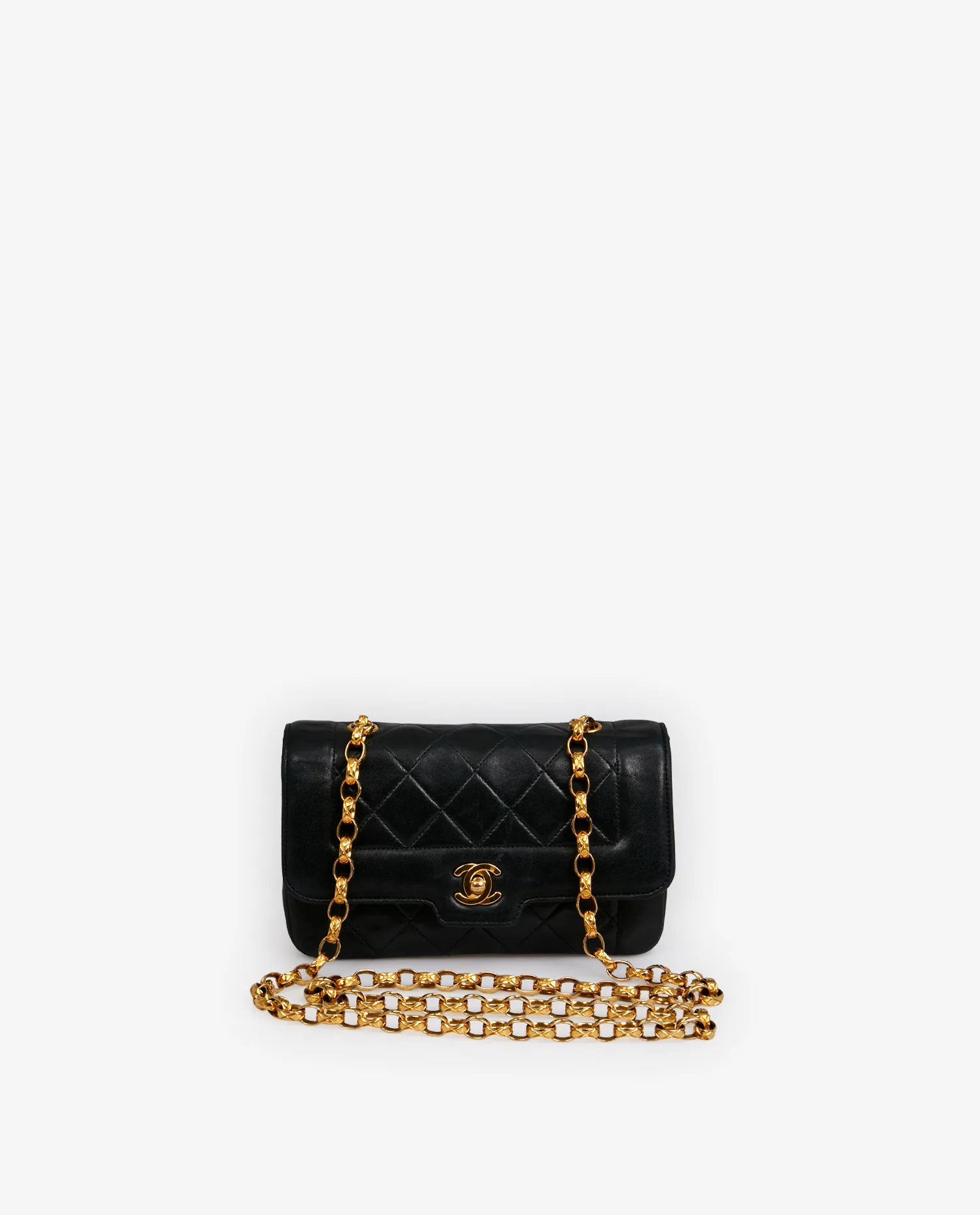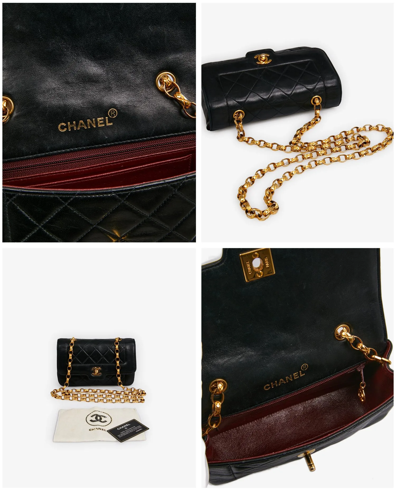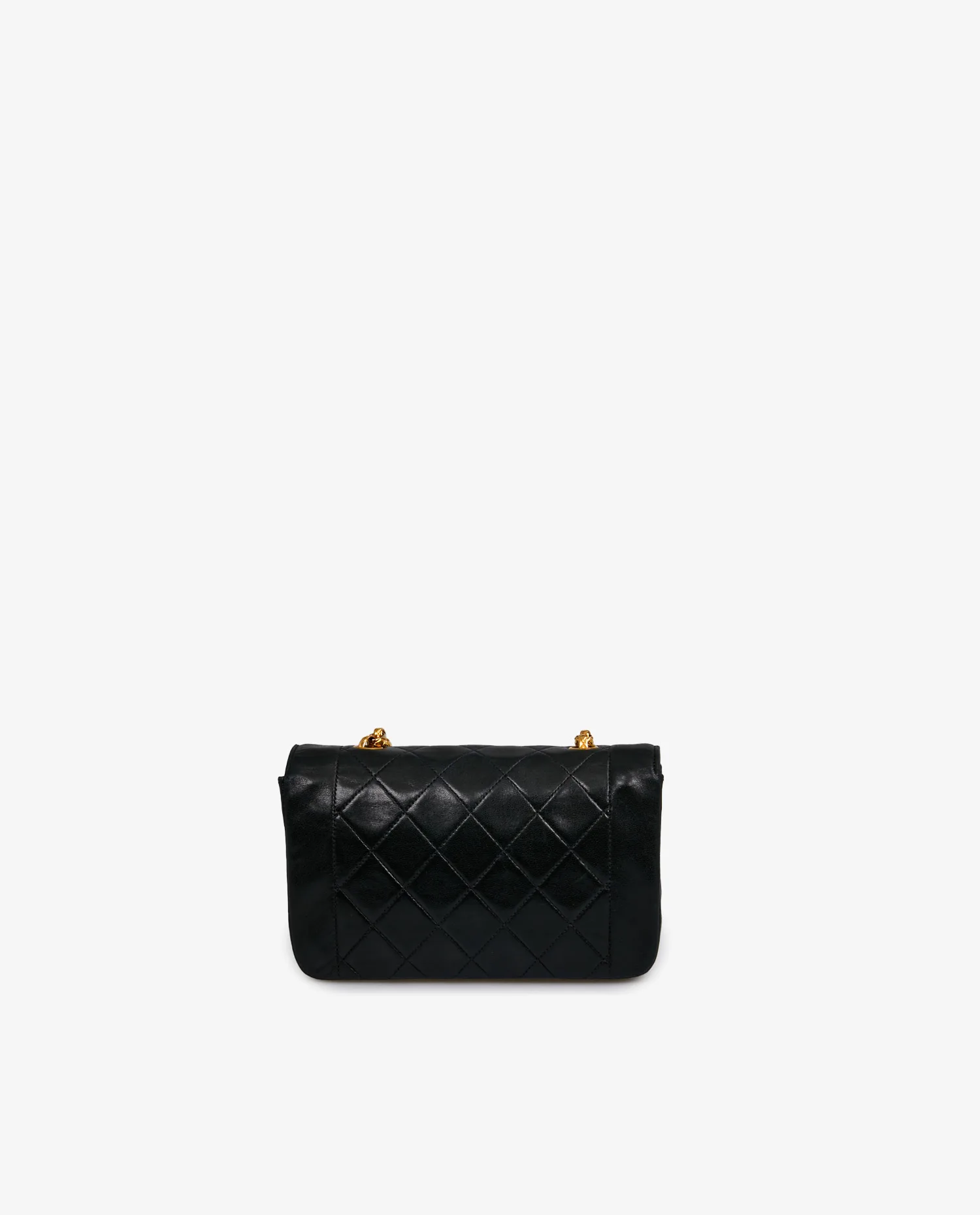 Mini sac Diana Chanel vintage en cuir d’agneau matelassé noir. La bijouterie est en métal doré plaqué 24K. Il se porte à l’épaule ou en crossbody à l’aide d’une bandoulière en métal doré matelassé. L’intérieur est en cuir bordeaux. En très bon état. Livré dans son dustbag d’origine.