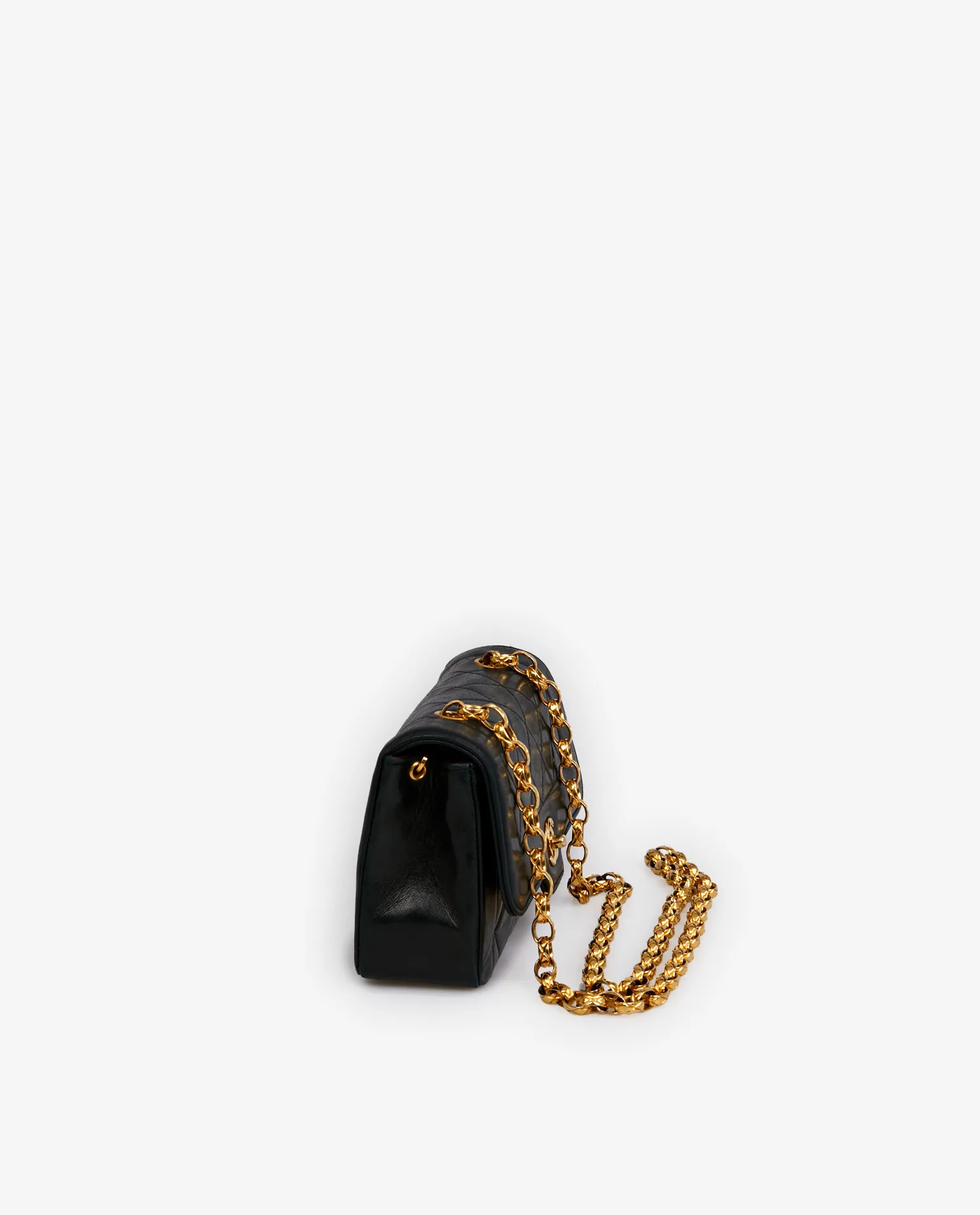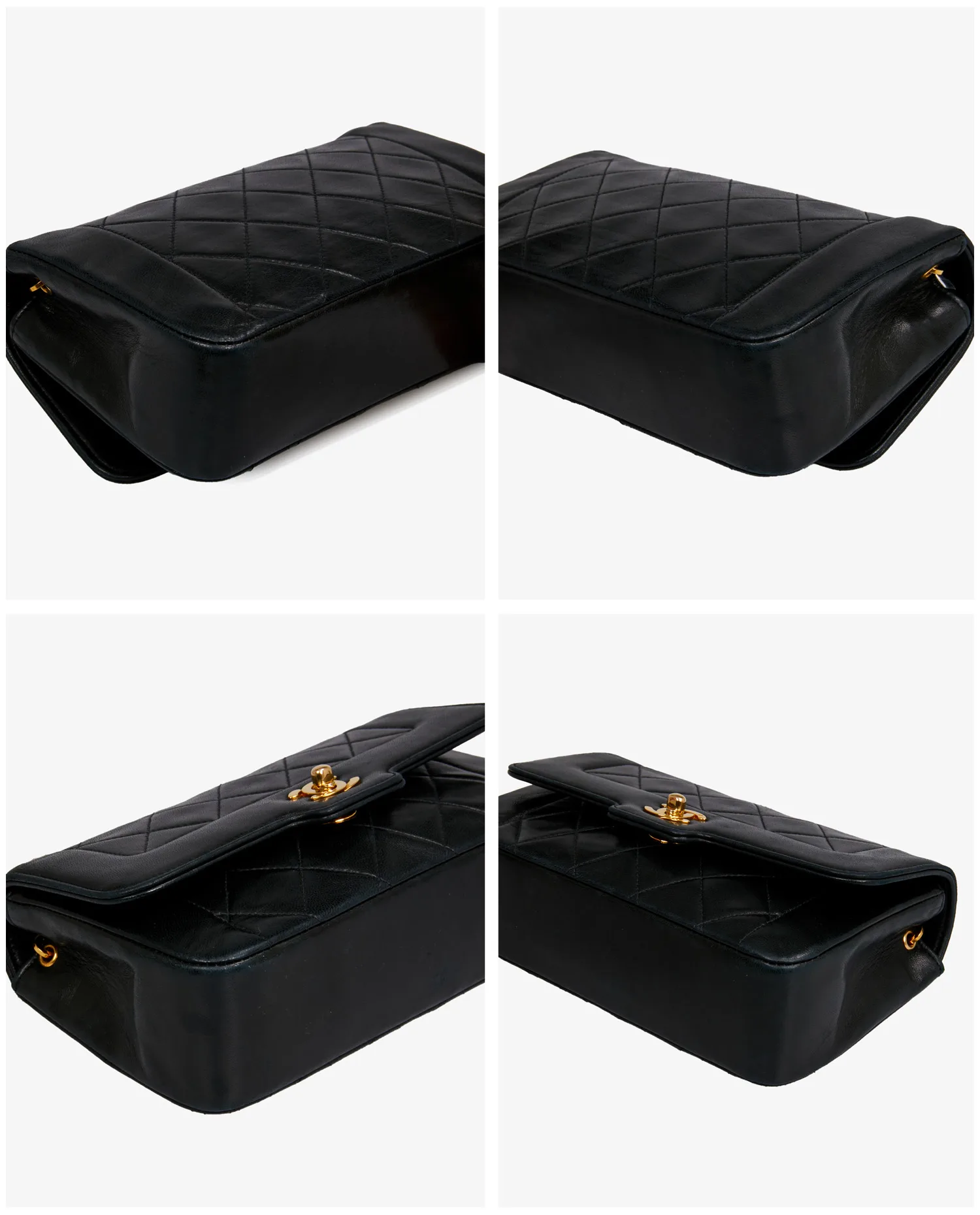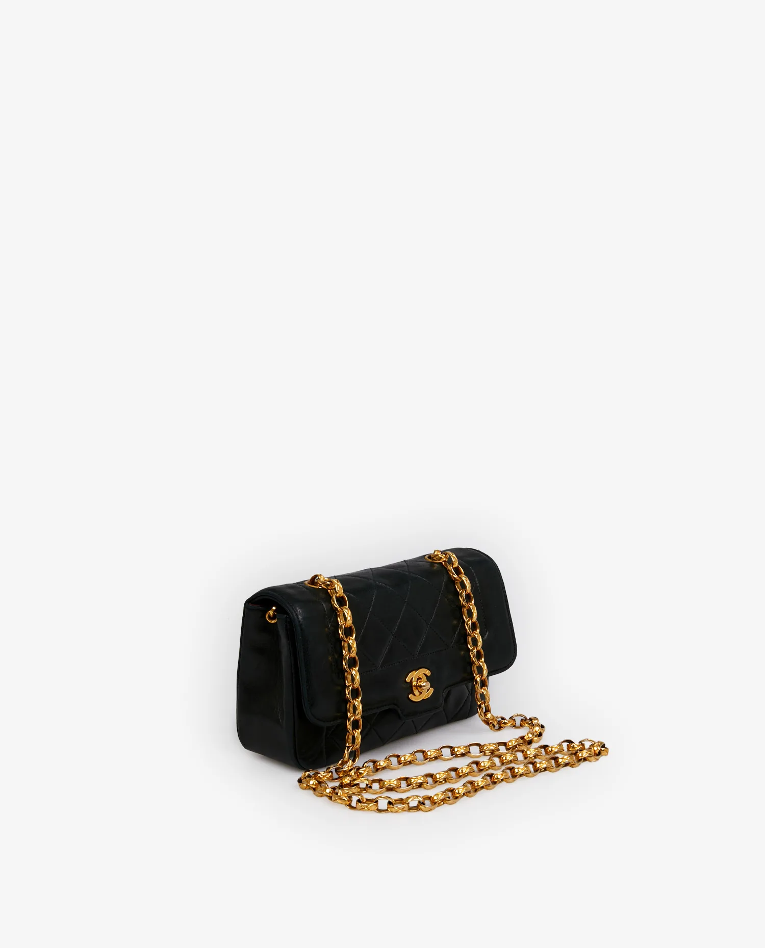 Mini sac Diana Chanel vintage en cuir d’agneau matelassé noir. La bijouterie est en métal doré plaqué 24K. Il se porte à l’épaule ou en crossbody à l’aide d’une bandoulière en métal doré matelassé. L’intérieur est en cuir bordeaux. En très bon état. Livré dans son dustbag d’origine.