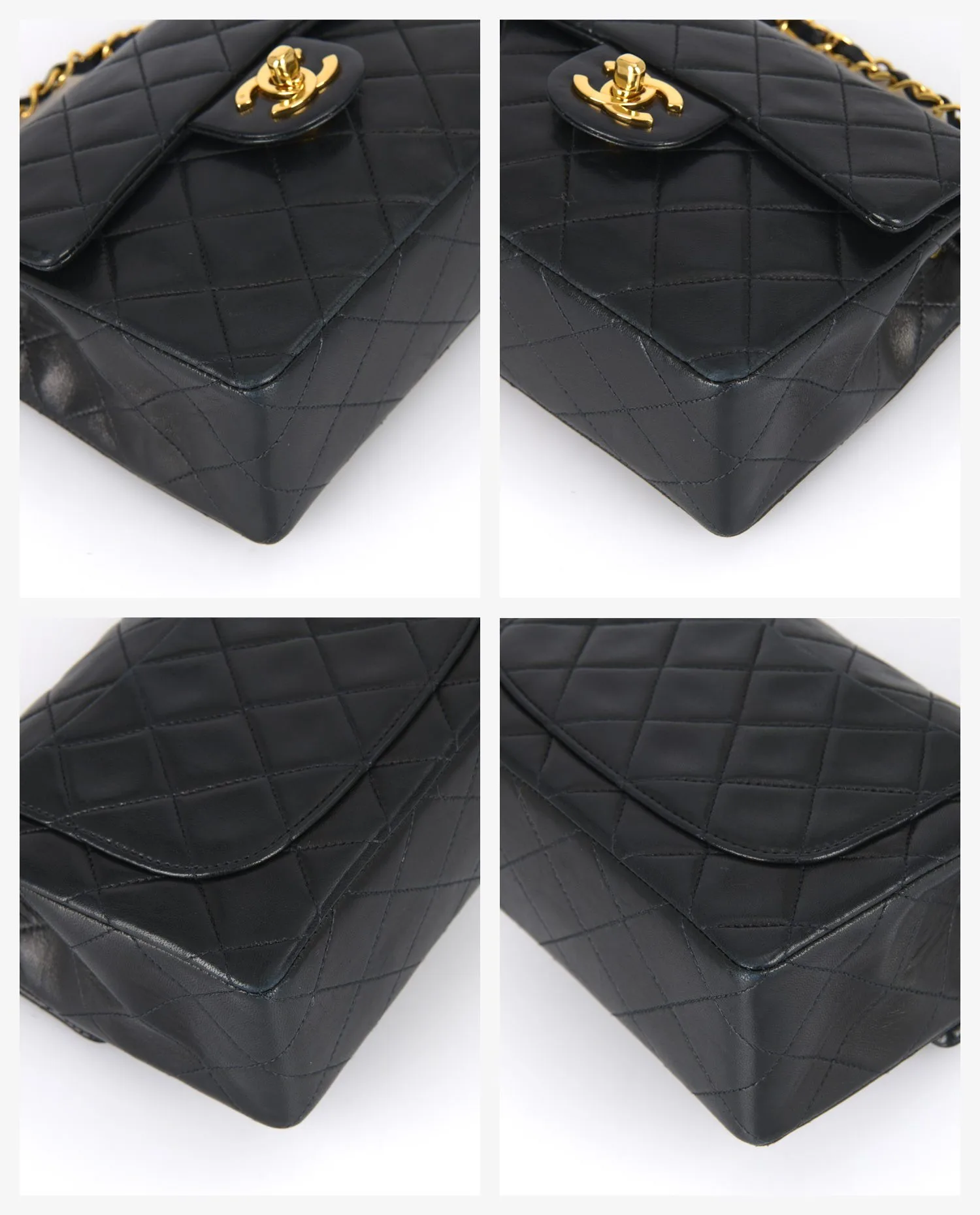 Ce sac est en bon état vintage. Les coins inférieurs présentent quelques frottements visibles, mais sans accroc. Le cuir conserve une belle souplesse et une brillance naturelle. Le fermoir fonctionne parfaitement et la chaîne ne présente pas de faiblesse. Des plis et légères marques sont visibles sur le cuir, notamment sur le rabat, sans altérer l’intégrité du sac.