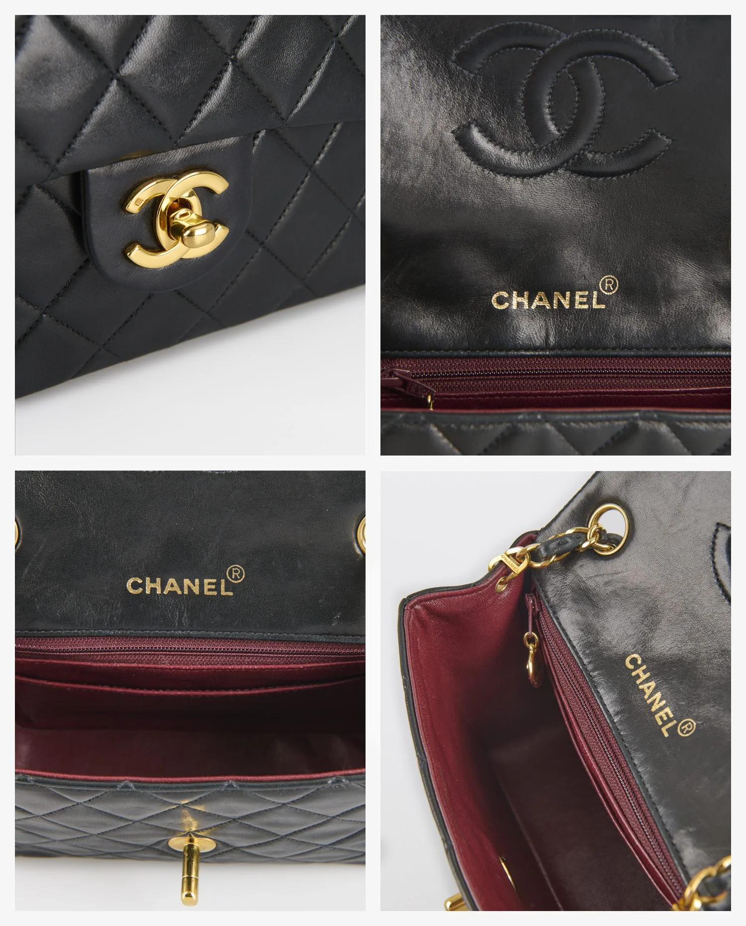L’intérieur est doublé de cuir bordeaux lisse, une caractéristique emblématique des sacs classiques Chanel. Il comprend une poche plaquée et une poche zippée, permettant de compartimenter les essentiels. Le marquage “CHANEL® Made in France” doré est bien visible sous le rabat. L’ensemble intérieur est bien conservé, avec une légère patine cohérente avec l’âge du sac.