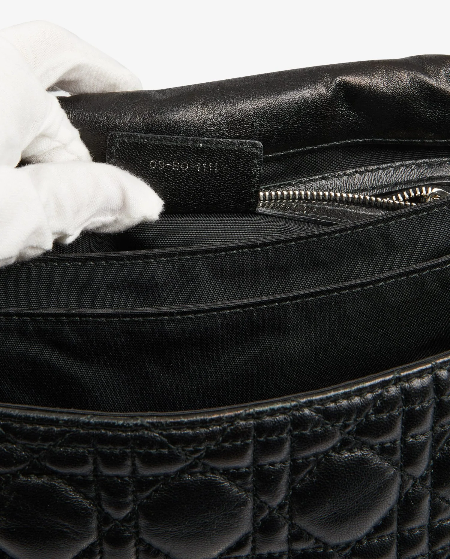 Sac Miss Dior en cuir d’agneau noir. Porté épaule. A l’intérieur, 3 compartiments de rangement en tissu noir. En très bon état. Très légère usure des coins.