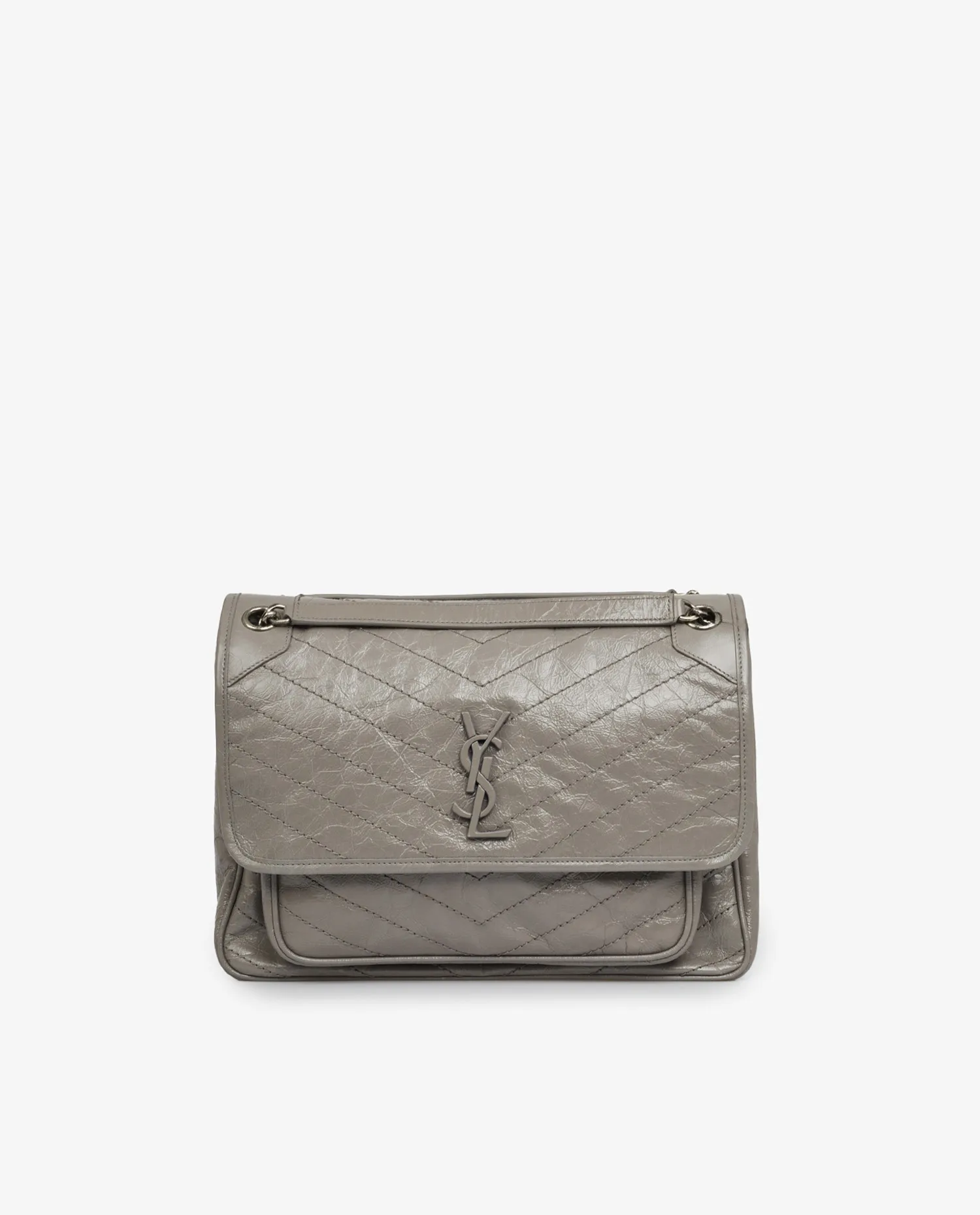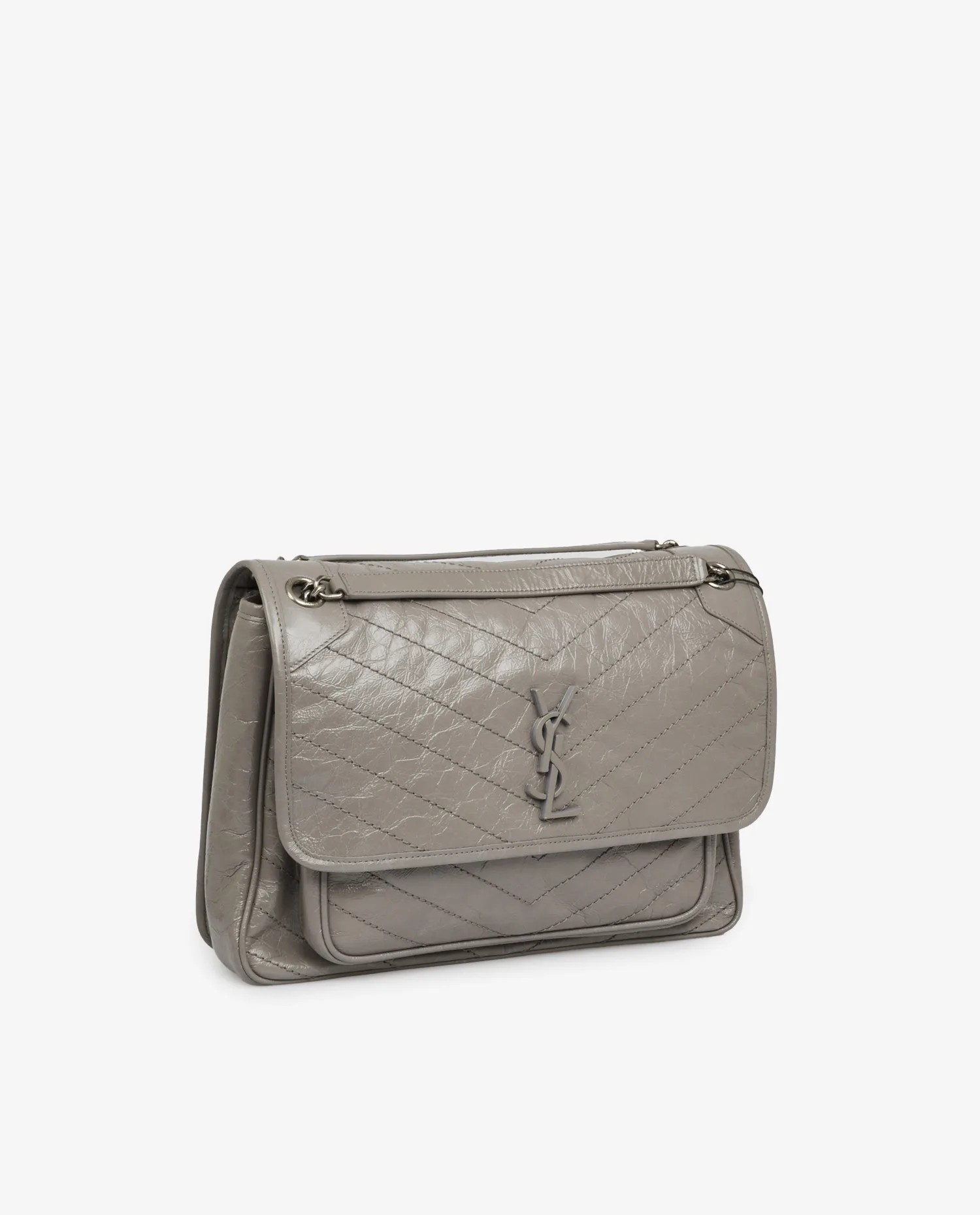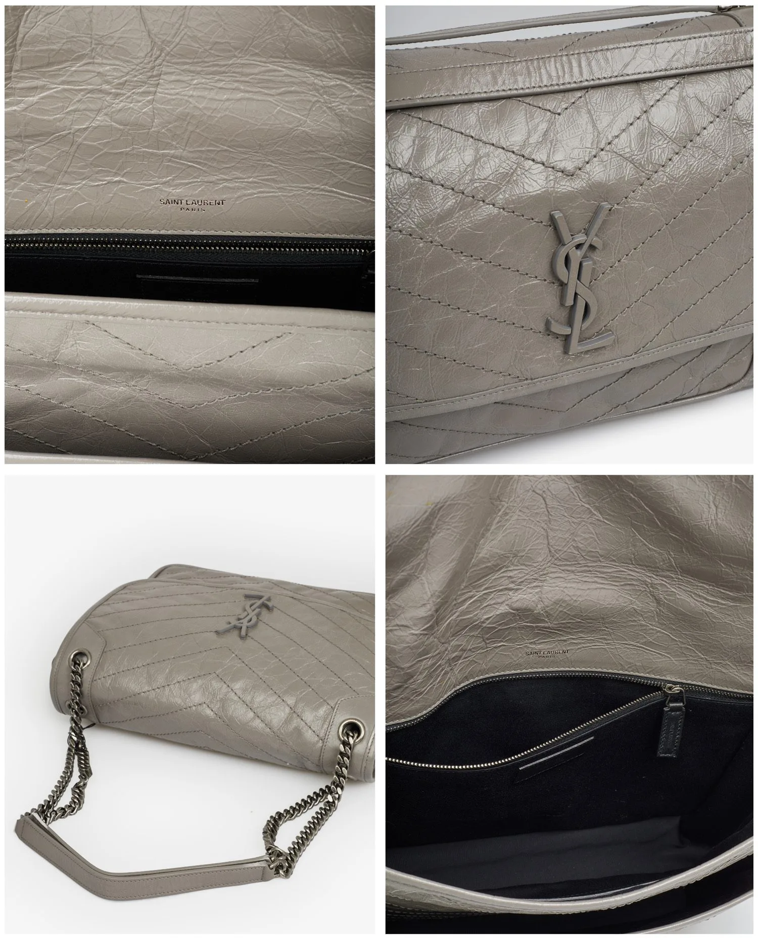 Sac Niki Saint Laurent en cuir souple en cuir de veau vintage gris, sûrpiqué en chevrons. Il se porte à l’épaule ou croisé à l’aide d’une bandoulière chaine coulissante. La doublure est en coton biologique et l’intérieur dispose de deux grands espaces de rangement. Fermoir à pression aimantée. Jamais porté.