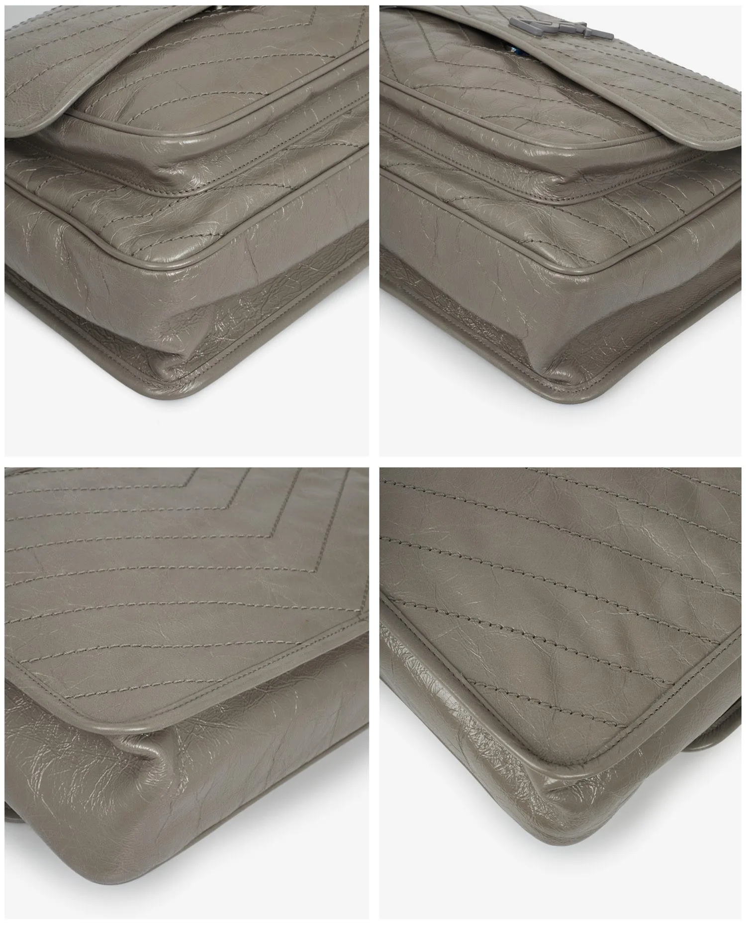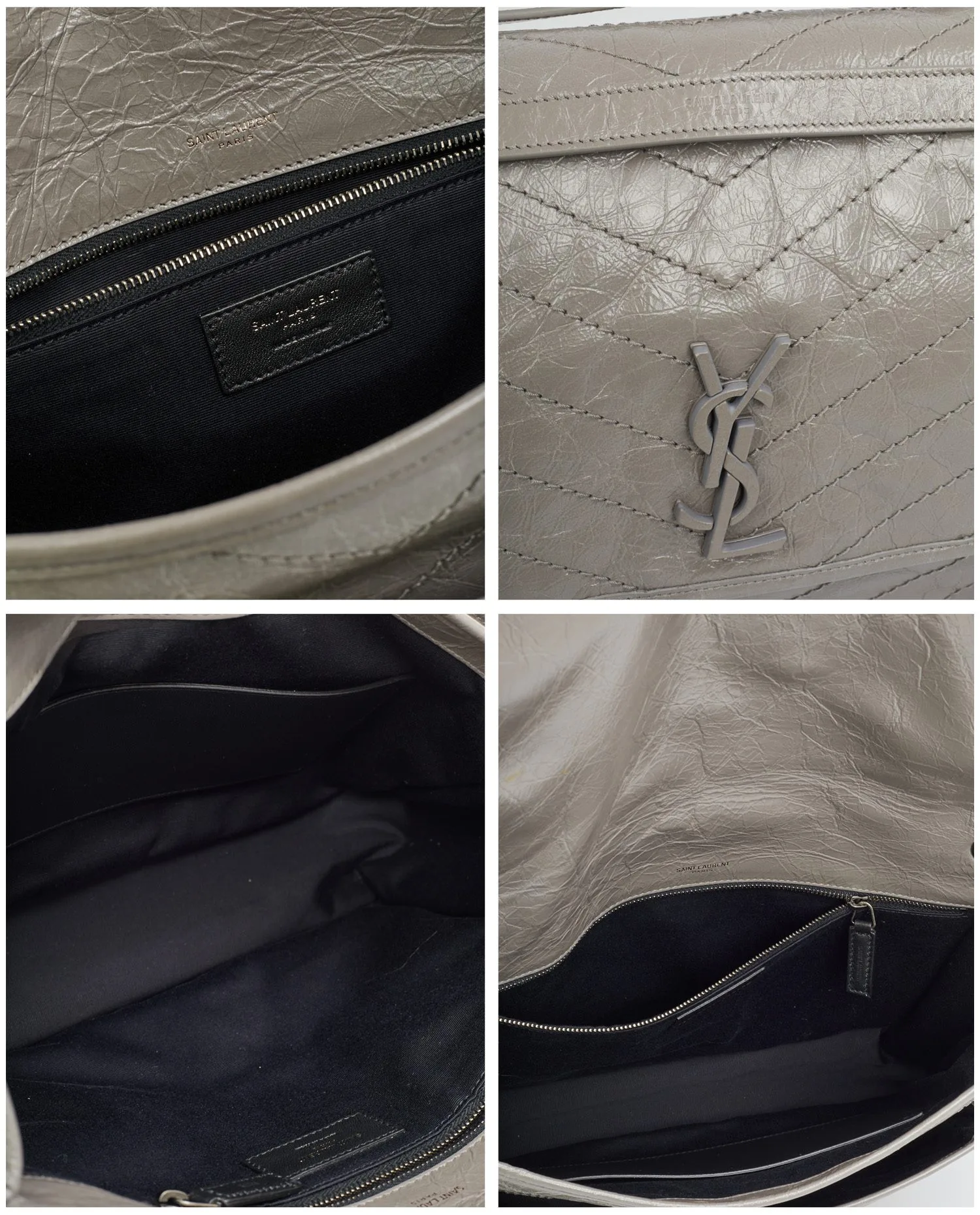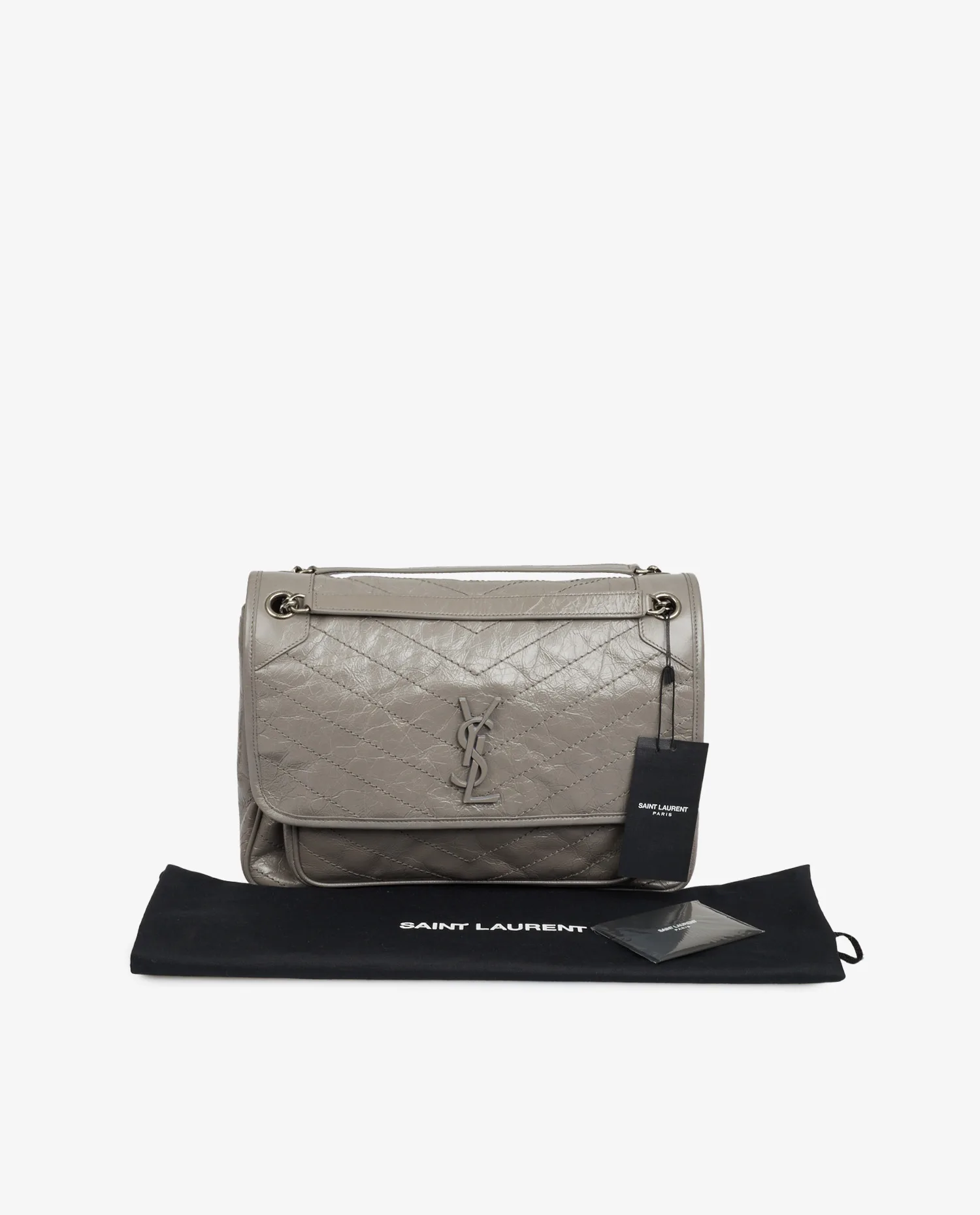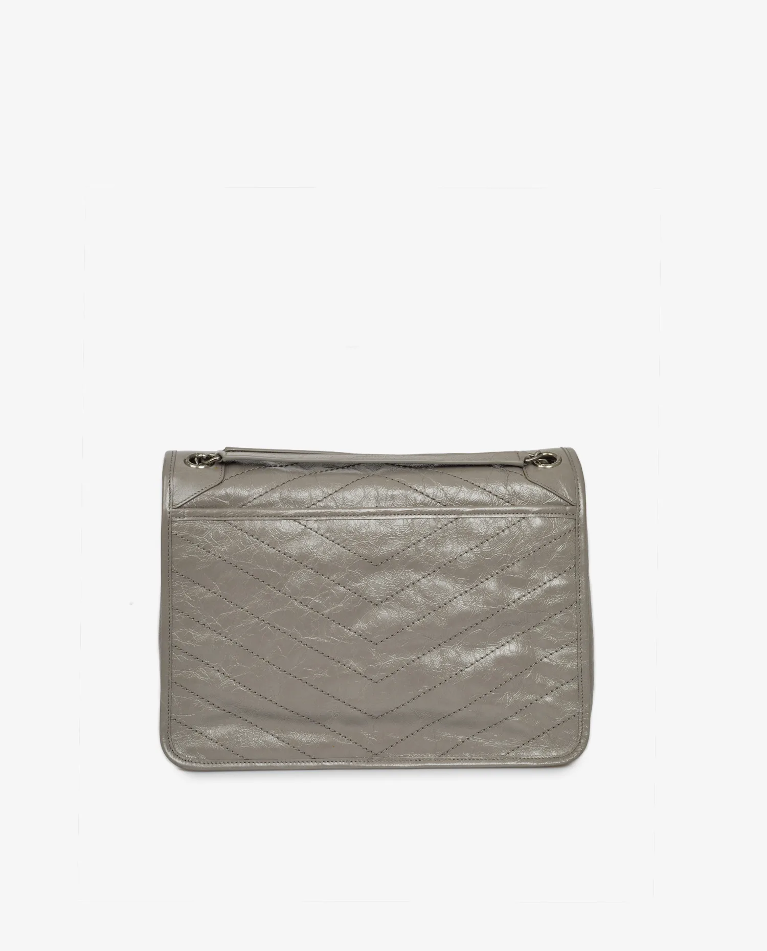 Sac Niki Saint Laurent en cuir souple en cuir de veau vintage gris, sûrpiqué en chevrons. Il se porte à l’épaule ou croisé à l’aide d’une bandoulière chaine coulissante. La doublure est en coton biologique et l’intérieur dispose de deux grands espaces de rangement. Fermoir à pression aimantée. Jamais porté.