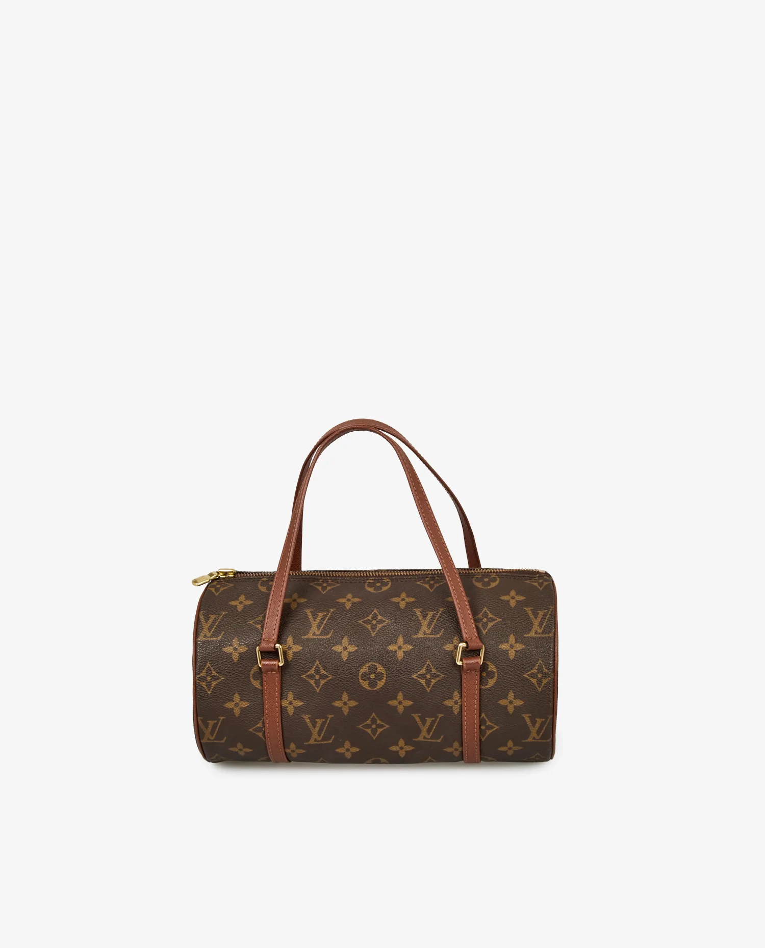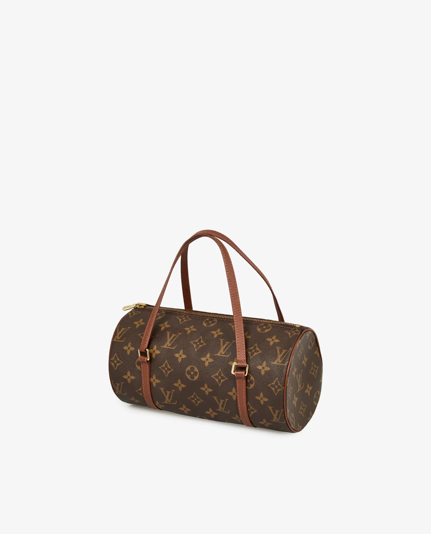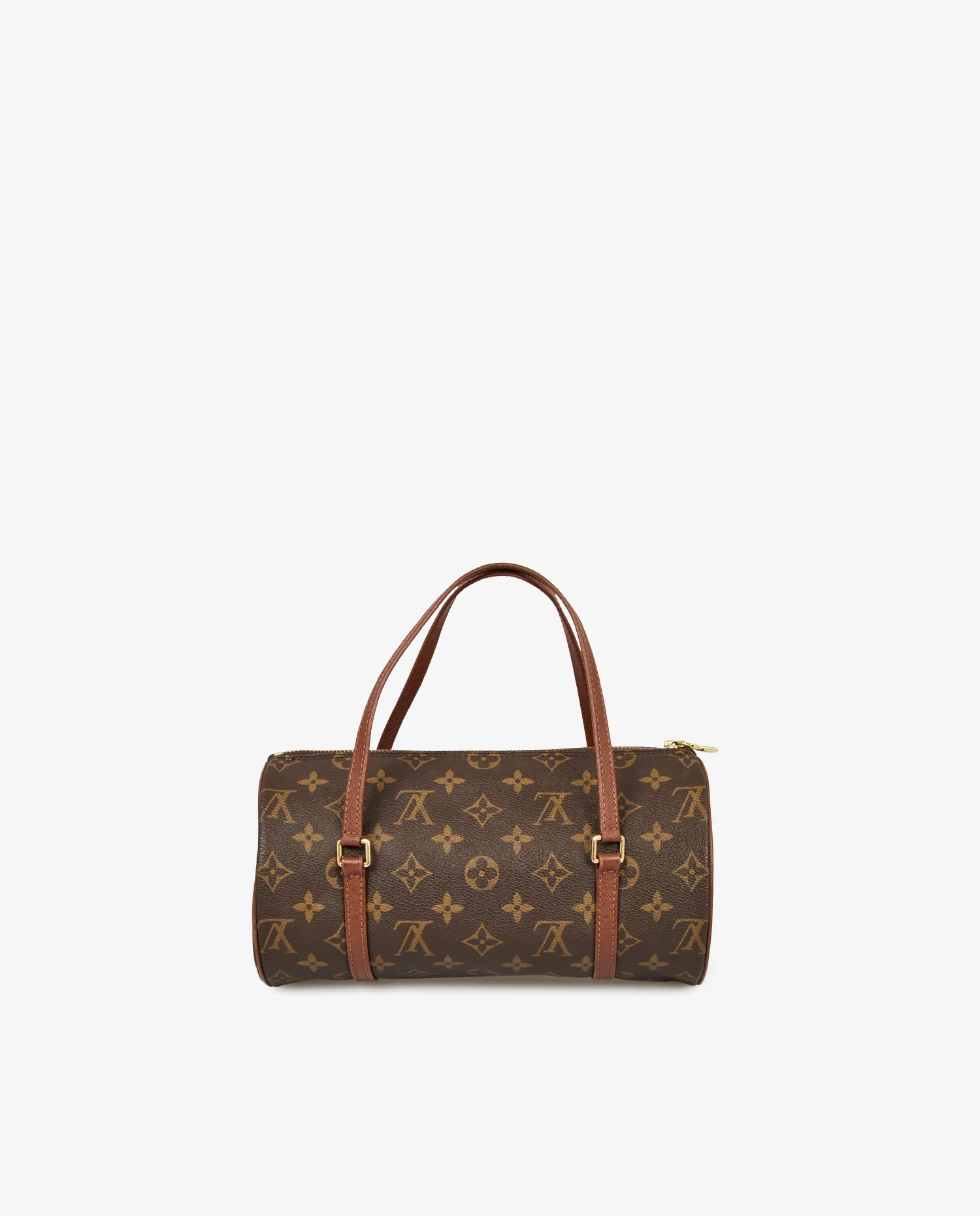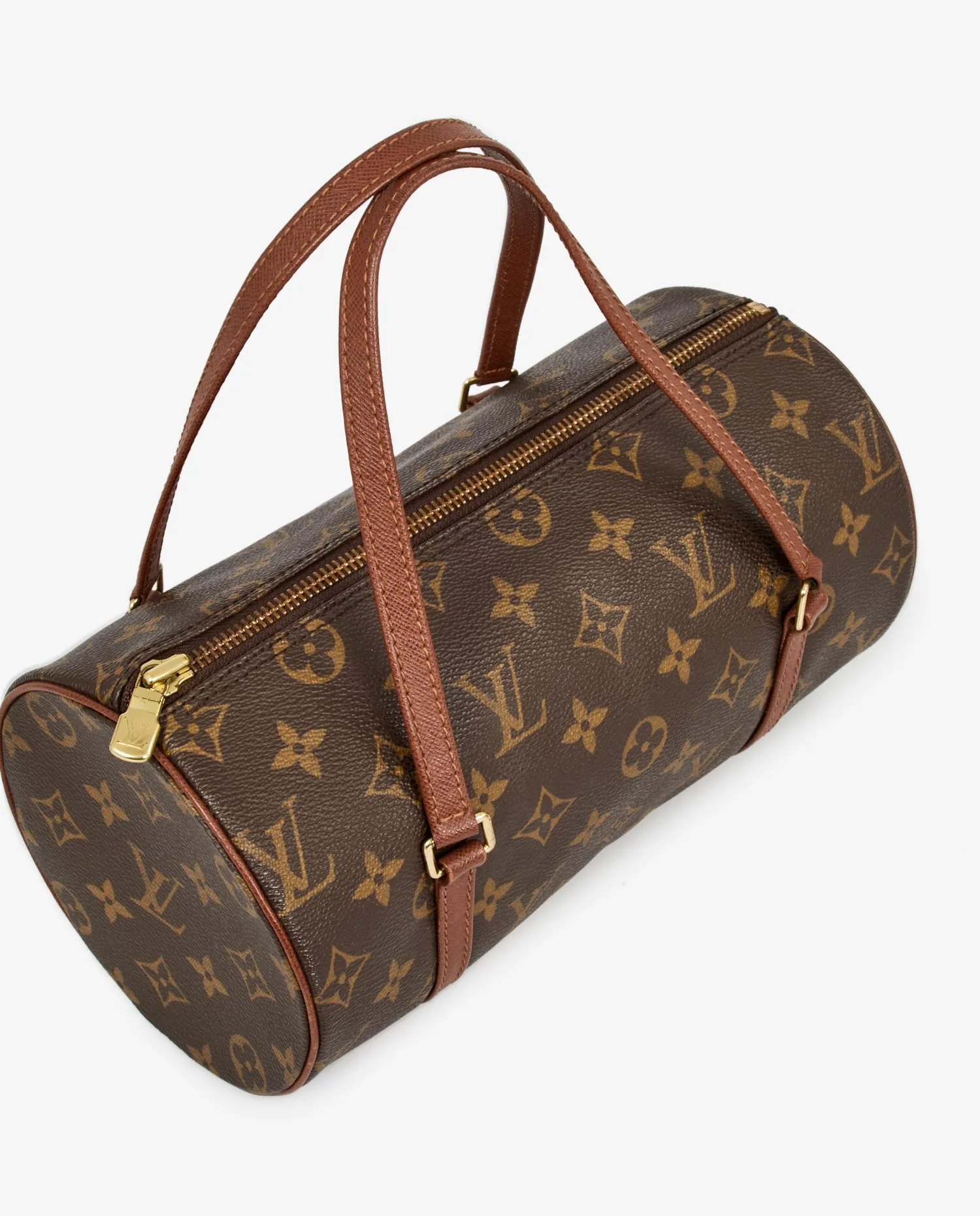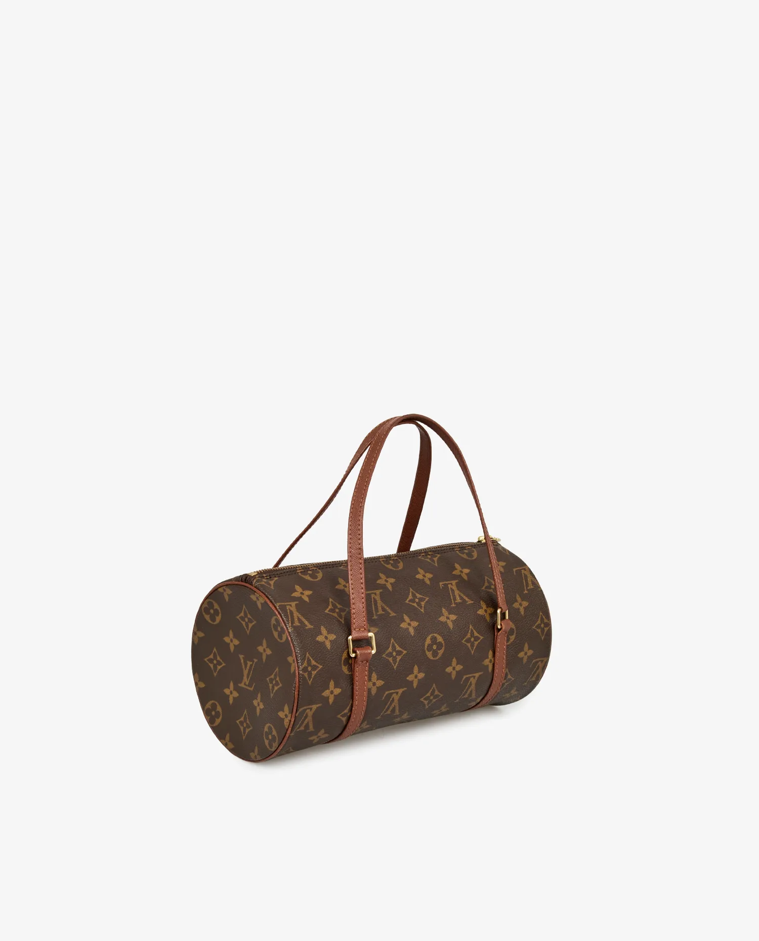 Sac Papillon Louis Vuitton vintage en toile monogramme et finitions en cuir marron. Fermeture zippée. Porté au bras. En très bon état.