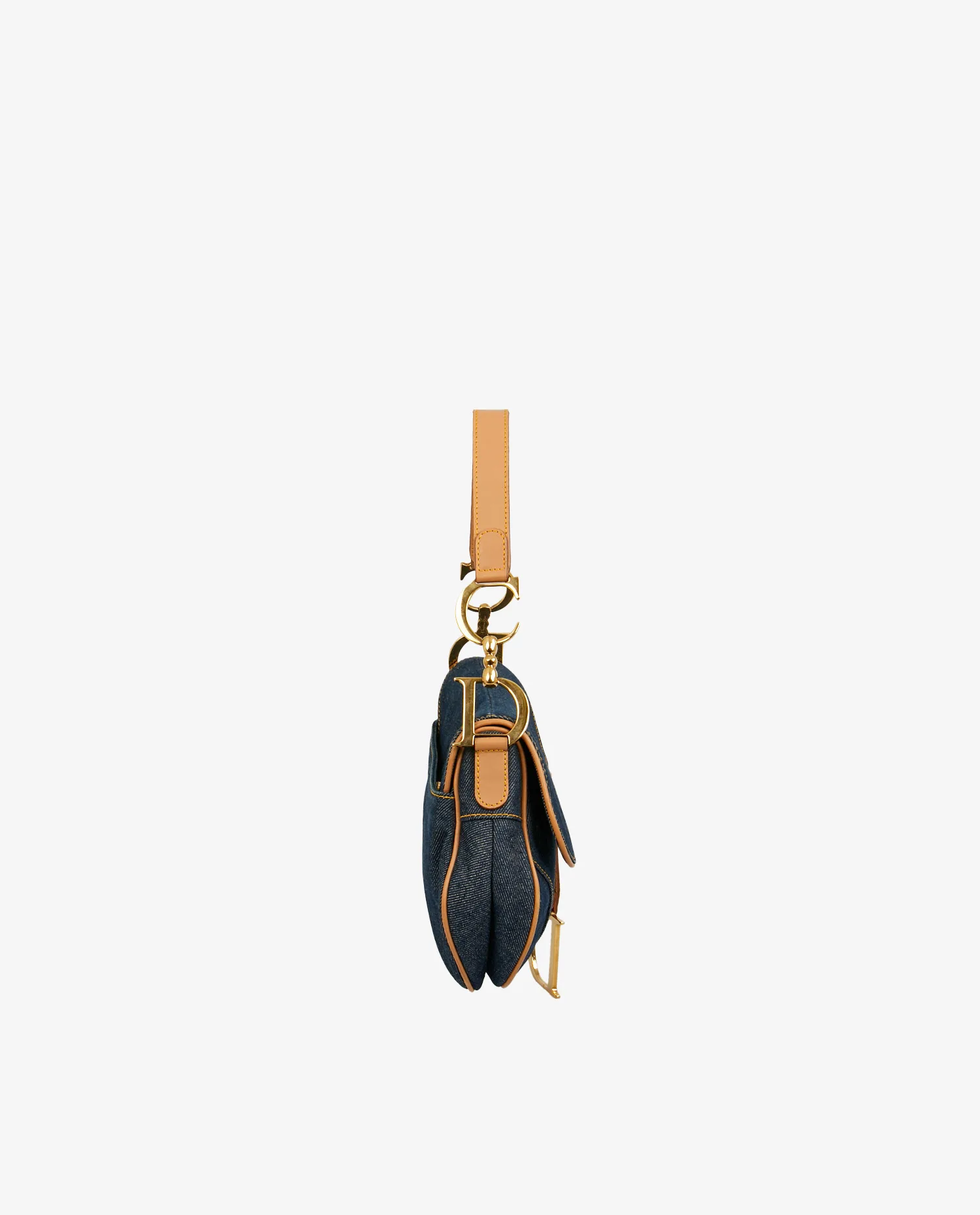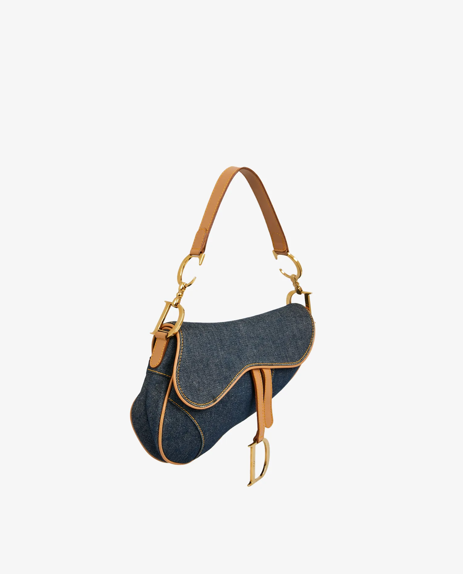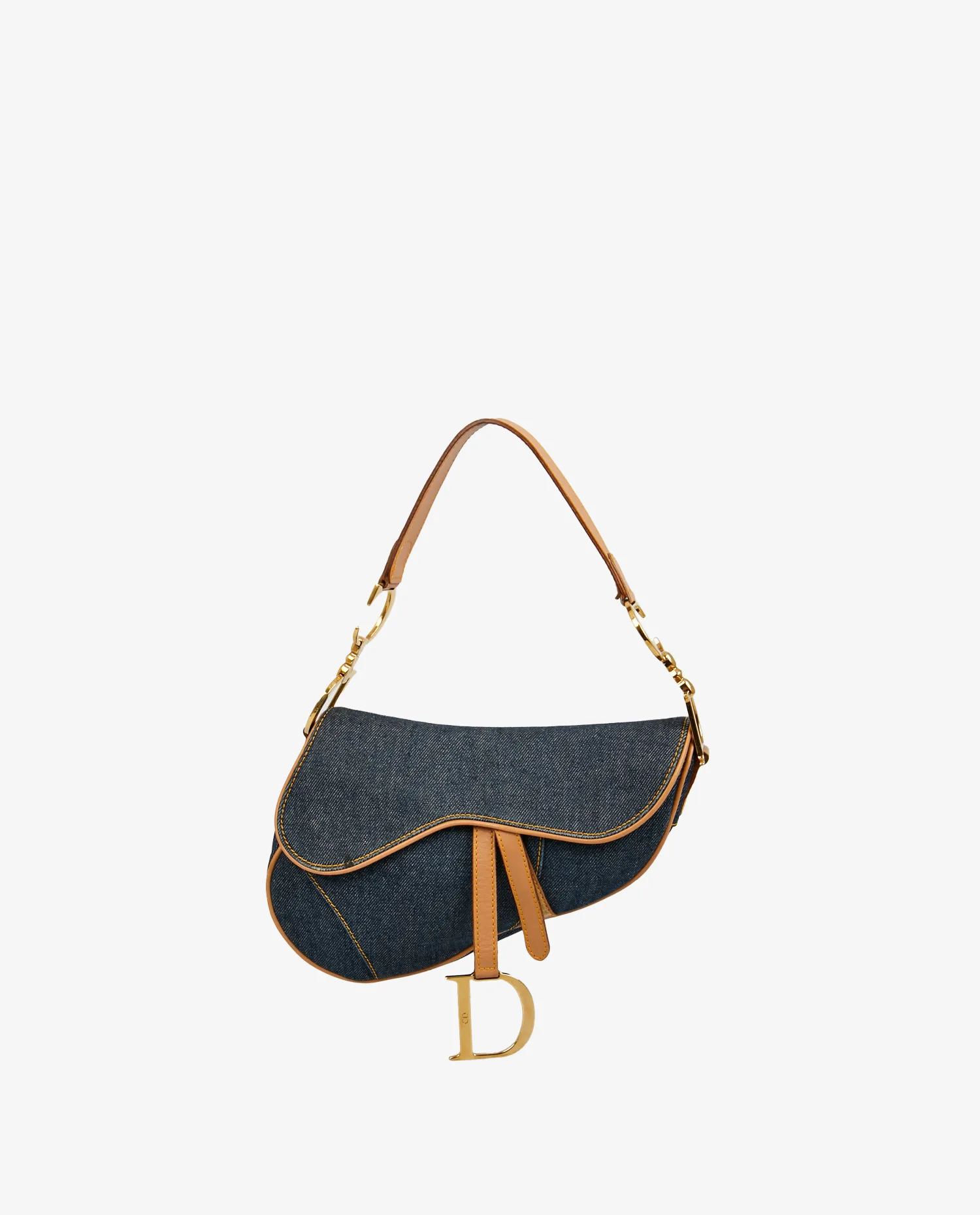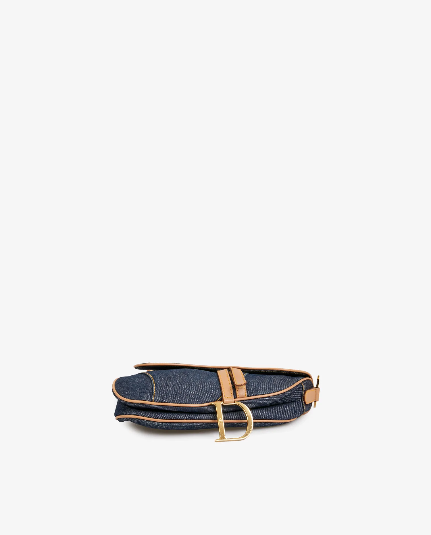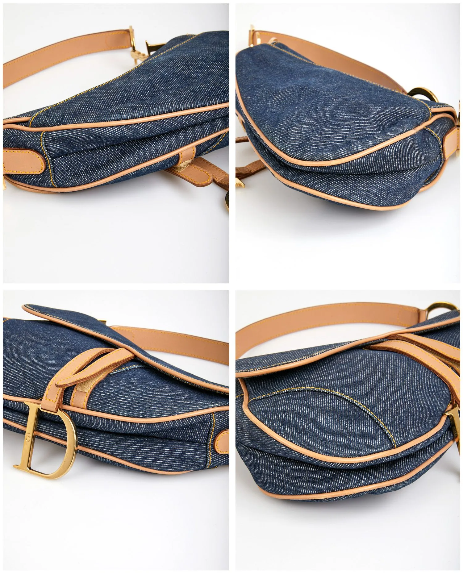 Sac Saddle Christian Dior vintage en toile denim bleu. Bijouterie en métal doré. Finitions en cuir de veau gold. Porté épaule. L’intérieur est en toile multicolore. En très bon état. Une tâche est visible sur le rabat ainsi que quelques rayures sur la bijouterie. Voir photos.